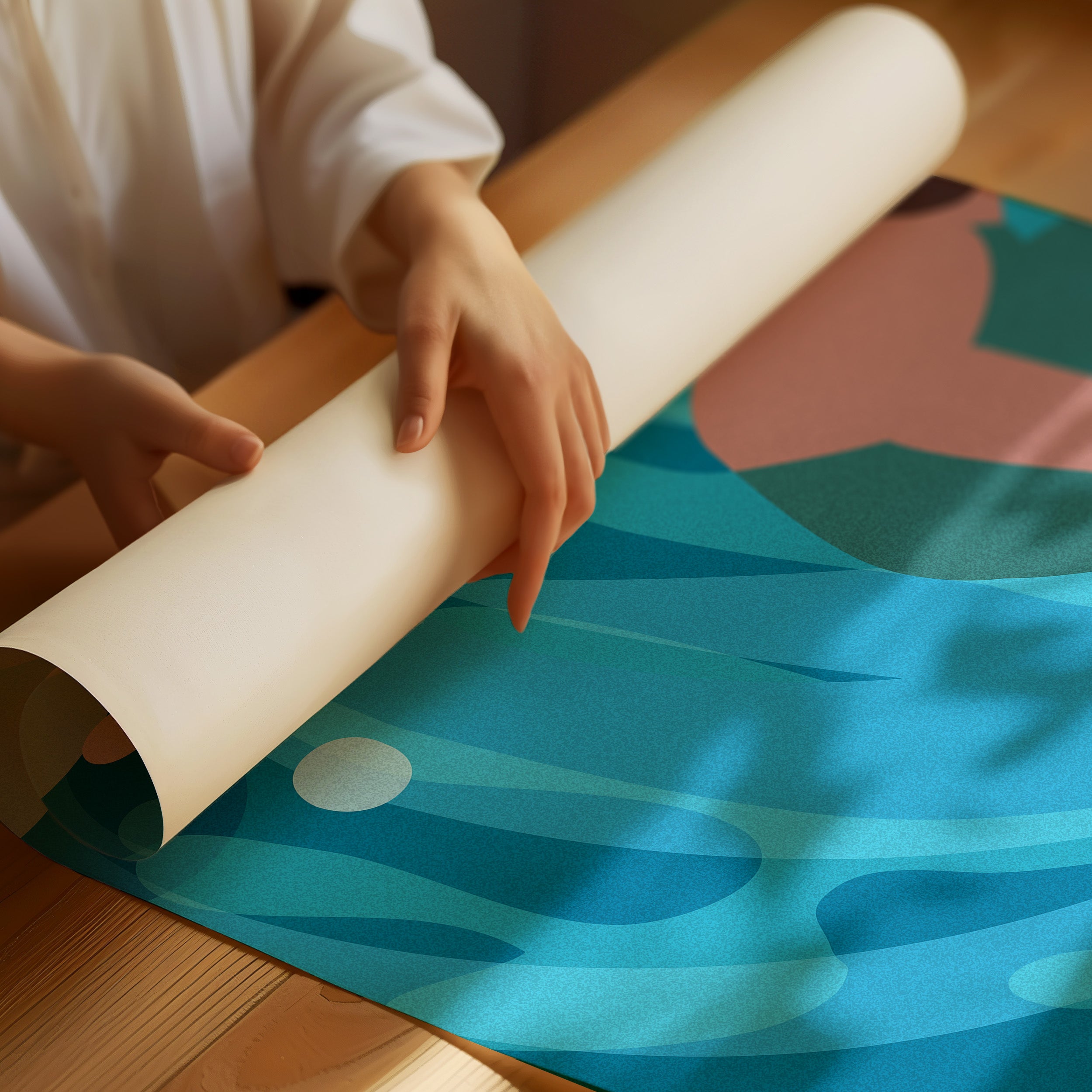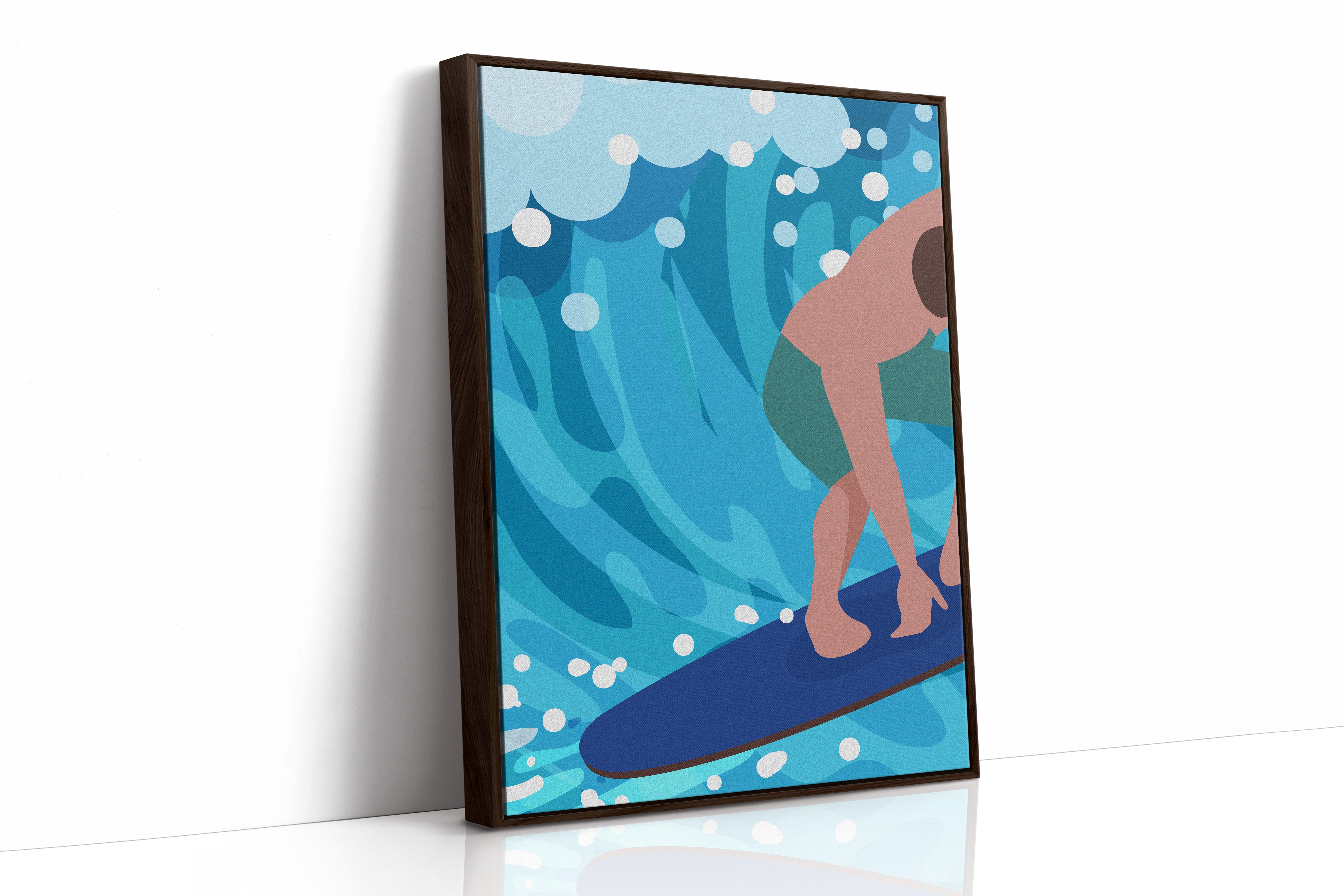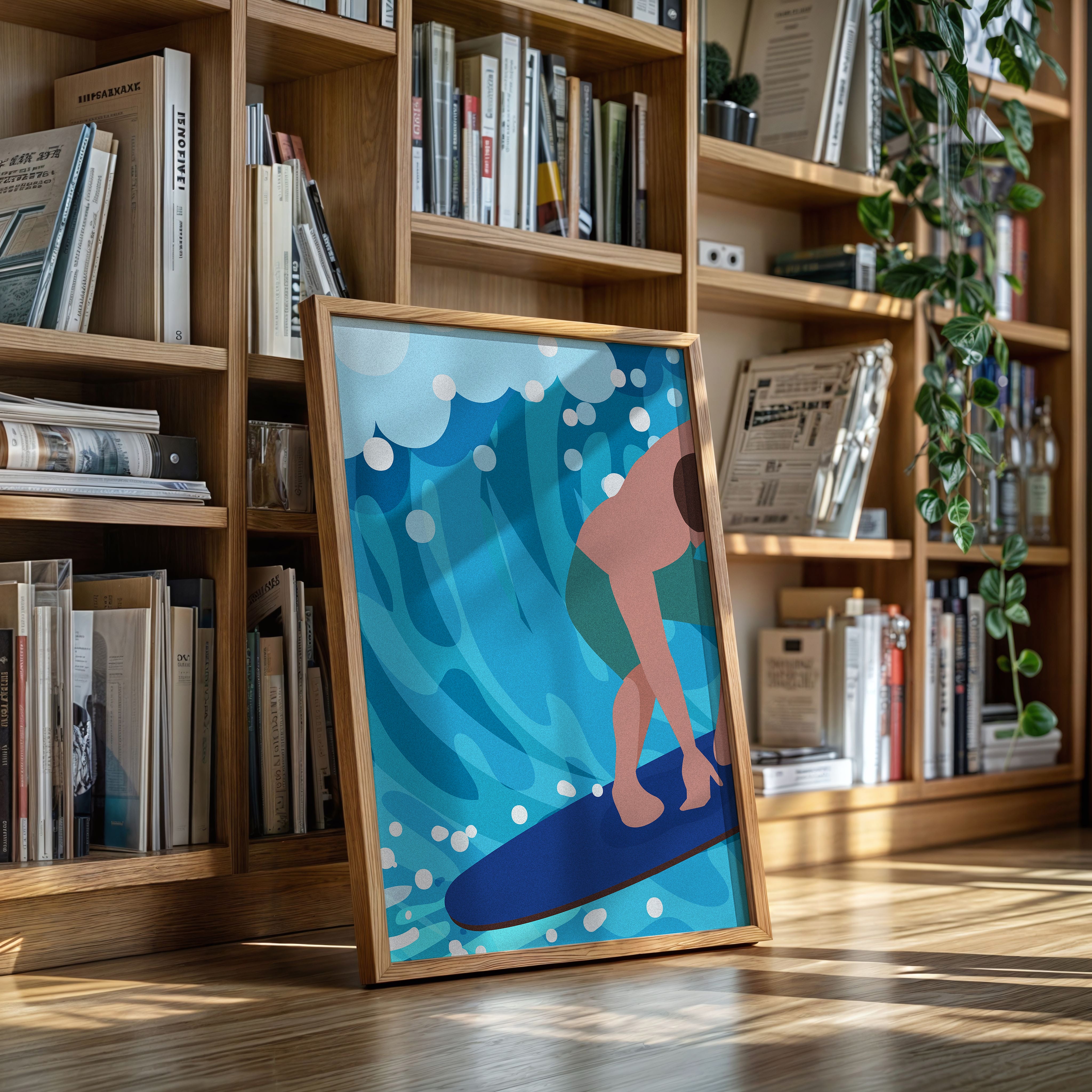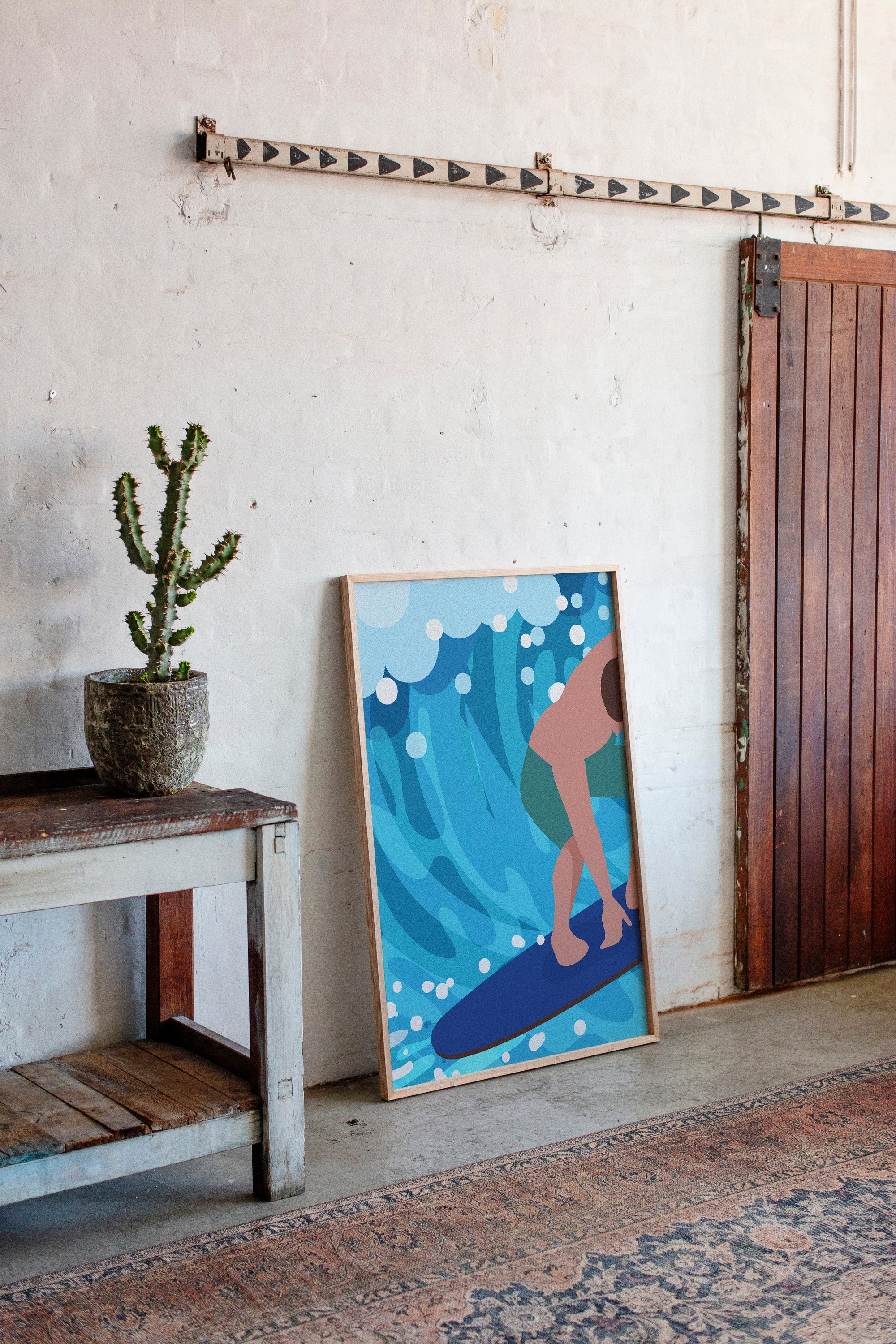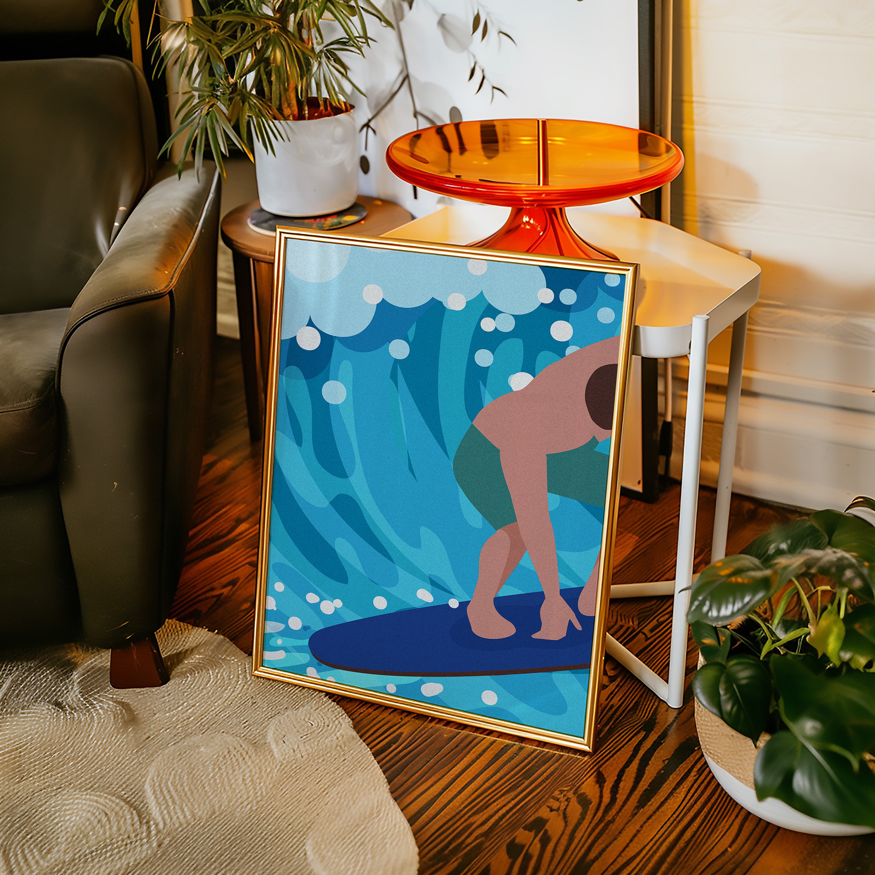 Sea spray catches the morning light as a lone surfer glides through crystalline waves, each droplet a fleeting jewel in the coastal air. This piece from our Contemporary collection captures the fluid grace of ocean sports with bold, minimalist forms. Rendered in vibrant aqua blues and coral pink, the composition celebrates the dynamic relationship between rider and wave, where every curve tells a story of balance and motion. The simplified shapes and striking color palette create a modern interpretation of classic surf culture. This piece brings coastal energy to any space, particularly suited for a bright bedroom or modern living area where its fresh palette can energize the room while maintaining sophistication.