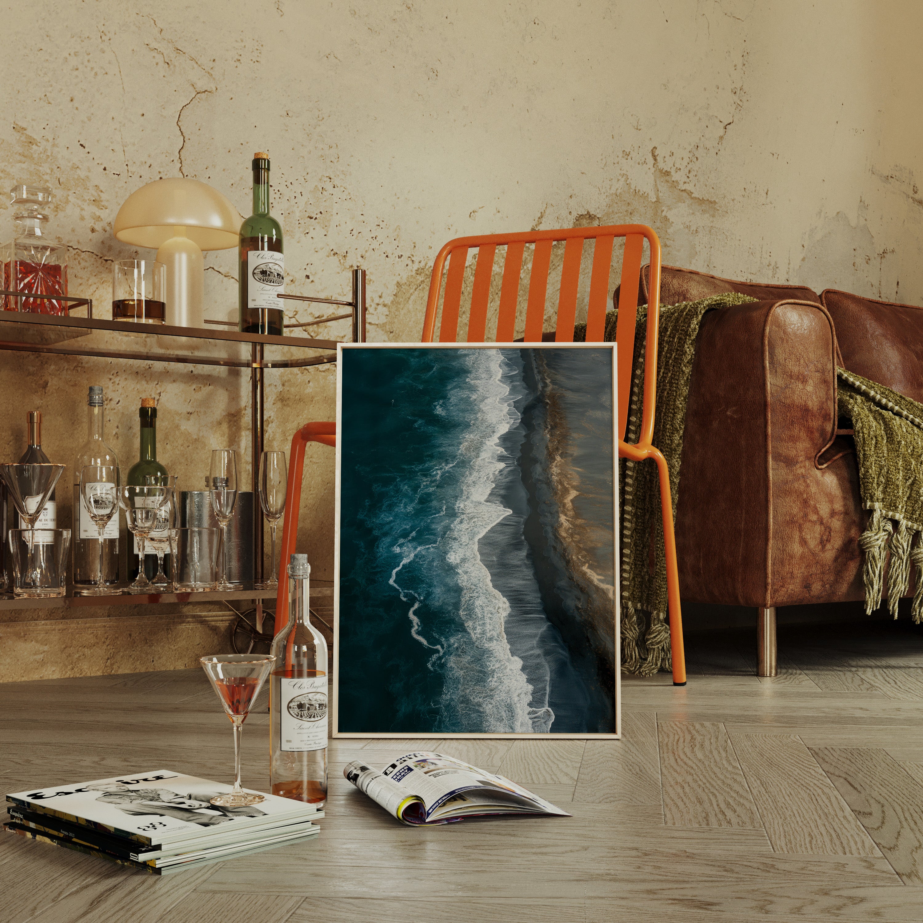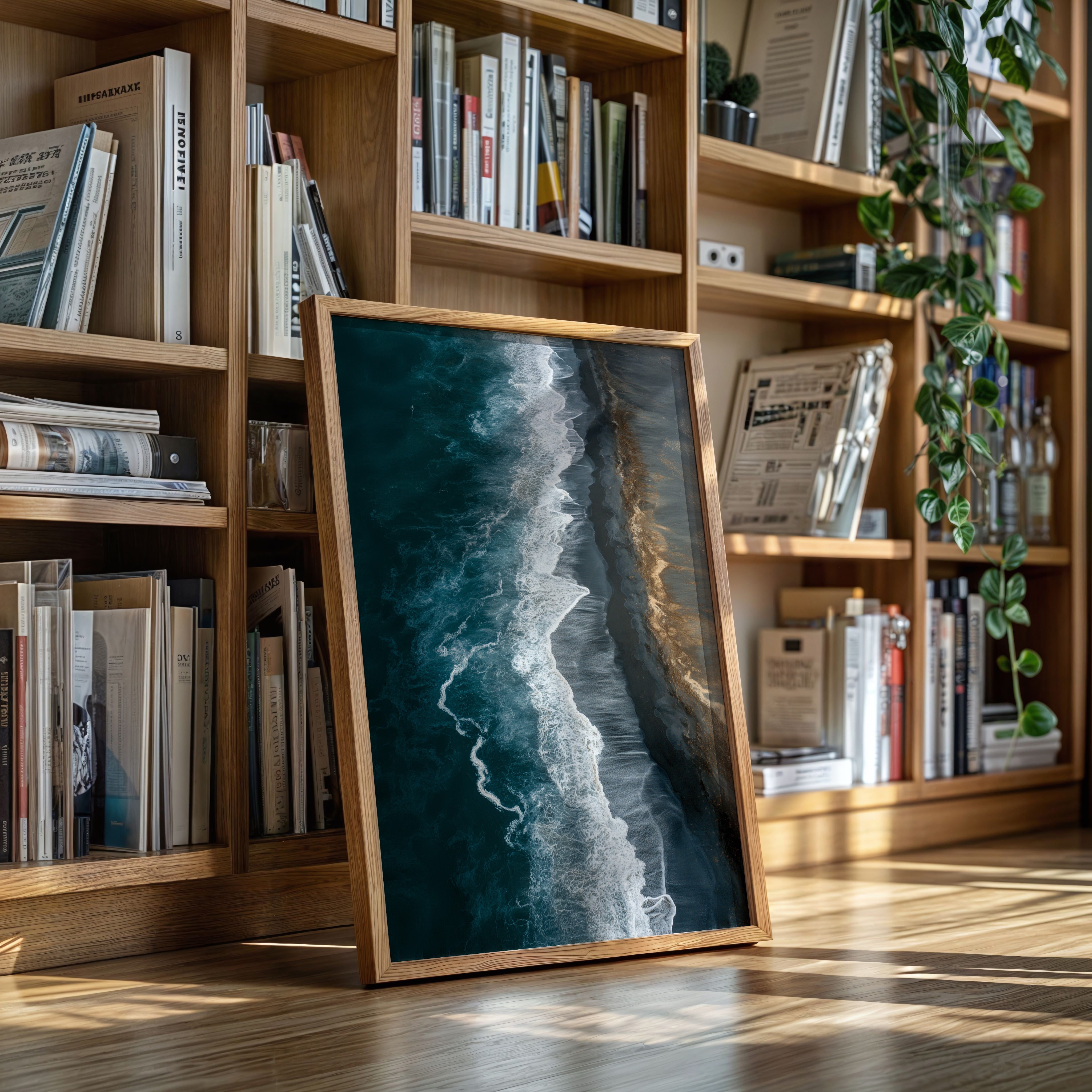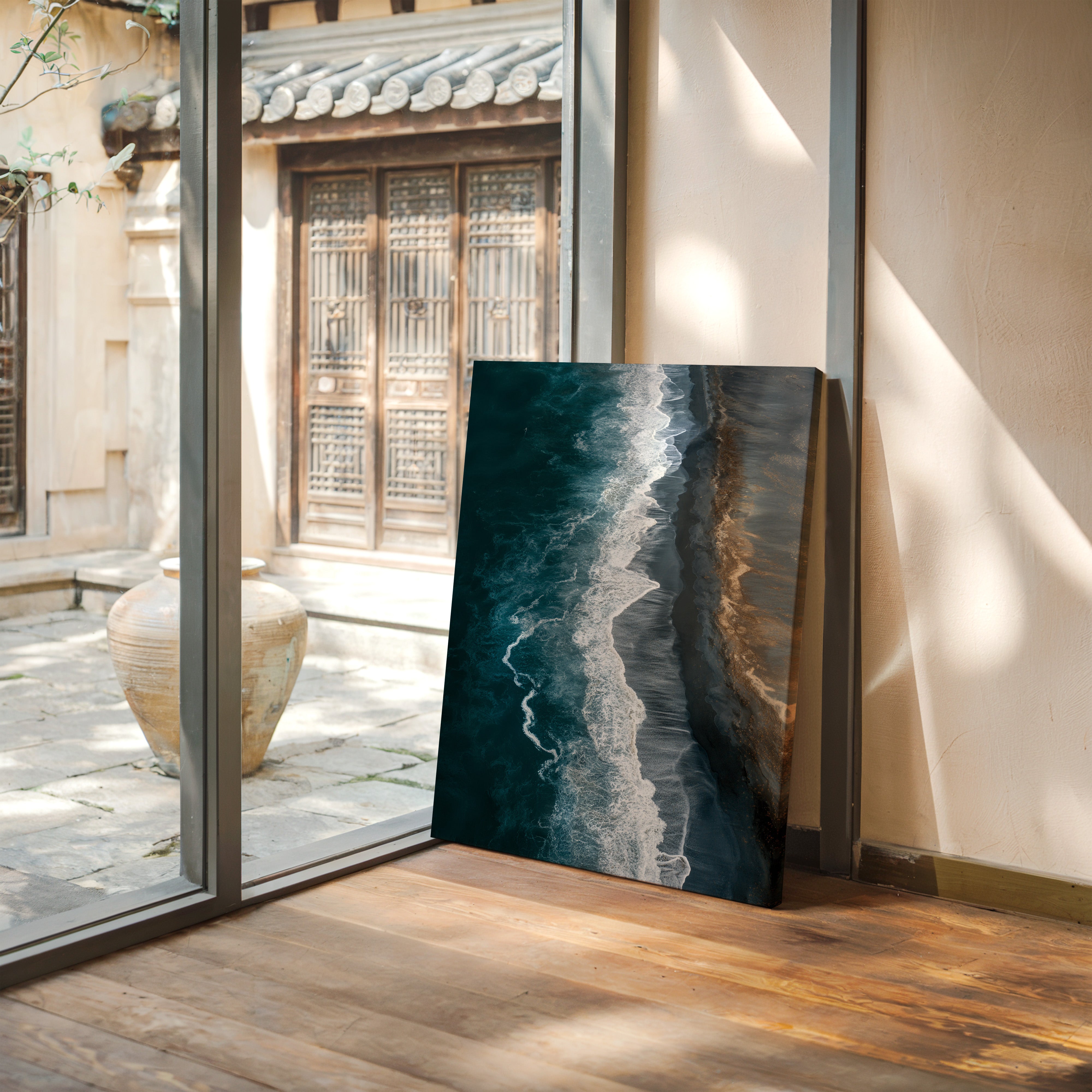 In a moment suspended between land and sea, waves caress the sand, leaving behind a shimmering dance of foam and mineral. This piece captures the essence of nature's artistry, where earth meets water in a harmonious blend of movement and texture. The deep blues and rich browns create a striking contrast, inviting viewers to lose themselves in the gentle rhythm of the tides. Ideal for a coastal retreat or a serene living space, it evokes the tranquil spirit of the ocean's embrace.