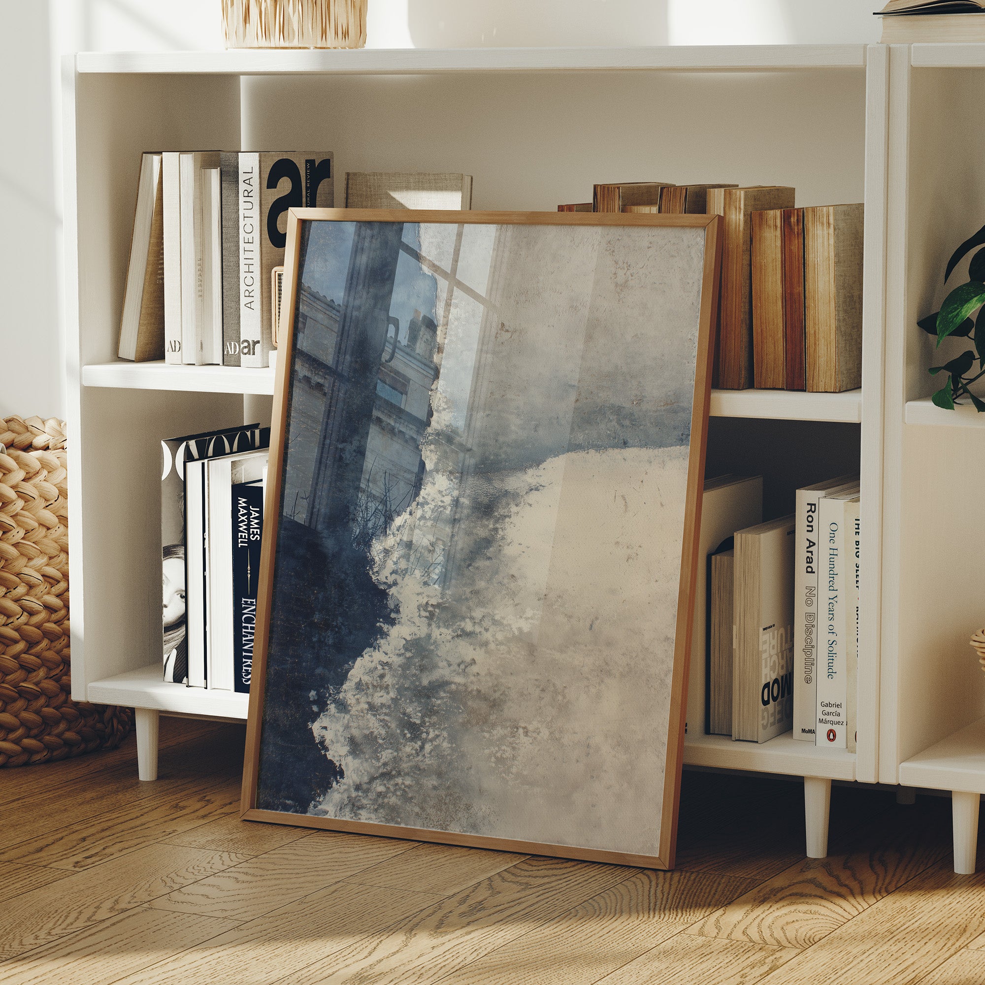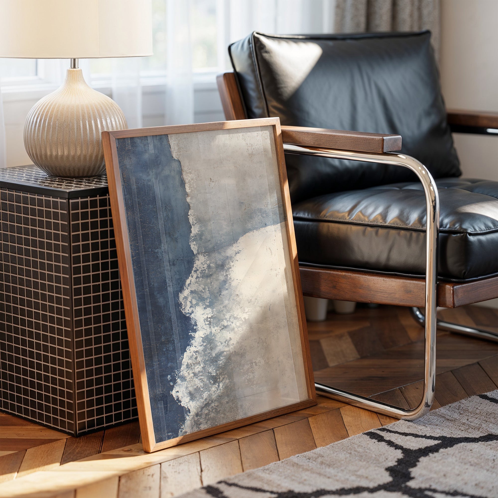 A gentle divide emerges where deep navy meets soft cream, creating a moment frozen in time like waves pulling back from shore. The textured borderline speaks of natural forces at work, with misty grays and blues bleeding into lighter tones like watercolor on rough paper. This abstract piece captures the essence of coastal boundaries, where sea meets sand in an eternal dance of elements. Perfect for modern coastal homes or minimalist spaces seeking a touch of organic movement. This piece brings a sense of calm and contemplation to any room while maintaining sophisticated simplicity.