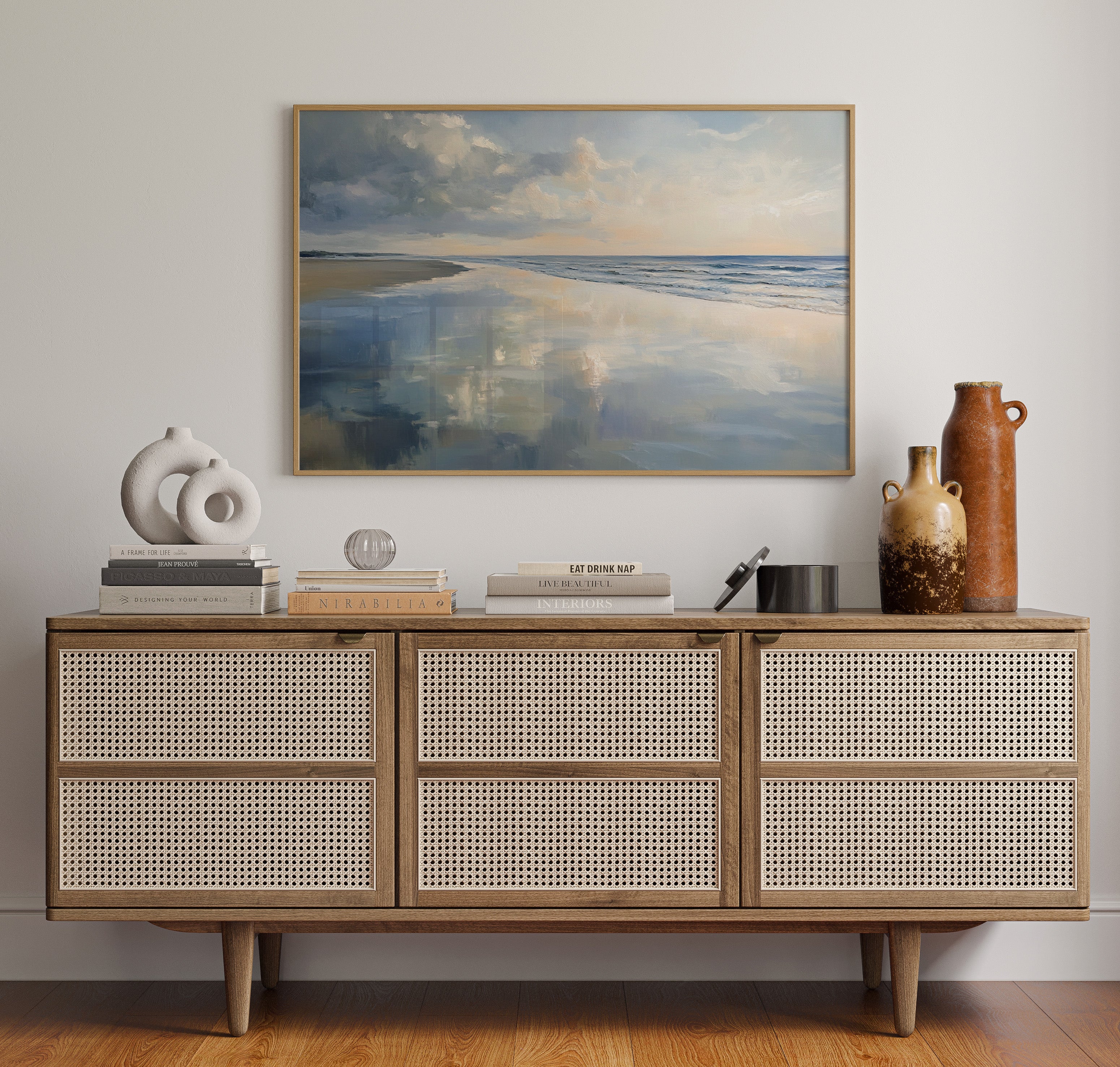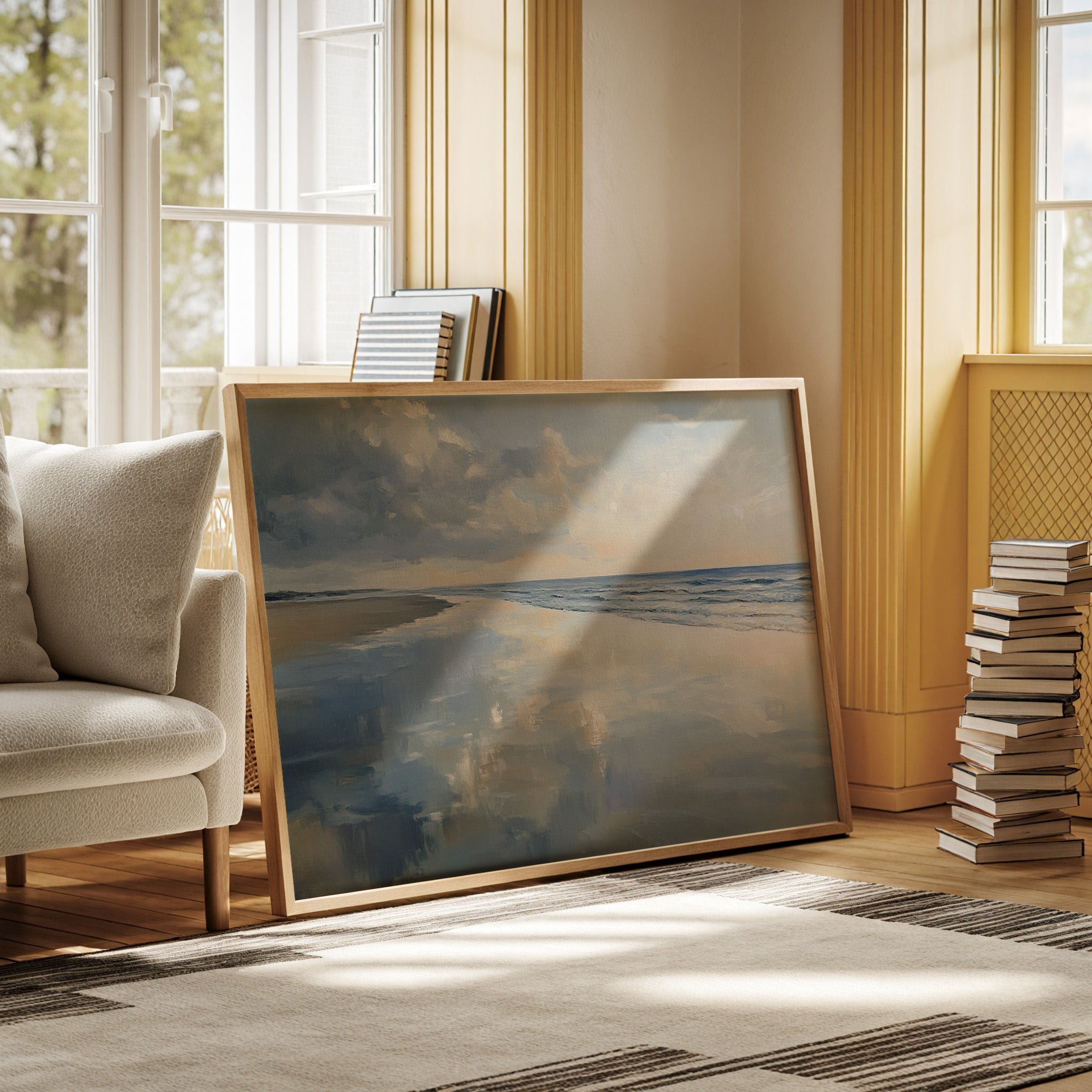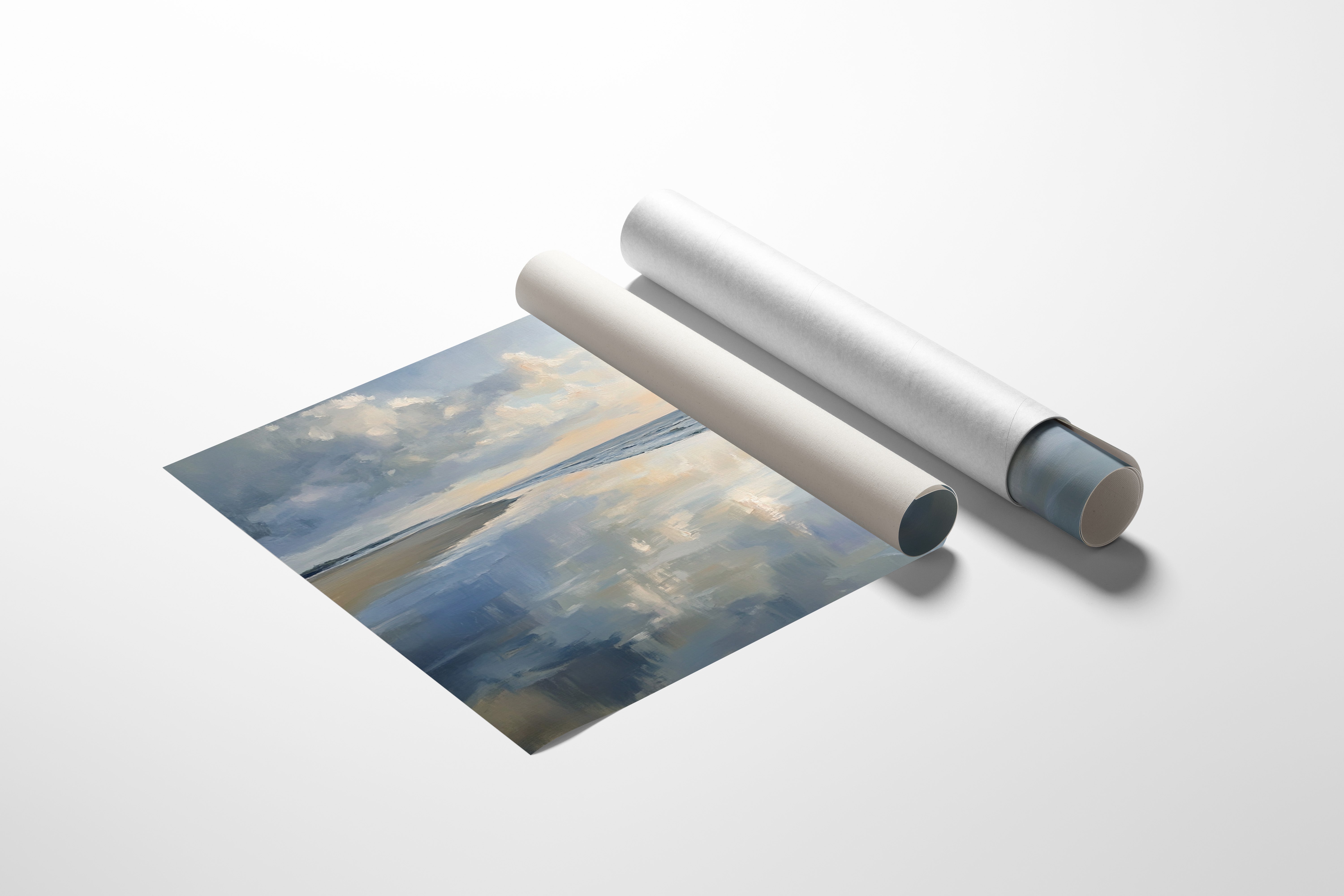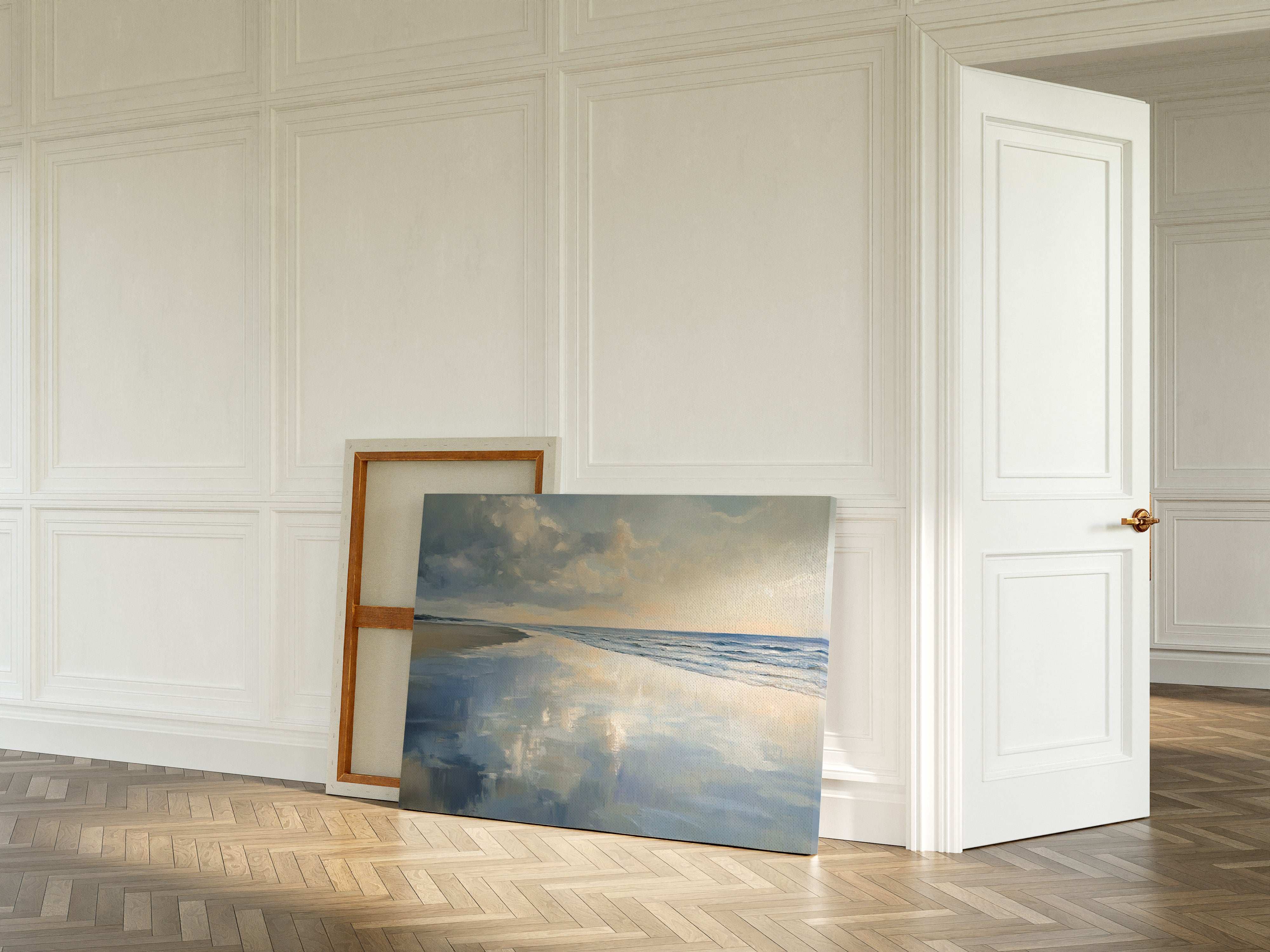 Dawn breaks over a serene coastline, where sky and sea become one in a mirror of soft blues and creamy whites. The wet sand creates a perfect reflection of billowing clouds, their forms doubled in nature's looking glass. Gentle waves roll in from the horizon, where pewter-blue waters meet a brightening sky painted in delicate morning hues. This piece captures the peaceful solitude of early morning on the shore, when the world feels newly made.