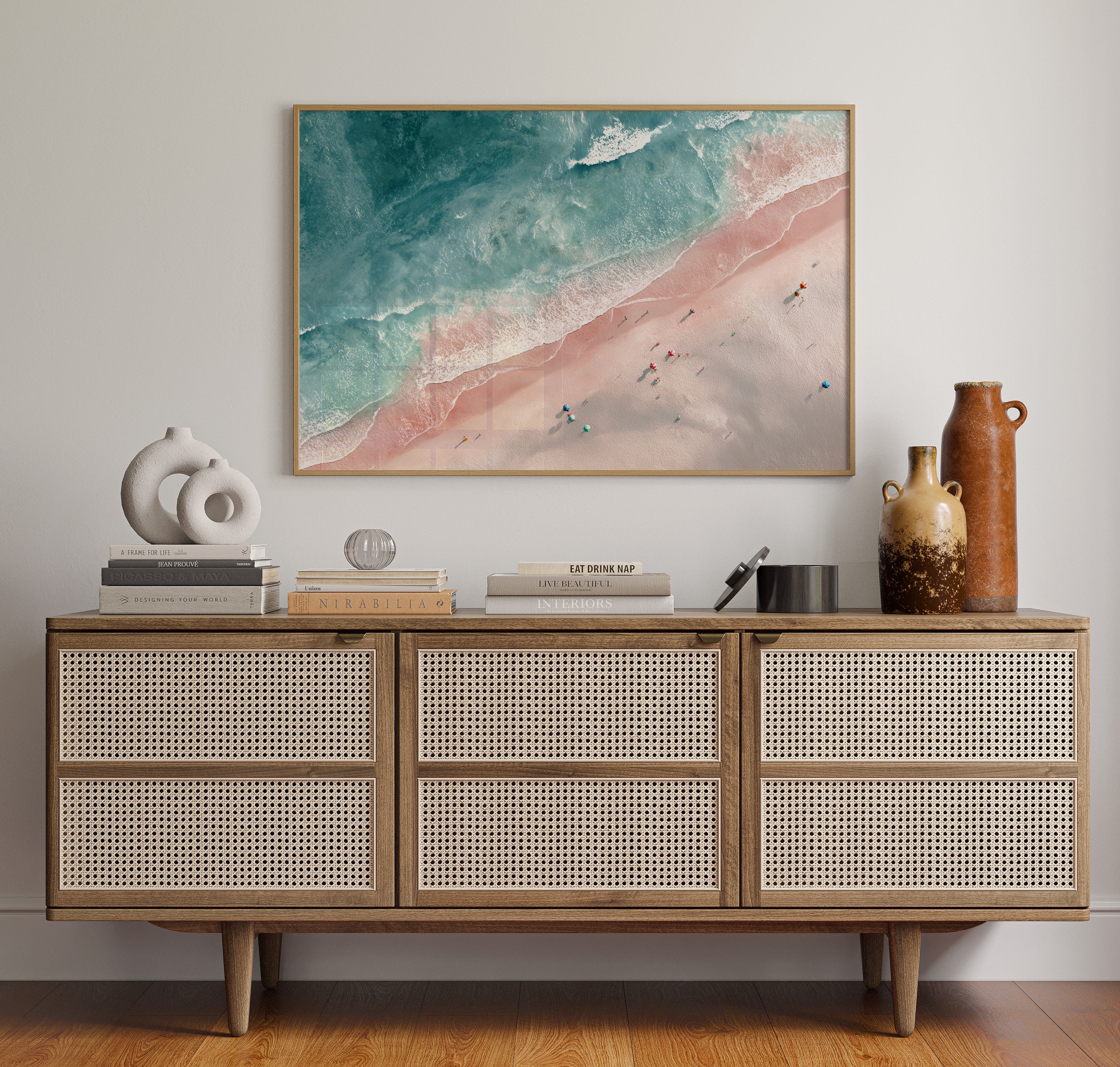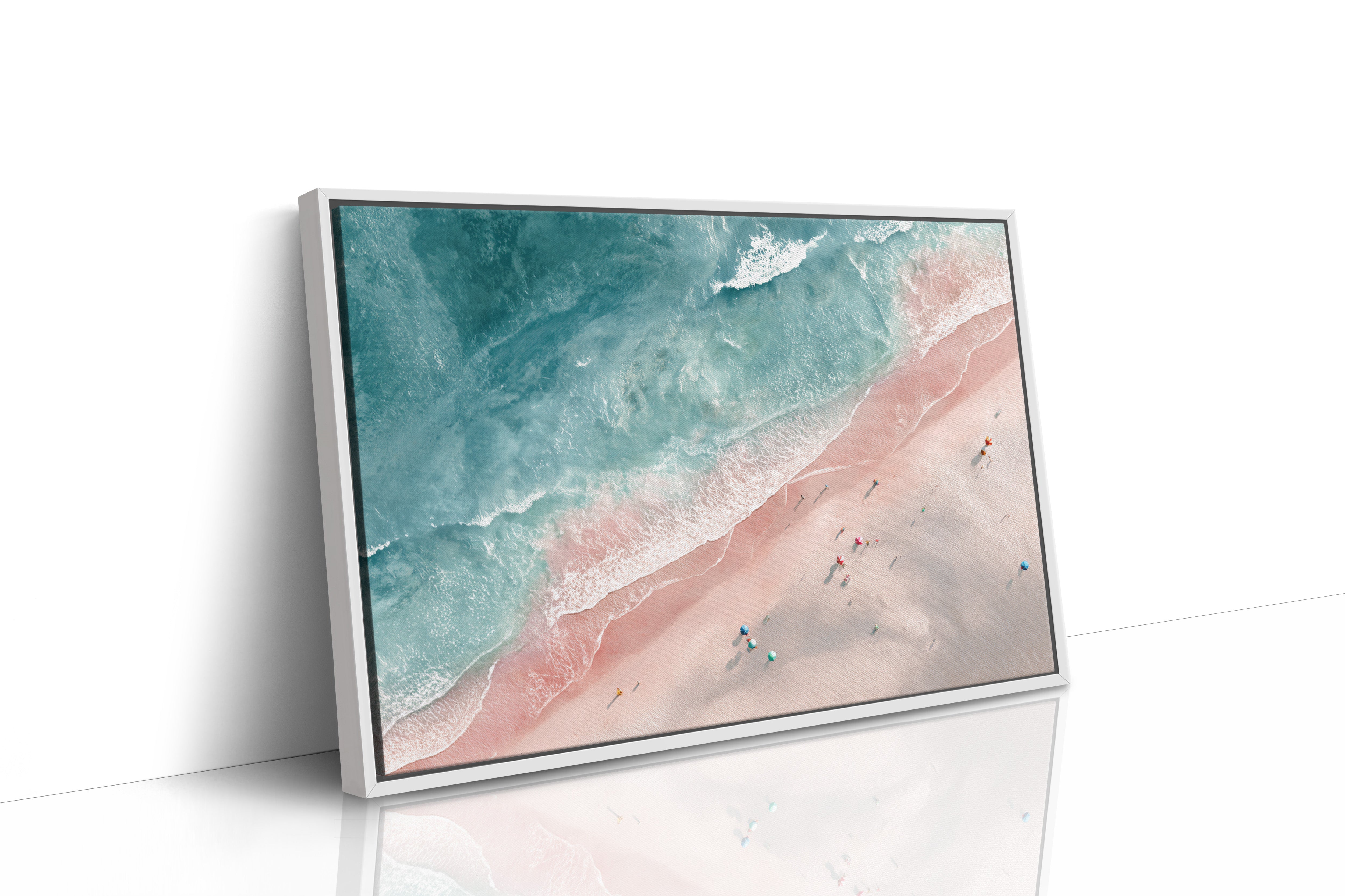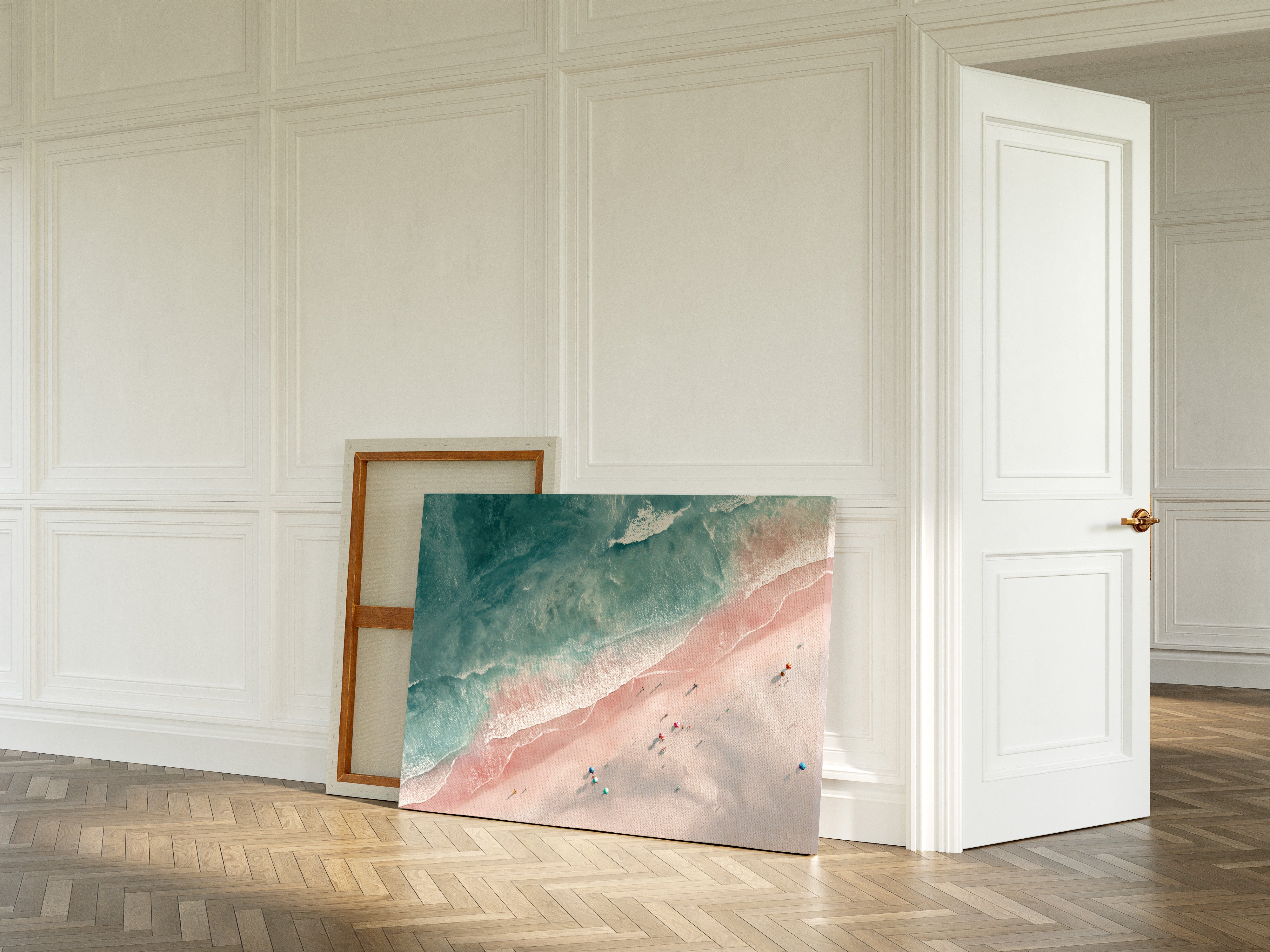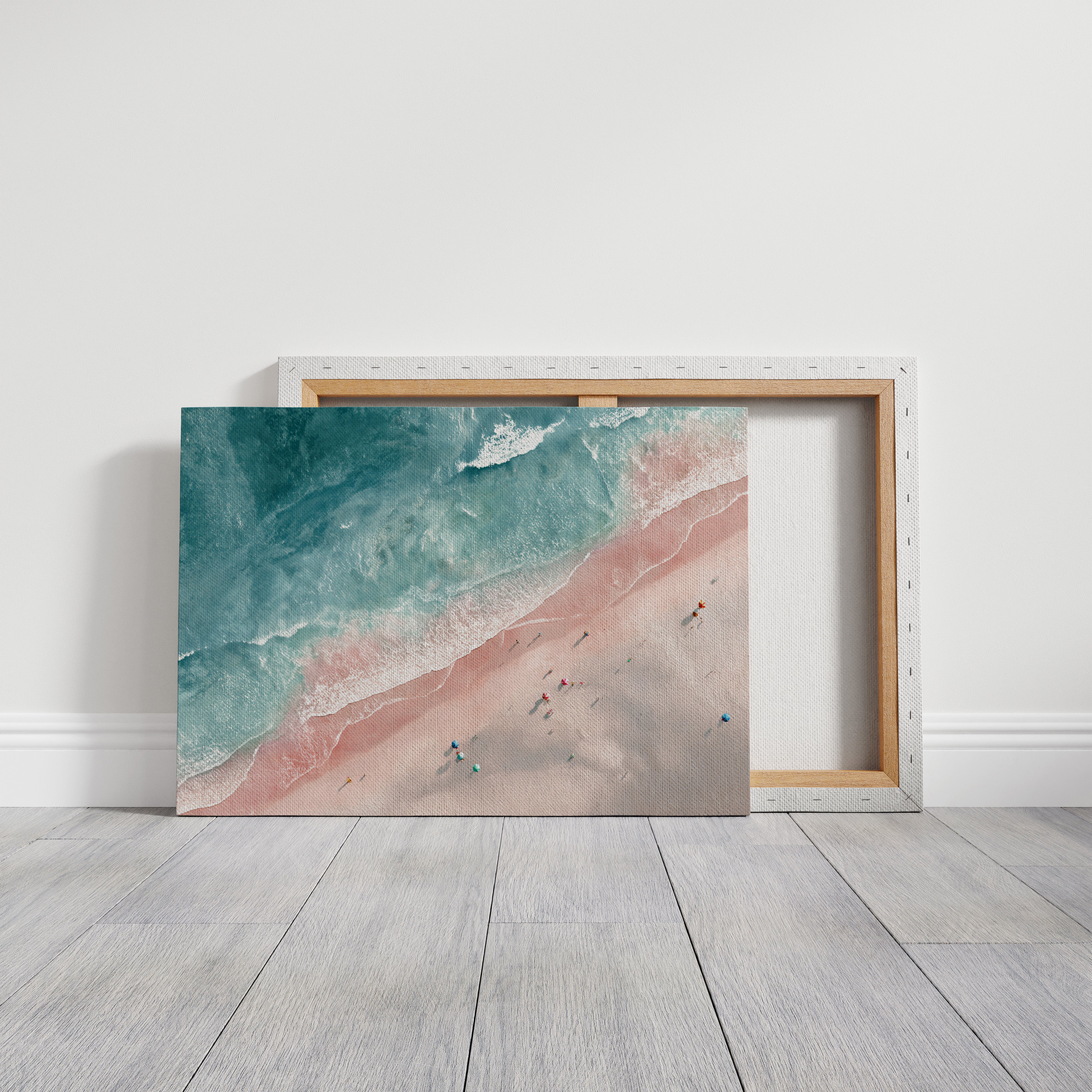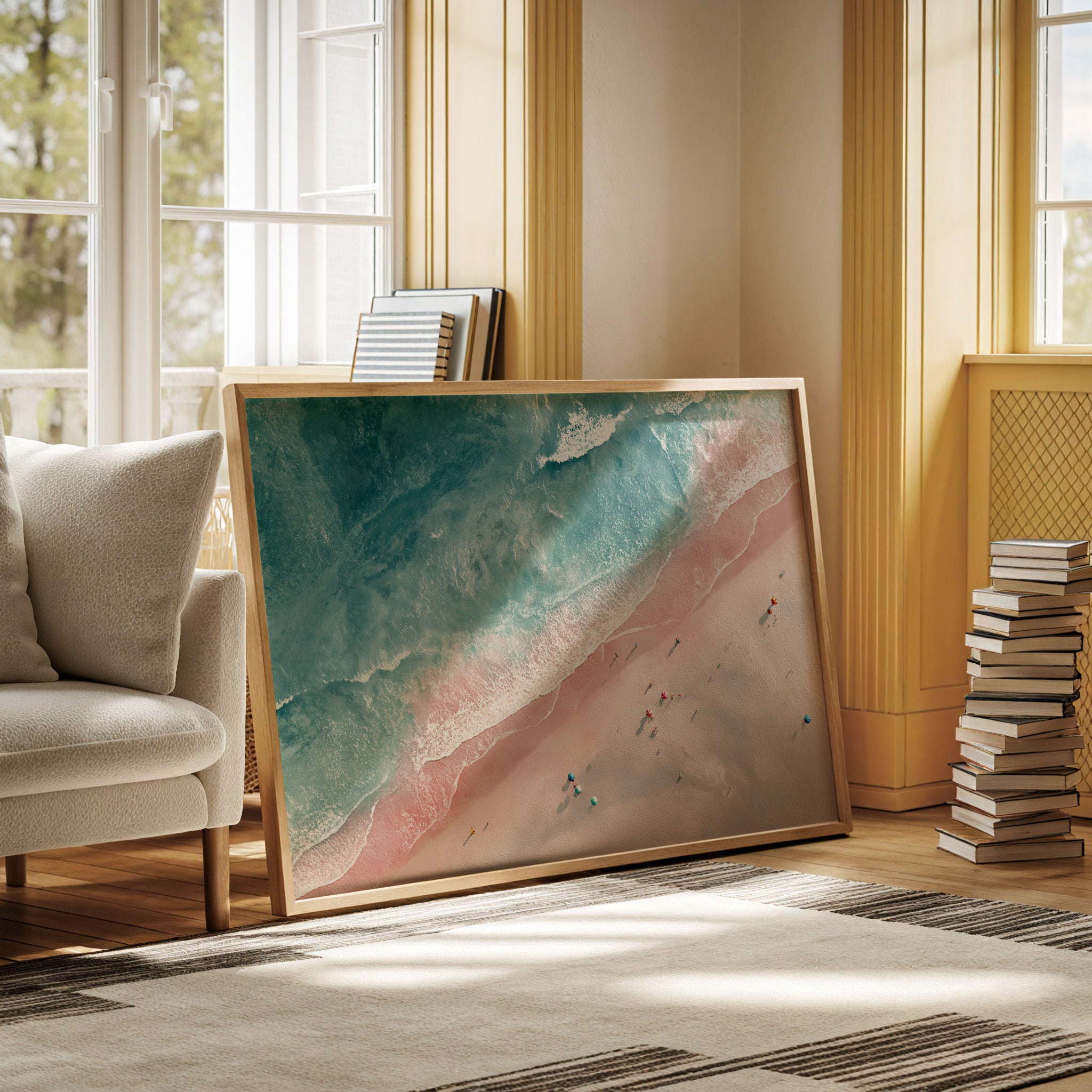 From above, the beach unfolds like a canvas painted in soft pastels, where the waves playfully kiss the shore. This piece captures the beauty of vibrant seaside gatherings, inviting the viewer into a world of warmth and serenity. Each umbrella and figure tells a story, blending with the gentle tide that sweeps in and out, creating a harmonious dance of nature and human joy. Perfect for brightening a living room or creating a tranquil atmosphere in a sunlit foyer.