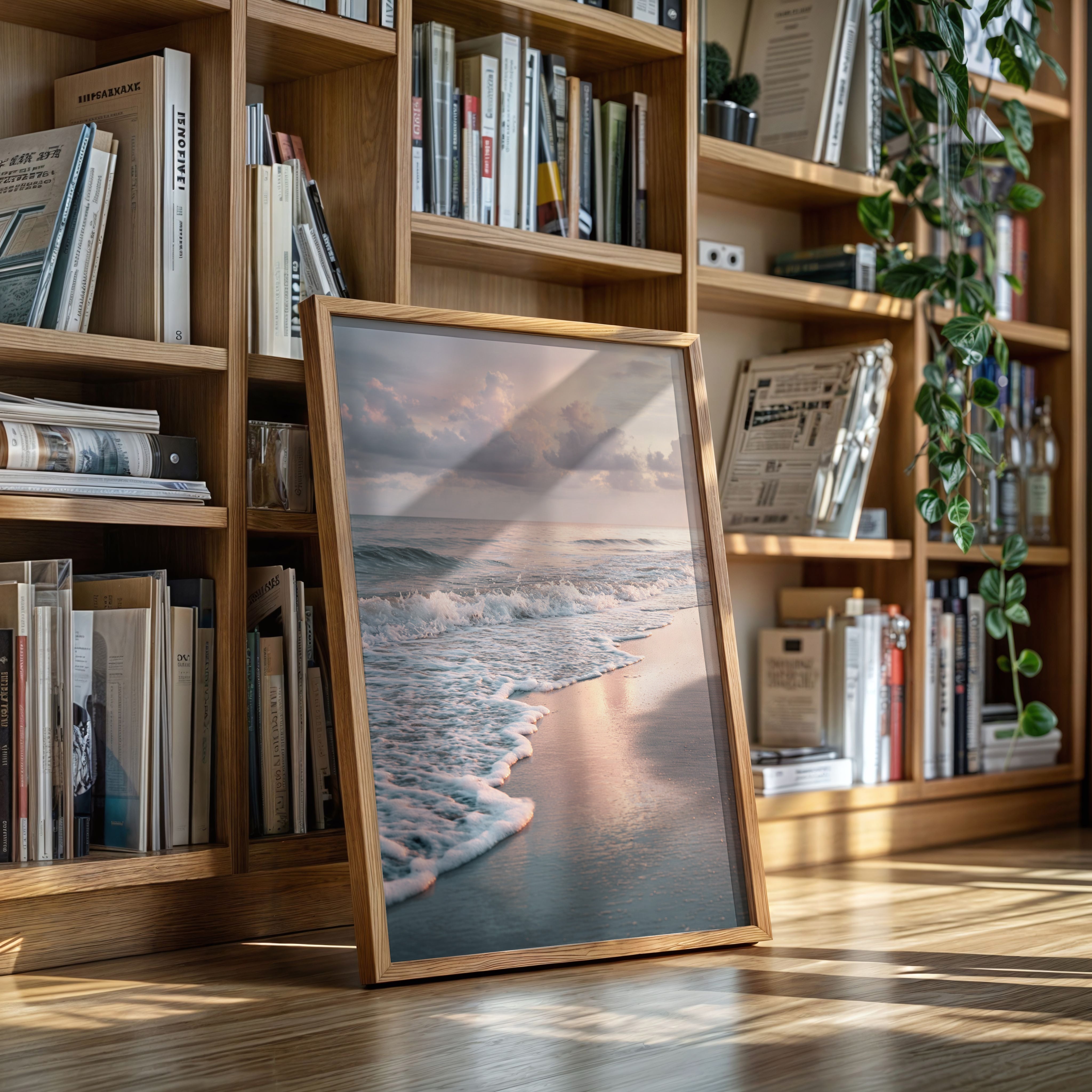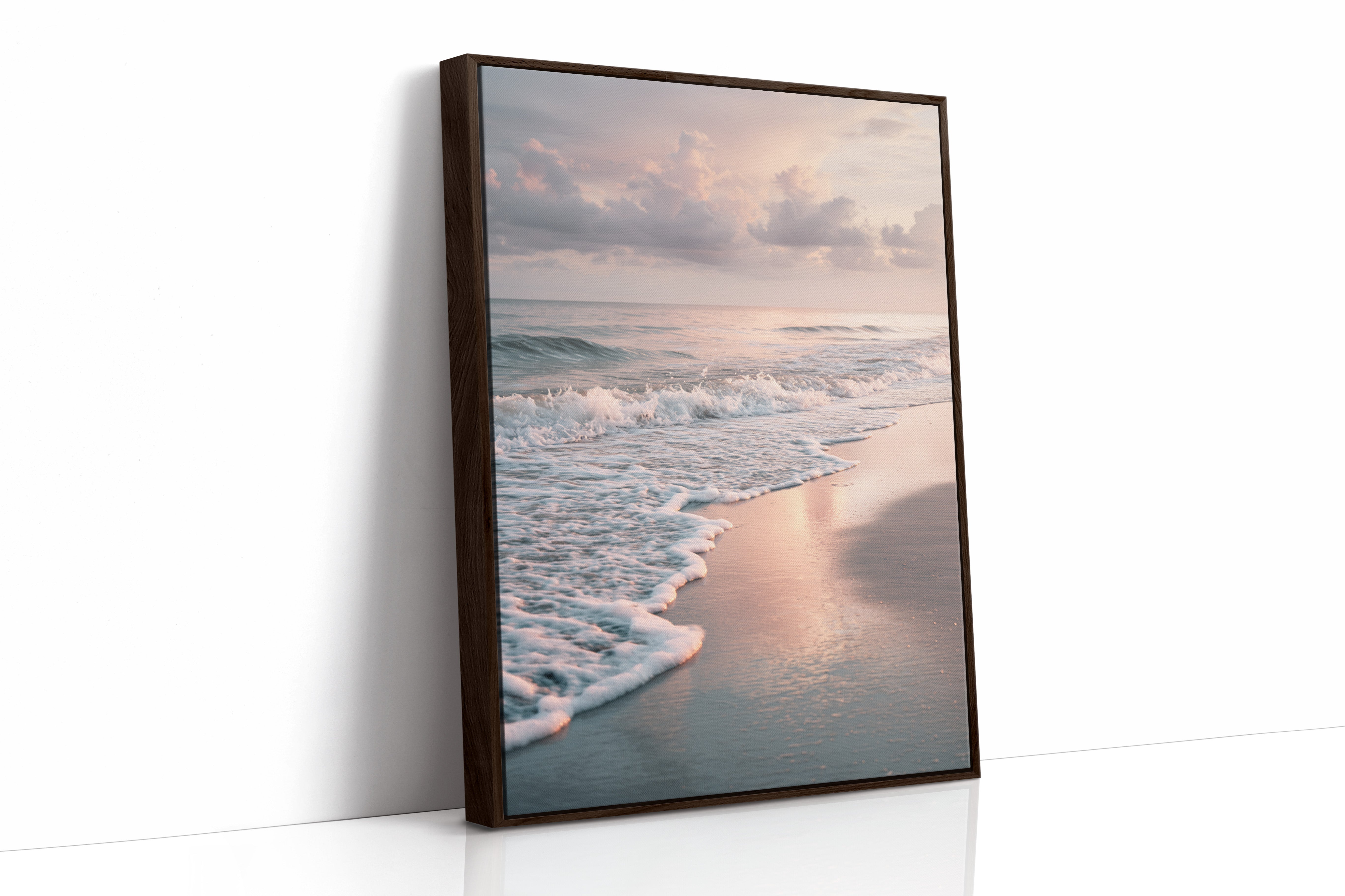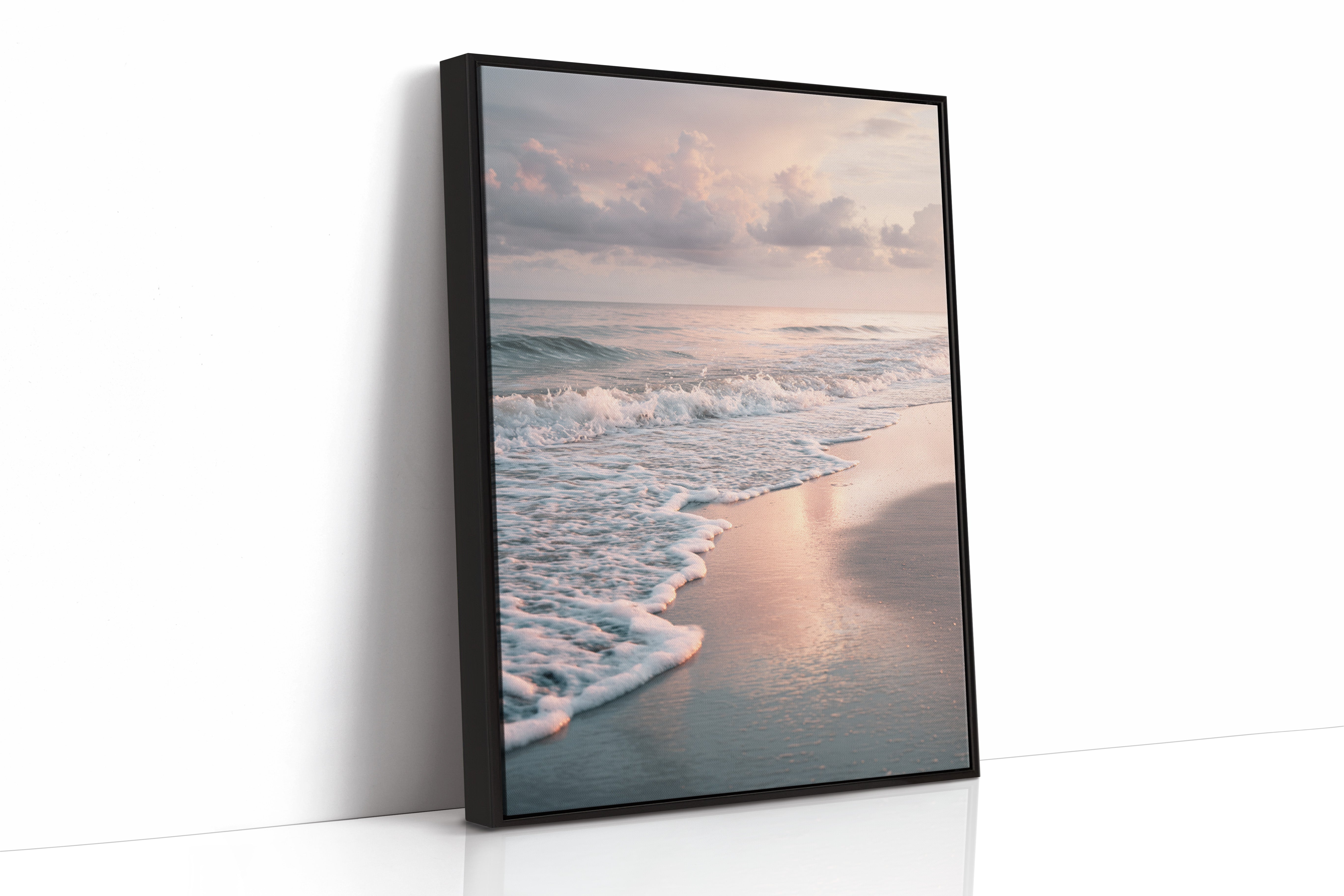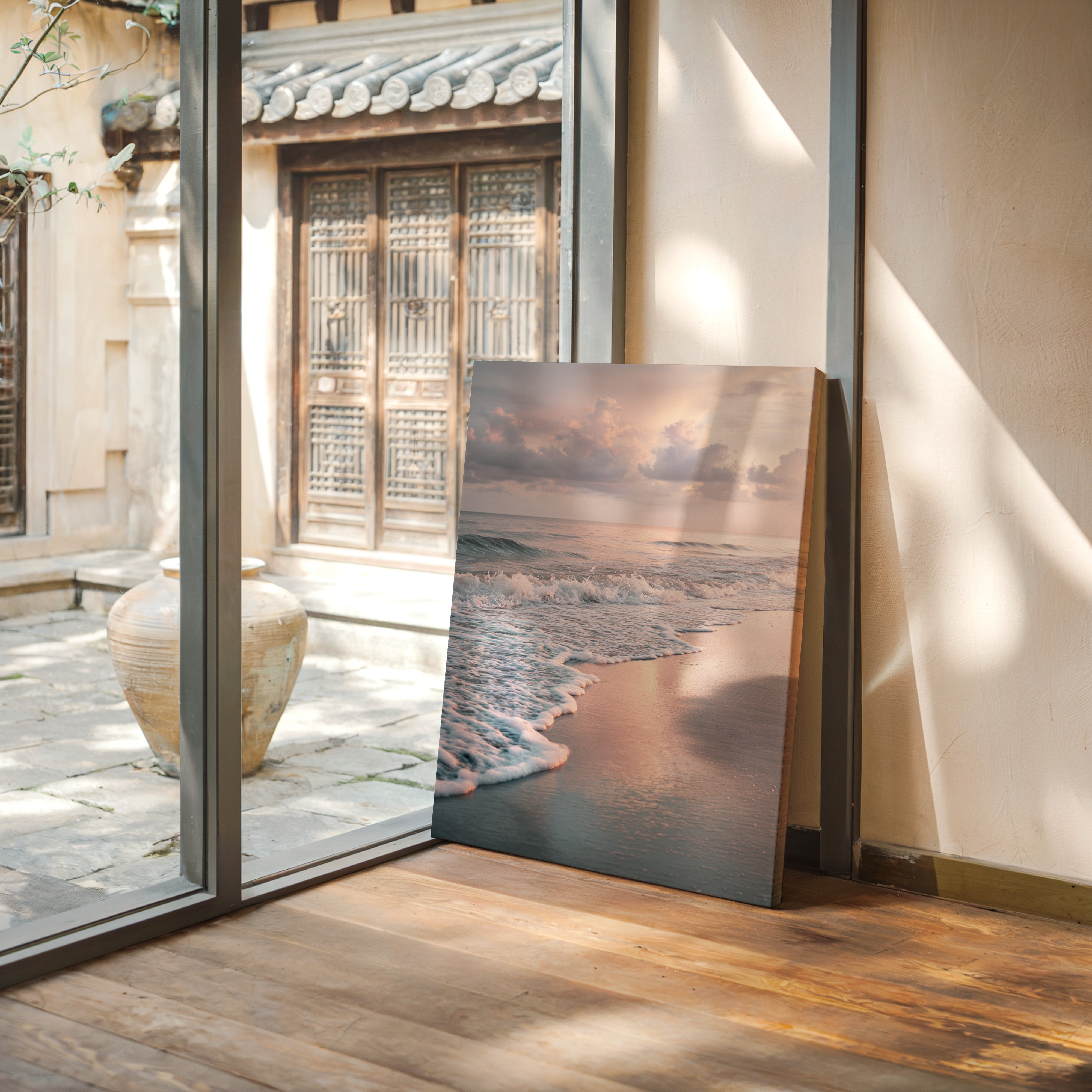 A serene moment unfolds as soft waves caress the shore, their gentle rhythm echoing the day's farewell. This piece captures the tranquil essence of coastal beauty, embodying the artisanal spirit of nature's artistry. Hues of pink and gold mingle on the water's surface, inviting reflection and a sense of calm. Ideal for a peaceful sanctuary, it transforms any space into a coastal retreat where tranquility reigns.