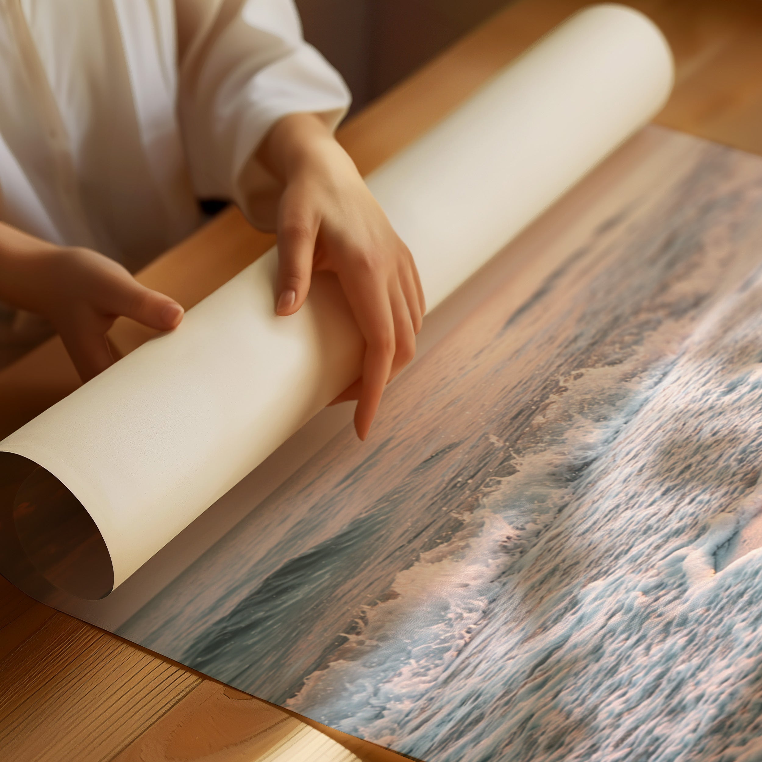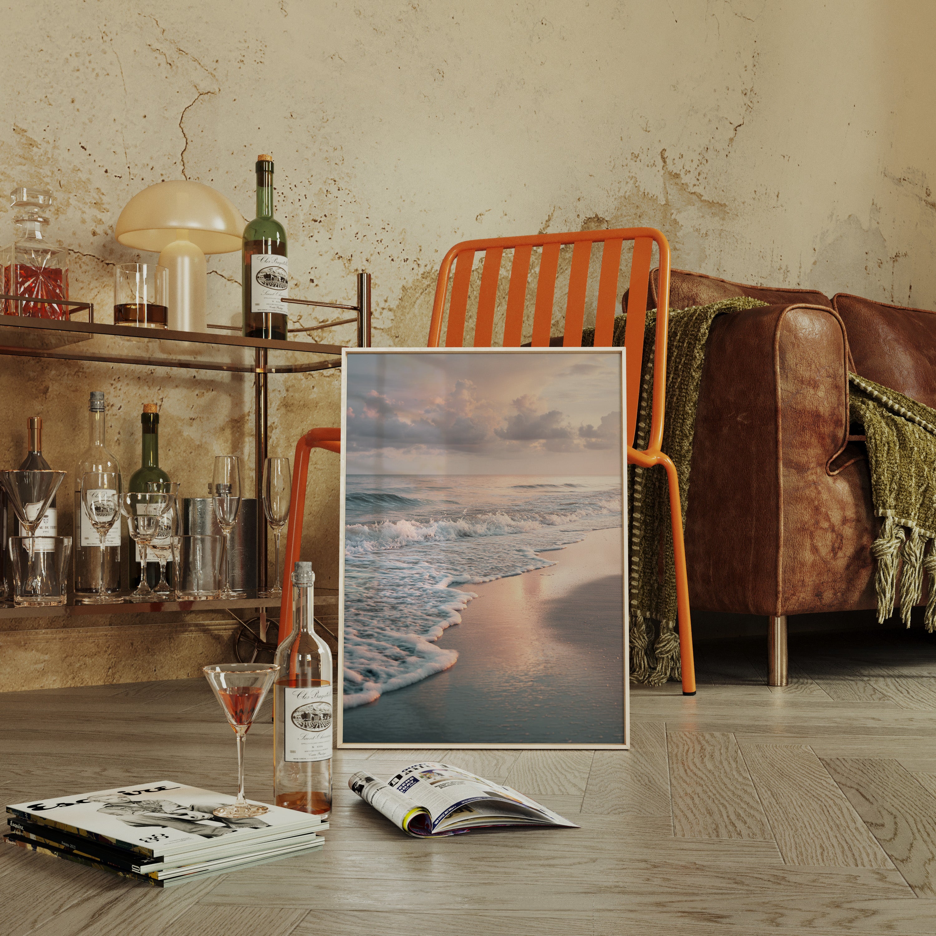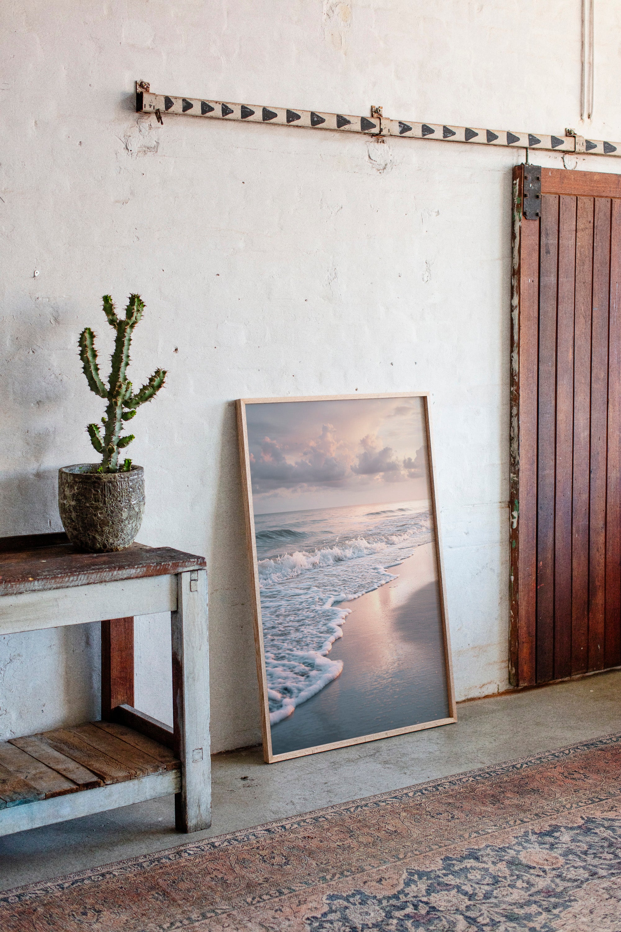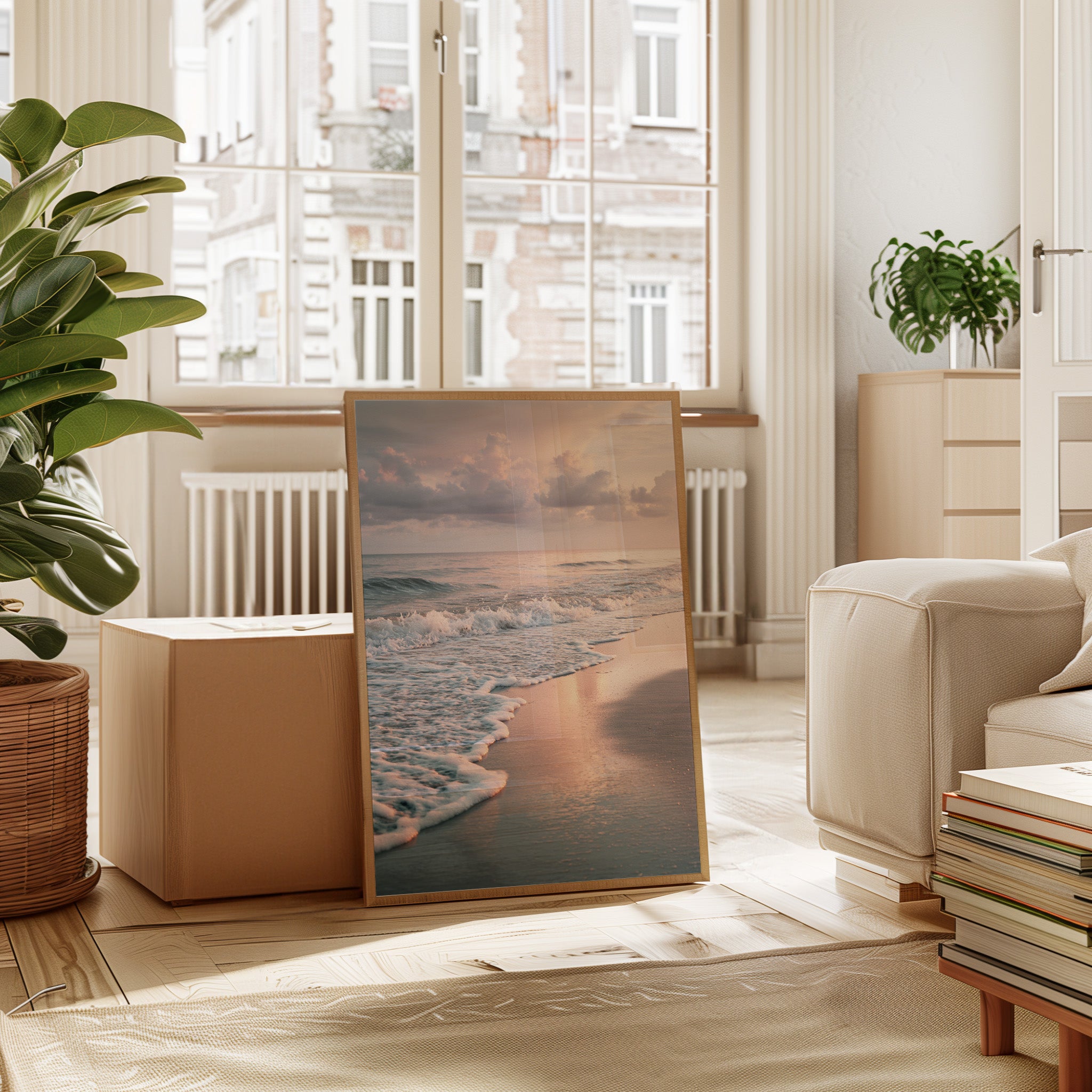 A serene moment unfolds as soft waves caress the shore, their gentle rhythm echoing the day's farewell. This piece captures the tranquil essence of coastal beauty, embodying the artisanal spirit of nature's artistry. Hues of pink and gold mingle on the water's surface, inviting reflection and a sense of calm. Ideal for a peaceful sanctuary, it transforms any space into a coastal retreat where tranquility reigns.