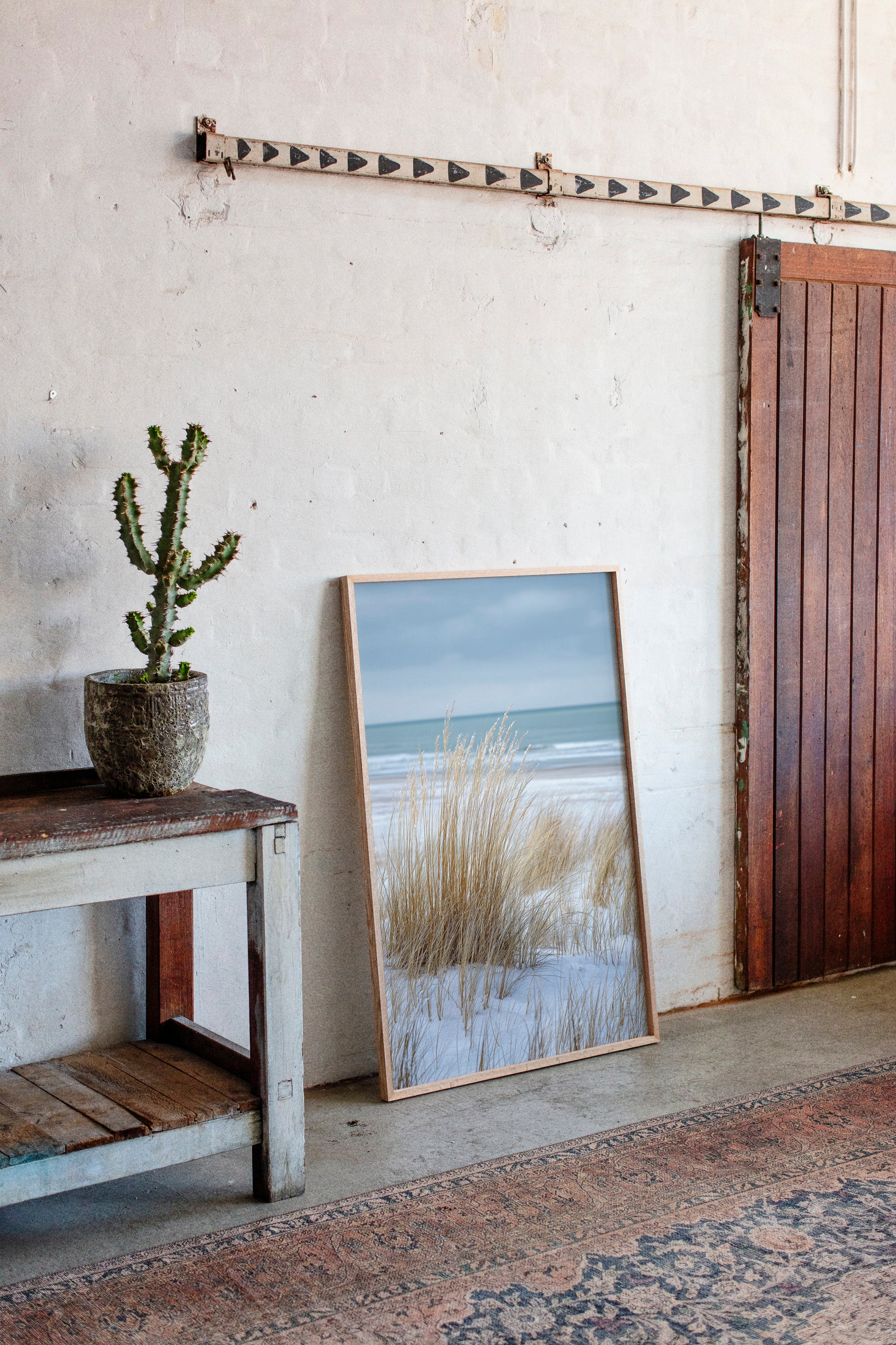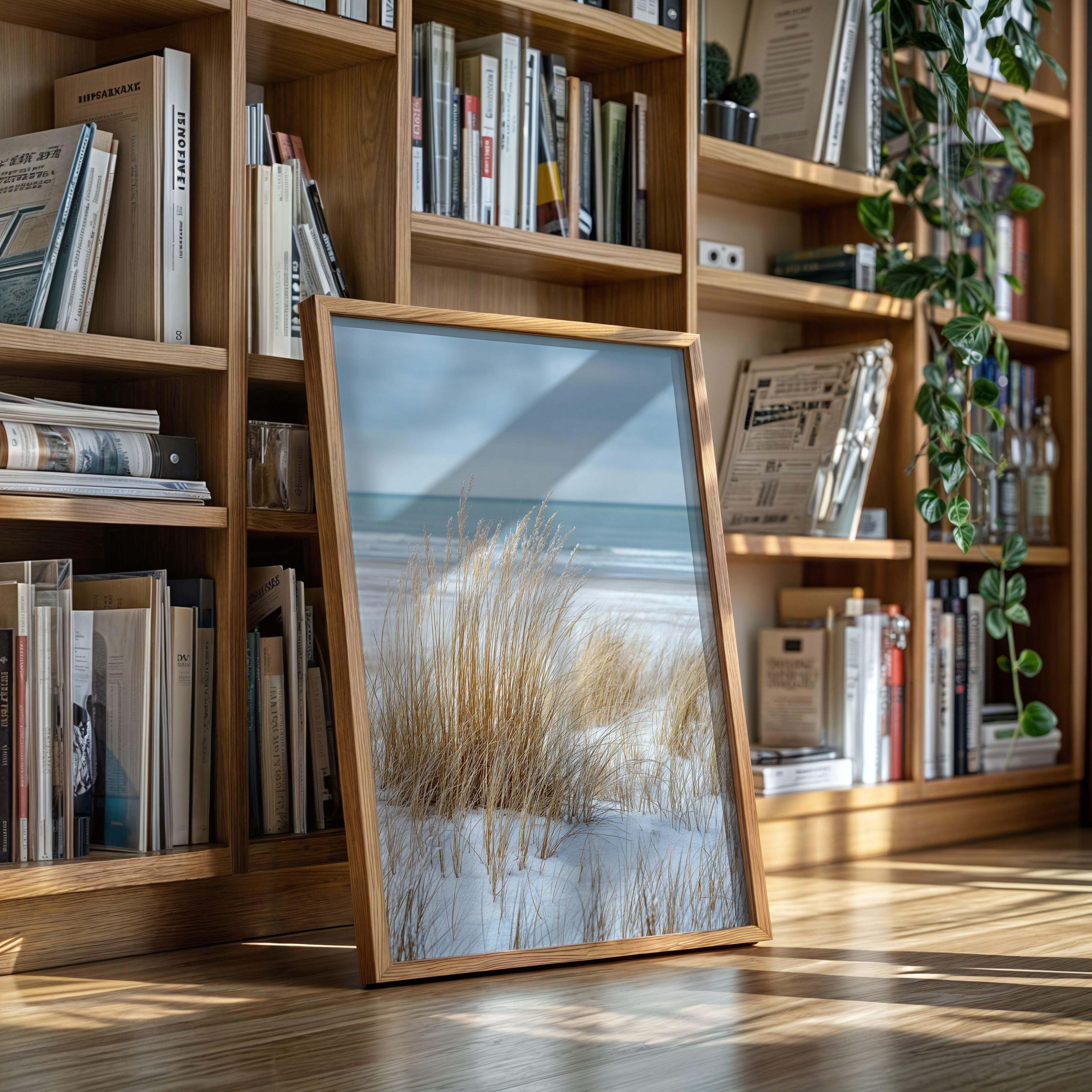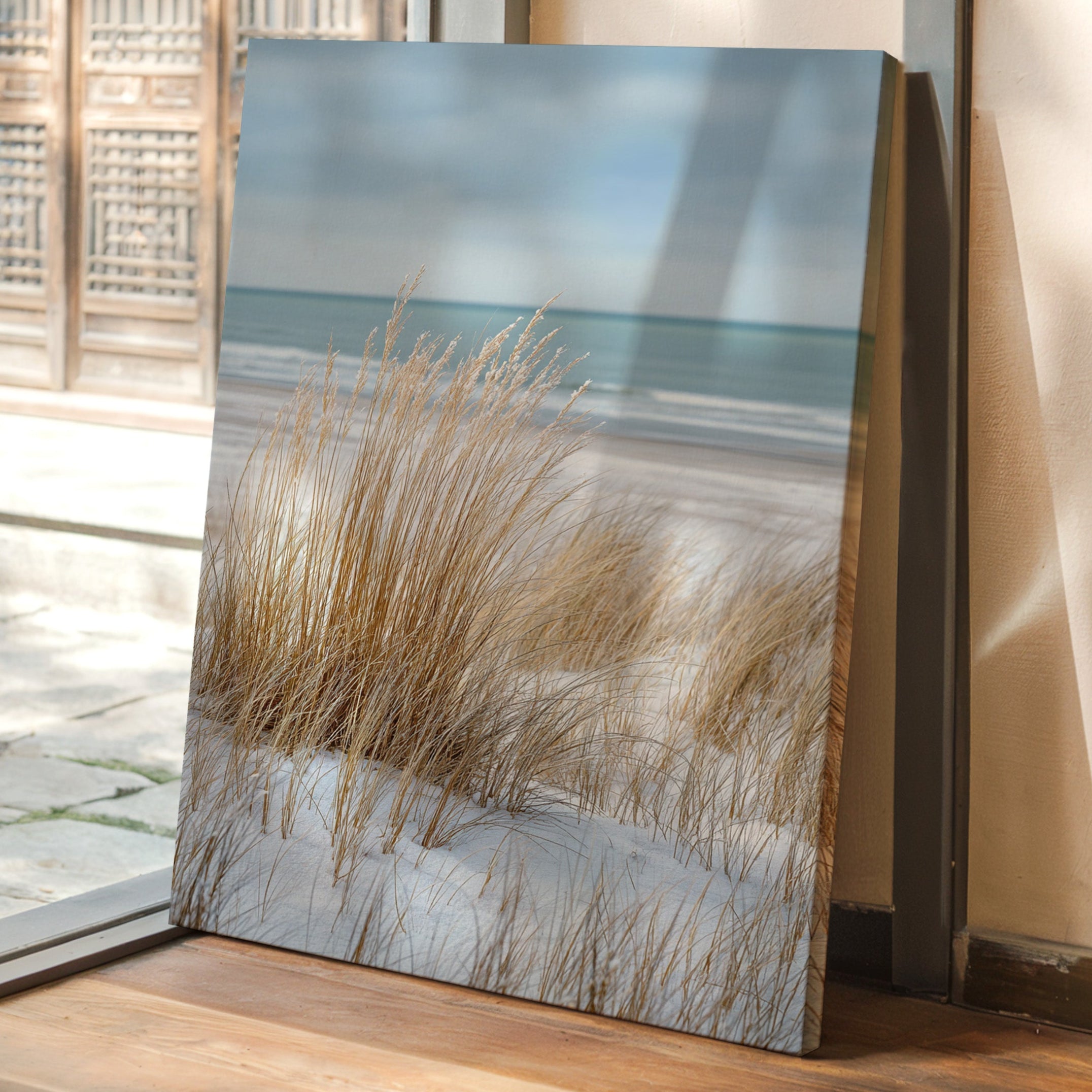 Amidst the soft embrace of winter, golden grasses sway gently, cradled by the sea breeze. This piece encapsulates a tranquil moment in nature, where the waves meet the shore in perfect harmony. The delicate contrast of frosted sand and sunlit strands evokes a sense of calm, inviting the viewer to pause and reflect on the beauty of untouched landscapes. Ideal for a serene bedroom or a peaceful reading nook, this artwork brings the essence of coastal tranquility indoors.