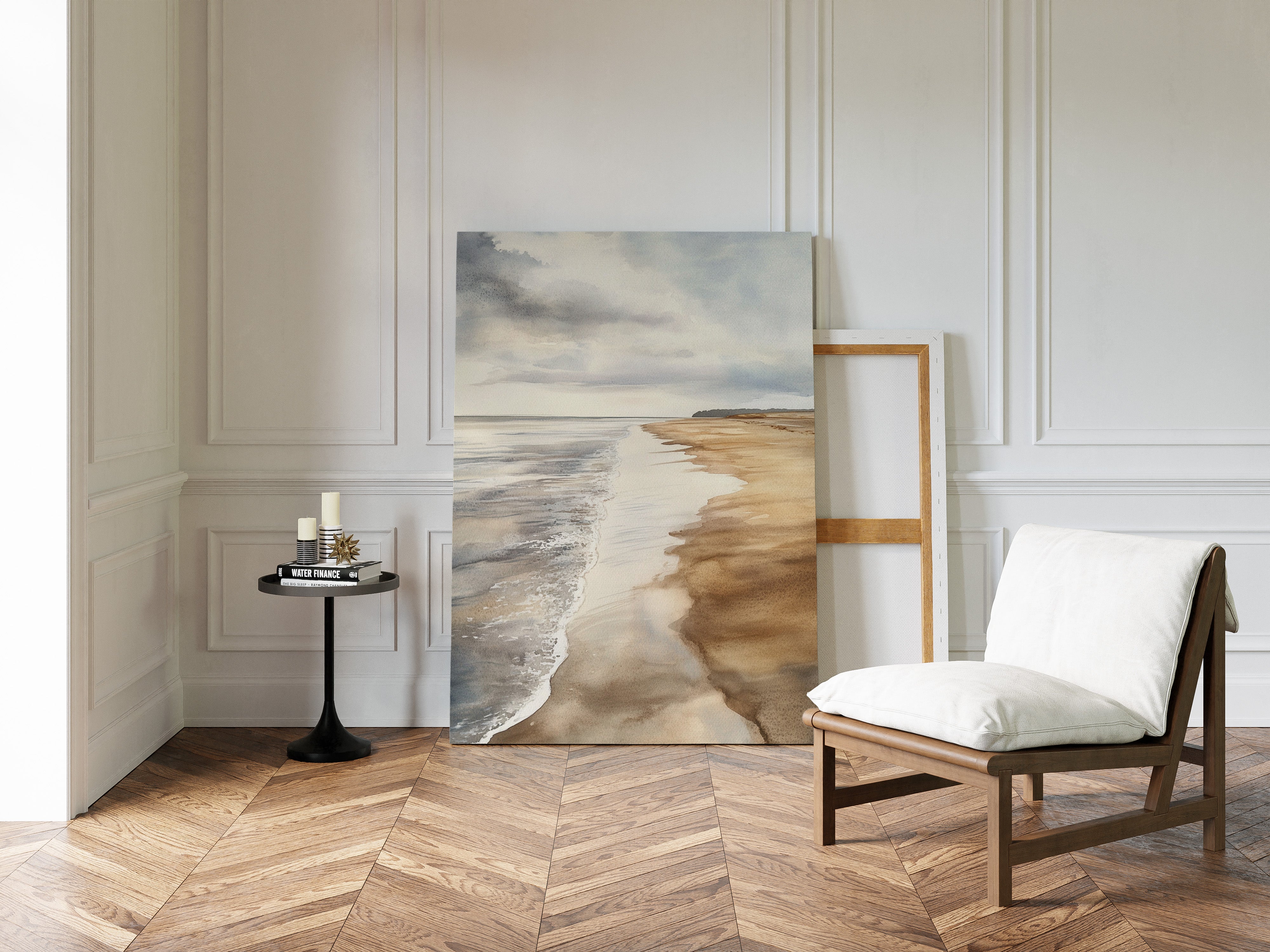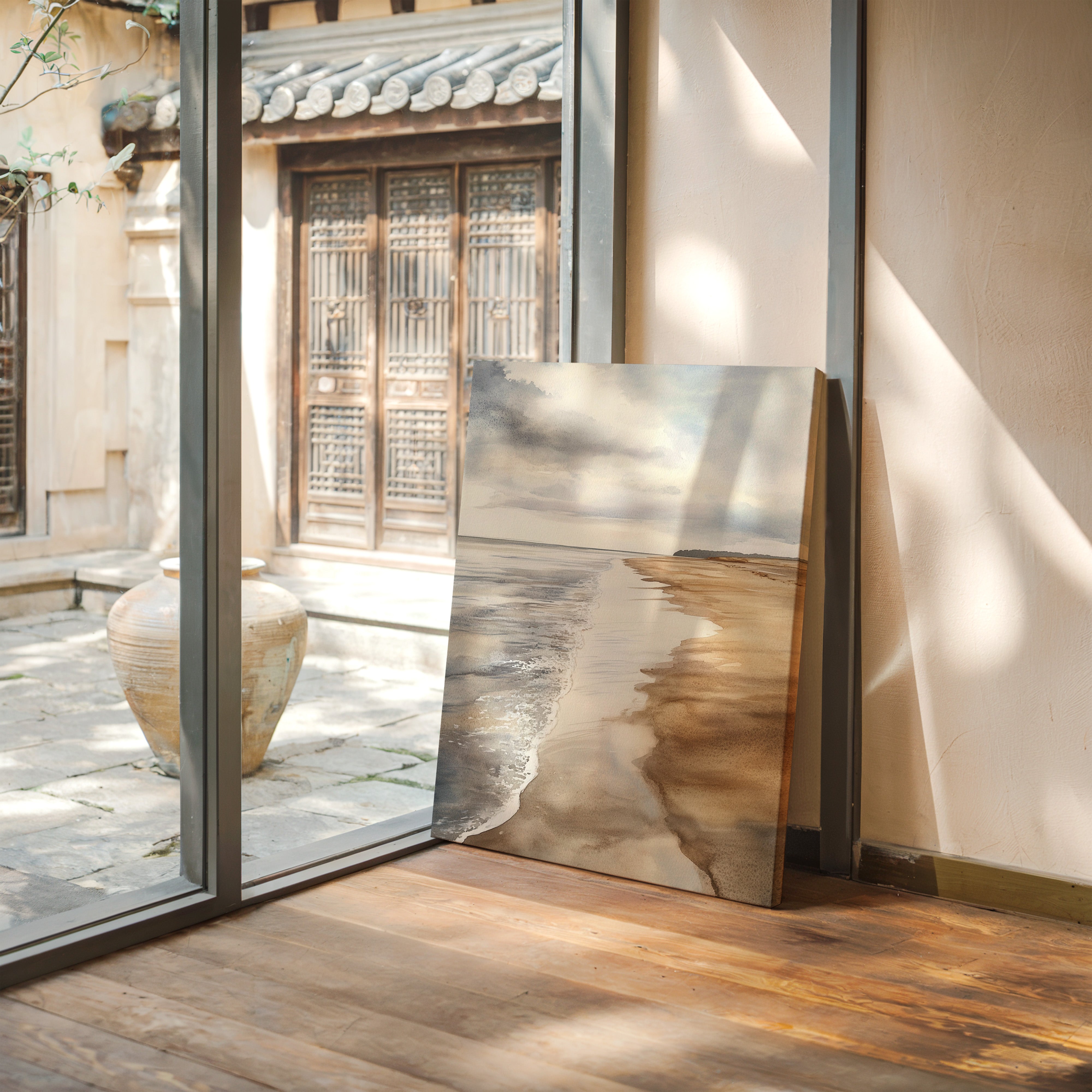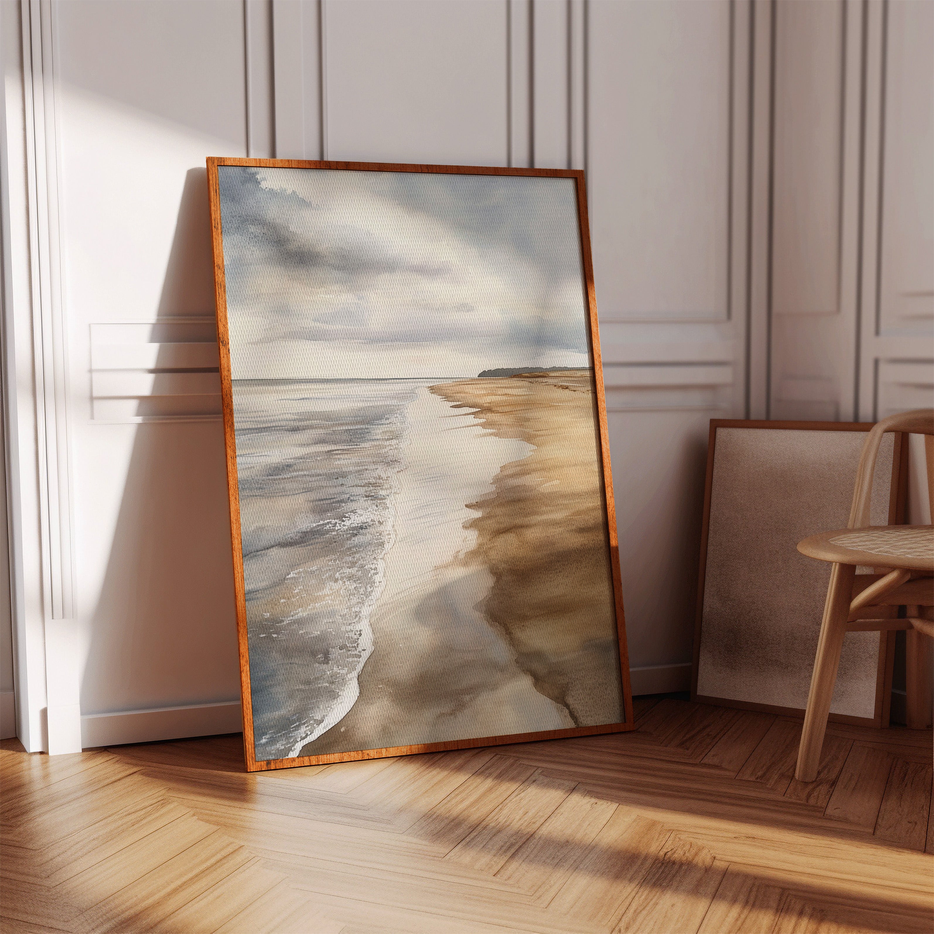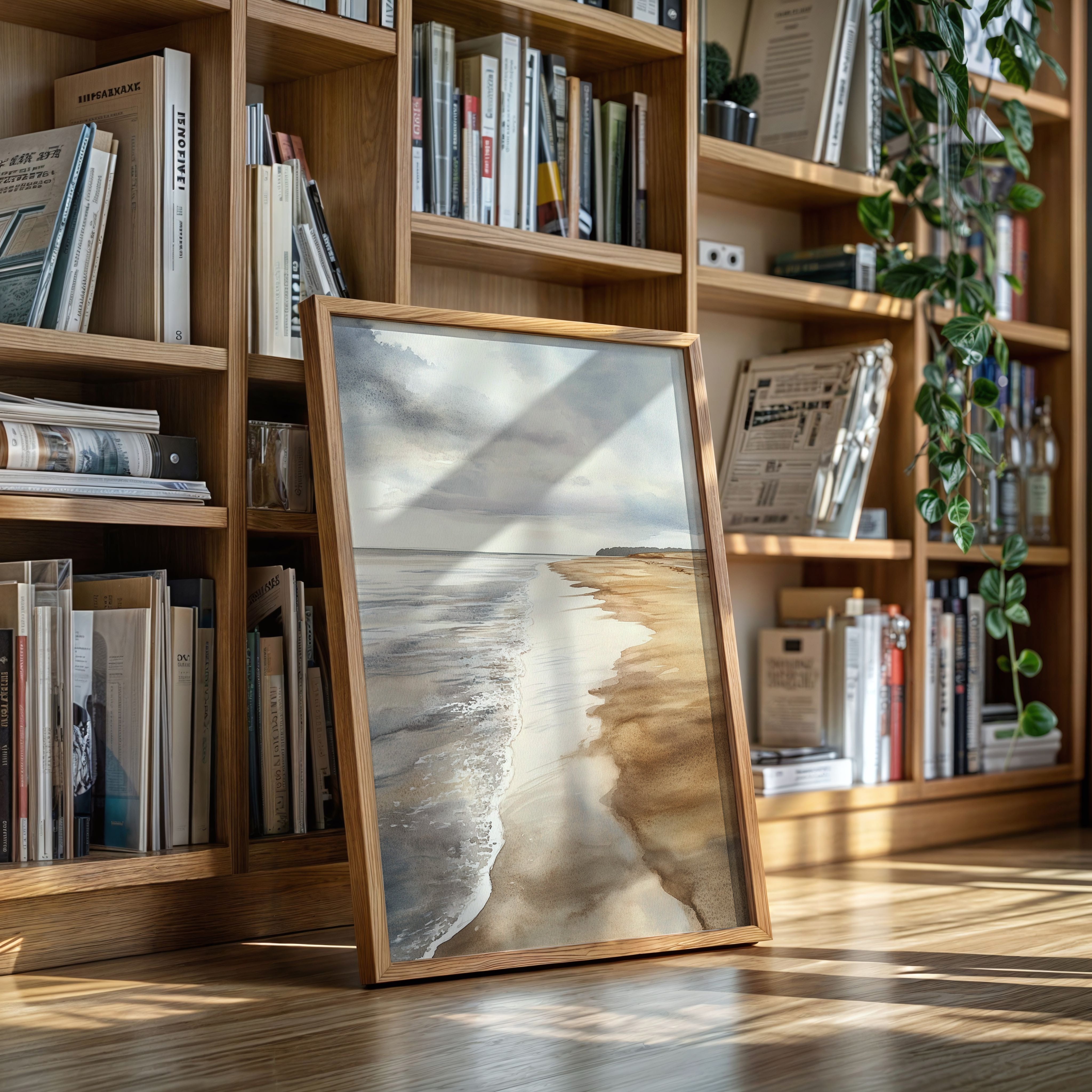 A gentle breeze stirs the surface, where ocean kisses shore in a delicate embrace. This piece captures the serene beauty of coastal landscapes, celebrating the harmony of nature. Soft hues blend seamlessly, with the rhythmic dance of waves creating a tranquil symphony, inviting reflection and calm.