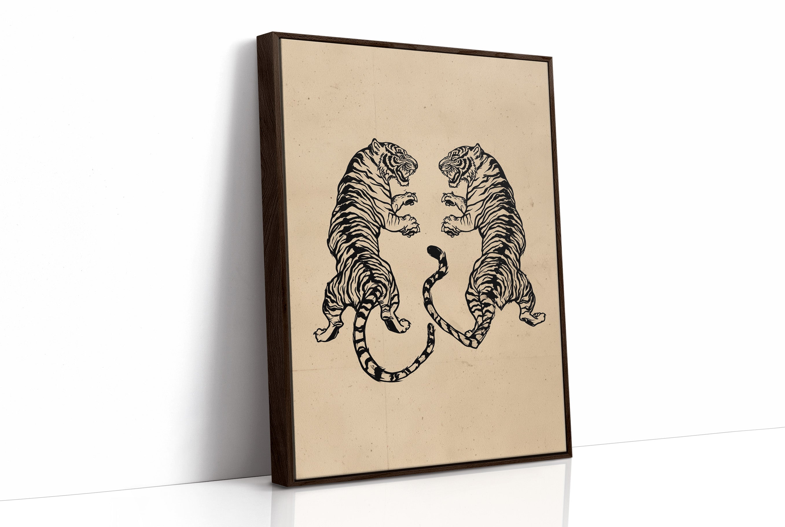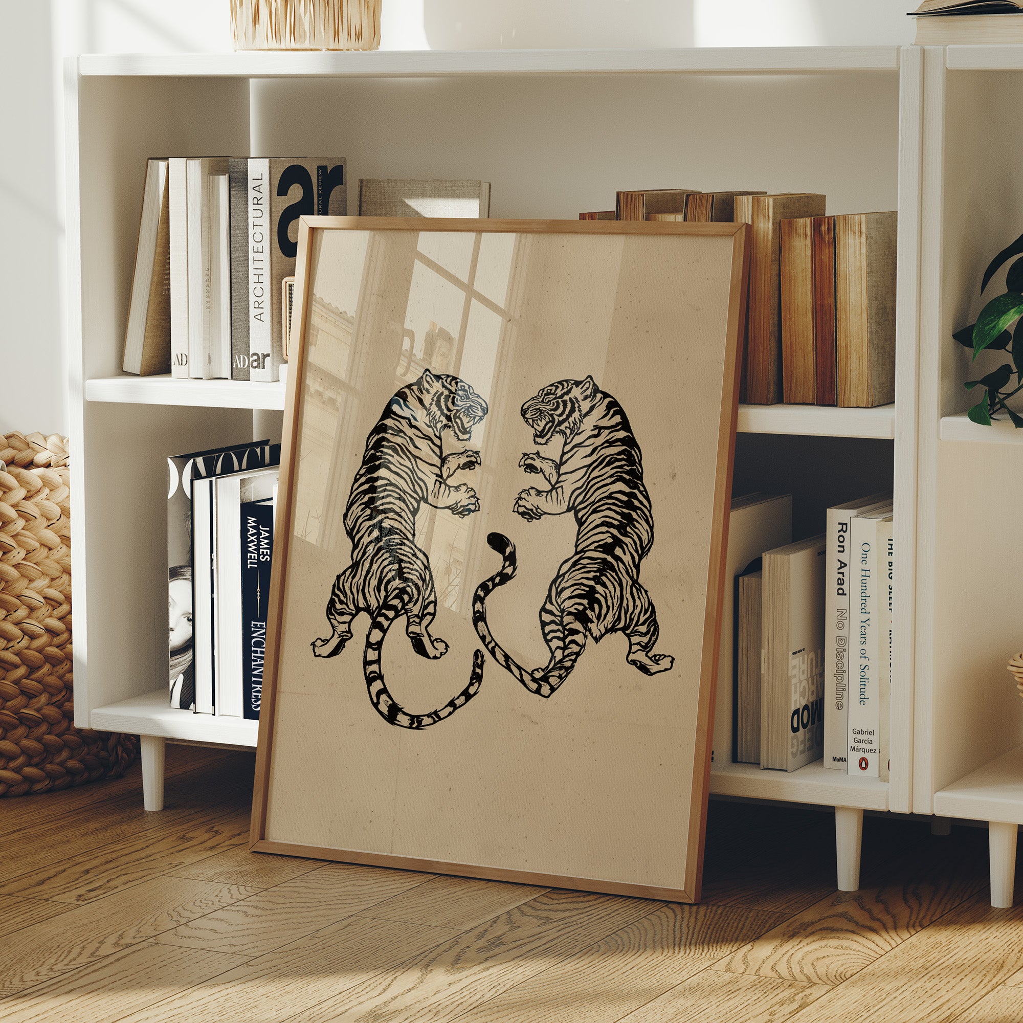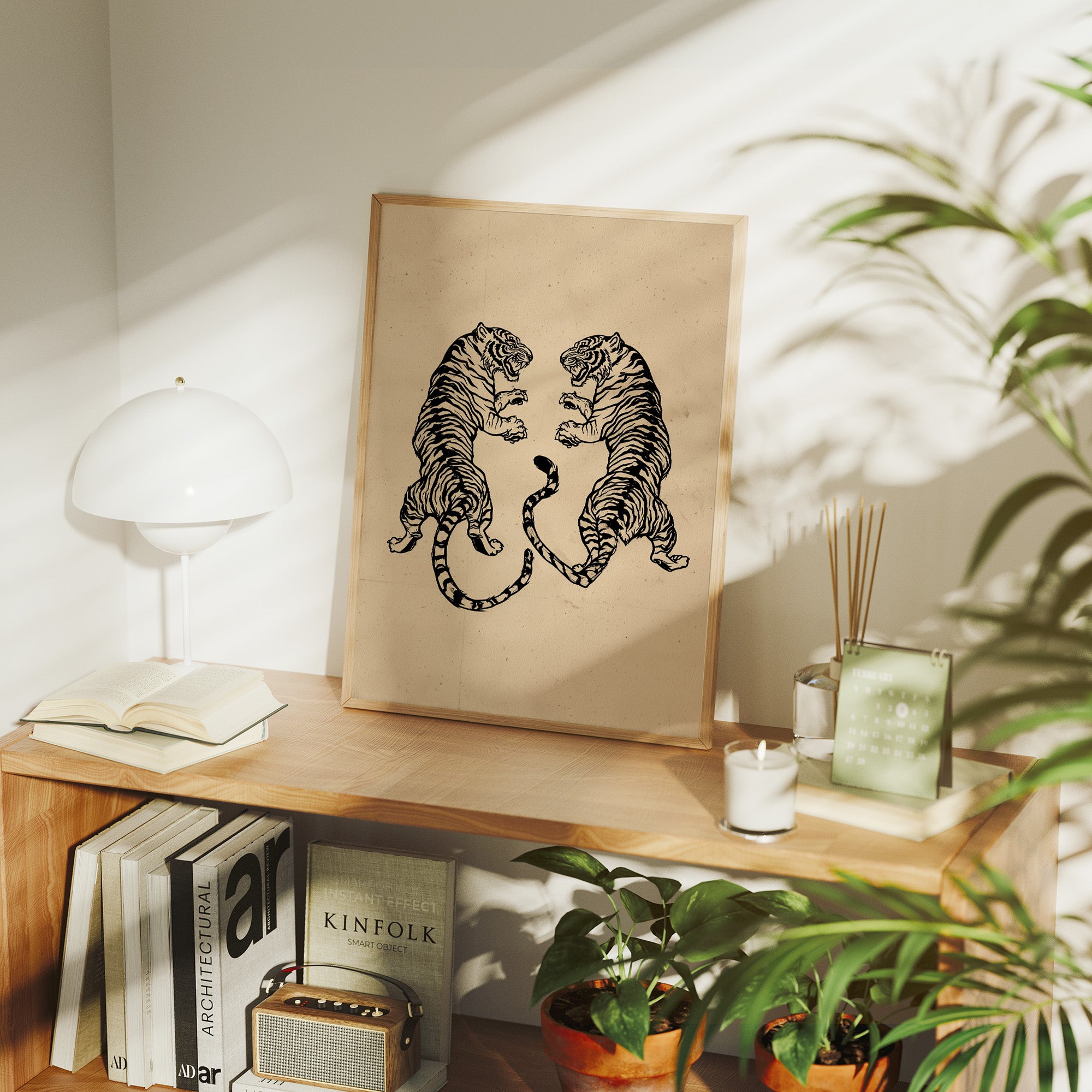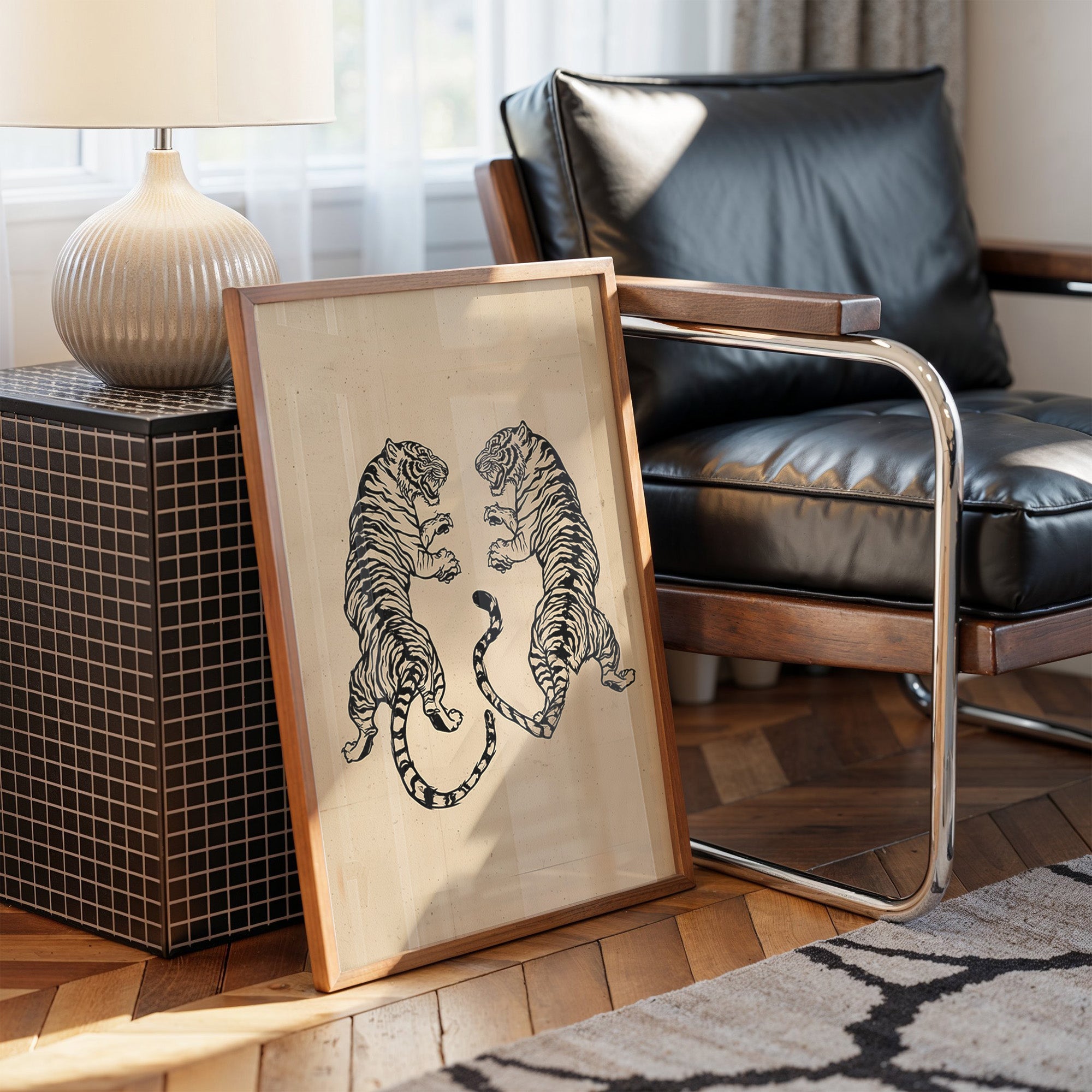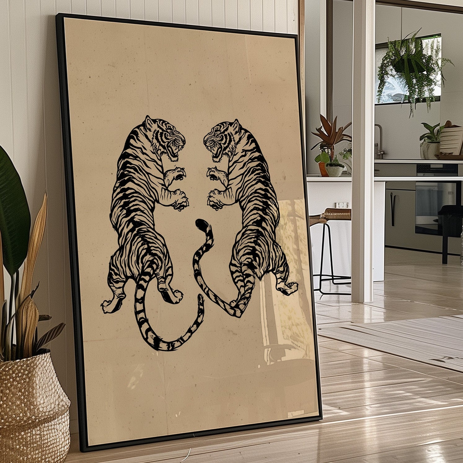 Morning light streams across a minimalist scene, where two fierce tigers face each other in an eternal dance of power and grace. The bold black brushstrokes against cream-colored paper capture their raw energy and wild spirit, their tails forming an elegant curve that connects their primal dialogue. This striking illustration merges traditional Asian art influences with contemporary minimalist design, creating a powerful statement of symmetry and strength. Perfect for bringing bold character to a modern reading nook, home office, or meditation space where its dramatic simplicity can command attention while maintaining zen-like balance.