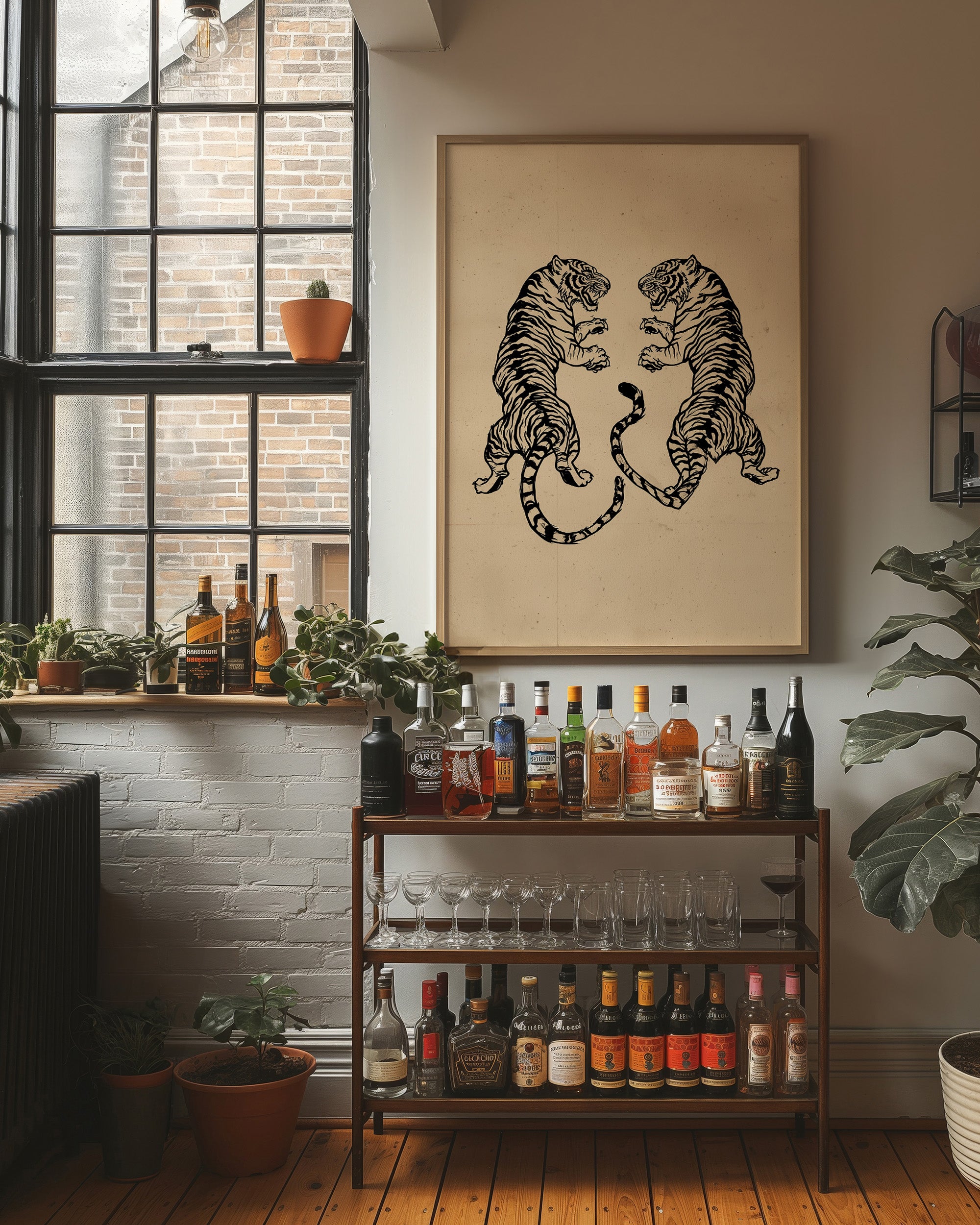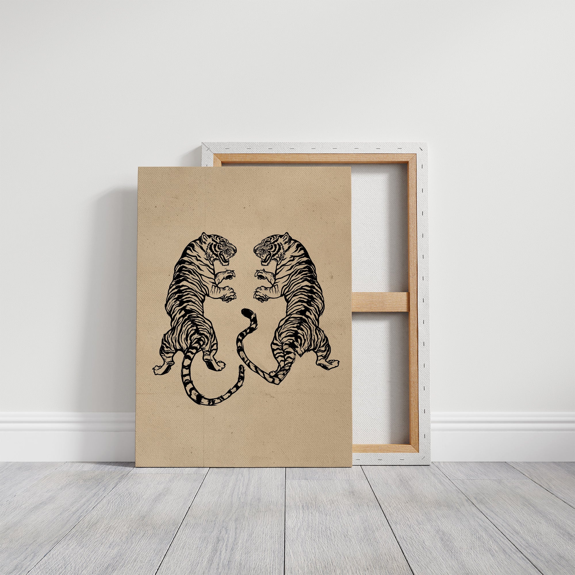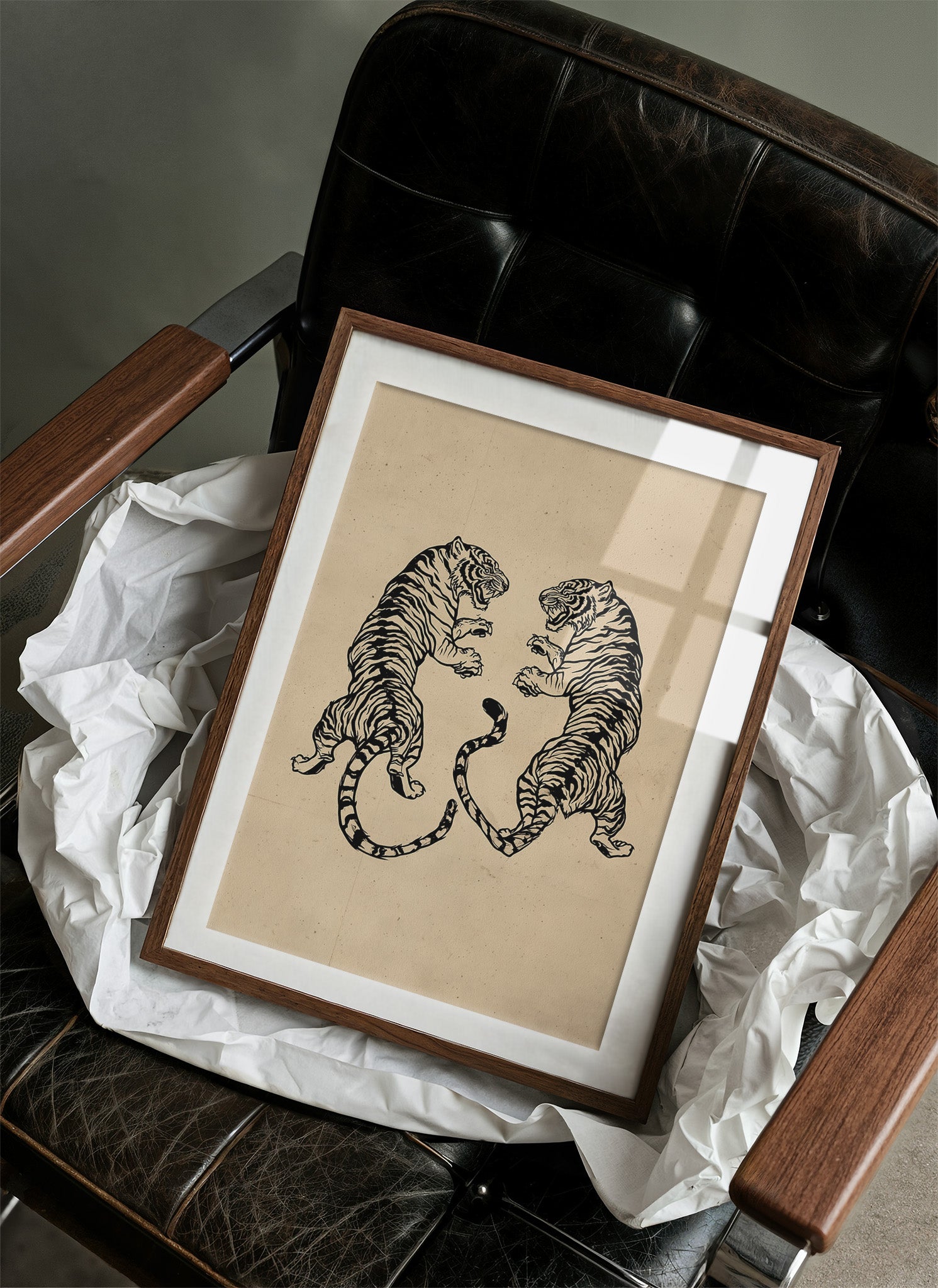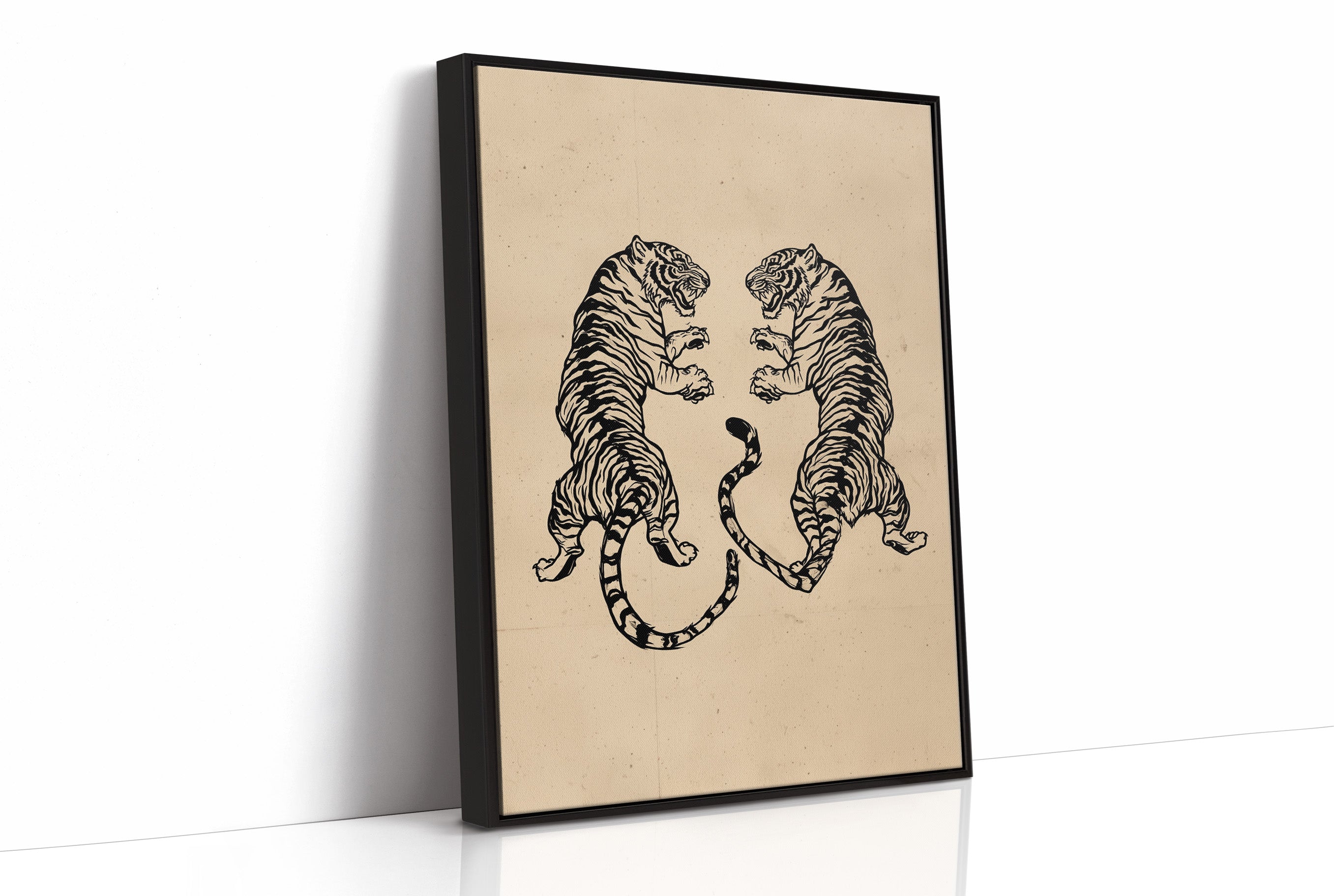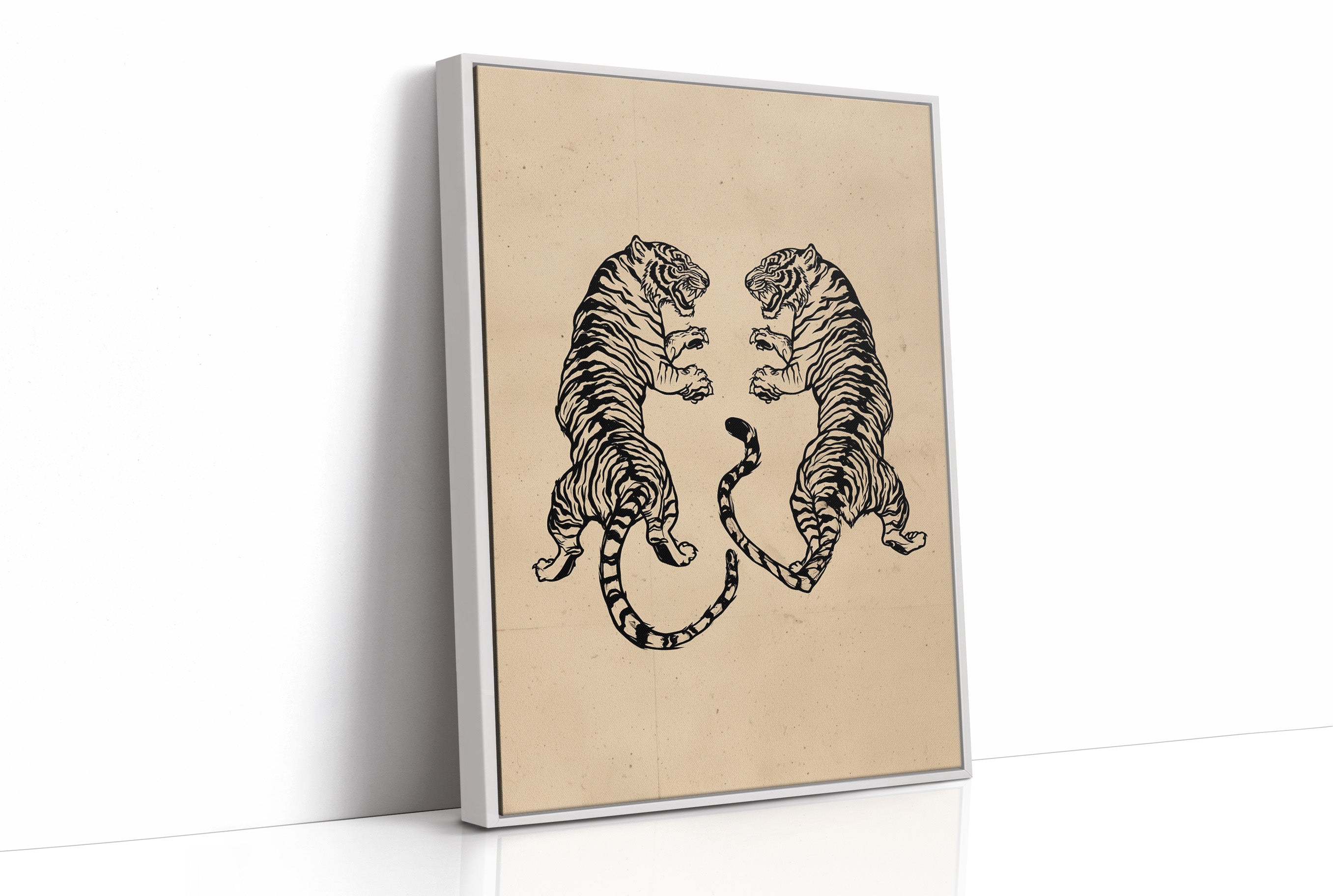 Morning light streams across a minimalist scene, where two fierce tigers face each other in an eternal dance of power and grace. The bold black brushstrokes against cream-colored paper capture their raw energy and wild spirit, their tails forming an elegant curve that connects their primal dialogue. This striking illustration merges traditional Asian art influences with contemporary minimalist design, creating a powerful statement of symmetry and strength. Perfect for bringing bold character to a modern reading nook, home office, or meditation space where its dramatic simplicity can command attention while maintaining zen-like balance.