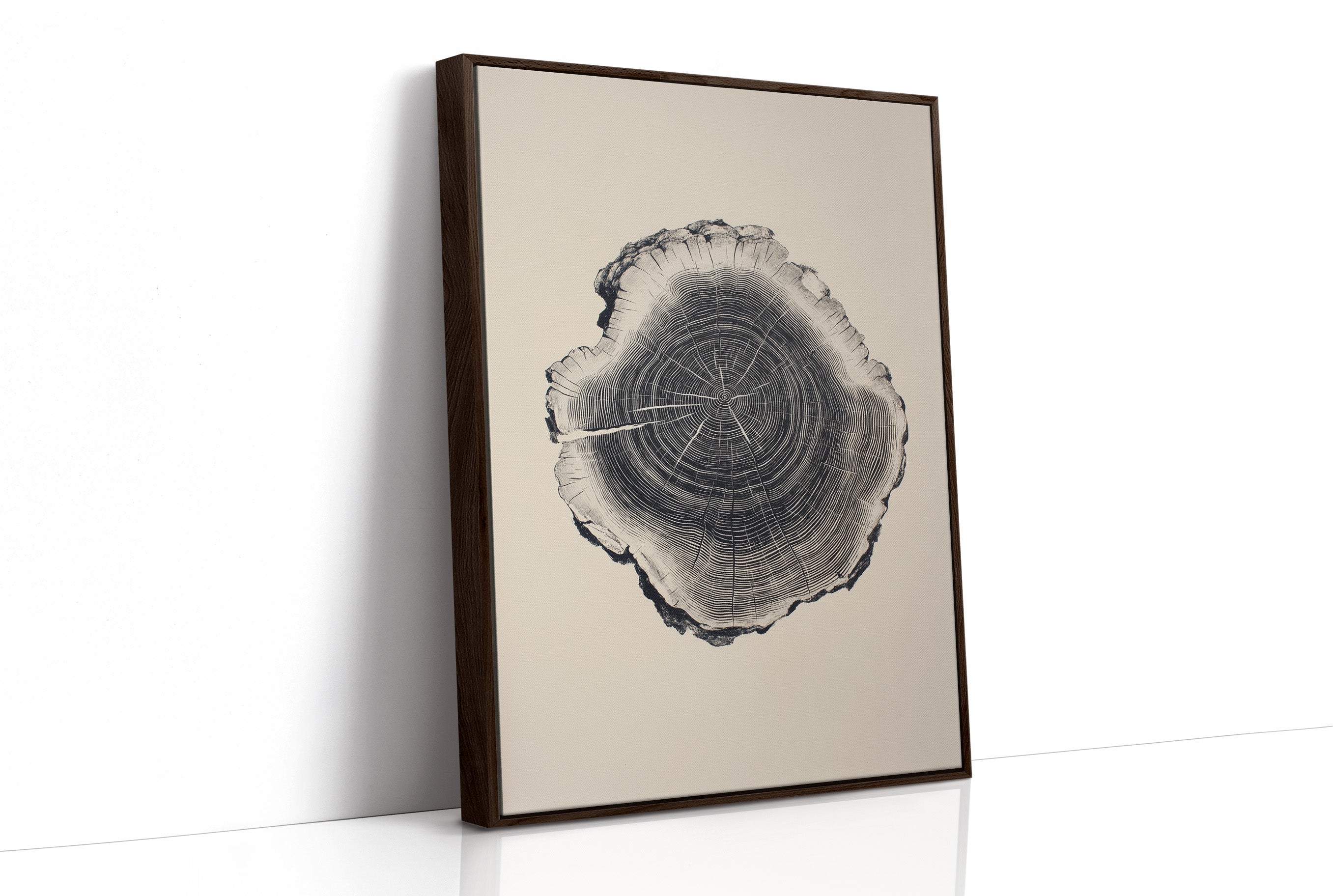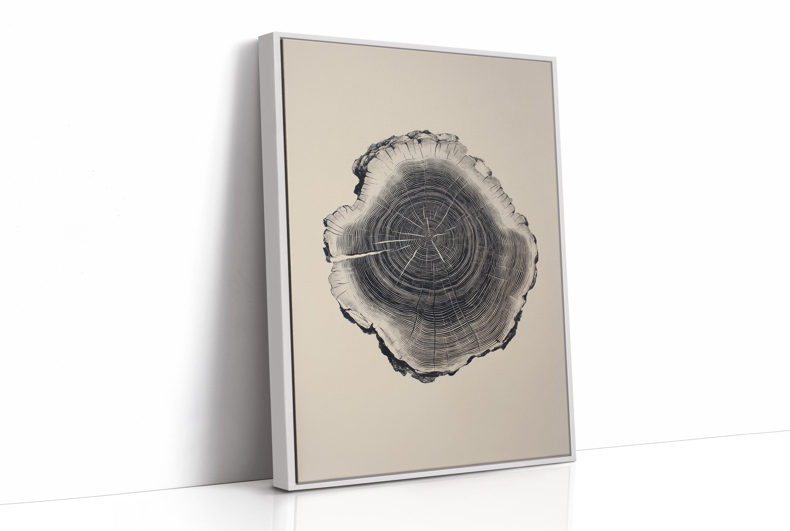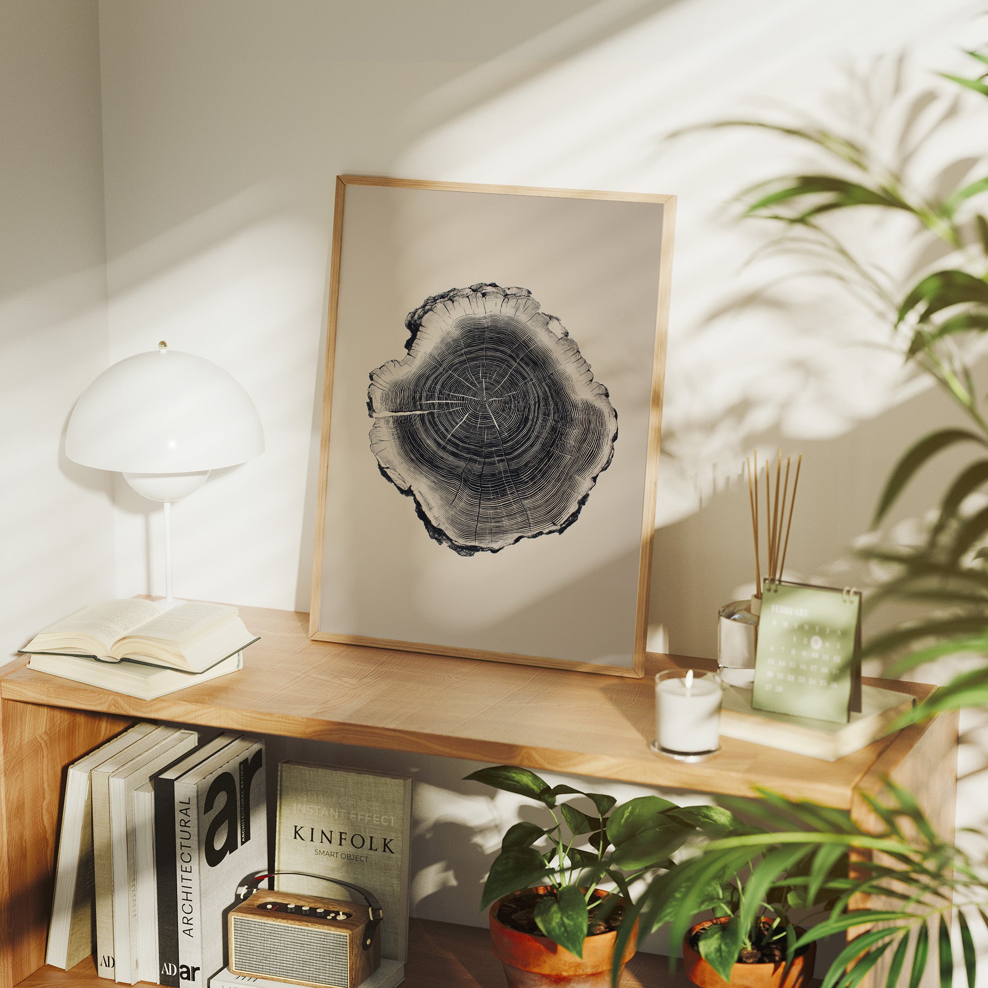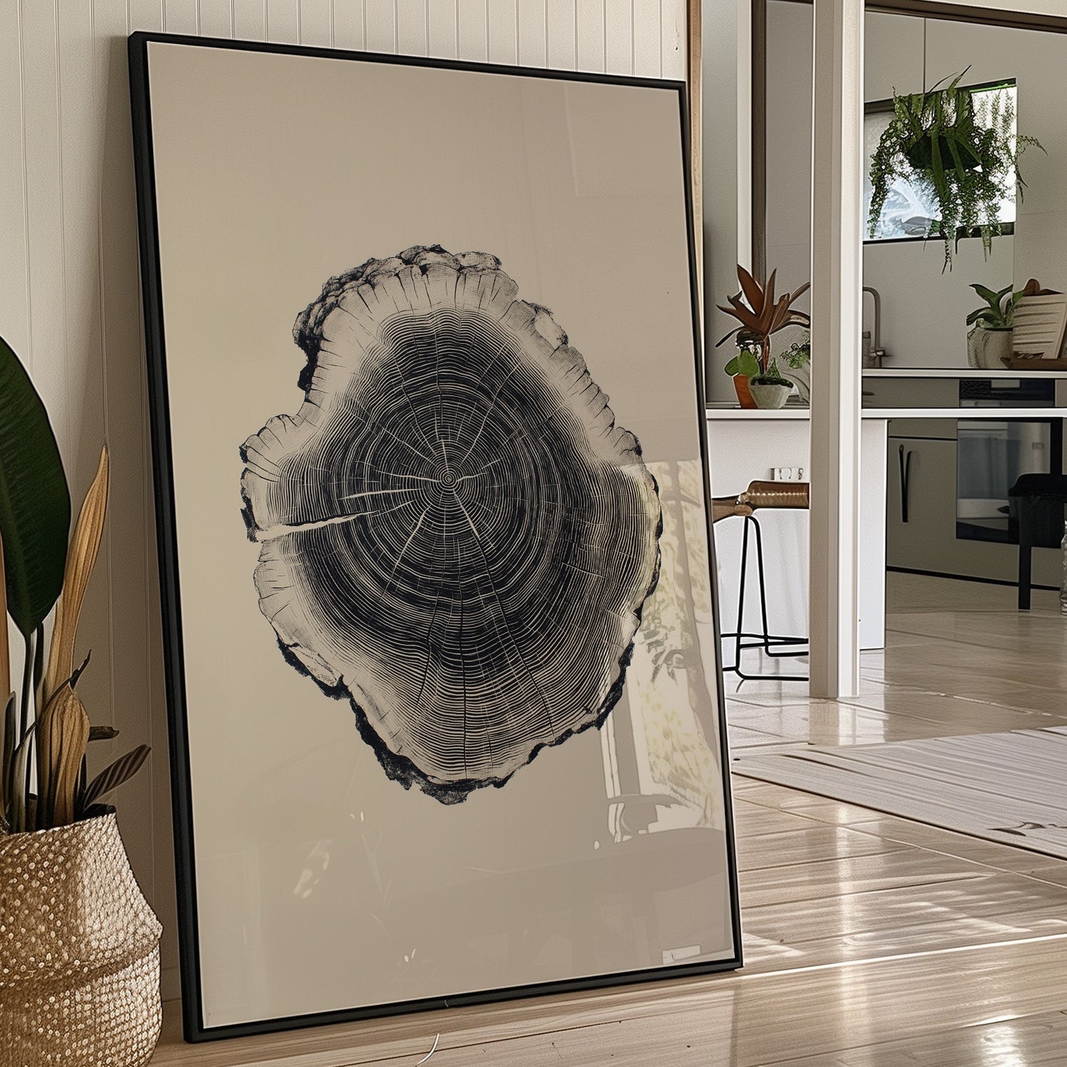 A striking black and white tree ring print creates a bold focal point in this sophisticated urban setting. The detailed cross-section reveals nature's patient artistry, each circle marking the passage of seasons against cream-colored walls. Below, a carefully curated collection of spirits rests on industrial shelving, while potted plants frame the scene with organic touches against exposed brick and generous windowlight. This space perfectly balances modern minimalism with classic industrial charm. The natural wood floors and strategic placement of greenery soften the clean lines of the bar cart and window frames. This piece serves as an anchor in spaces that celebrate the intersection of natural history and contemporary living.