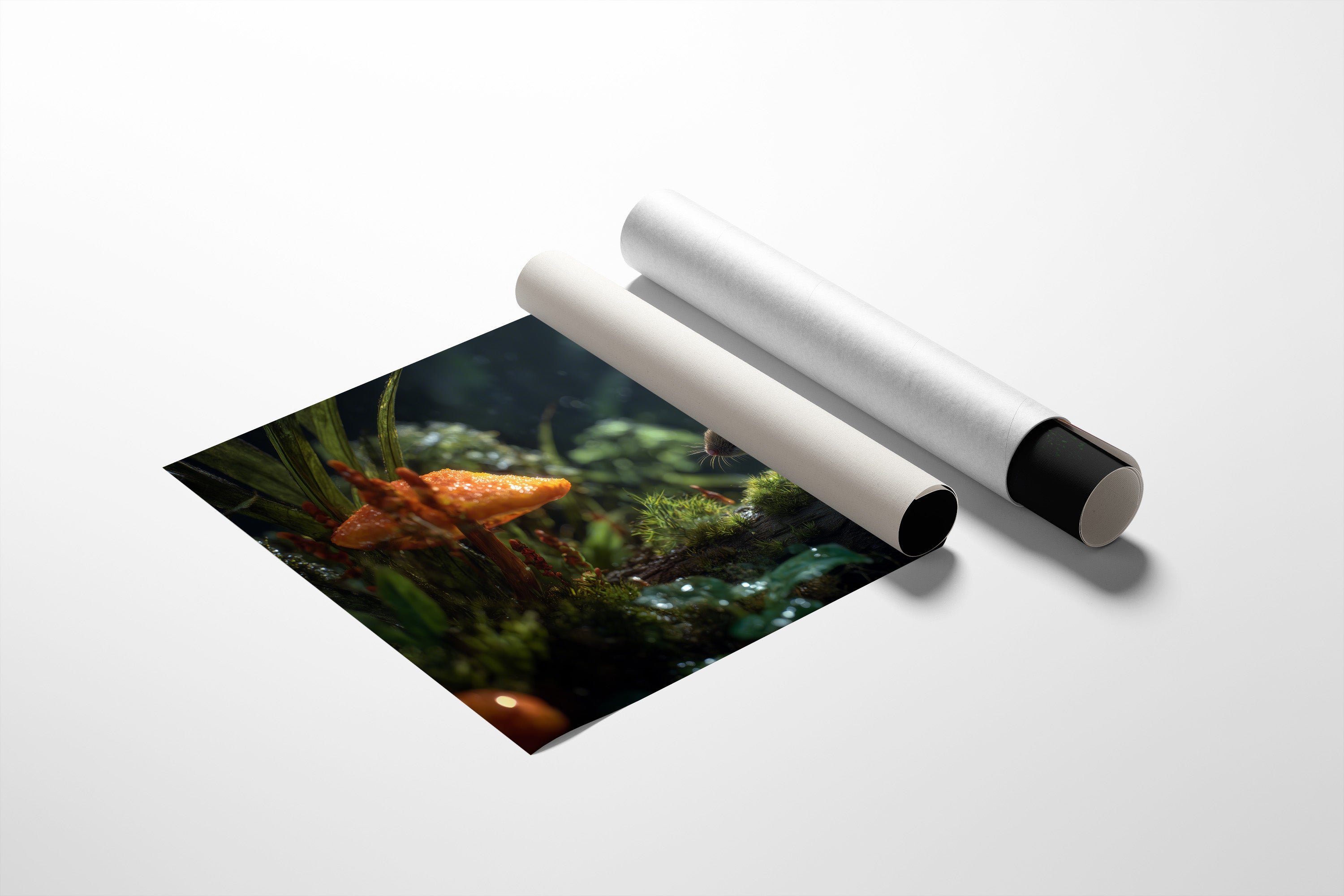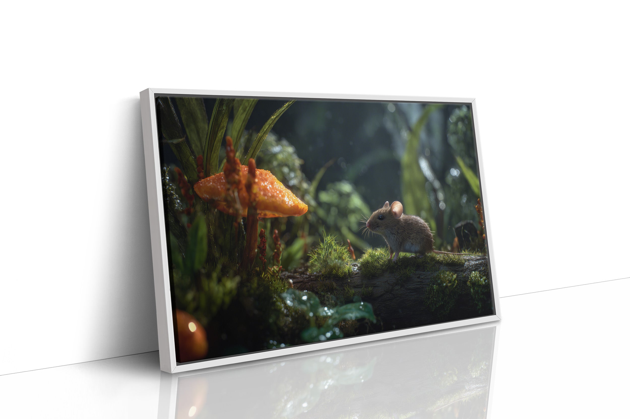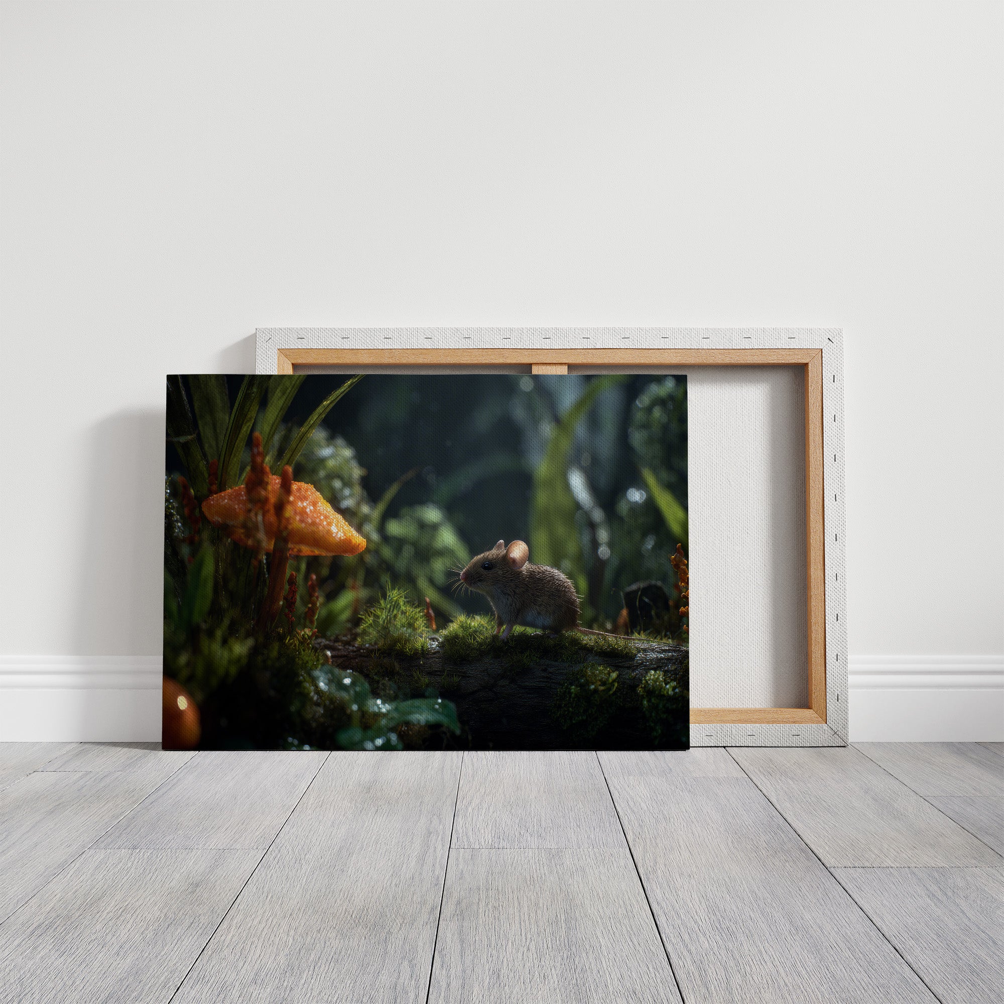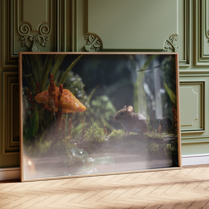 A curious field mouse pauses in a moment of wonder, illuminated by soft forest light as it discovers a glowing orange mushroom. Moss-covered terrain creates a miniature wilderness where the small creature stands sentinel, surrounded by the lush greens and mysterious shadows of an enchanted woodland floor. This captivating scene brings the magic of nature's smallest stories into sophisticated home libraries, study nooks, or creative spaces where imagination and knowledge coexist.