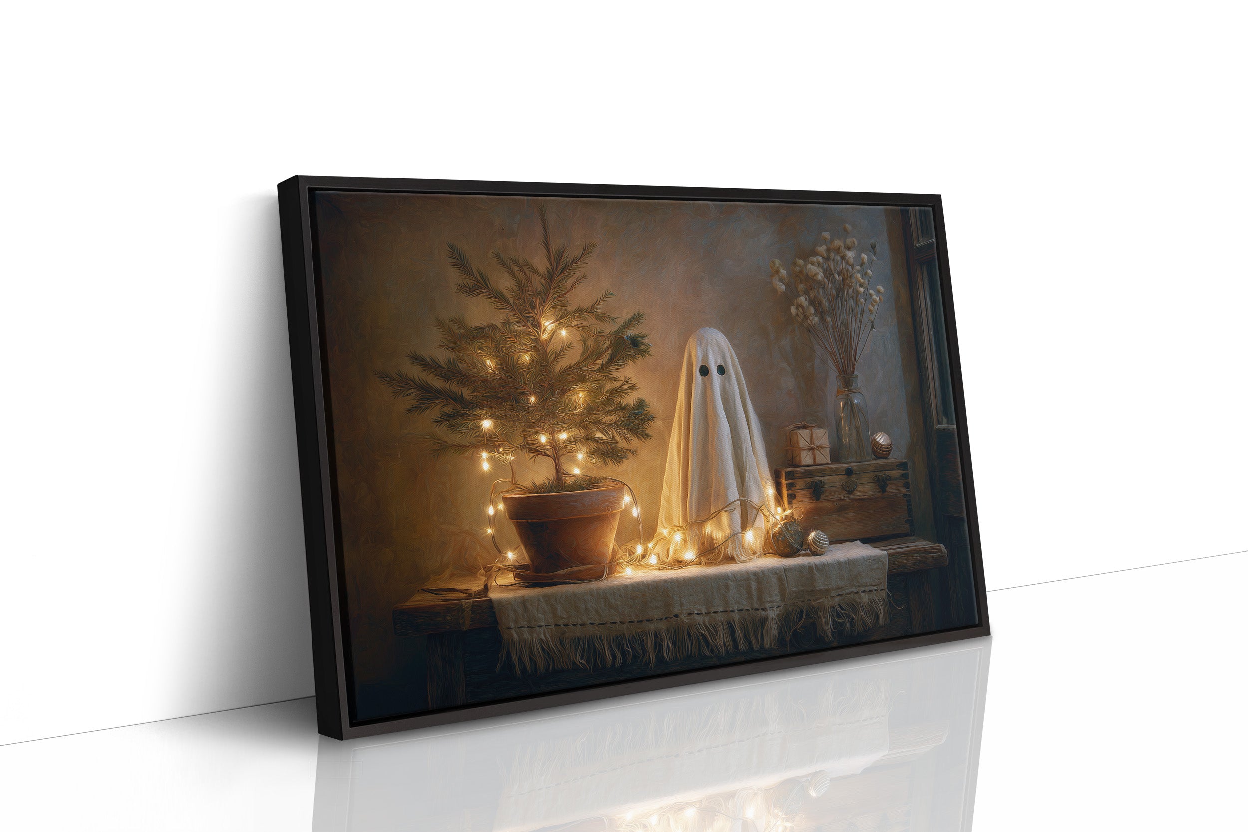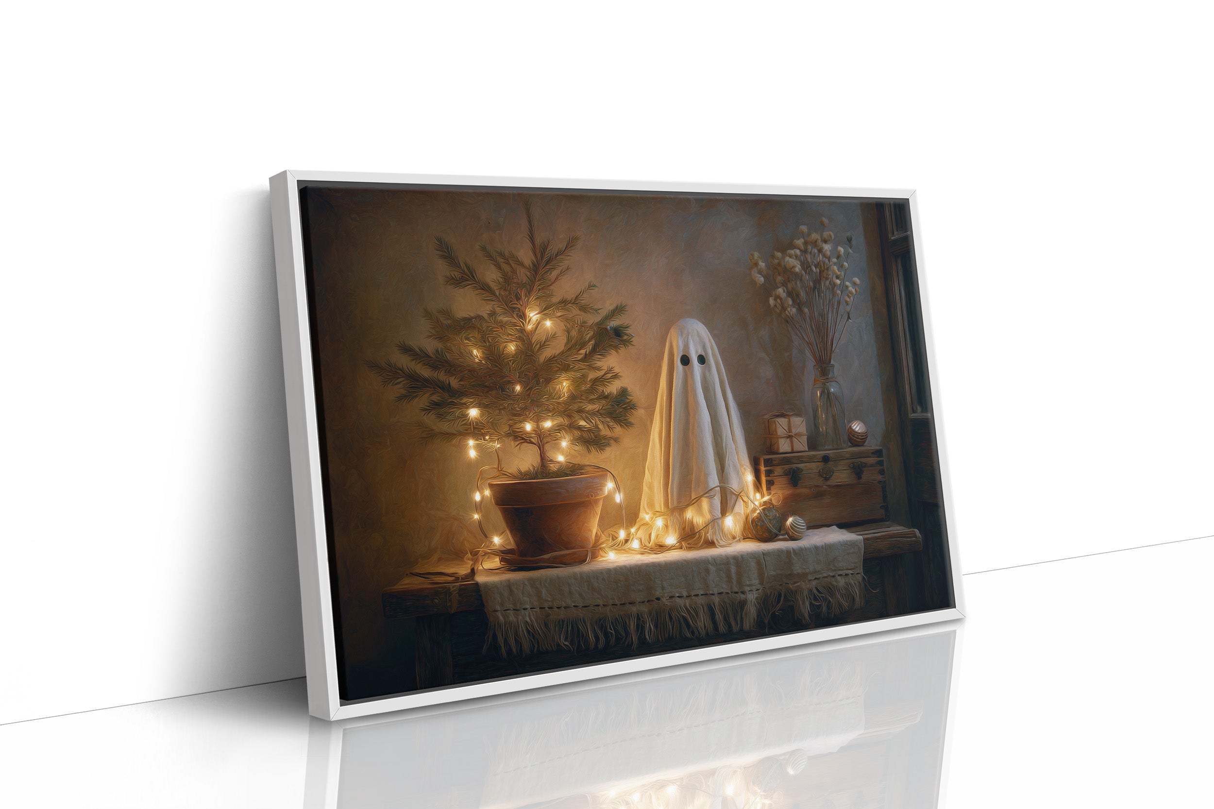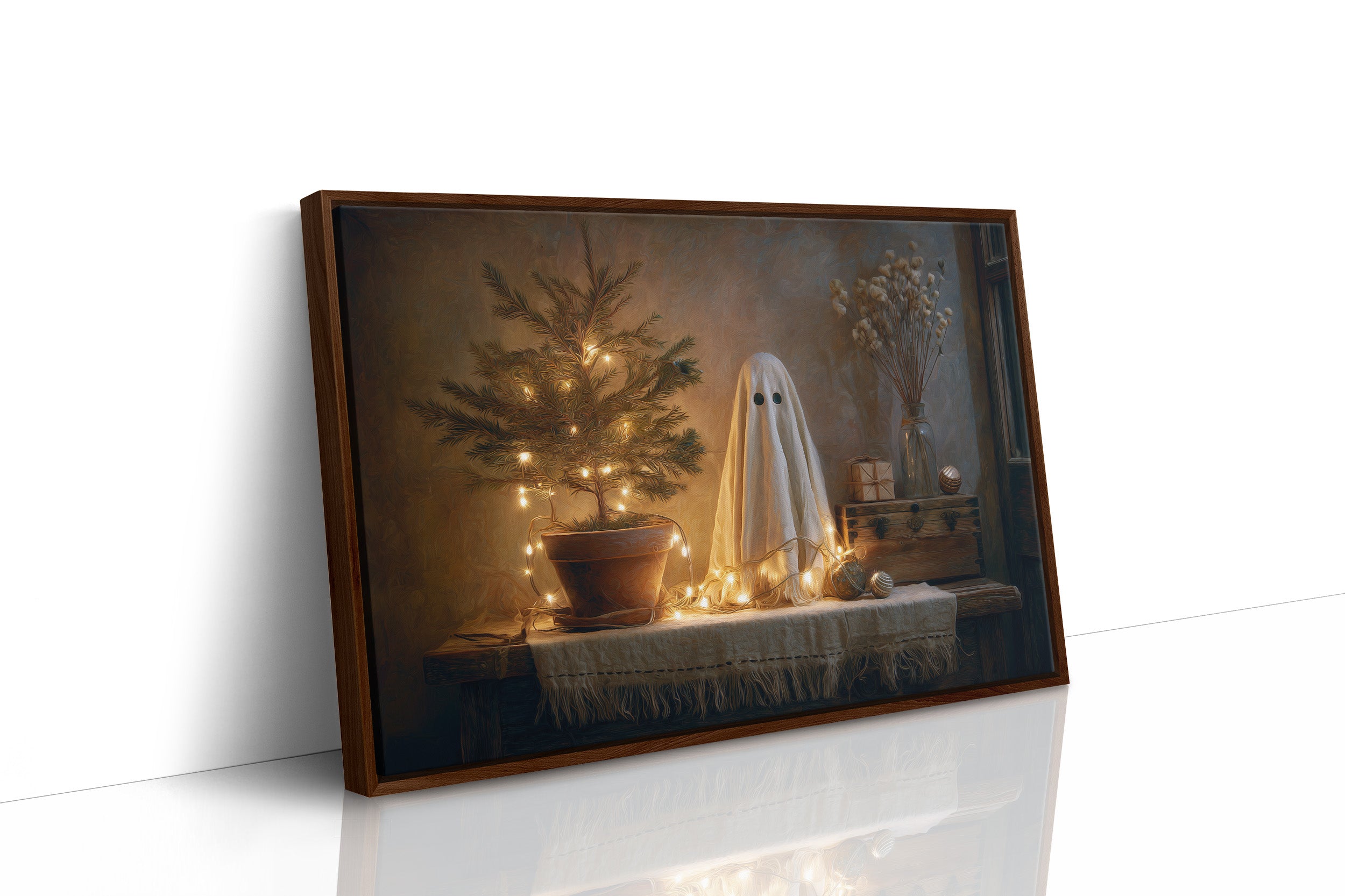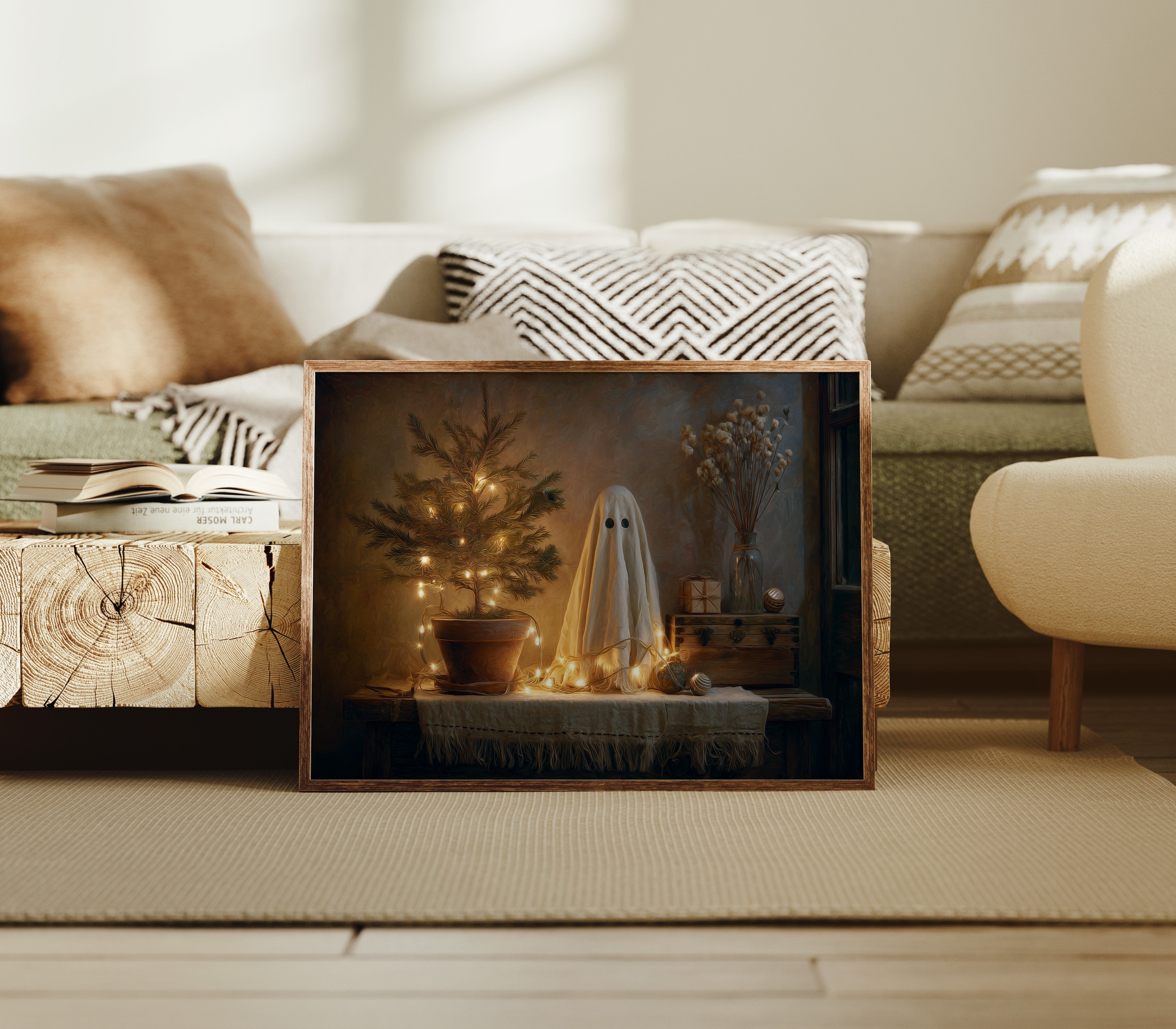 A charming vignette captures the whimsical collision of Christmas and Halloween, where fairy lights dance around a miniature evergreen. The scene unfolds in warm amber tones, with a playful sheet ghost taking center stage alongside a potted pine draped in twinkling lights. Dried flowers and vintage accessories create a cozy still life that speaks to both spooky and celebratory seasons. This contemporary piece would bring a touch of imaginative charm to a modern living room or create an unexpected focal point in a reading nook.