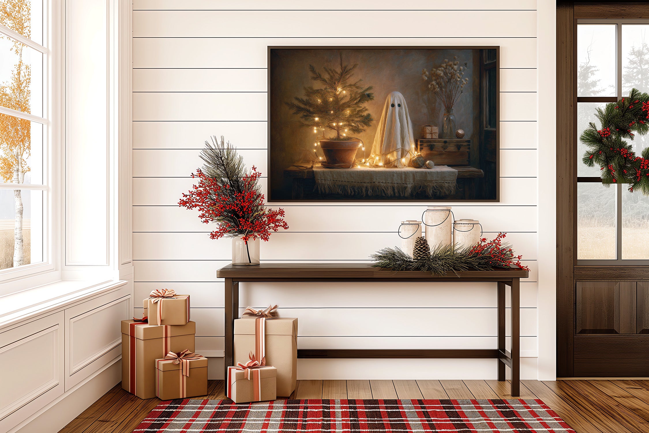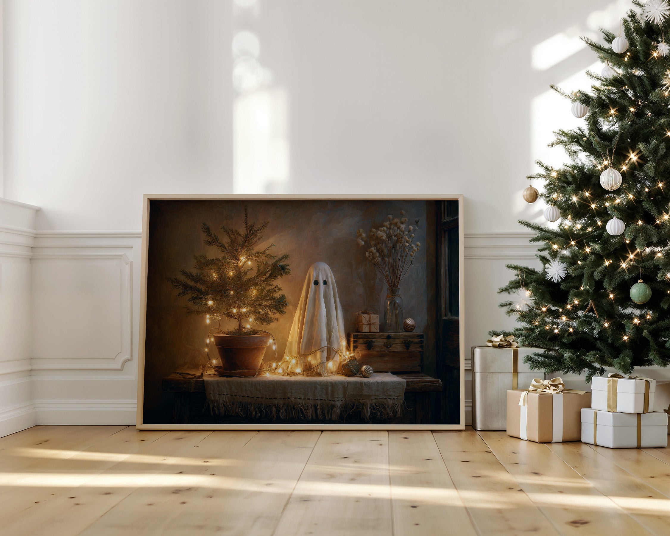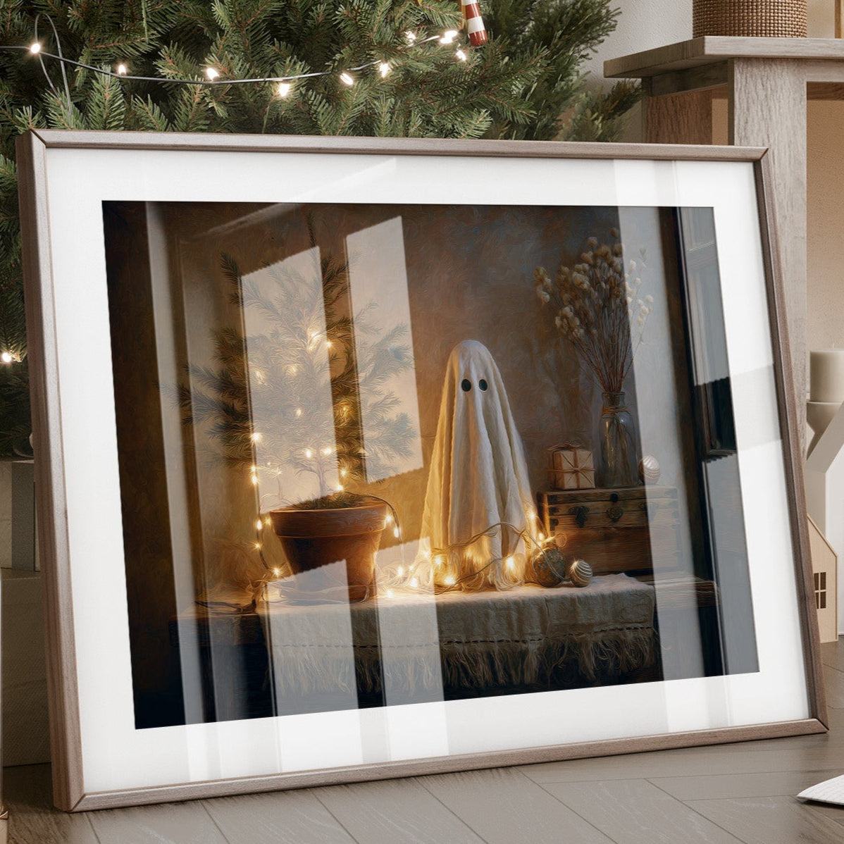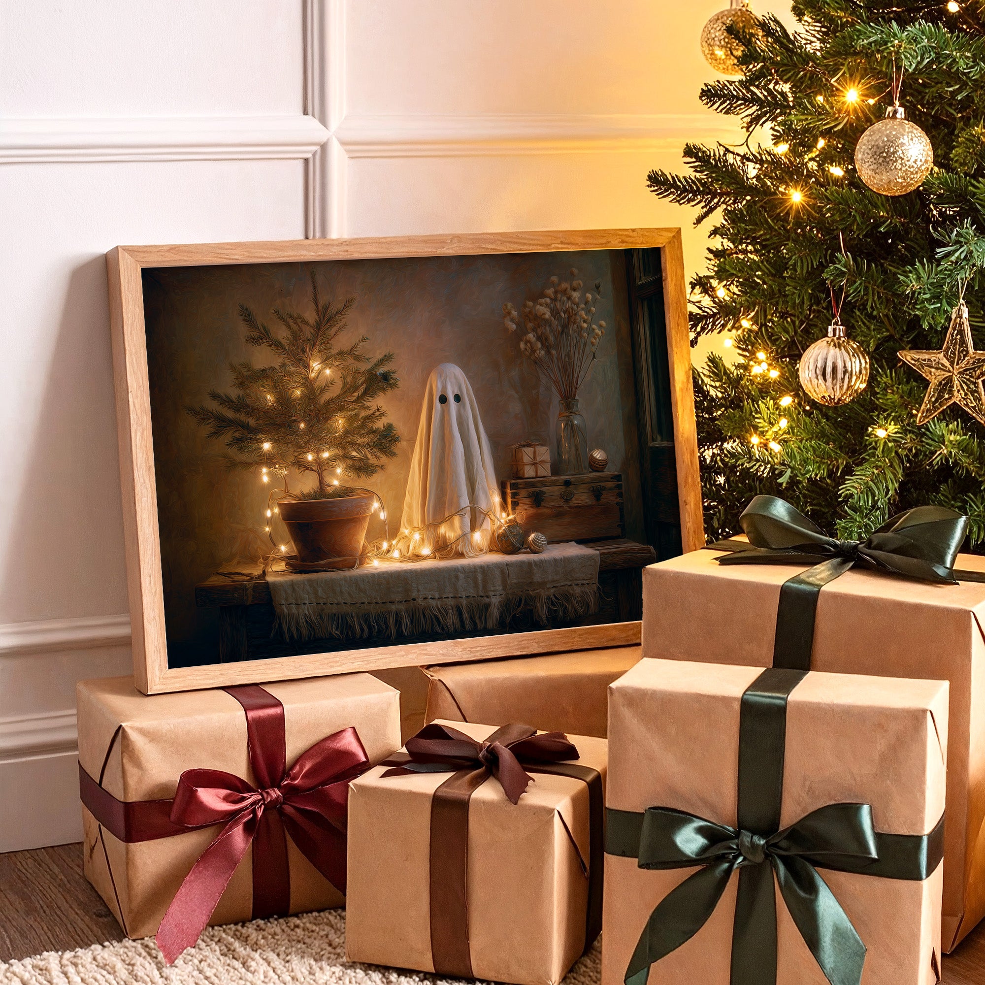 A charming vignette captures the whimsical collision of Christmas and Halloween, where fairy lights dance around a miniature evergreen. The scene unfolds in warm amber tones, with a playful sheet ghost taking center stage alongside a potted pine draped in twinkling lights. Dried flowers and vintage accessories create a cozy still life that speaks to both spooky and celebratory seasons. This contemporary piece would bring a touch of imaginative charm to a modern living room or create an unexpected focal point in a reading nook.