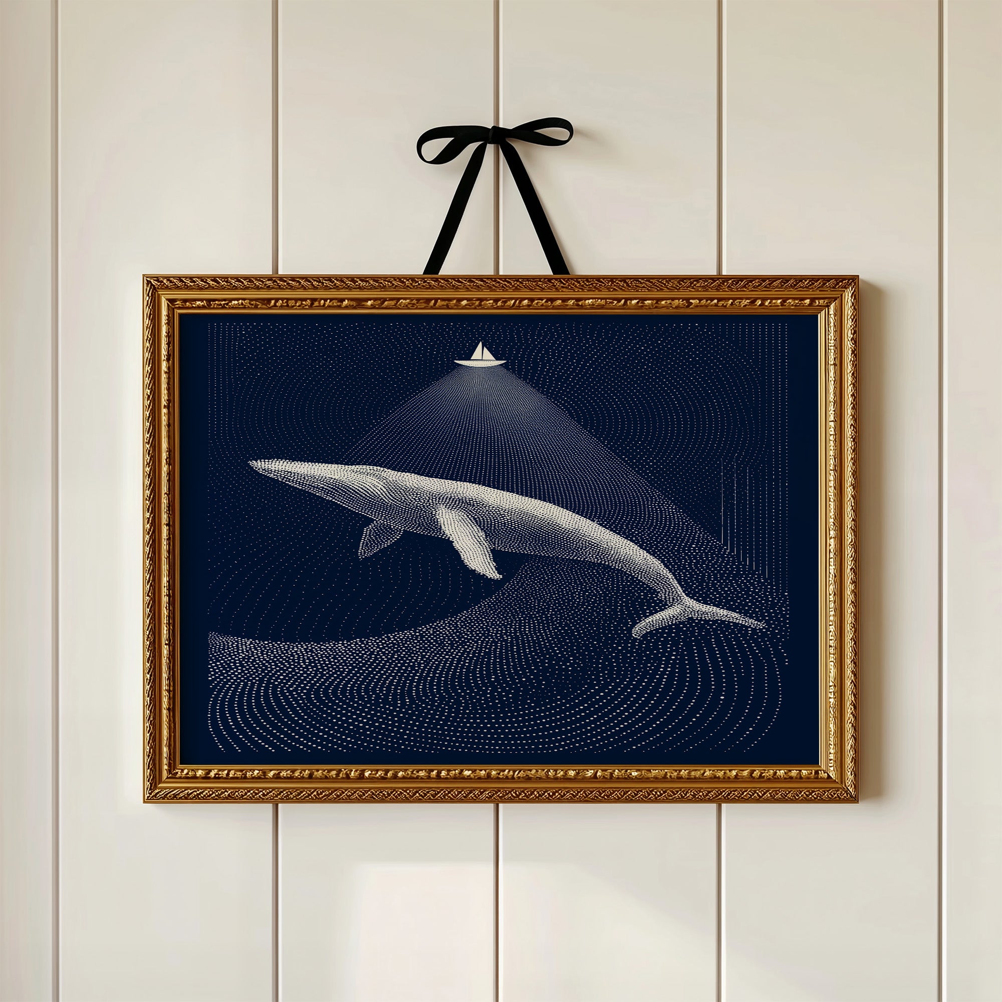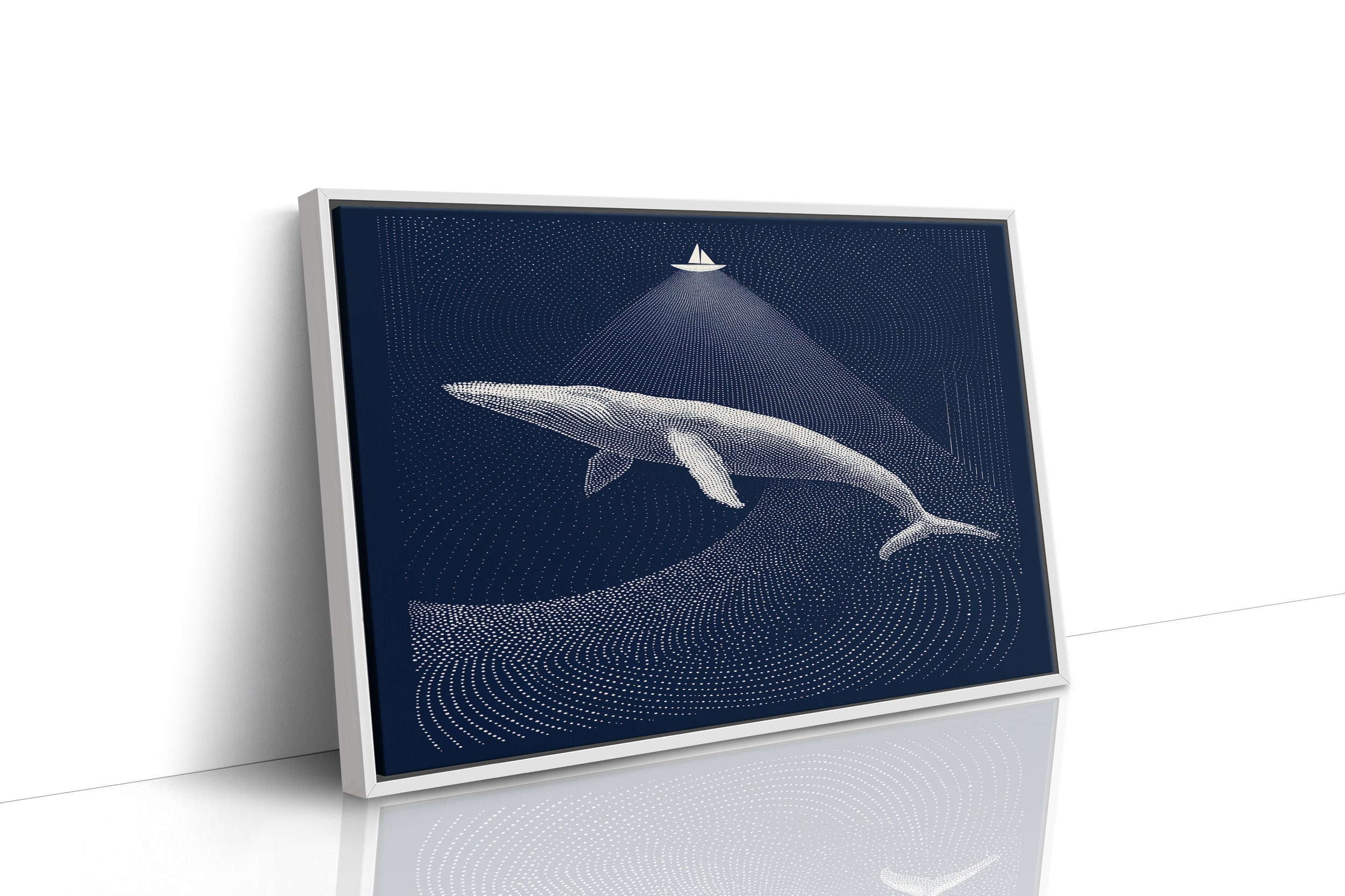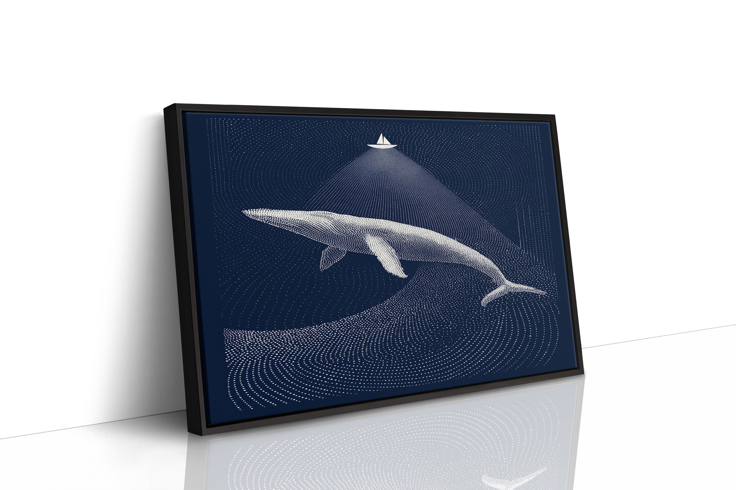 A moment suspended in midnight blue, where a solitary sailboat casts its beam upon a magnificent whale gliding through dotted constellations of the deep. The artwork's meticulous pointillism creates ripples of light against dark navy, telling a story of scale and perspective where the smallest craft illuminates the ocean's gentle giant. This contemporary piece brings sophisticated tranquility to a study, reading nook, or any space where quiet contemplation and maritime wonder are welcomed.
