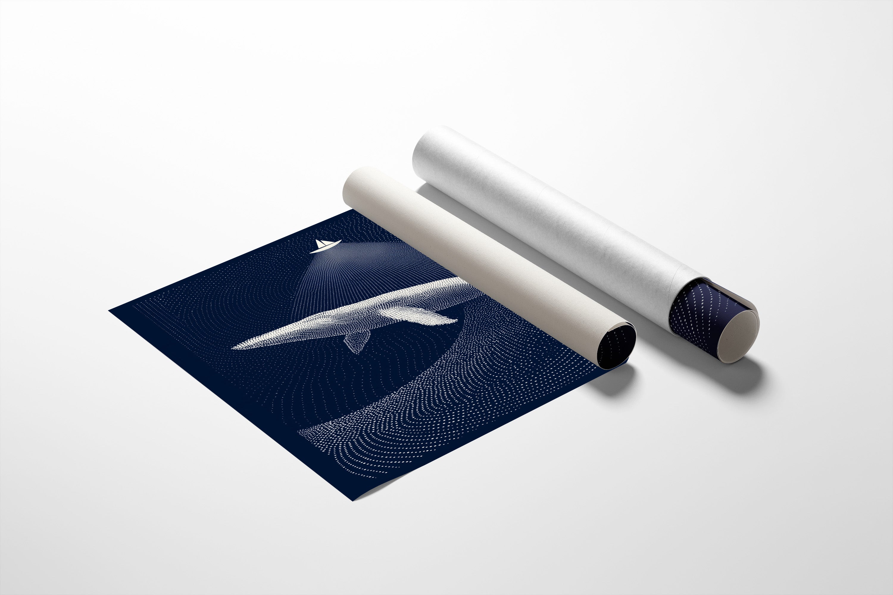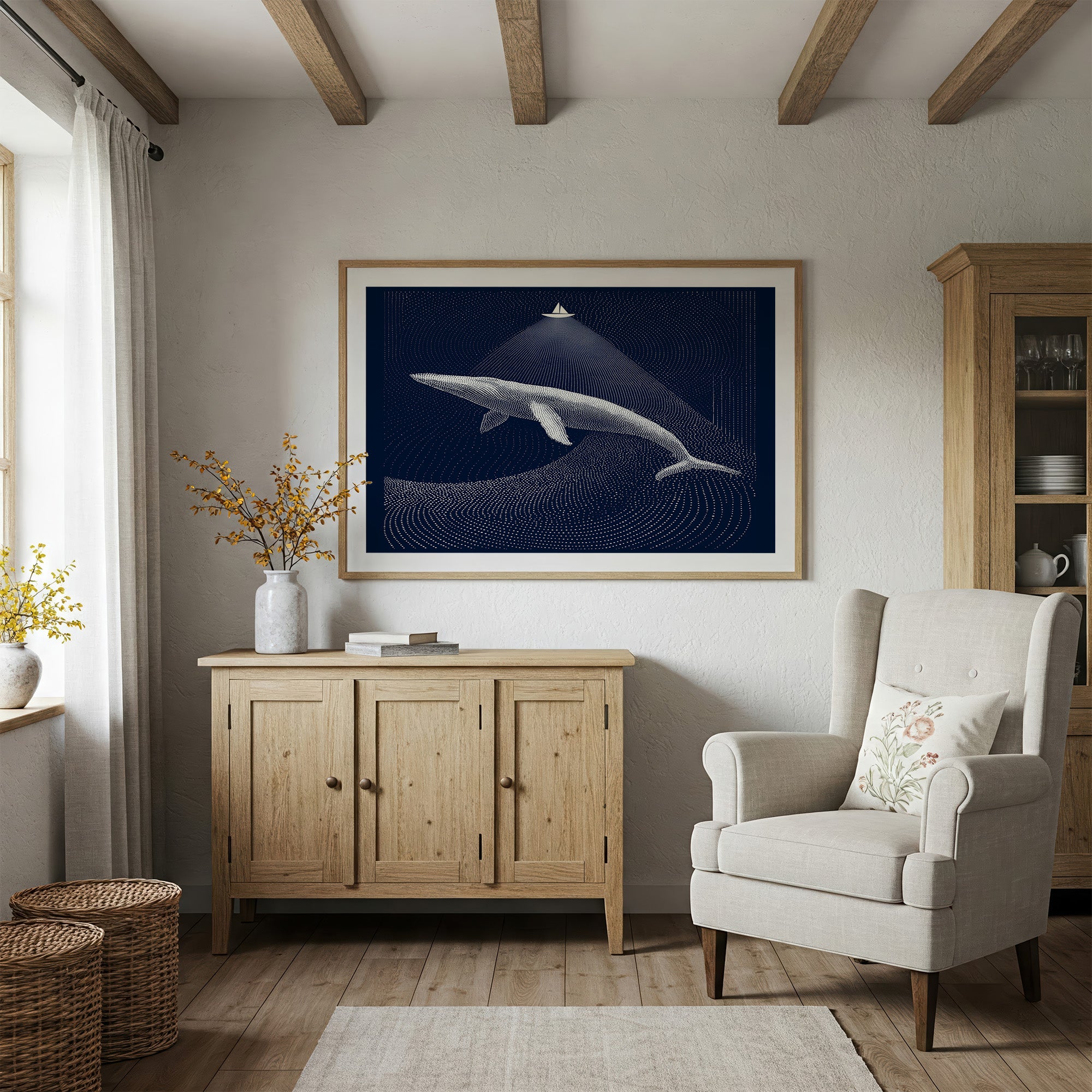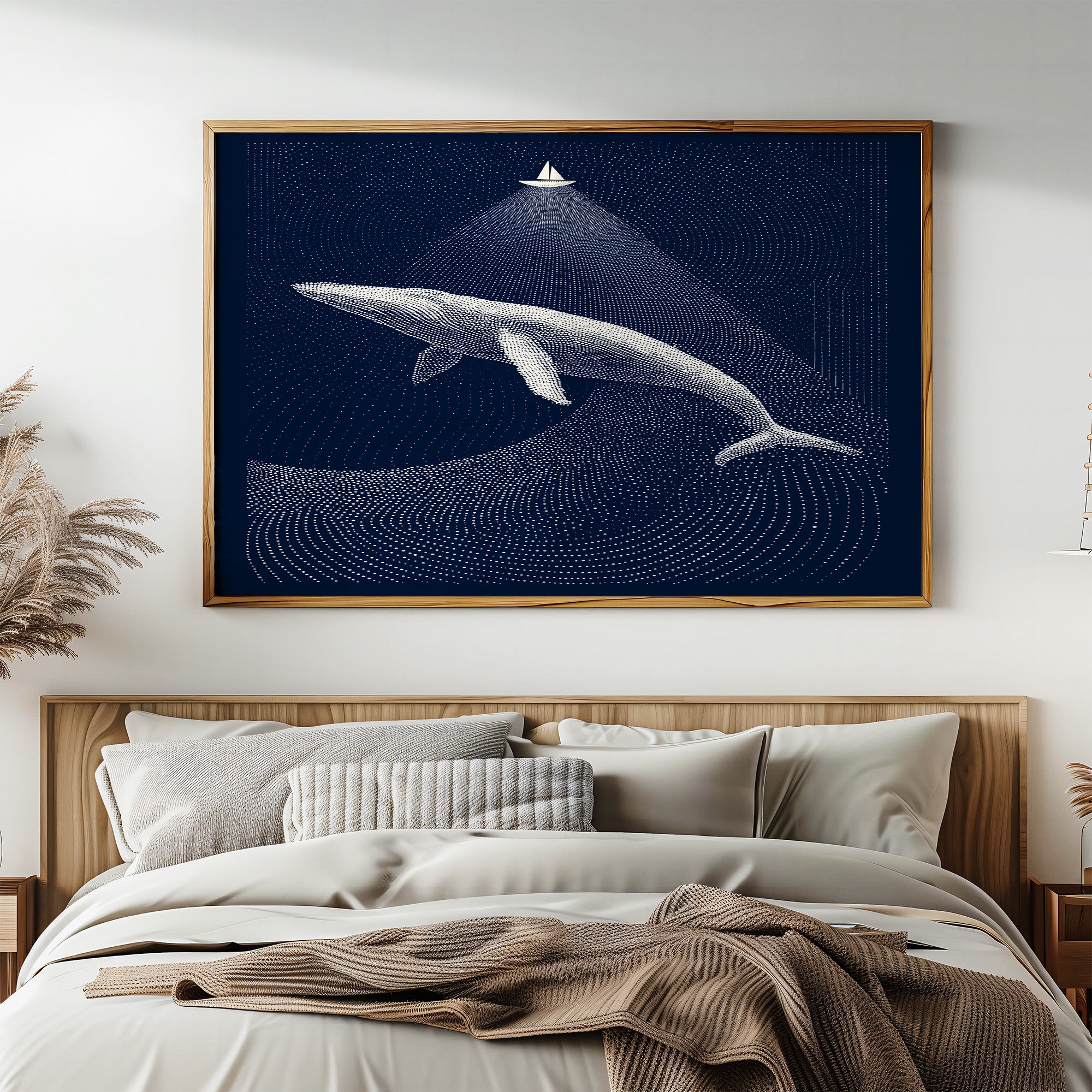 A moment suspended in midnight blue, where a solitary sailboat casts its beam upon a magnificent whale gliding through dotted constellations of the deep. The artwork's meticulous pointillism creates ripples of light against dark navy, telling a story of scale and perspective where the smallest craft illuminates the ocean's gentle giant. This contemporary piece brings sophisticated tranquility to a study, reading nook, or any space where quiet contemplation and maritime wonder are welcomed.