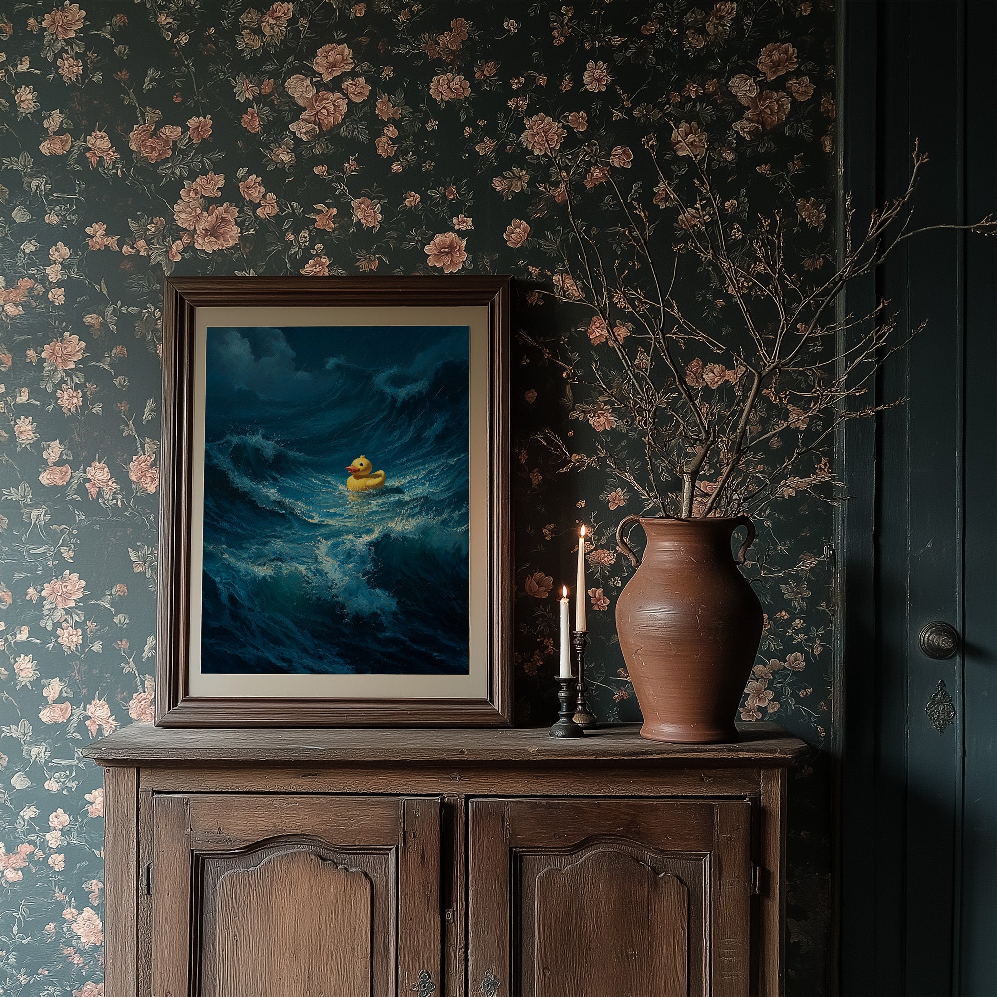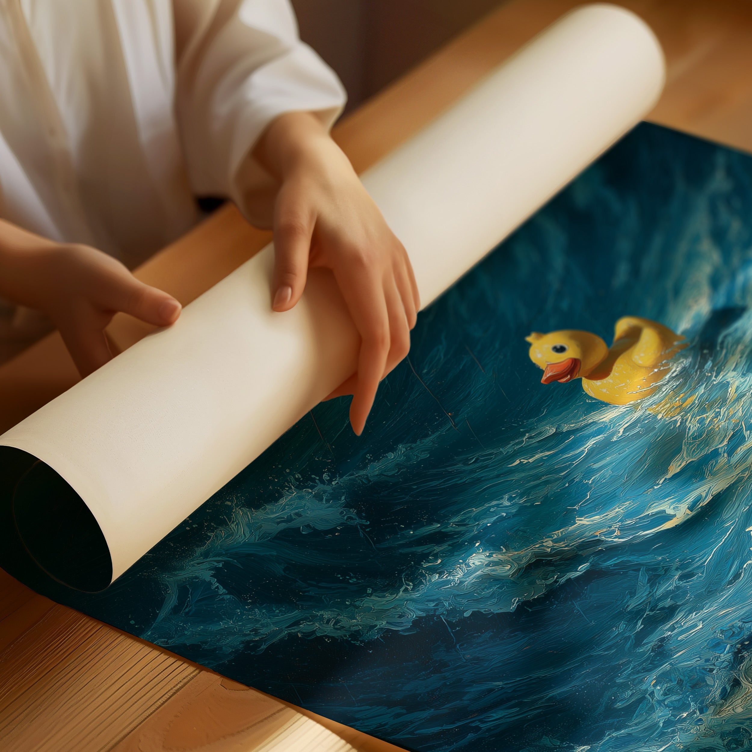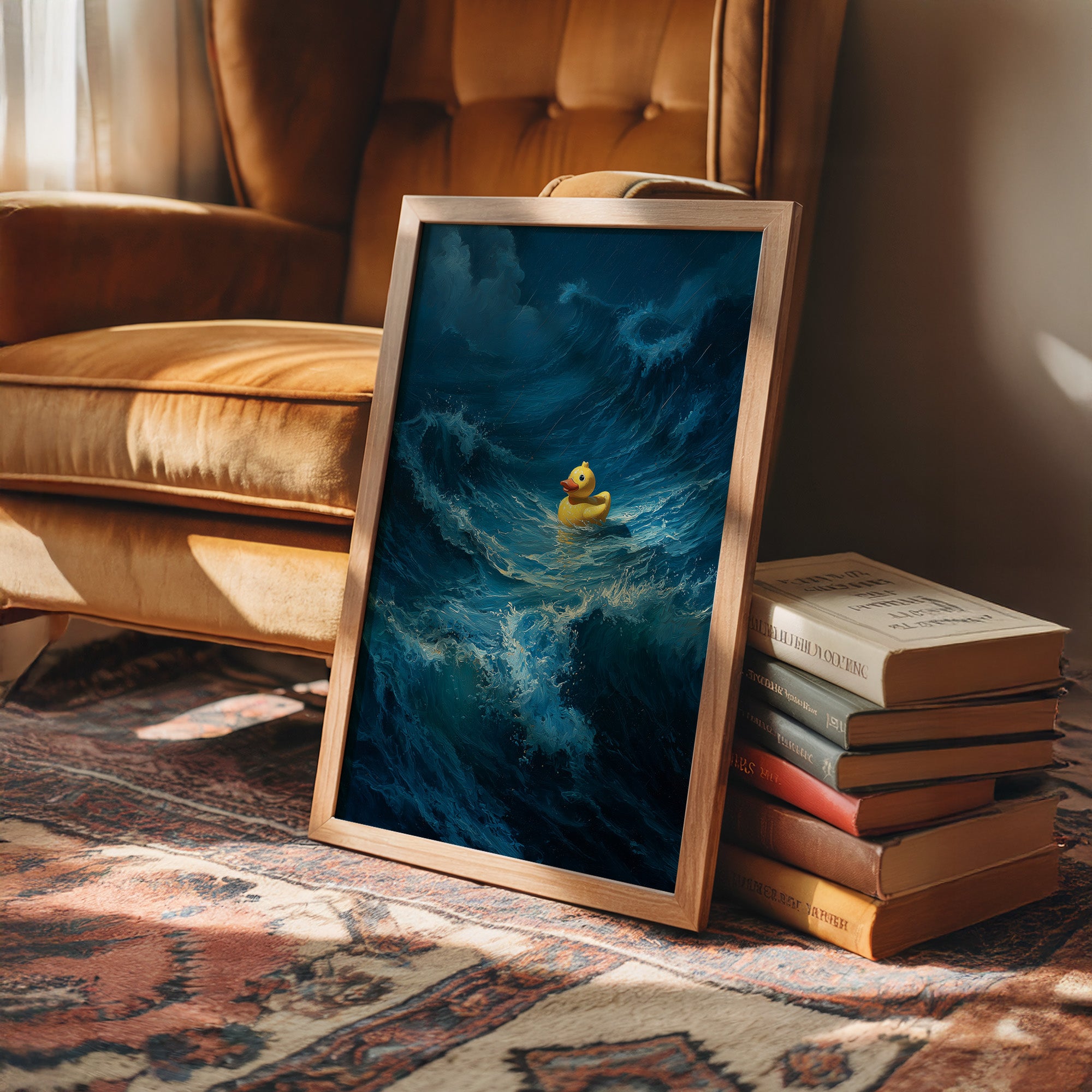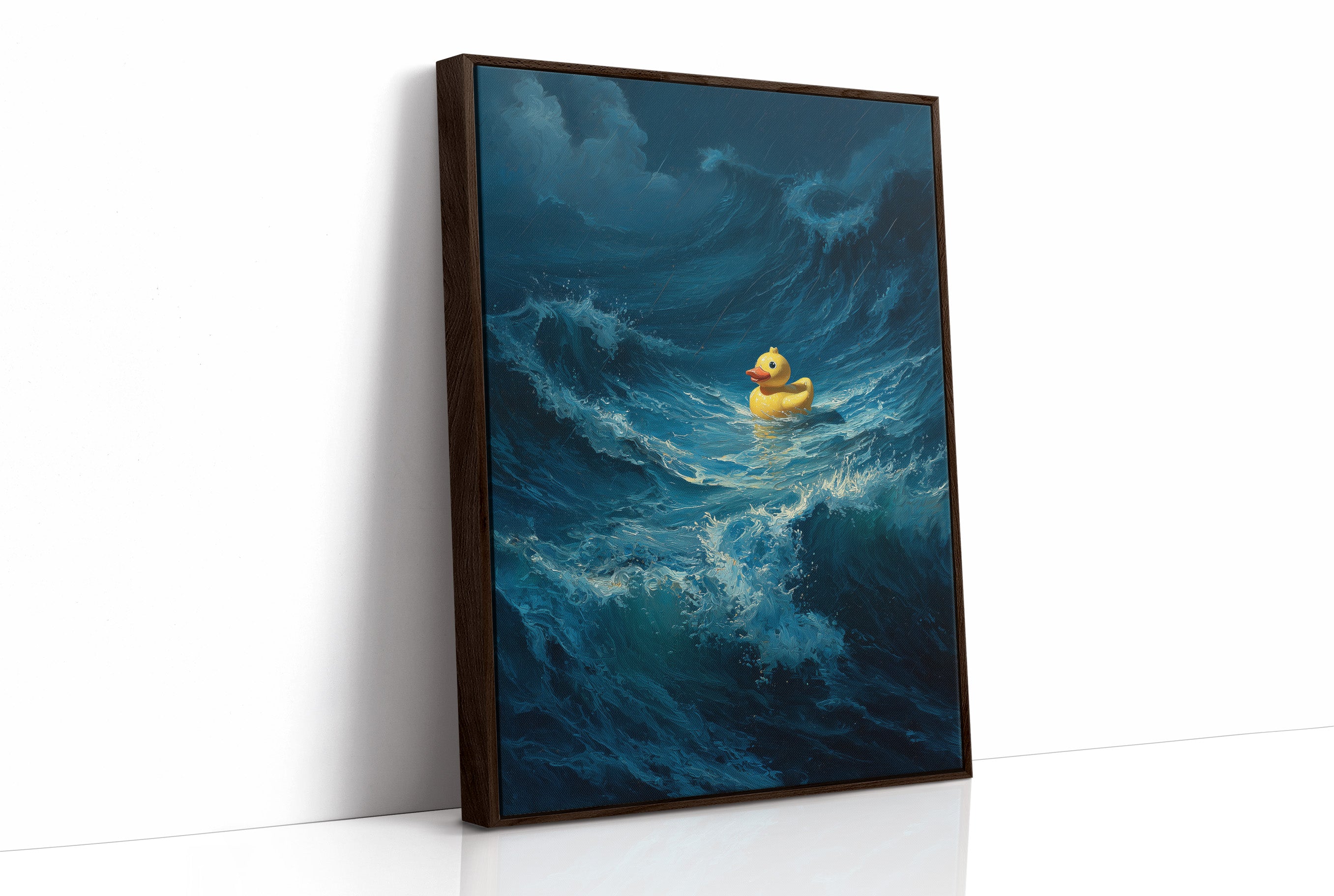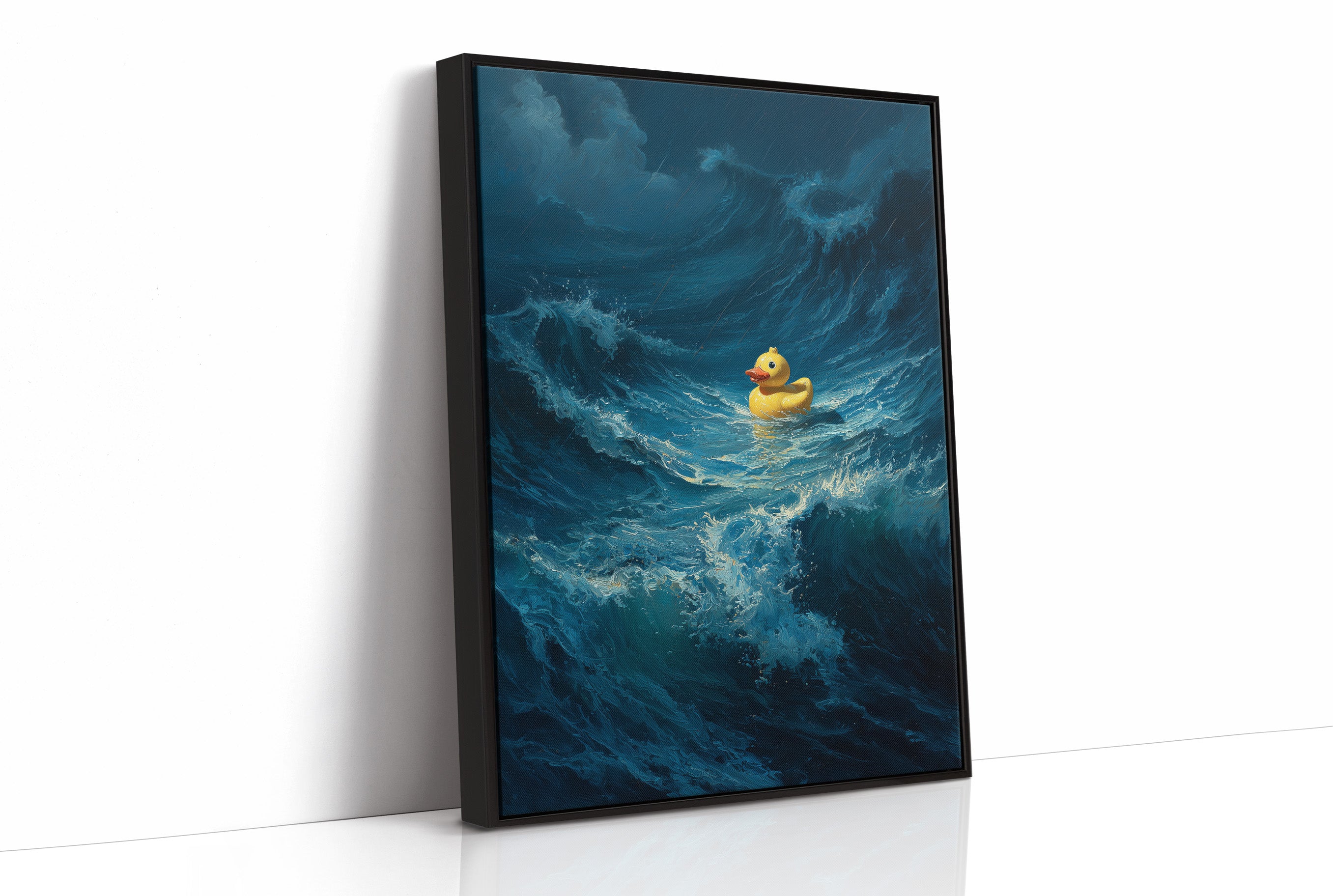 A small yellow rubber duck floats defiantly amid towering ocean waves, a bright speck of courage against the tumultuous deep blue sea. The dramatic contrast between the innocent toy and the powerful, crashing waves creates a poignant metaphor for resilience in overwhelming circumstances. The painting's rich navy and cerulean tones capture the raw energy of water in motion, while the duck remains impossibly buoyant, untouched by the chaos surrounding it.