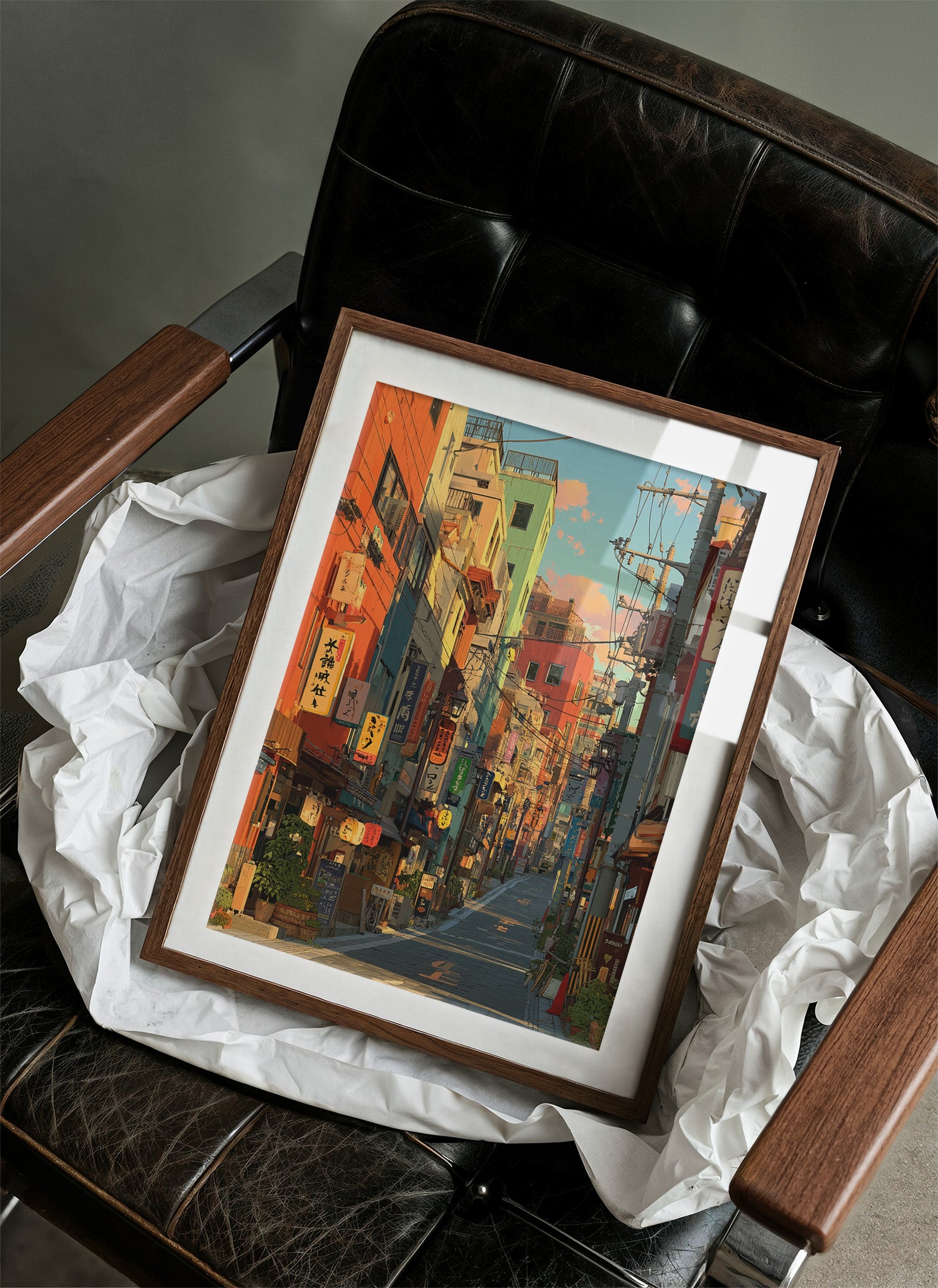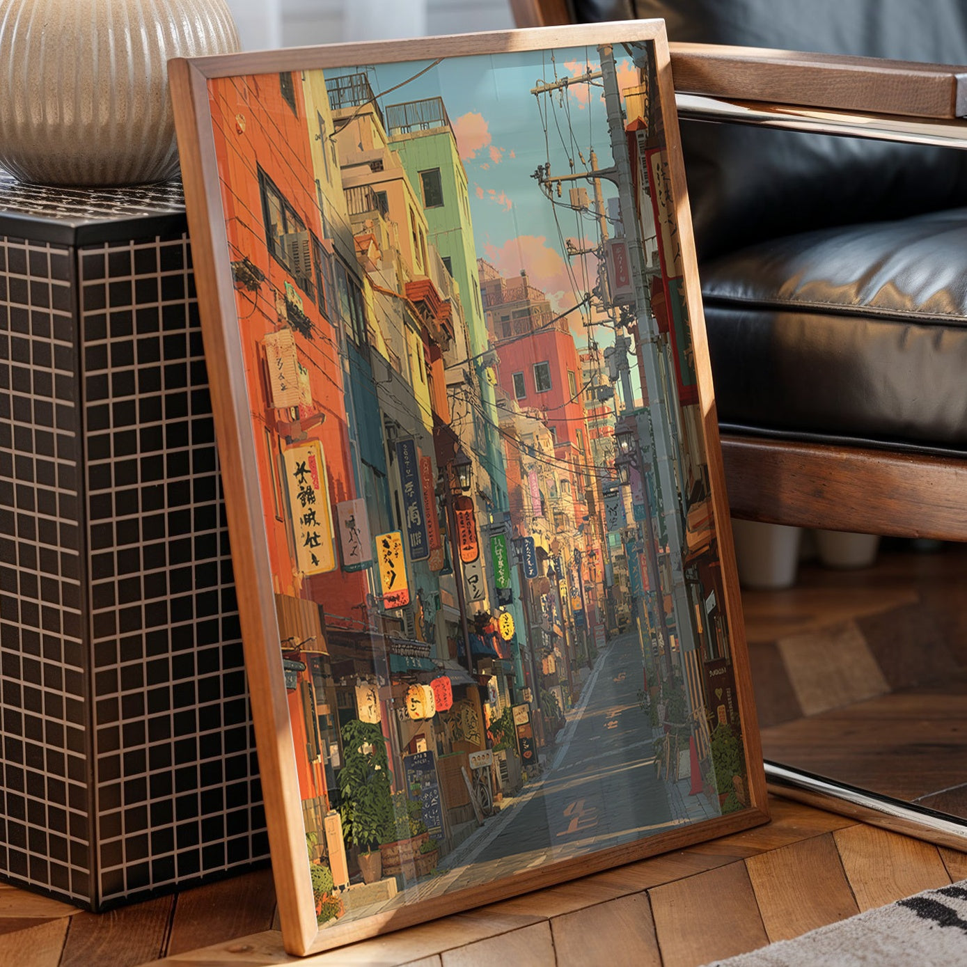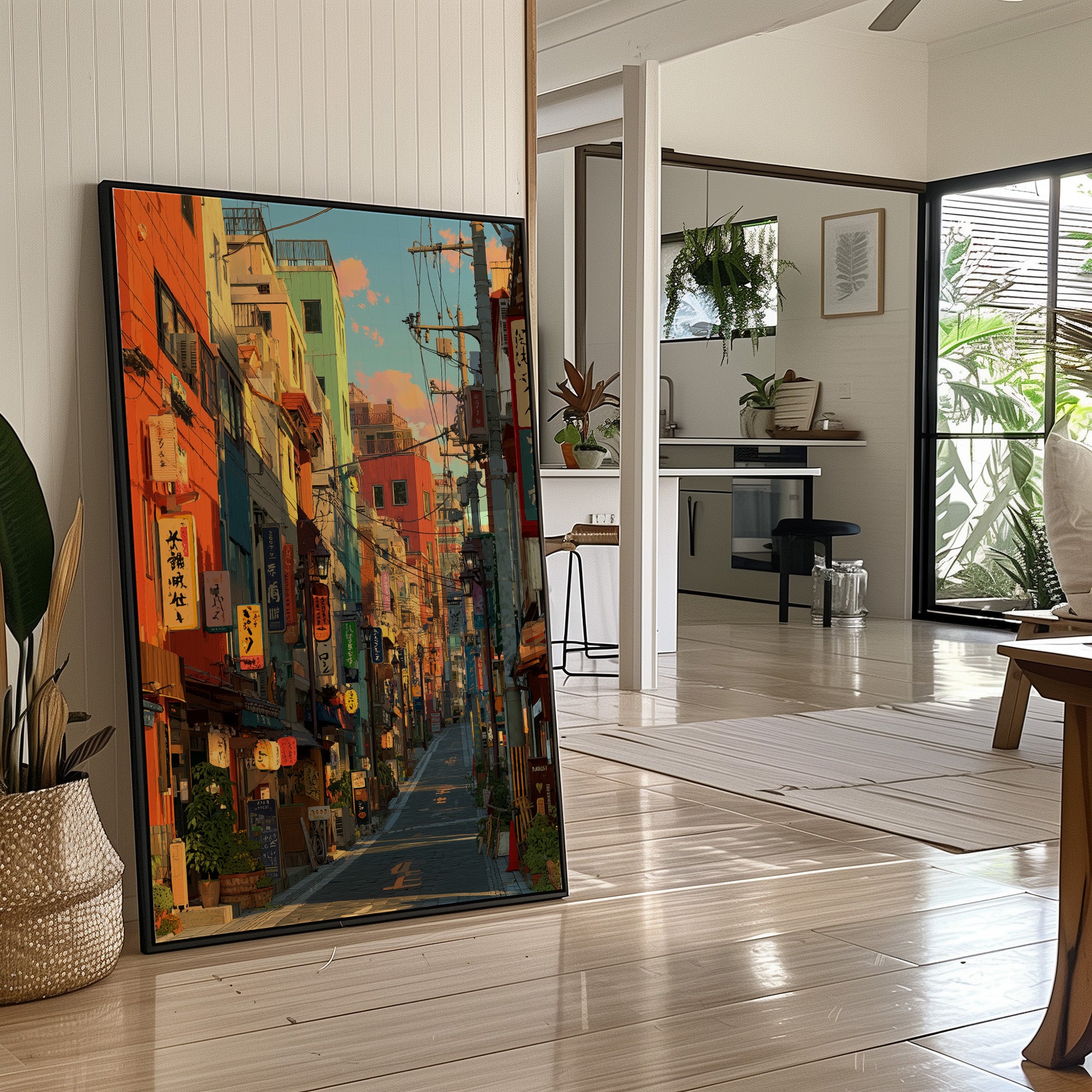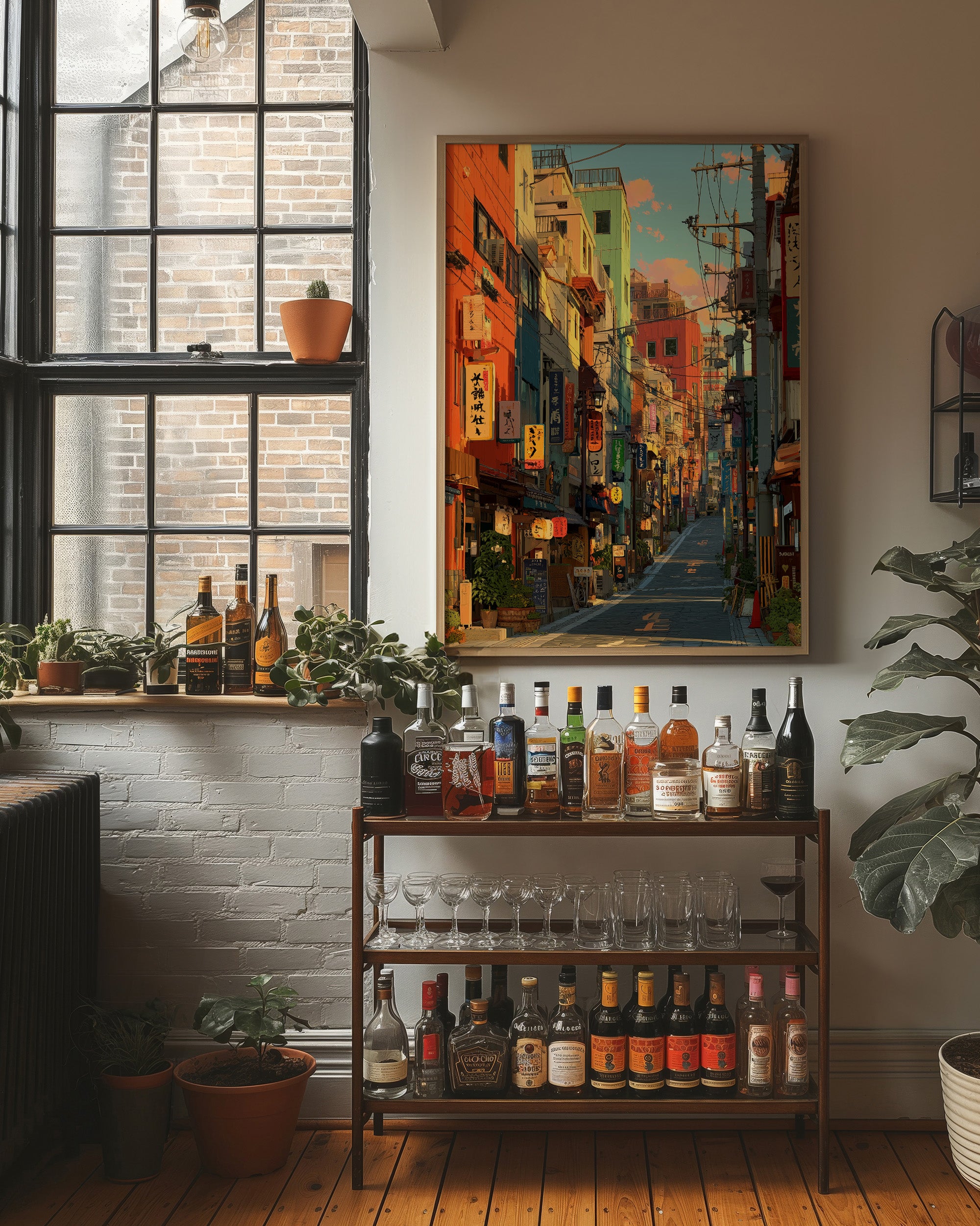 Vibrant oranges and teals paint an enchanting Japanese street scene, where neon signs and paper lanterns cast their warm glow against colorful building facades. The composition draws viewers down a narrow alley filled with the character of urban Japan, where traditional elements merge seamlessly with modern city life. This striking urban landscape is perfectly staged in this contemporary home bar setting, where industrial windows and exposed brick create an atmospheric dialogue with the artwork's urban energy.