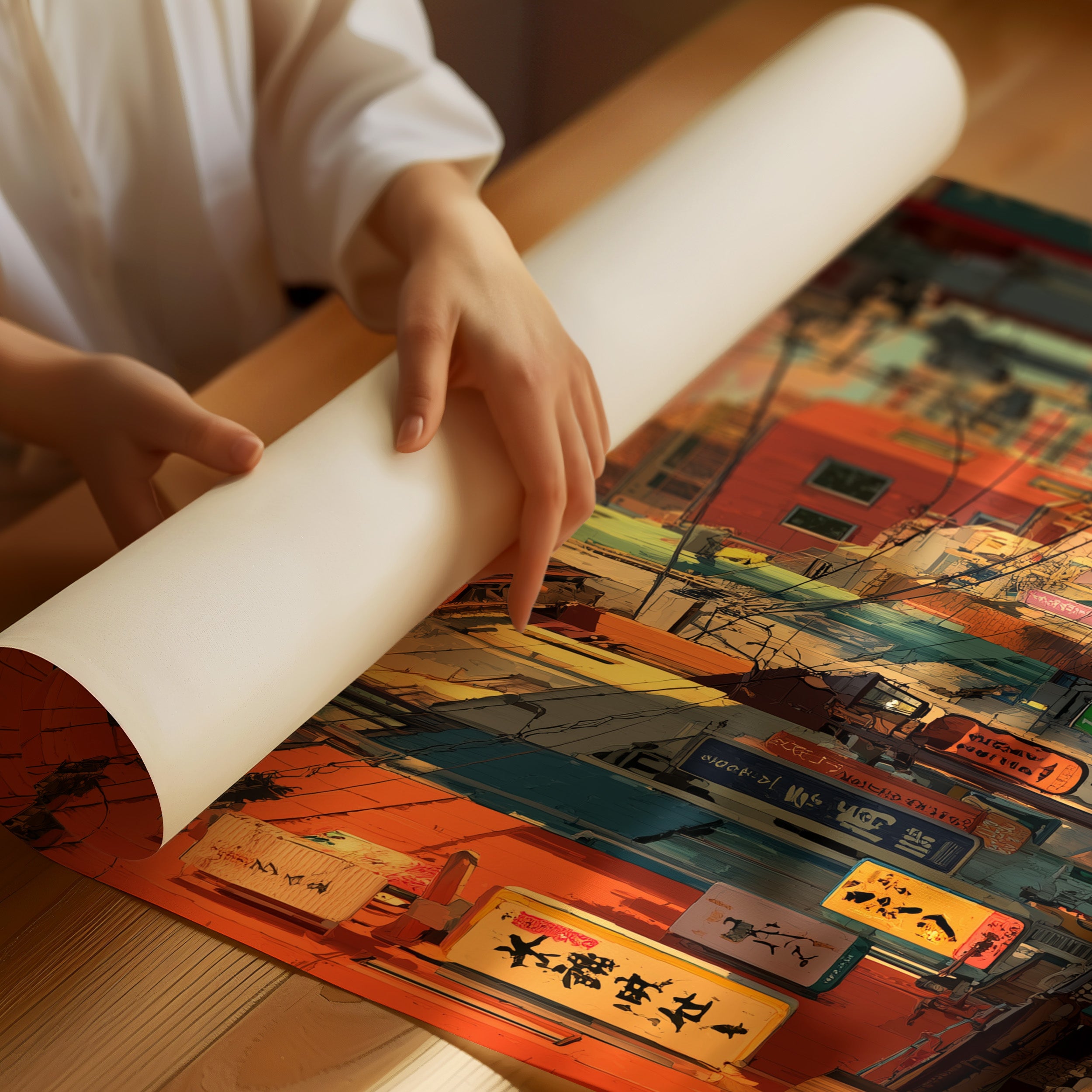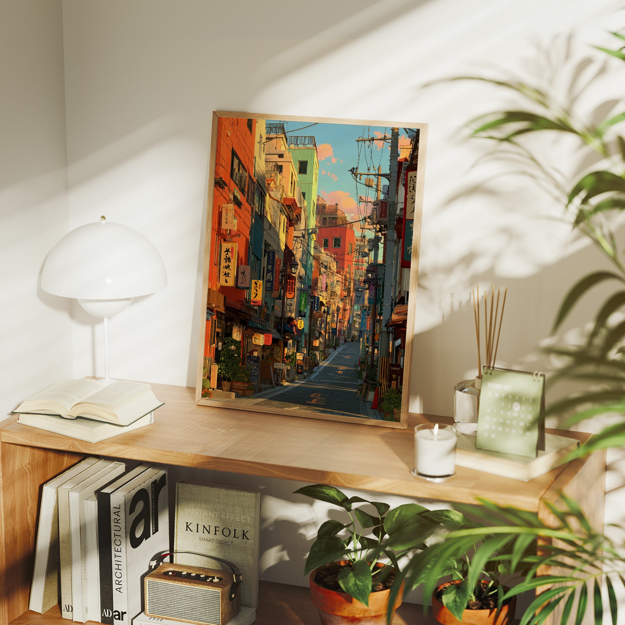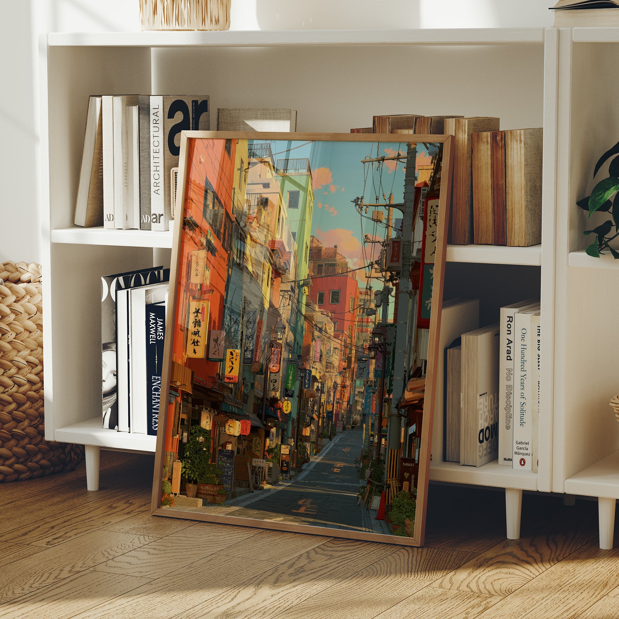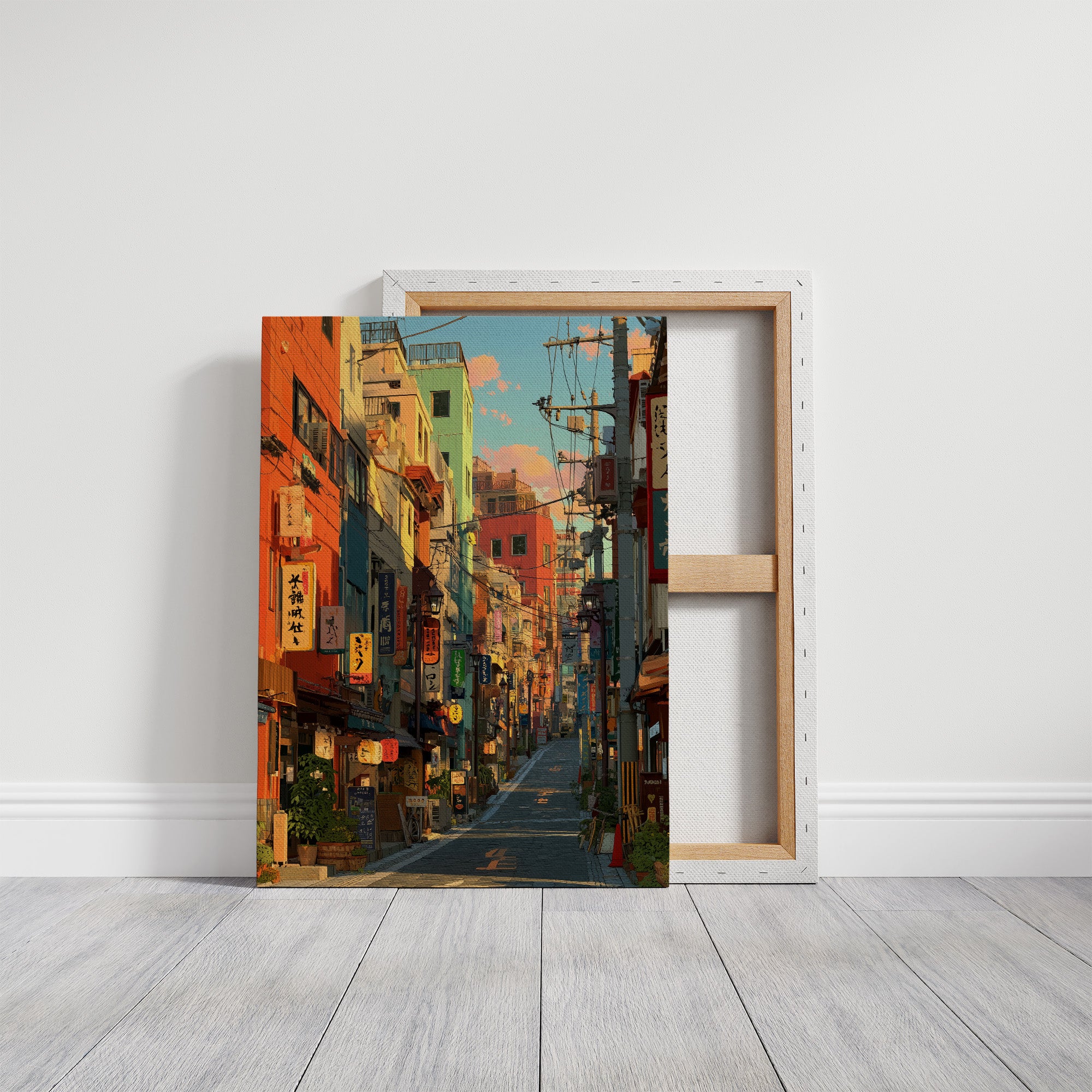 Vibrant oranges and teals paint an enchanting Japanese street scene, where neon signs and paper lanterns cast their warm glow against colorful building facades. The composition draws viewers down a narrow alley filled with the character of urban Japan, where traditional elements merge seamlessly with modern city life. This striking urban landscape is perfectly staged in this contemporary home bar setting, where industrial windows and exposed brick create an atmospheric dialogue with the artwork's urban energy.