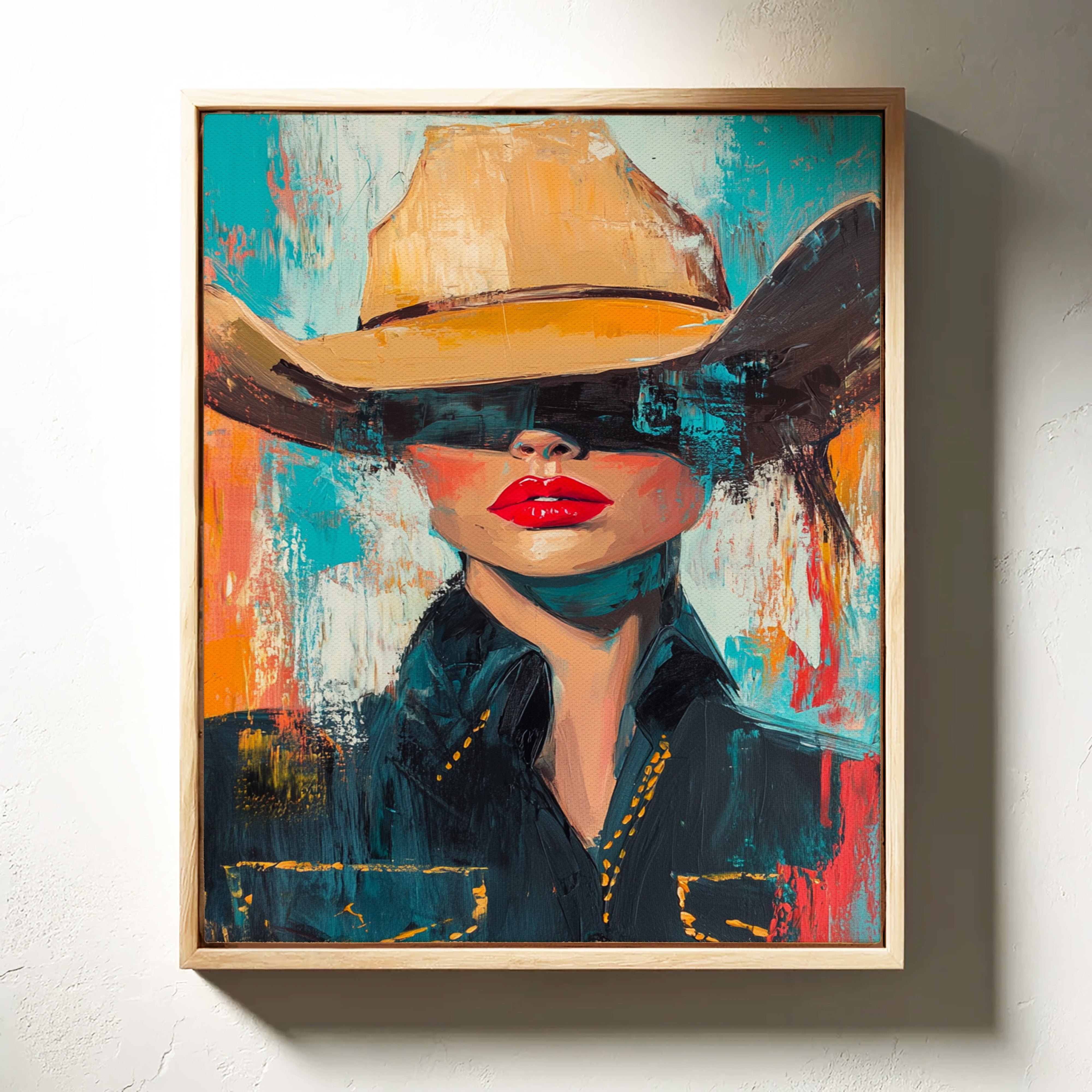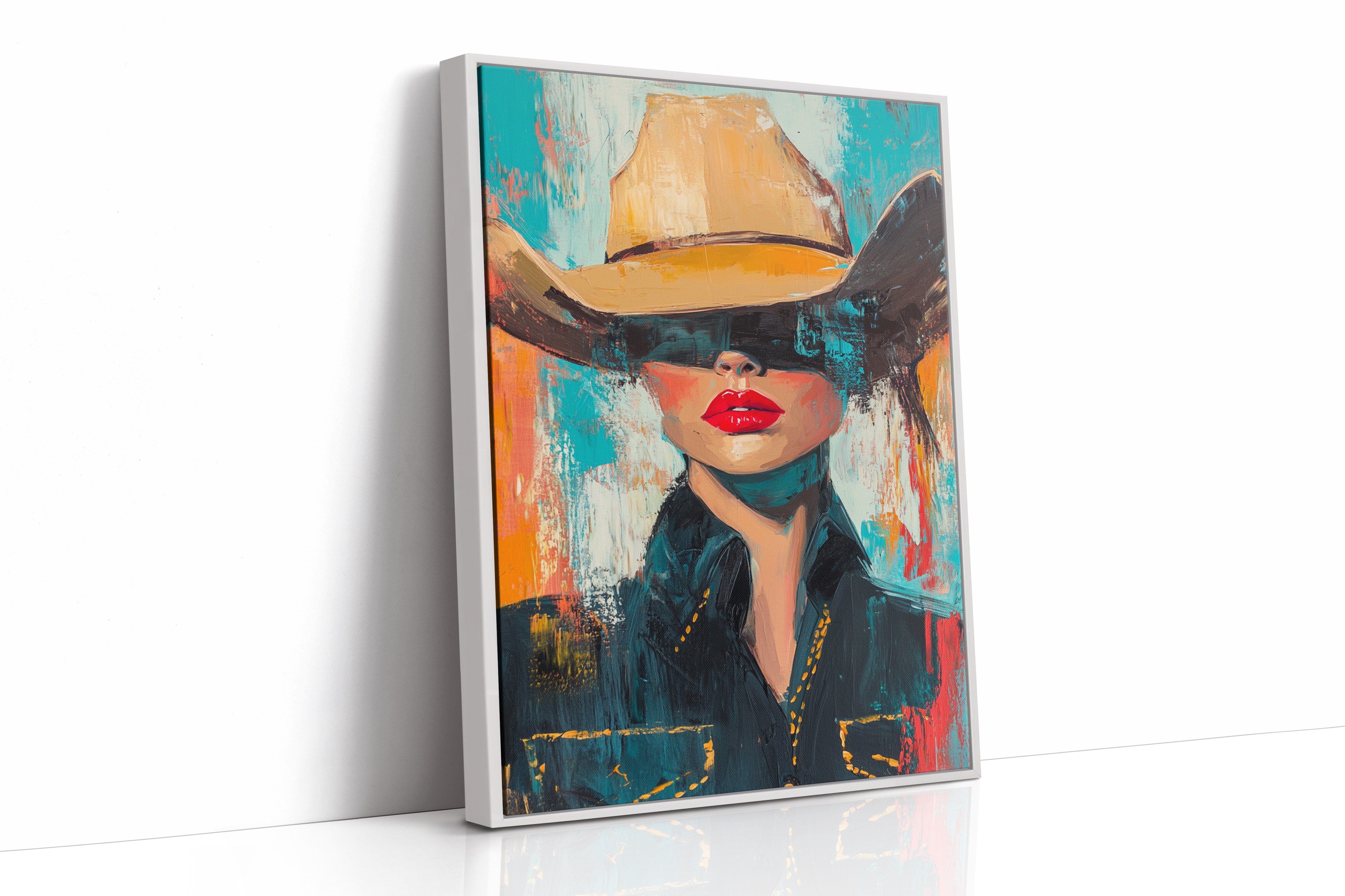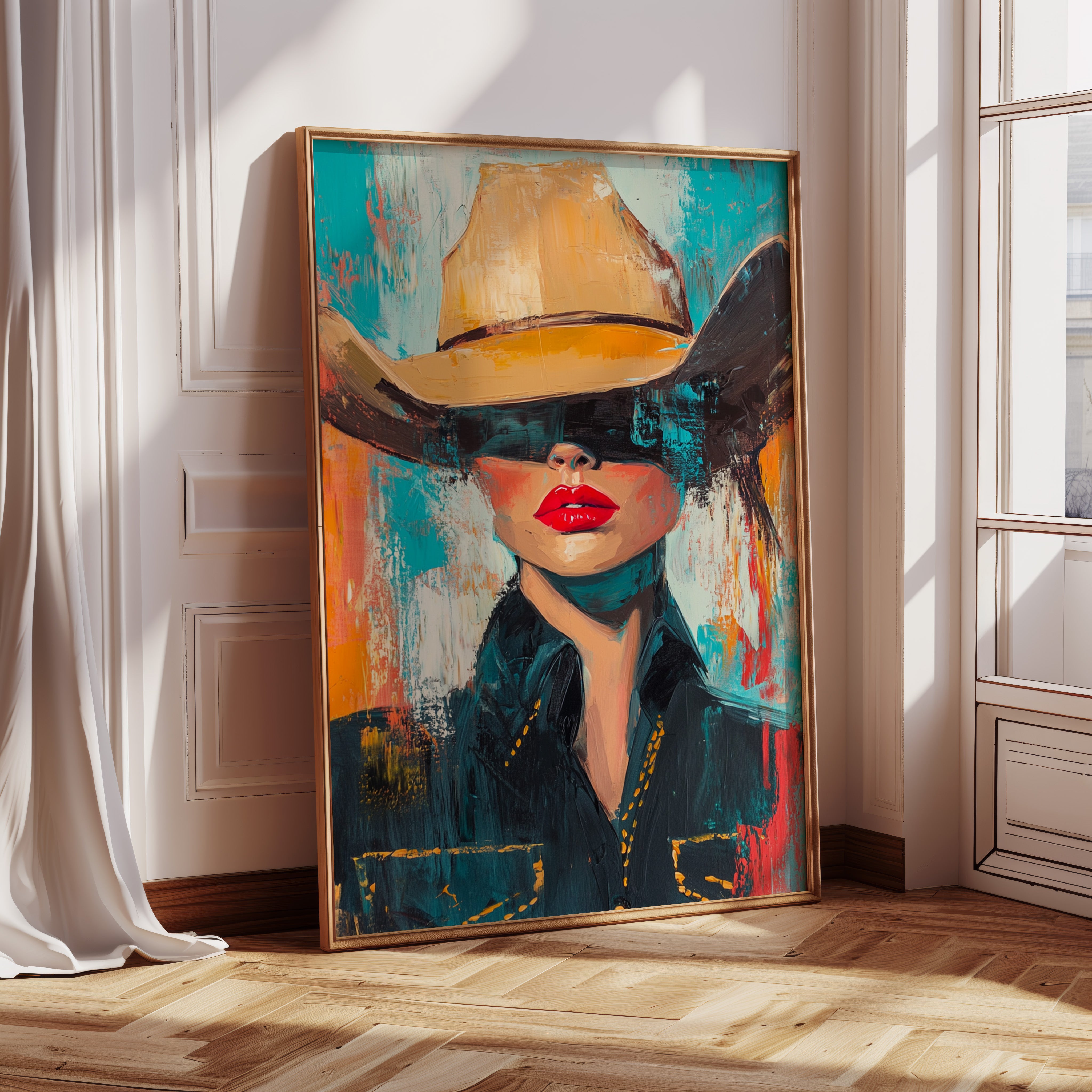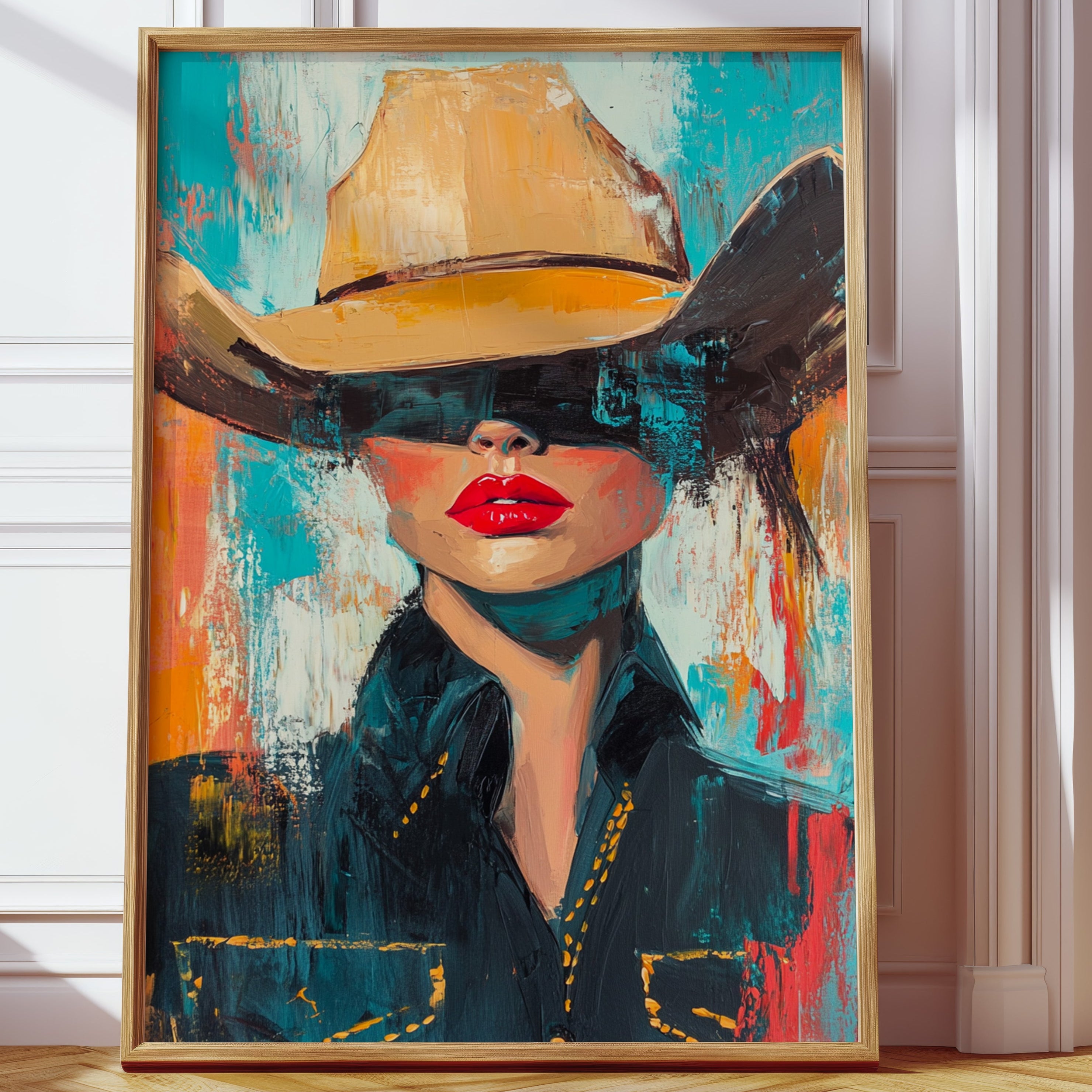 A fiery fusion of grit and glam. This pop-art cowgirl owns the canvas with unapologetic red lips, a golden hat, and a stare that doesn't need eyes to command the room. A wild west icon, reimagined with modern swagger and electric color.
