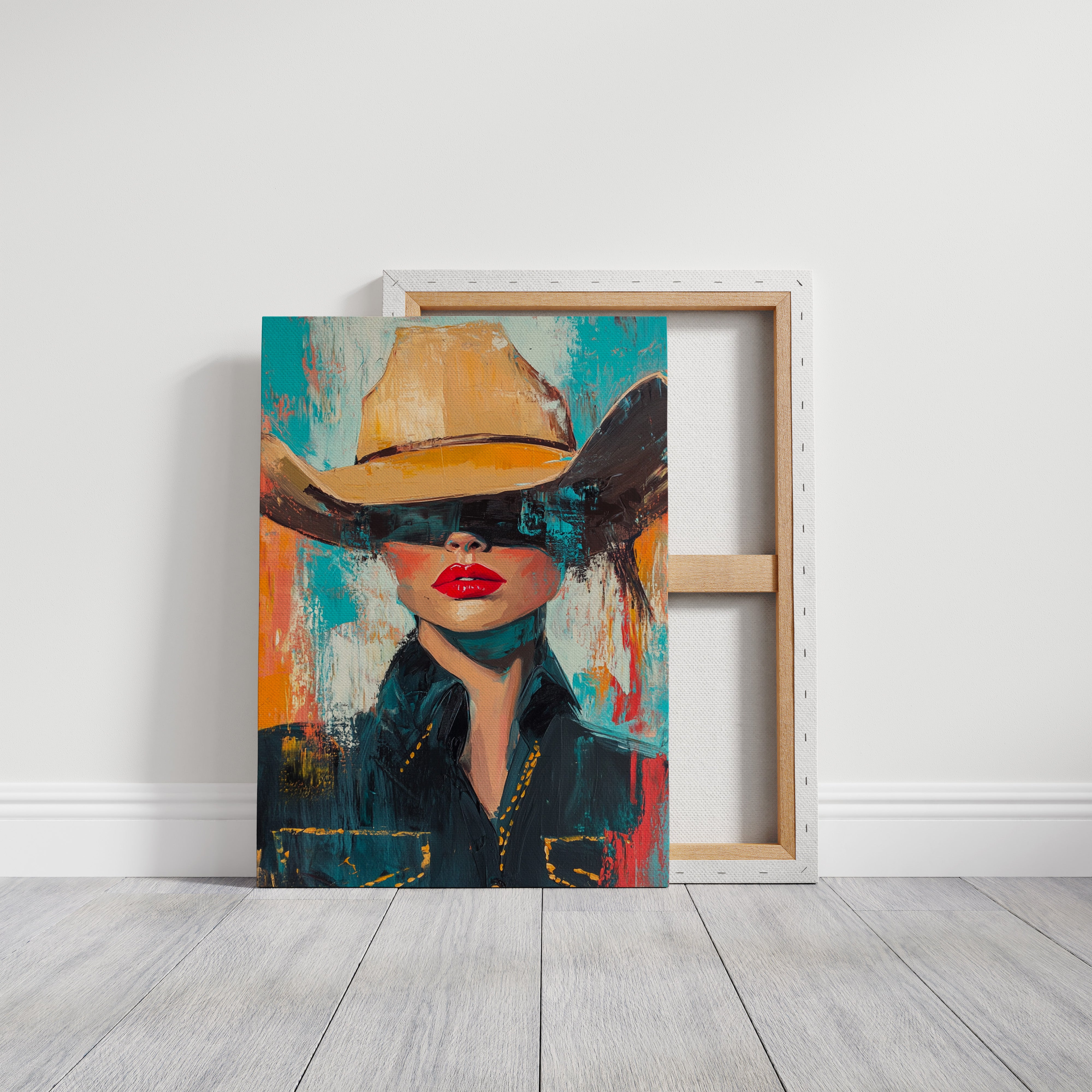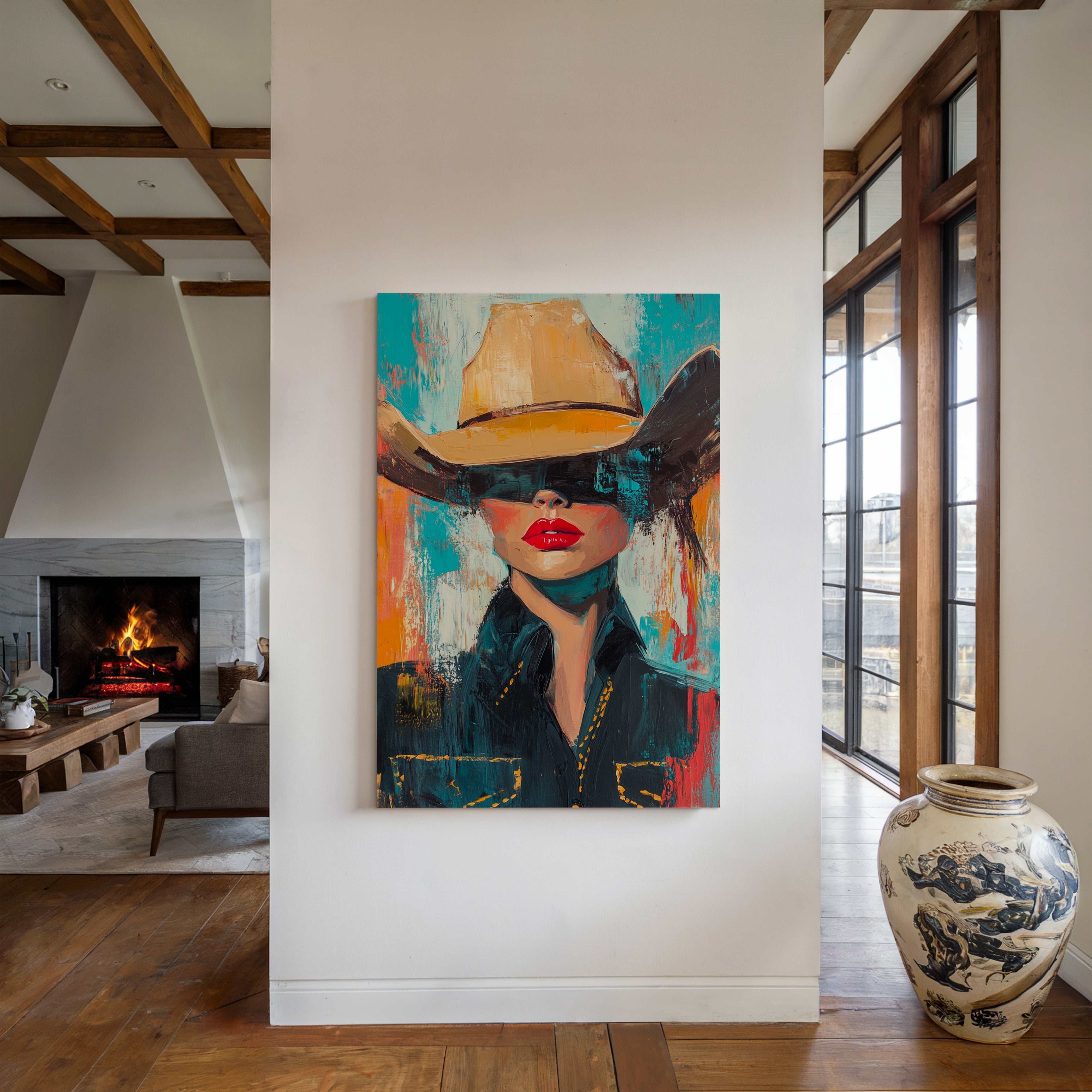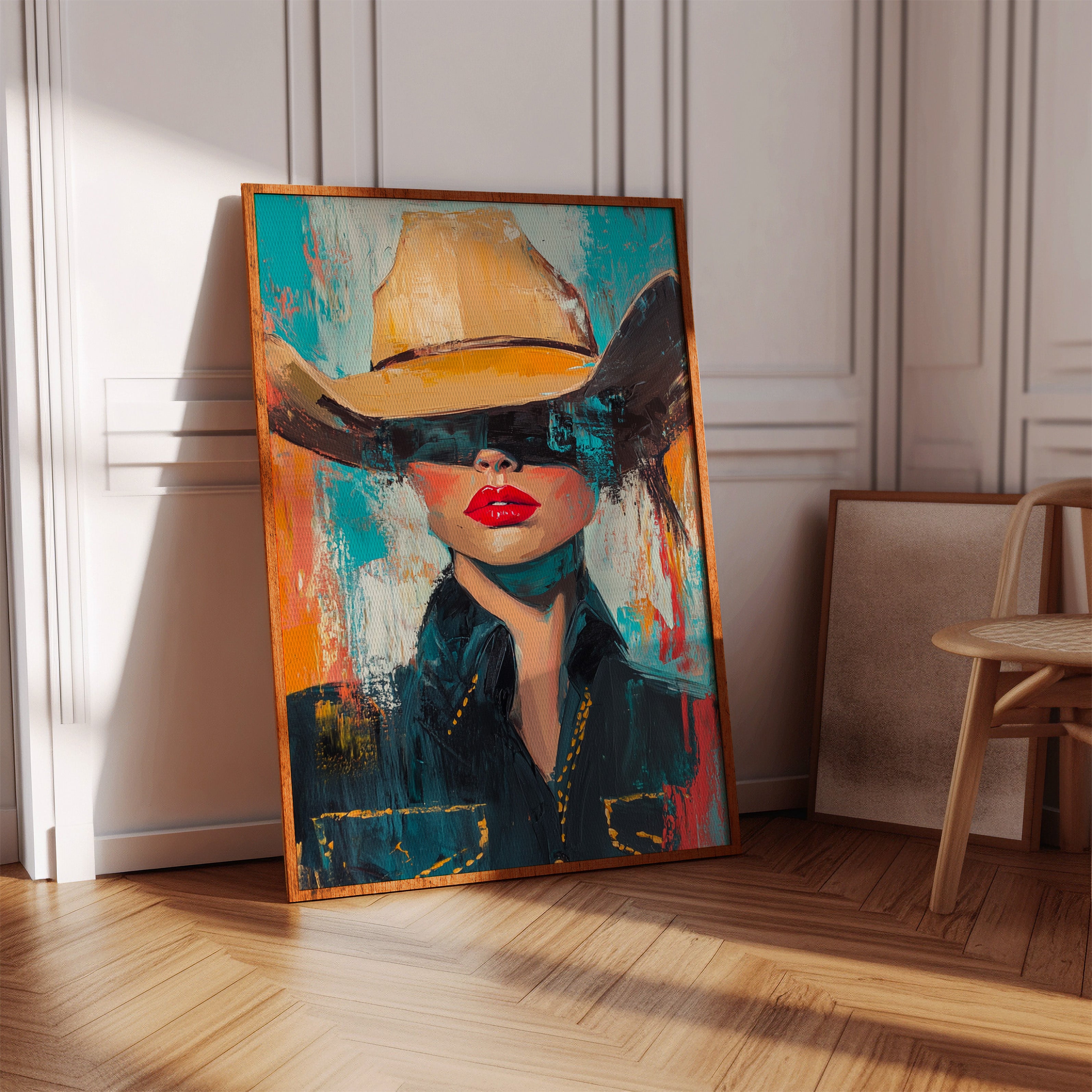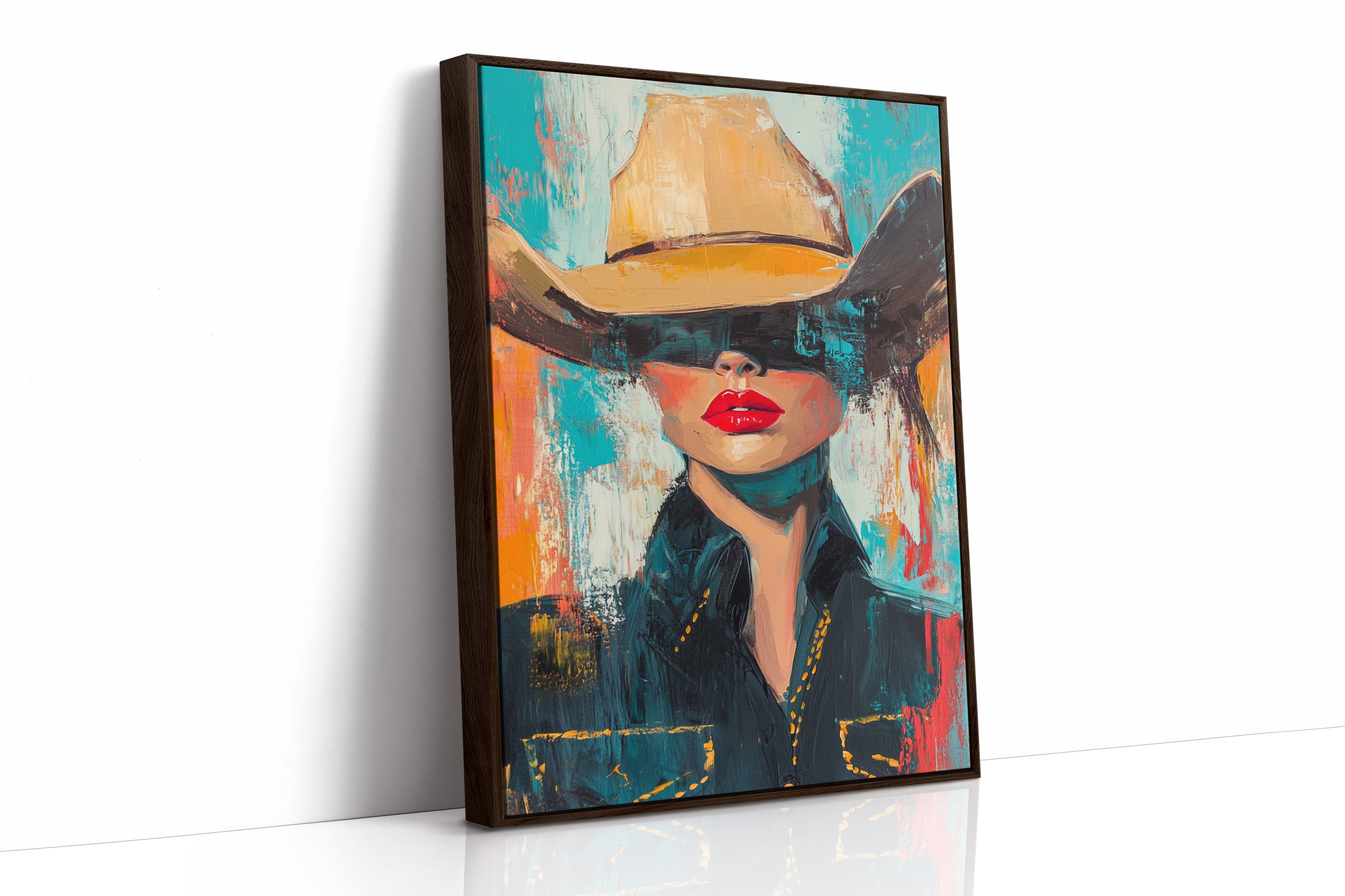 A fiery fusion of grit and glam. This pop-art cowgirl owns the canvas with unapologetic red lips, a golden hat, and a stare that doesn't need eyes to command the room. A wild west icon, reimagined with modern swagger and electric color.