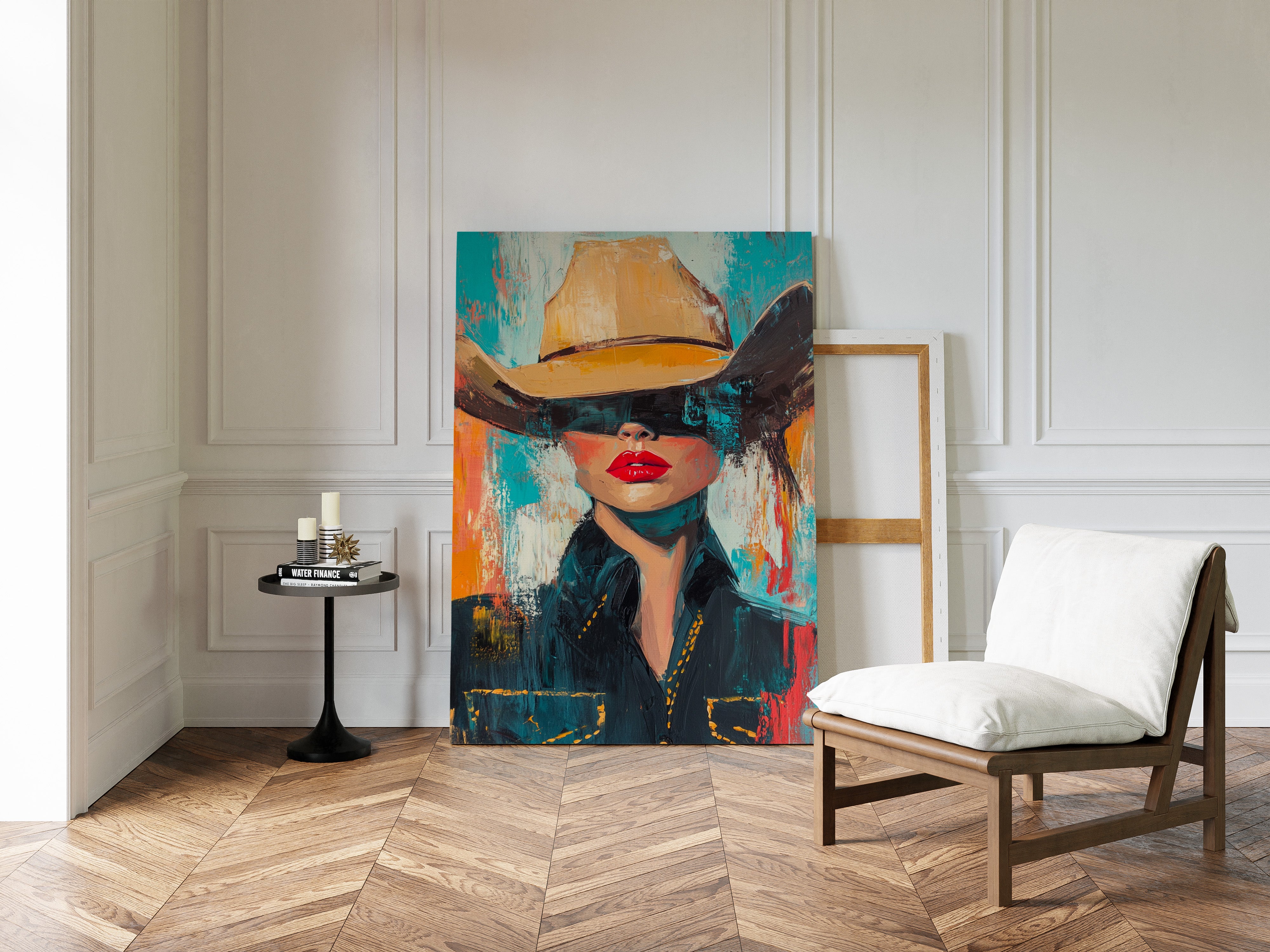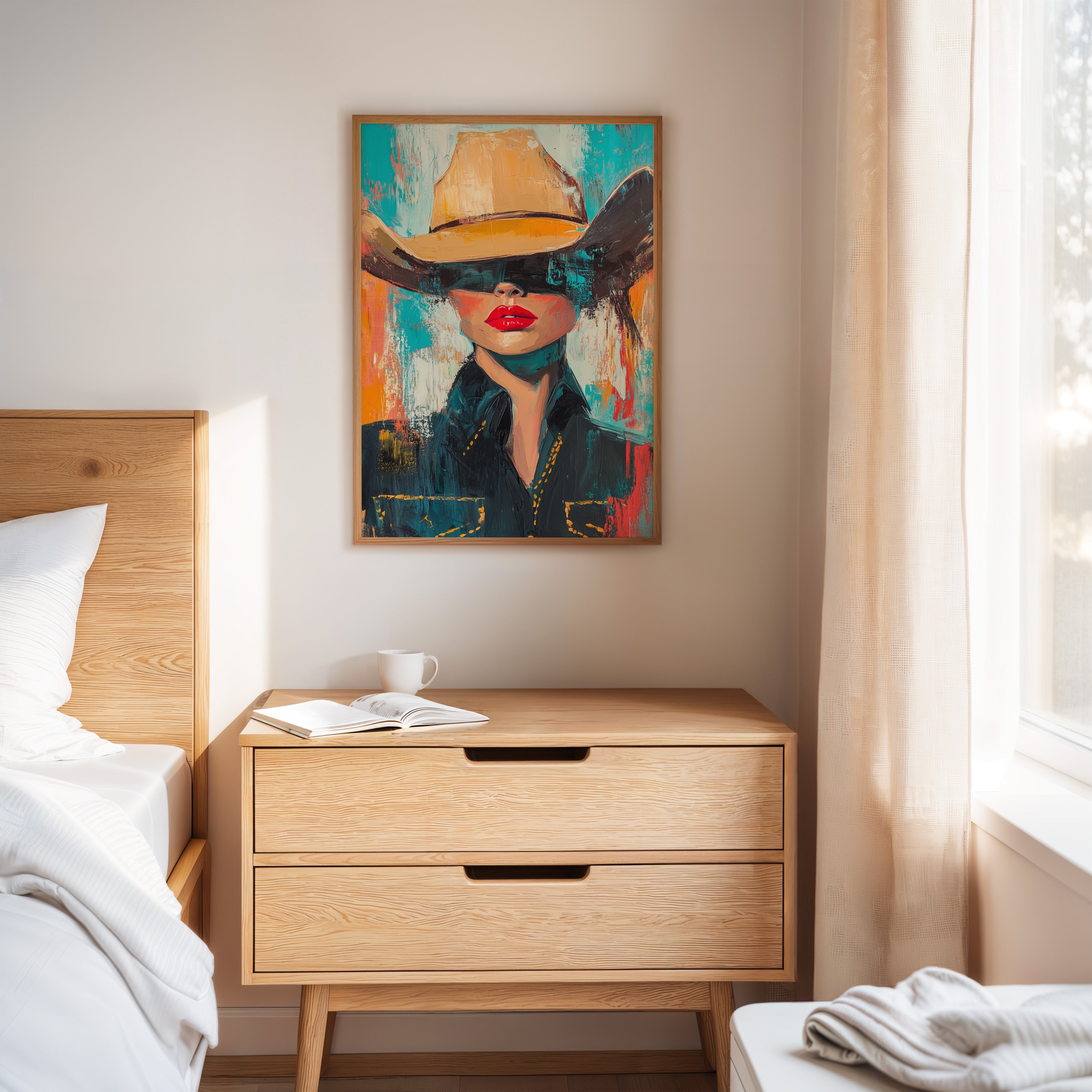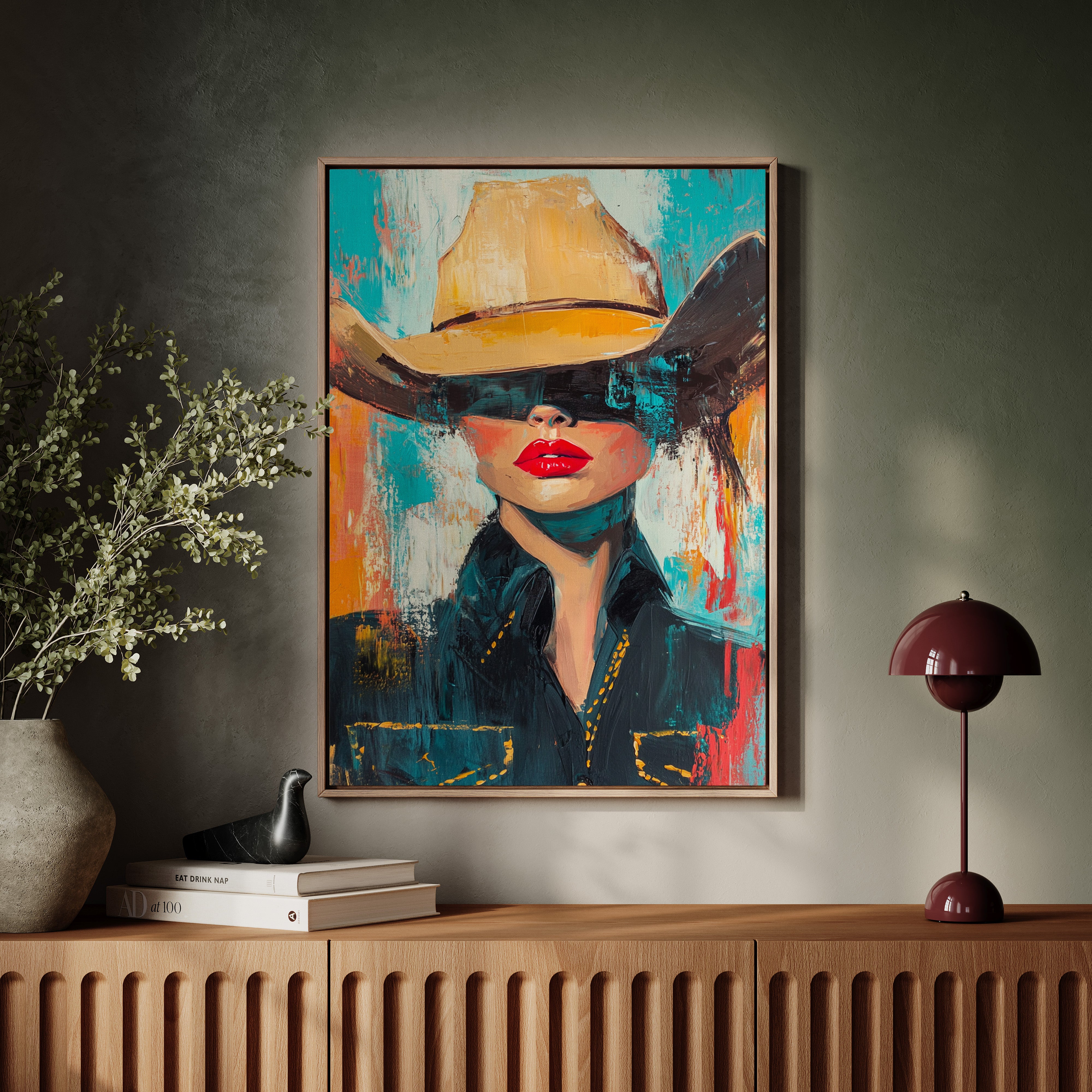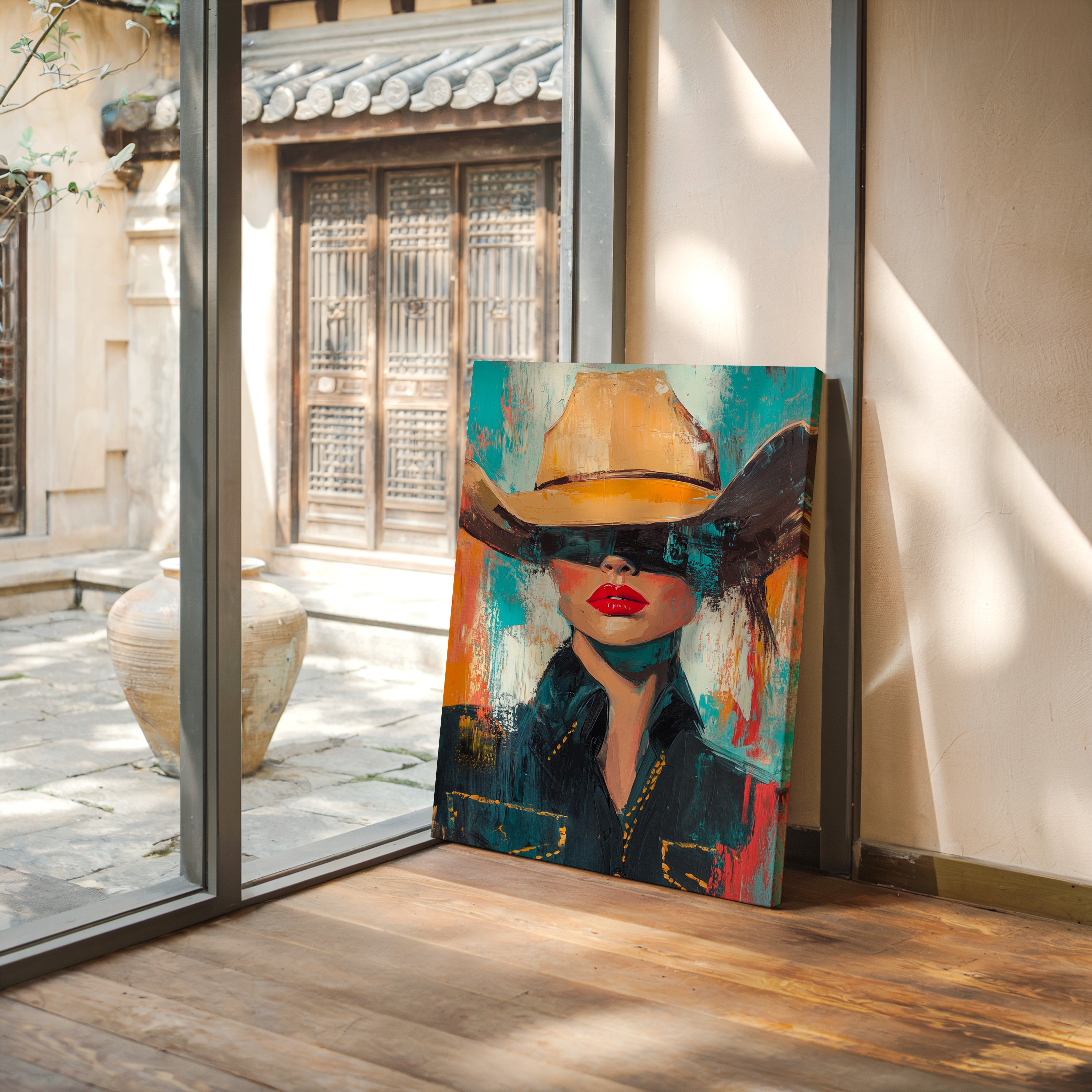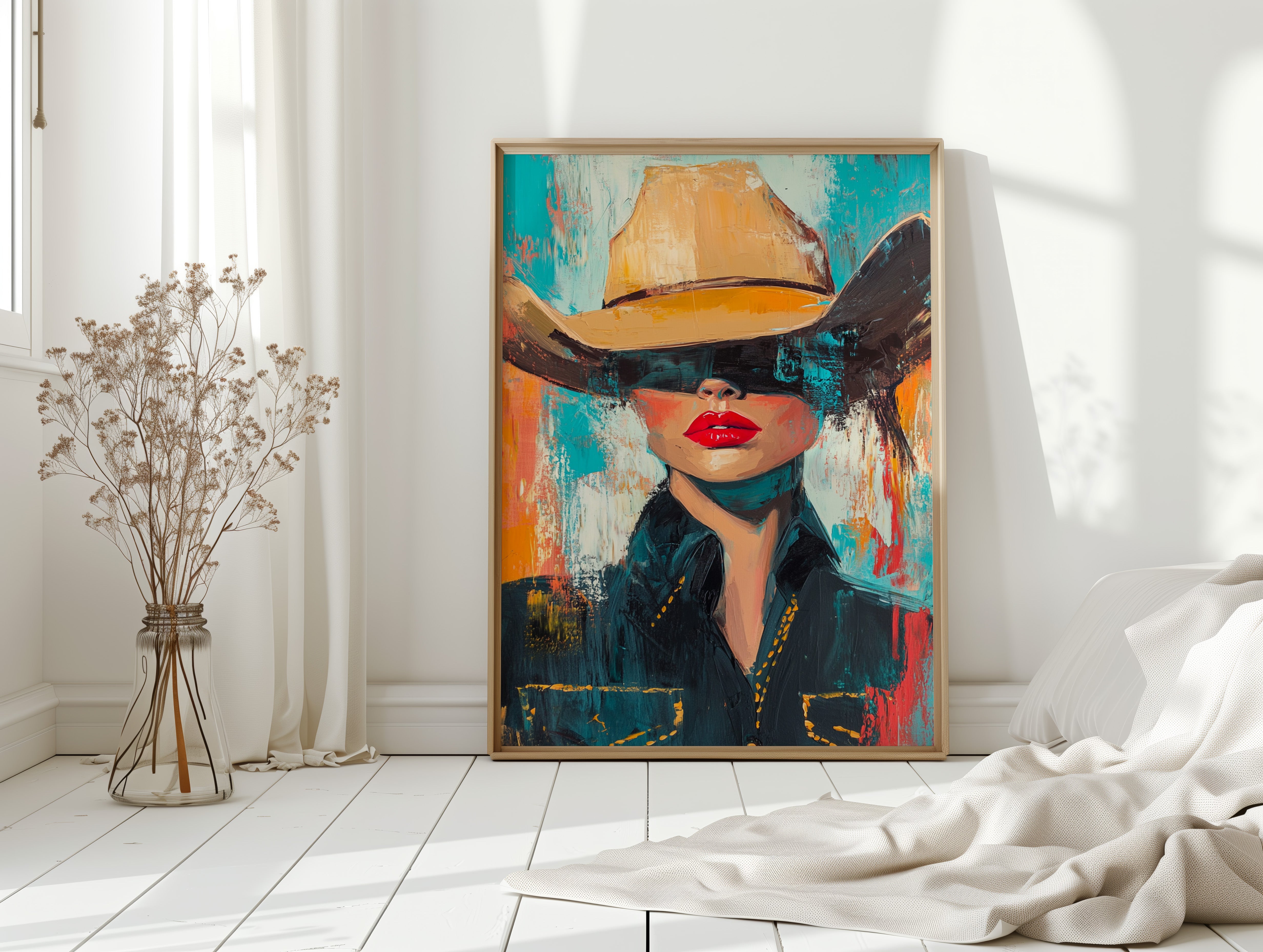 A fiery fusion of grit and glam. This pop-art cowgirl owns the canvas with unapologetic red lips, a golden hat, and a stare that doesn't need eyes to command the room. A wild west icon, reimagined with modern swagger and electric color.