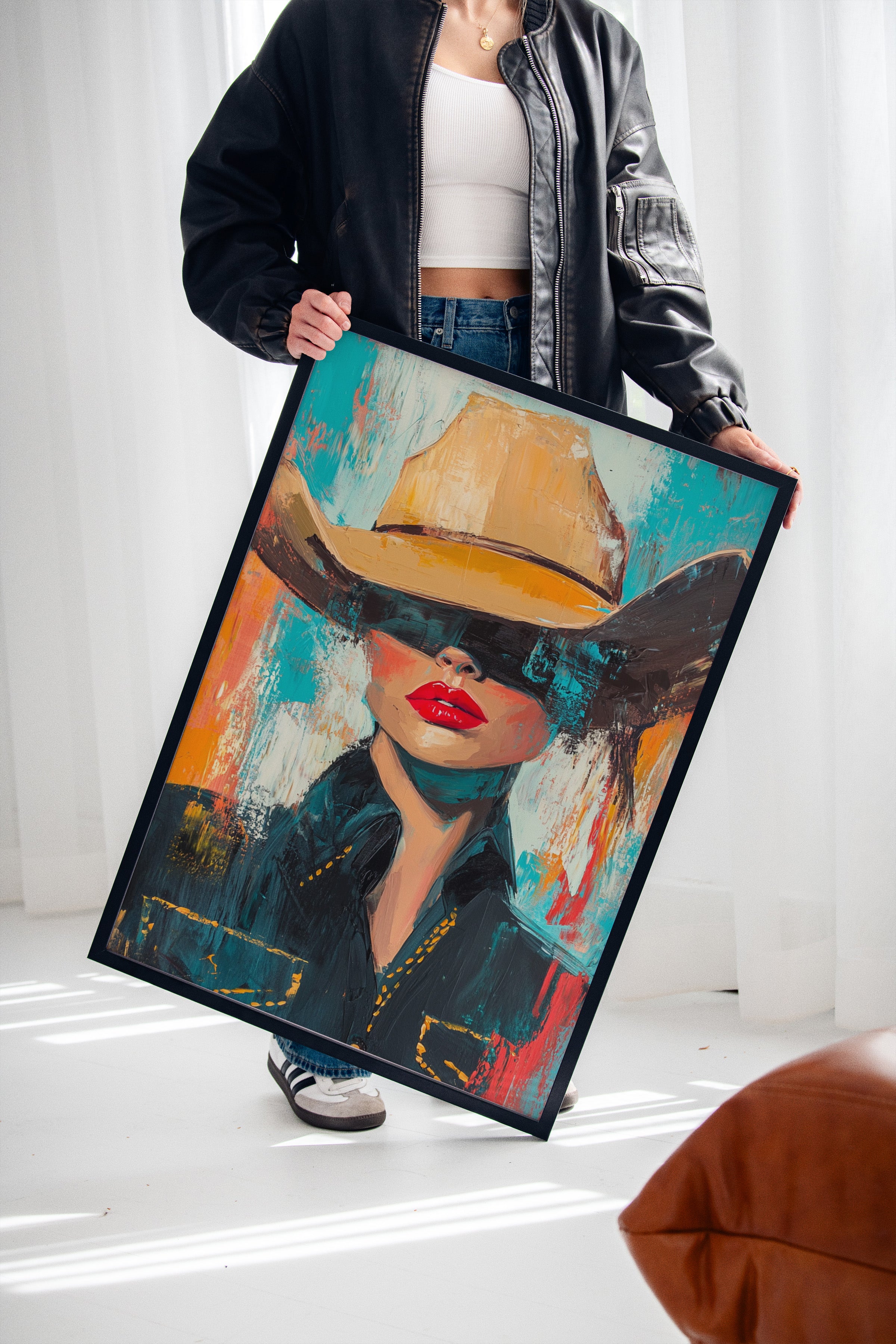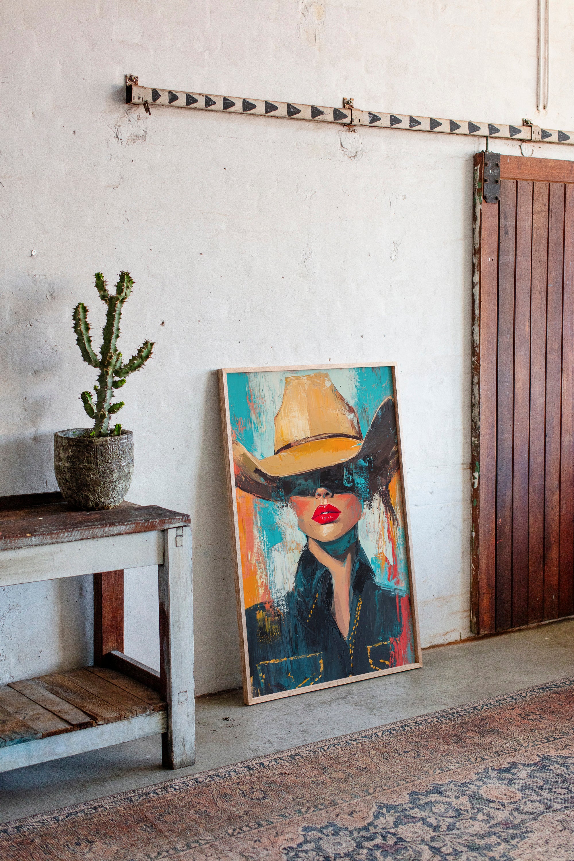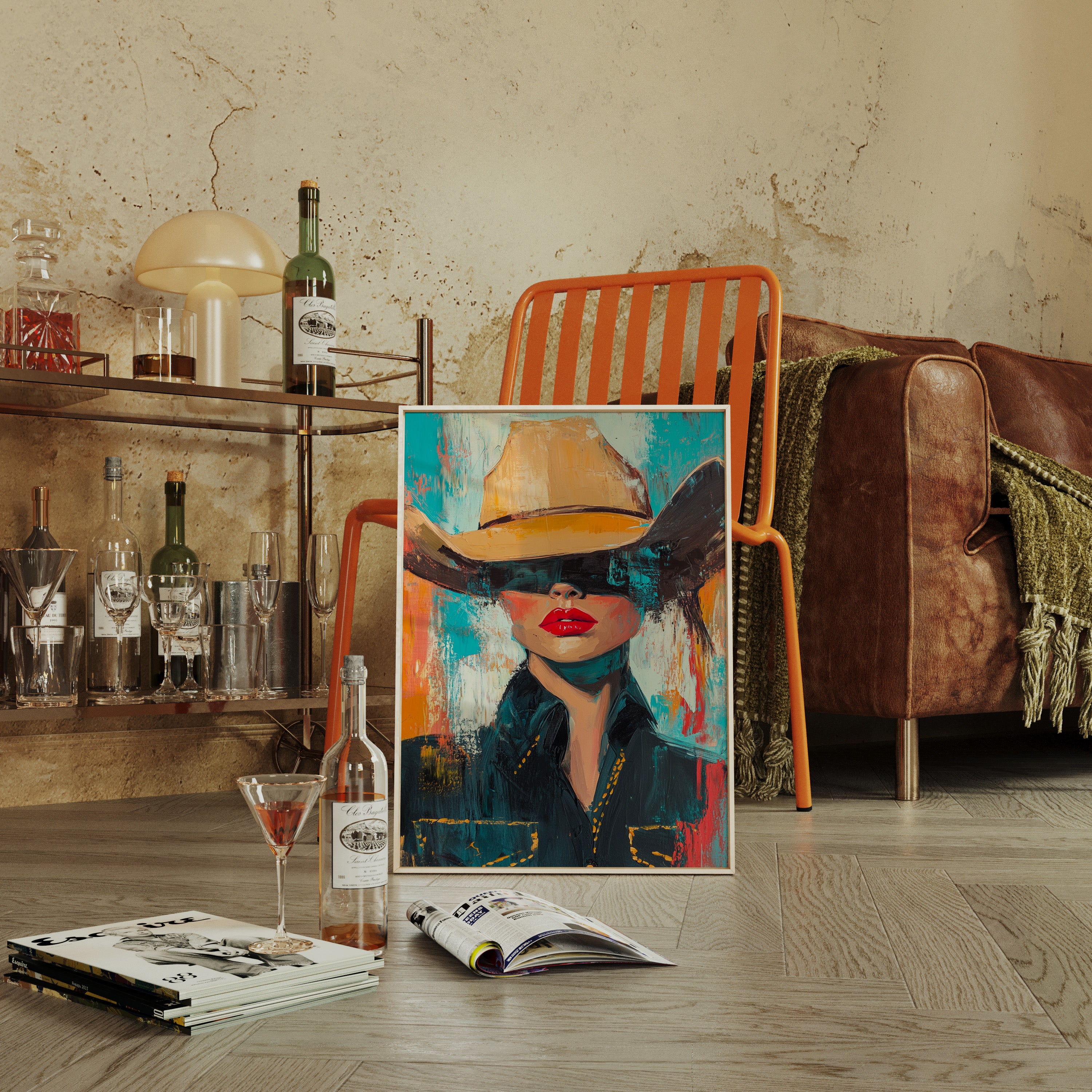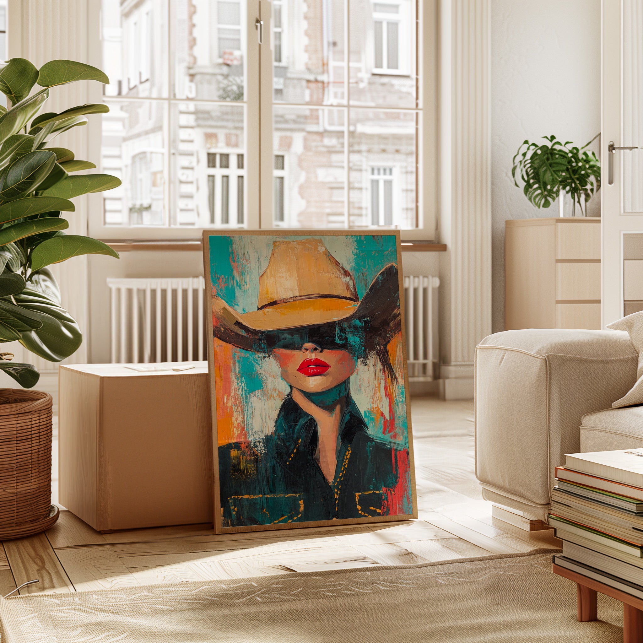 A fiery fusion of grit and glam. This pop-art cowgirl owns the canvas with unapologetic red lips, a golden hat, and a stare that doesn't need eyes to command the room. A wild west icon, reimagined with modern swagger and electric color.
