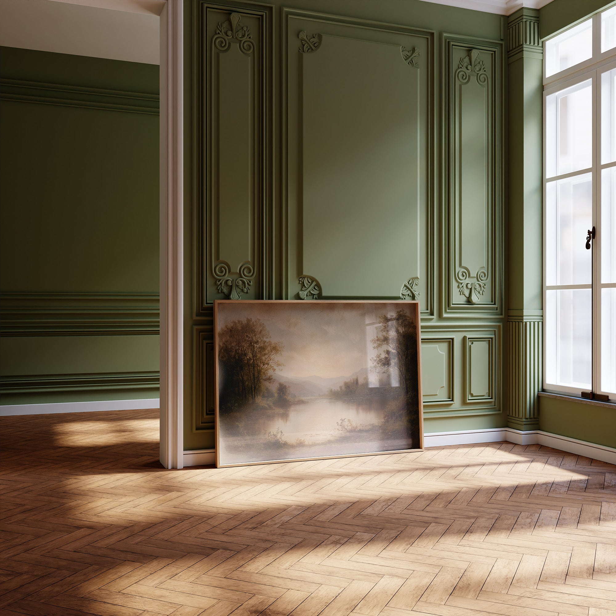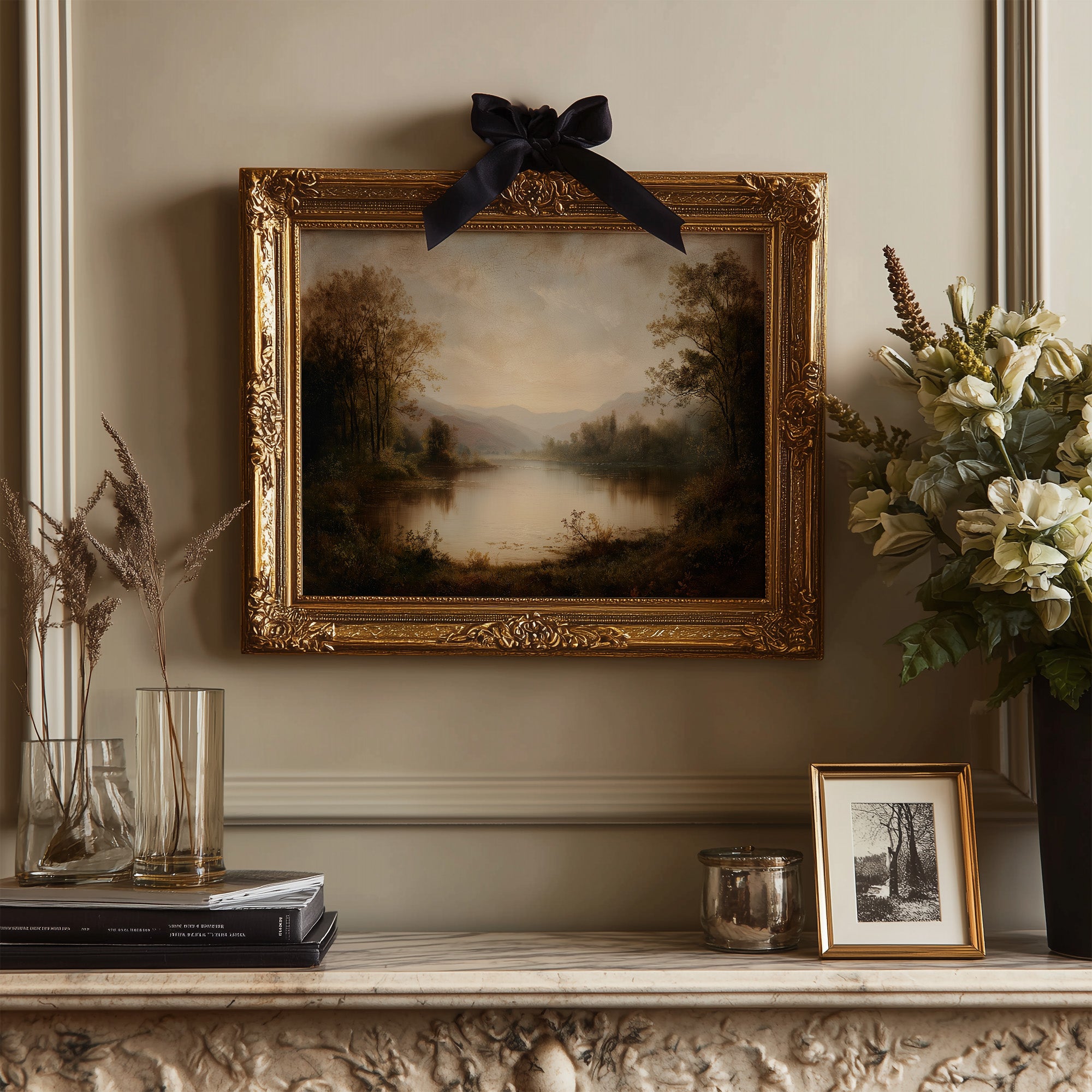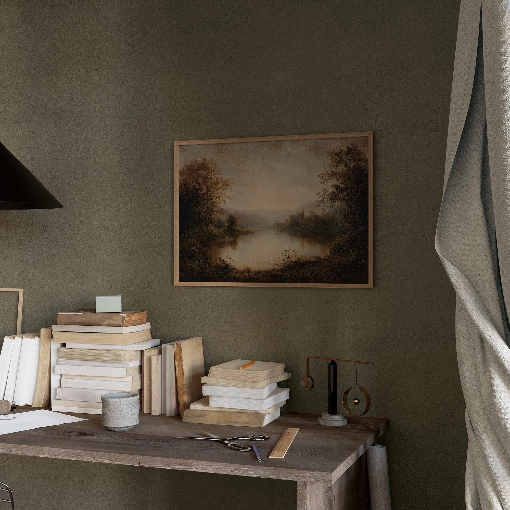 The soft glow of an antique landscape painting creates a moment of serenity amid rows of well-loved books. Muted browns and gentle blues capture a forgotten riverbank, where mountains fade into misty distance and trees stand sentinel along still waters. The painting's timeless beauty is enhanced by its placement against wooden shelving filled with leather-bound volumes and contemporary titles, creating a perfect dialogue between art and literature. This piece brings contemplative charm to a study, reading nook, or any space where stories and reflection intertwine.