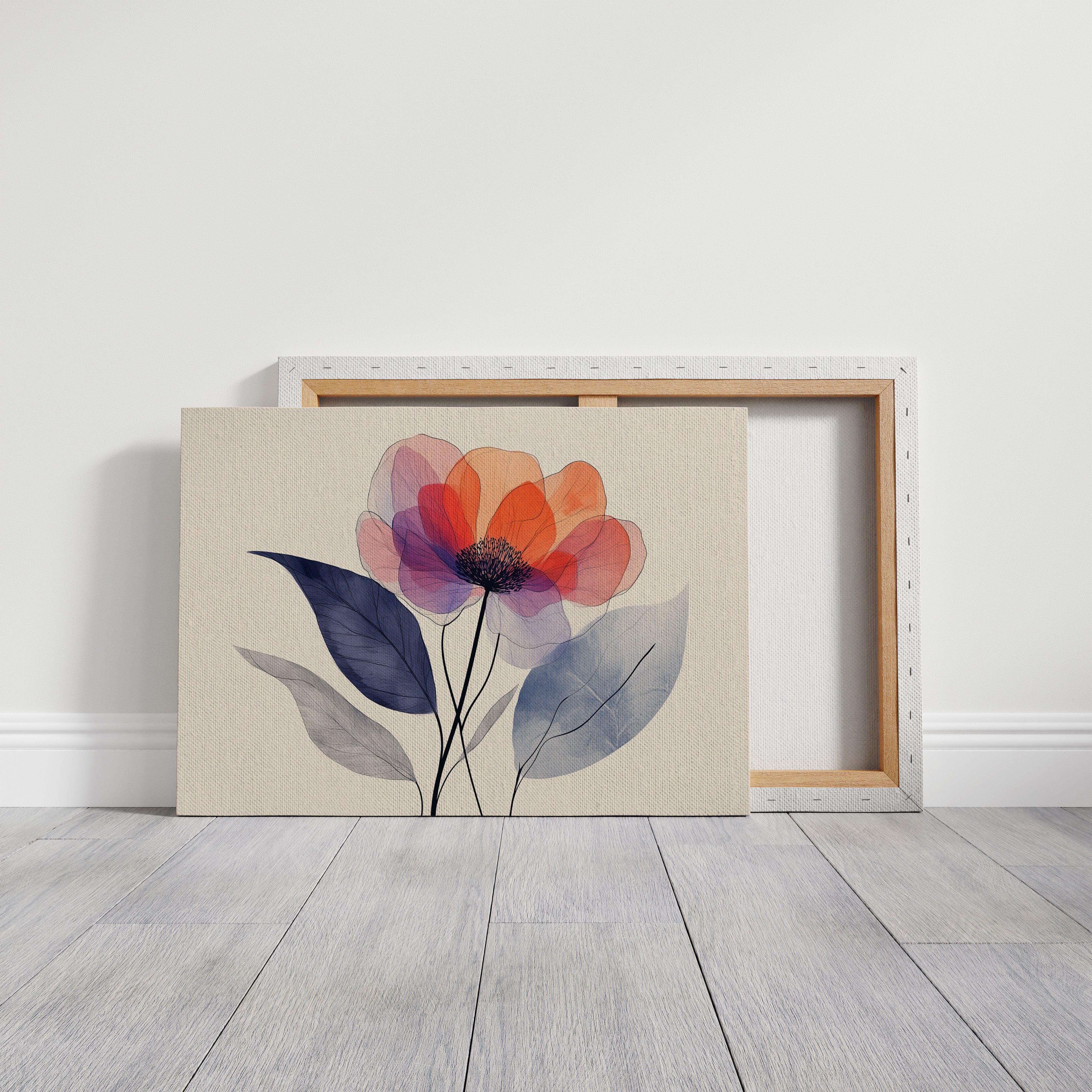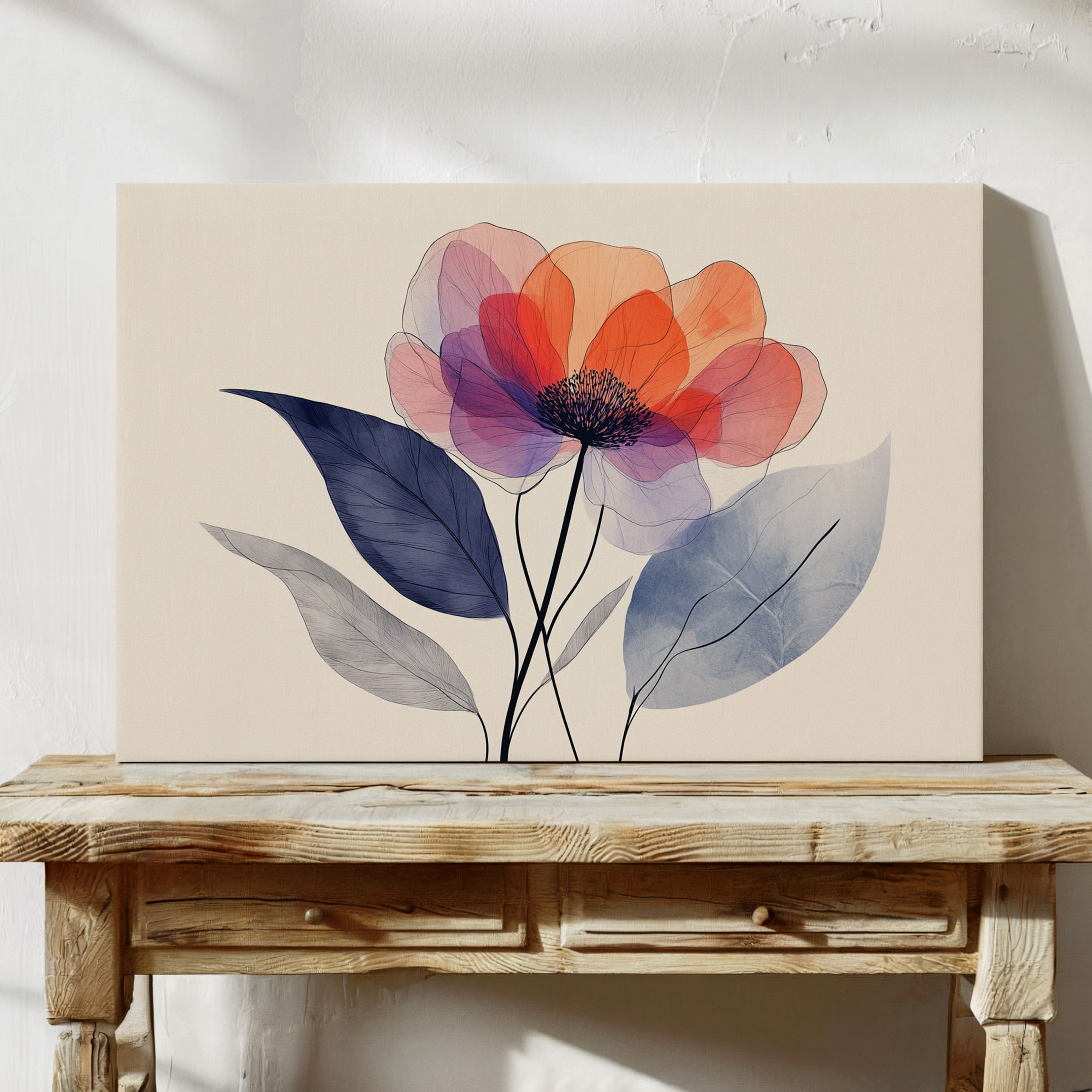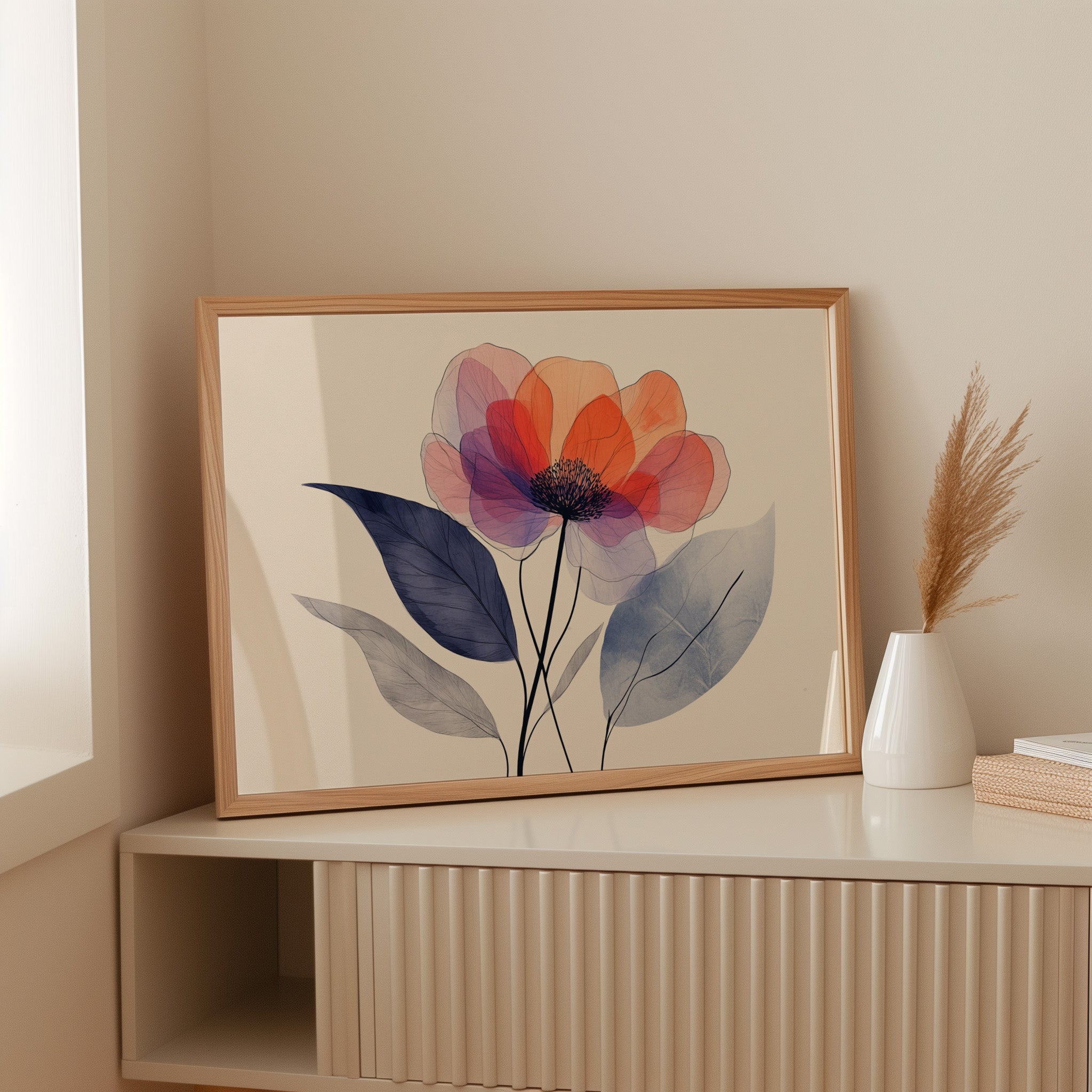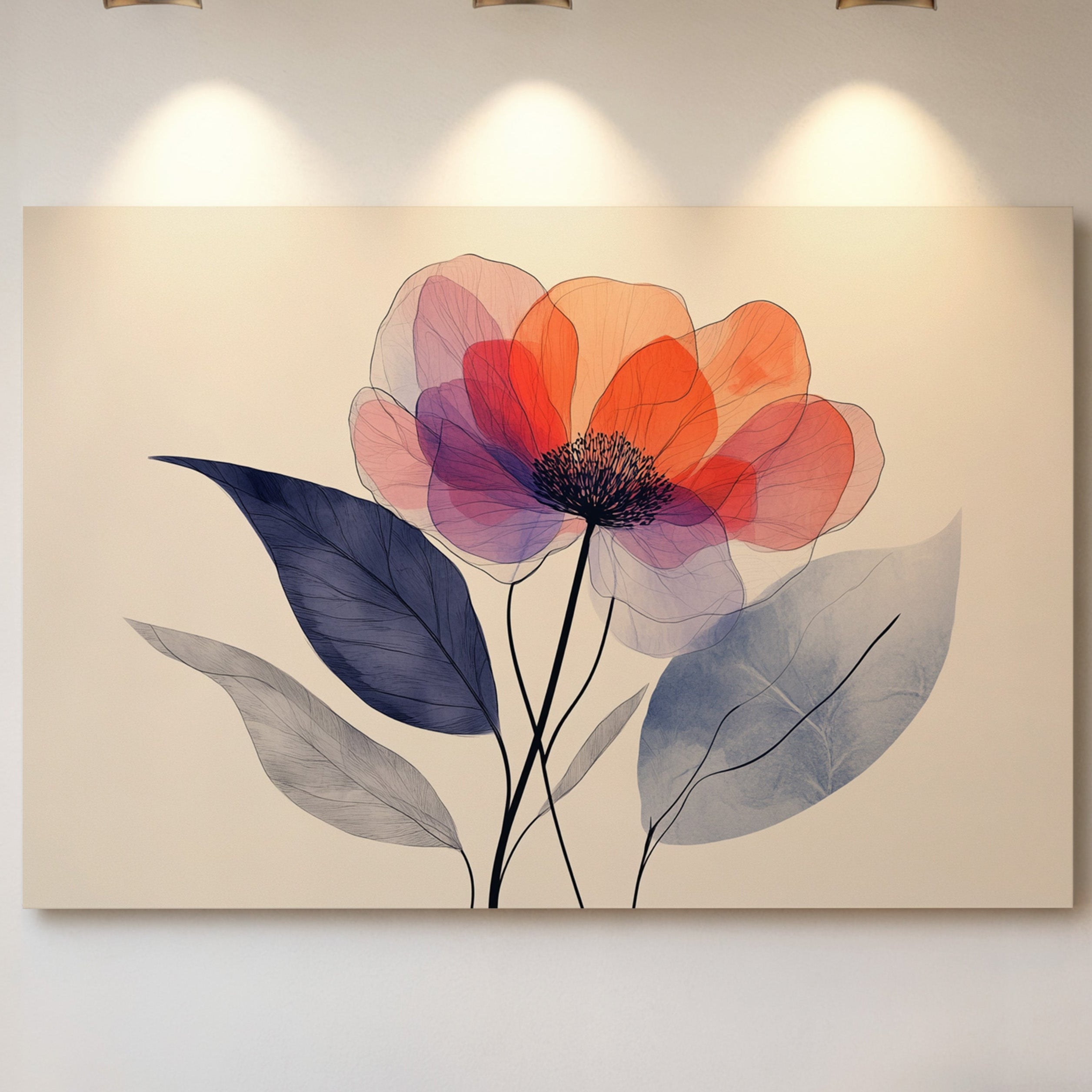 A delicate dance of transparency and color unfolds as gossamer petals layer into a mesmerizing bloom. The flower's coral and violet hues melt together like watercolors on silk, while navy and silver leaves provide a strong, grounding presence. The composition captures the ethereal nature of botanical X-rays, where each vein and petal becomes a study in light and shadow. This contemporary botanical illustration merges scientific precision with artistic poetry, creating a harmonious balance between structure and fluidity. Perfect for modern spaces seeking a sophisticated yet organic presence, especially in minimalist bedrooms or serene home offices where its gentle energy can inspire creativity and calm.