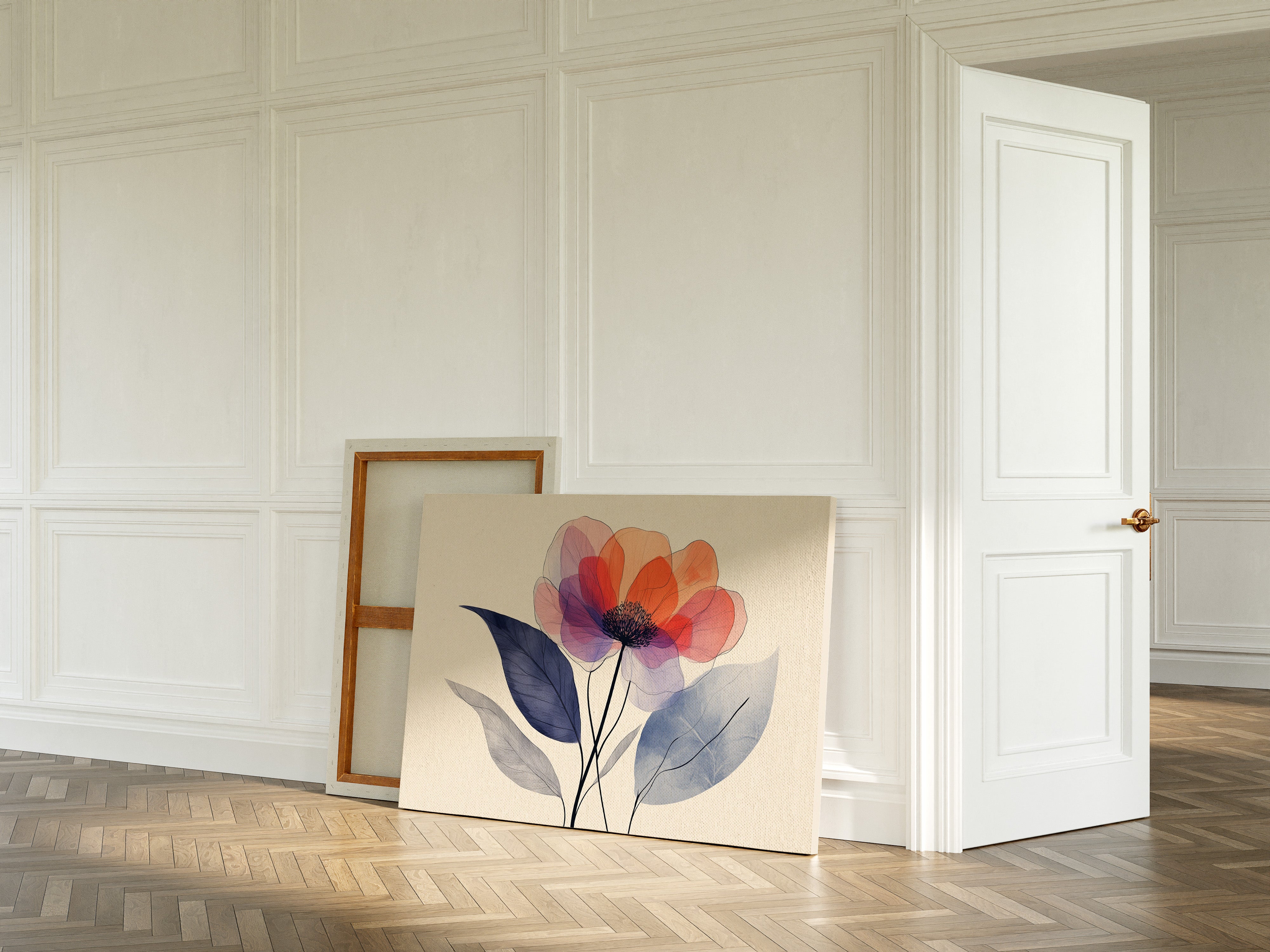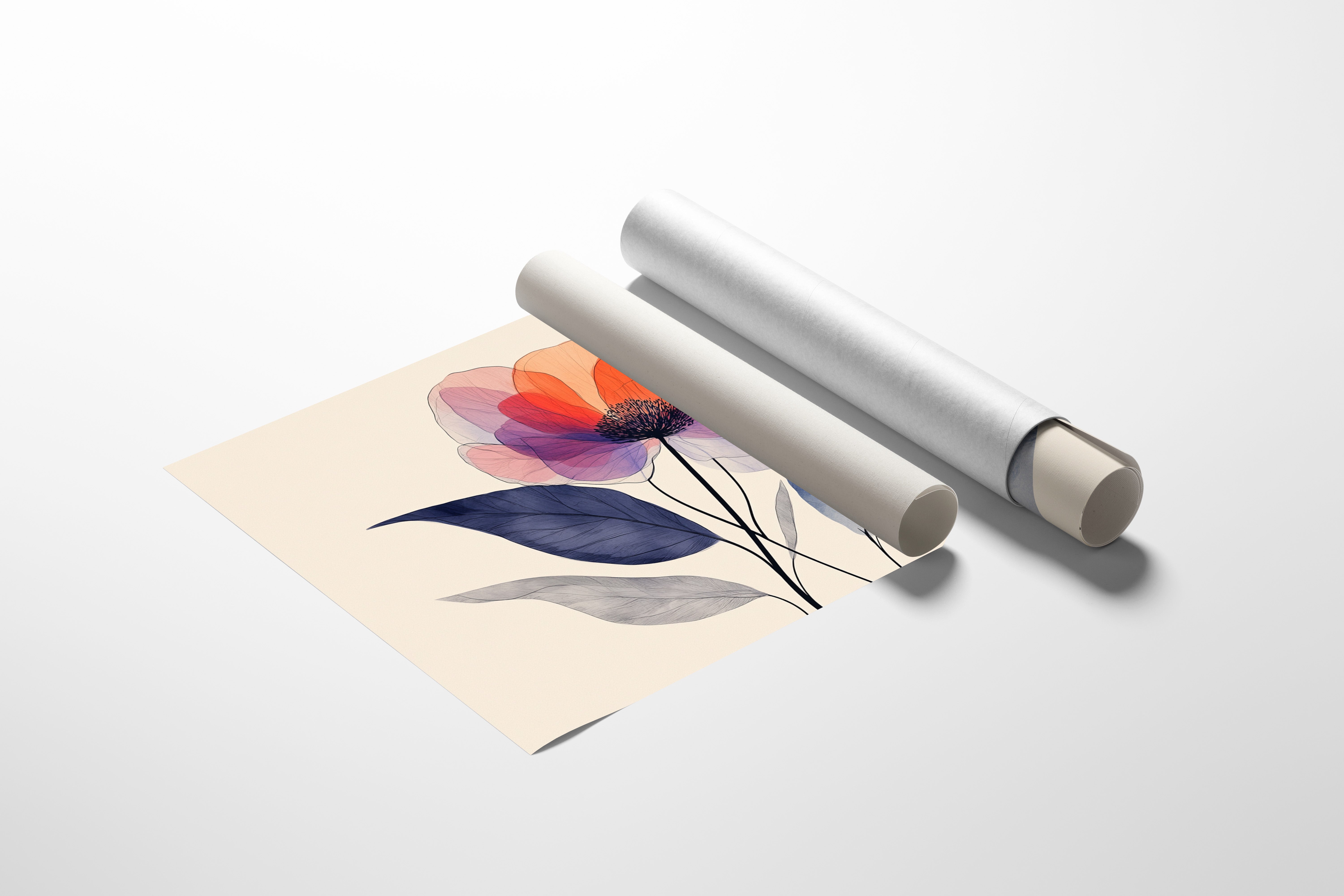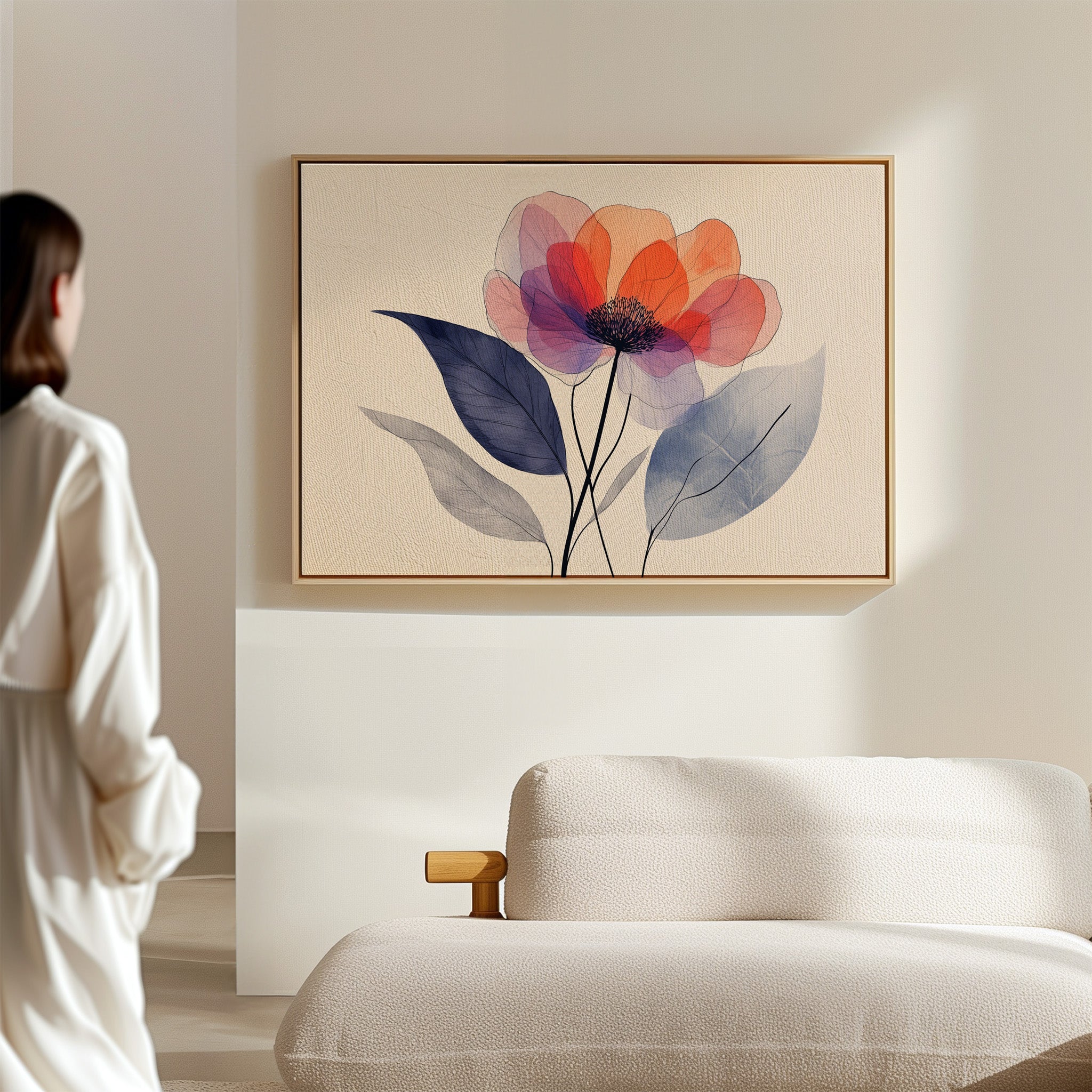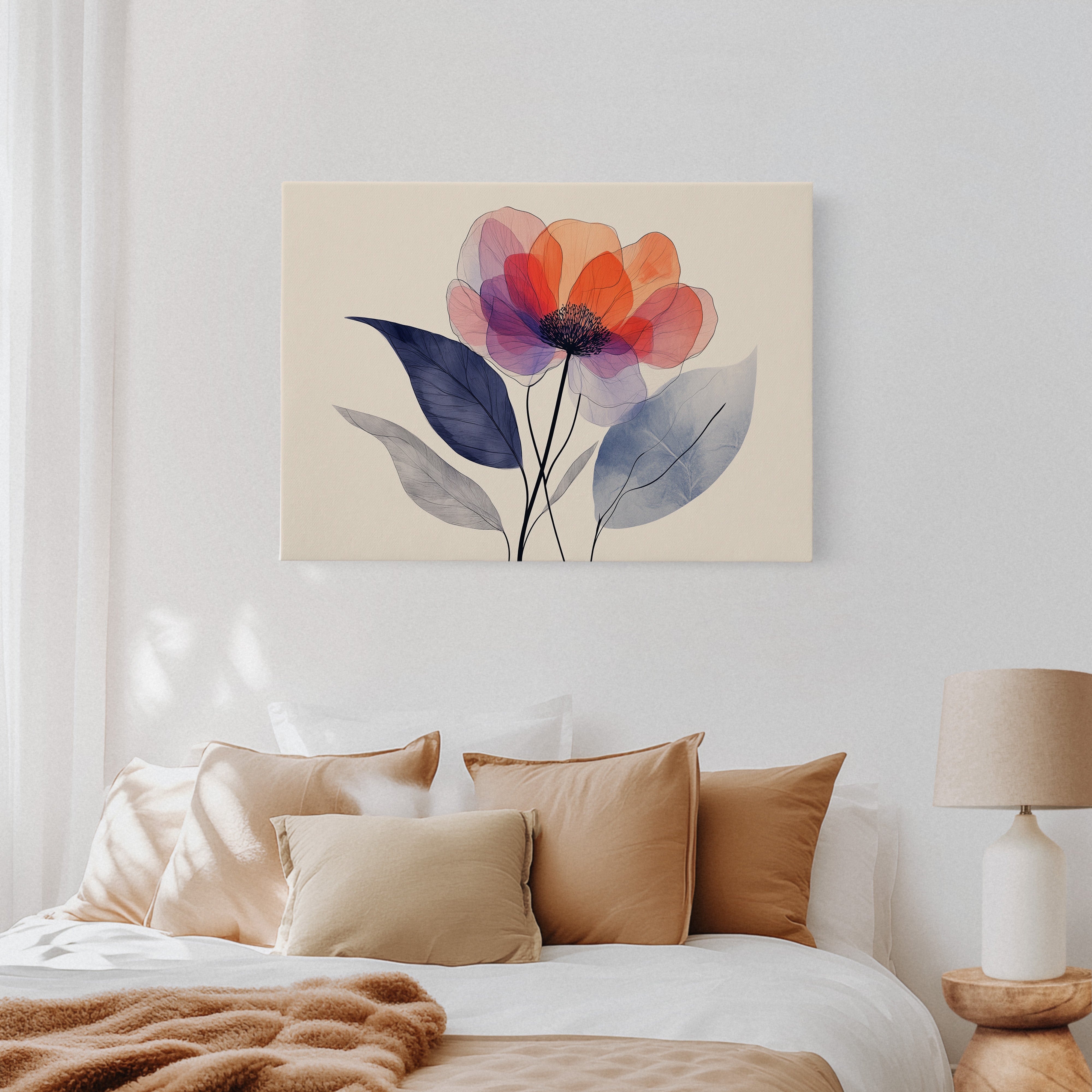 A delicate dance of transparency and color unfolds as gossamer petals layer into a mesmerizing bloom. The flower's coral and violet hues melt together like watercolors on silk, while navy and silver leaves provide a strong, grounding presence. The composition captures the ethereal nature of botanical X-rays, where each vein and petal becomes a study in light and shadow. This contemporary botanical illustration merges scientific precision with artistic poetry, creating a harmonious balance between structure and fluidity. Perfect for modern spaces seeking a sophisticated yet organic presence, especially in minimalist bedrooms or serene home offices where its gentle energy can inspire creativity and calm.