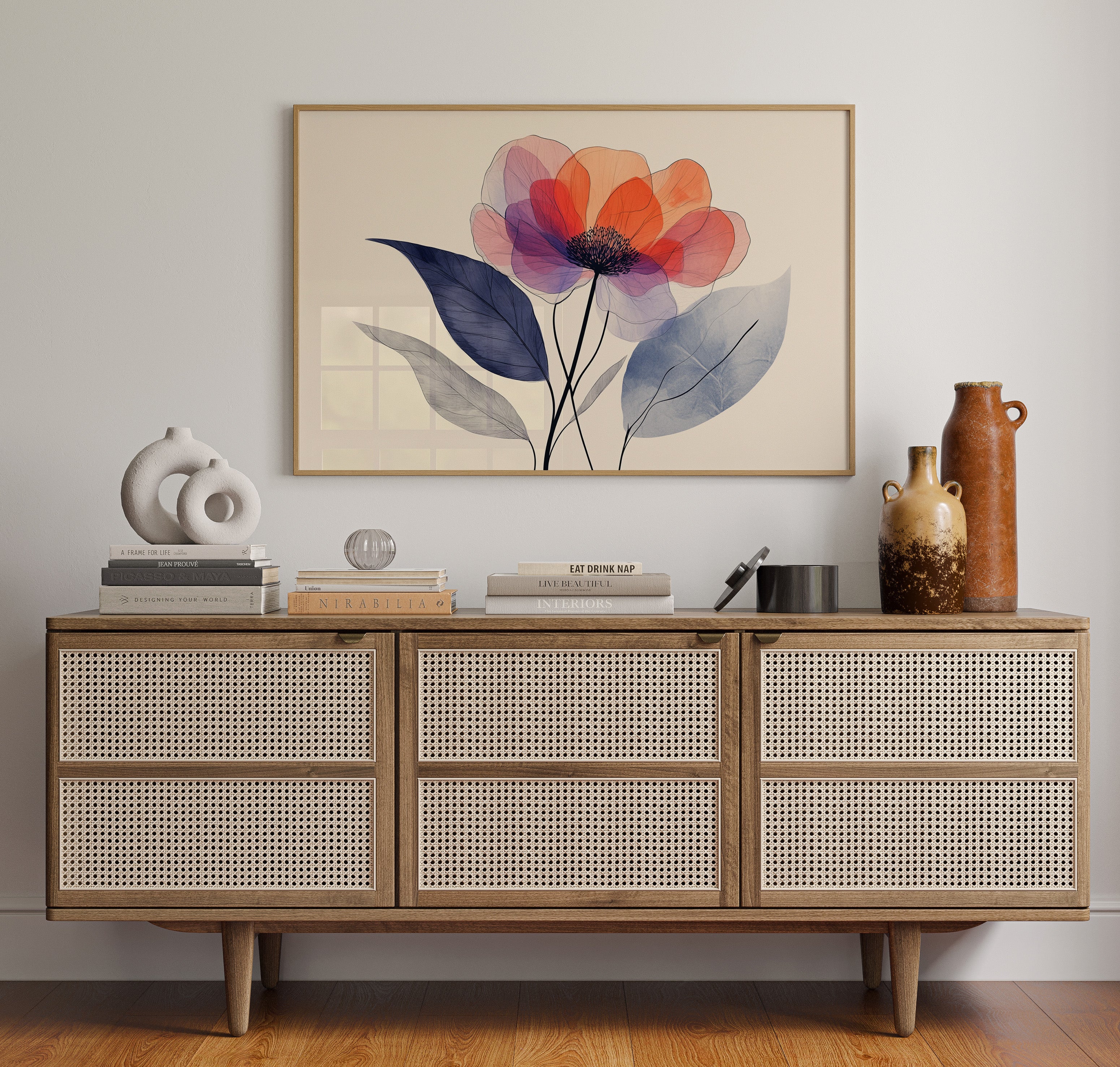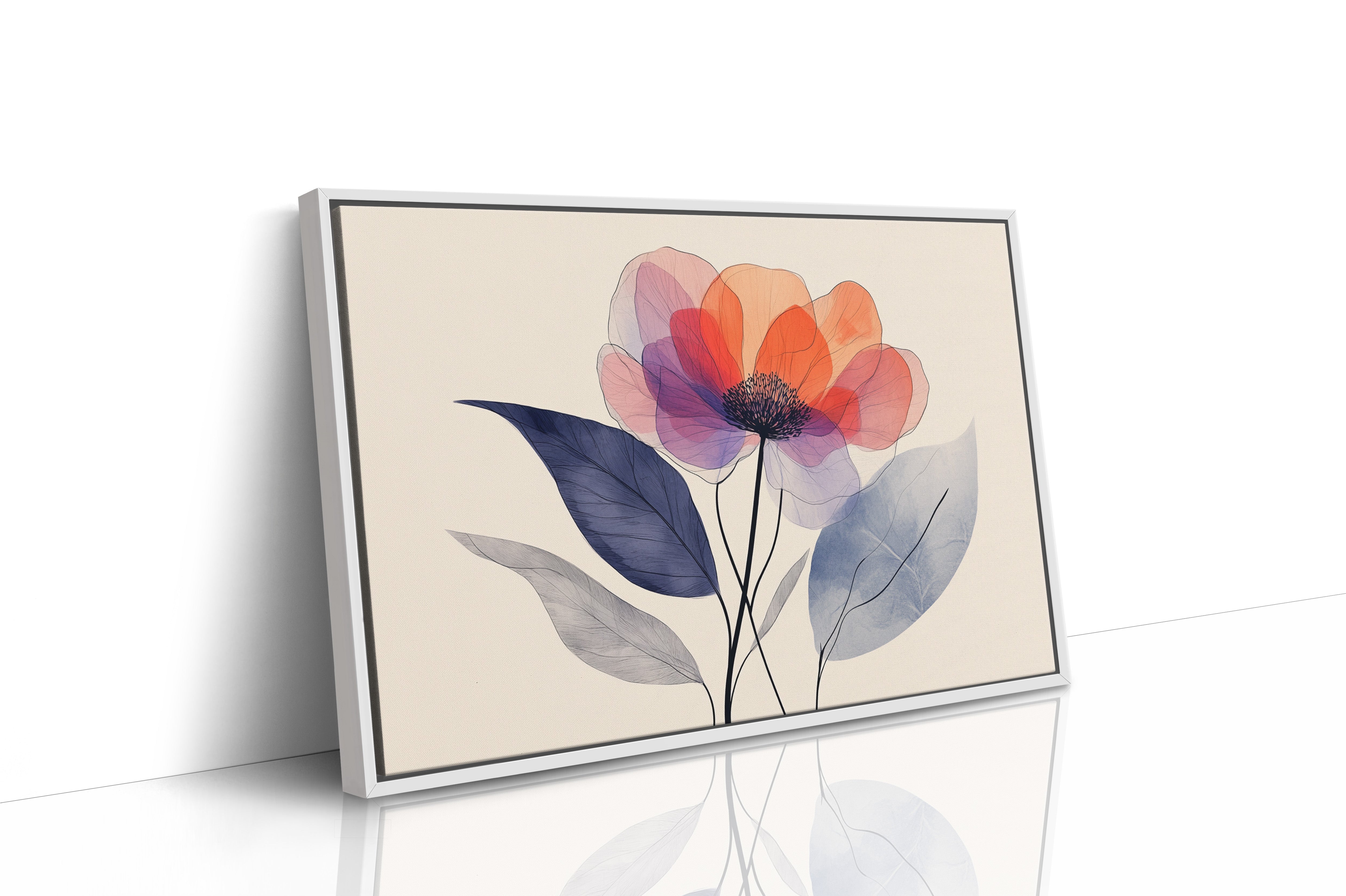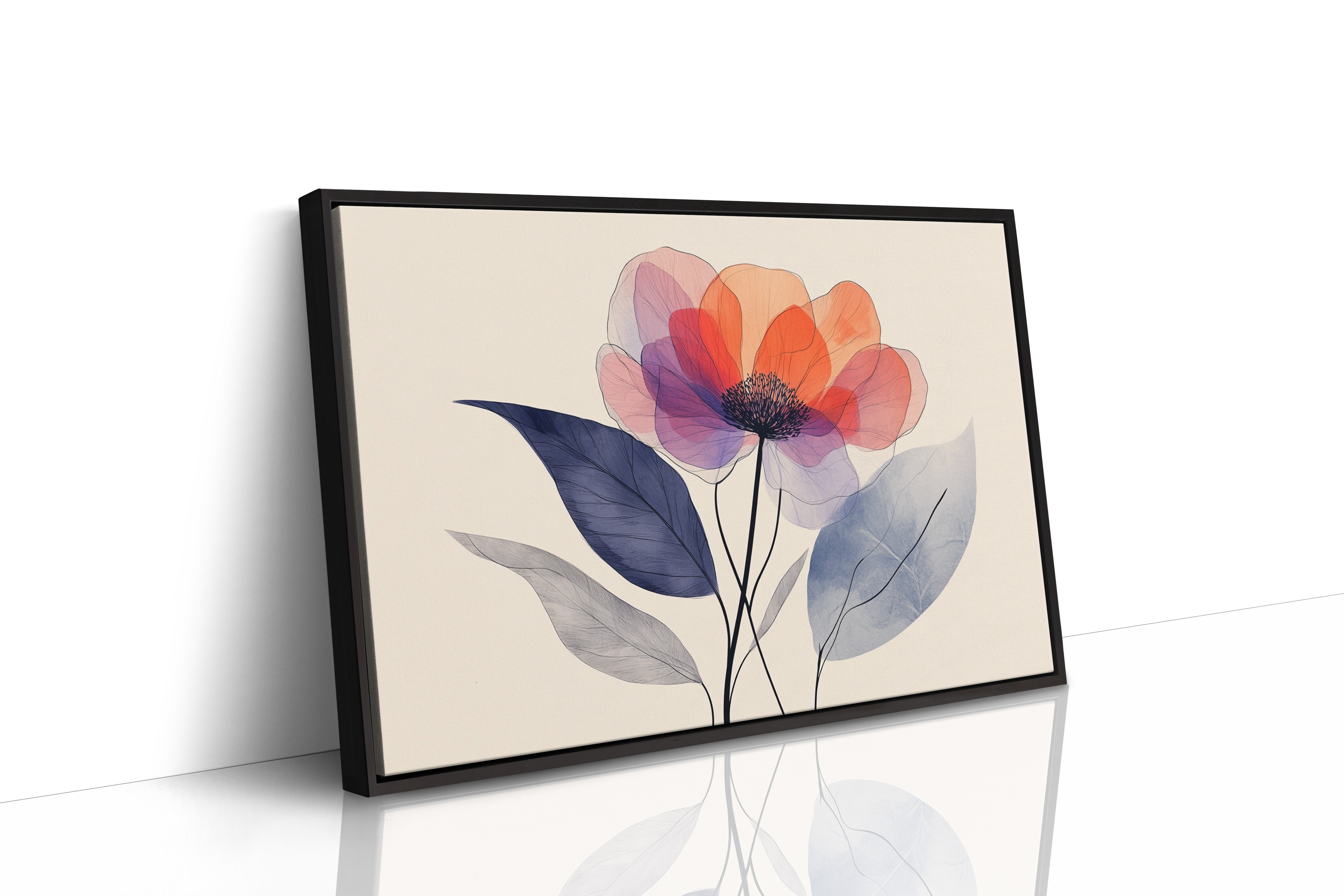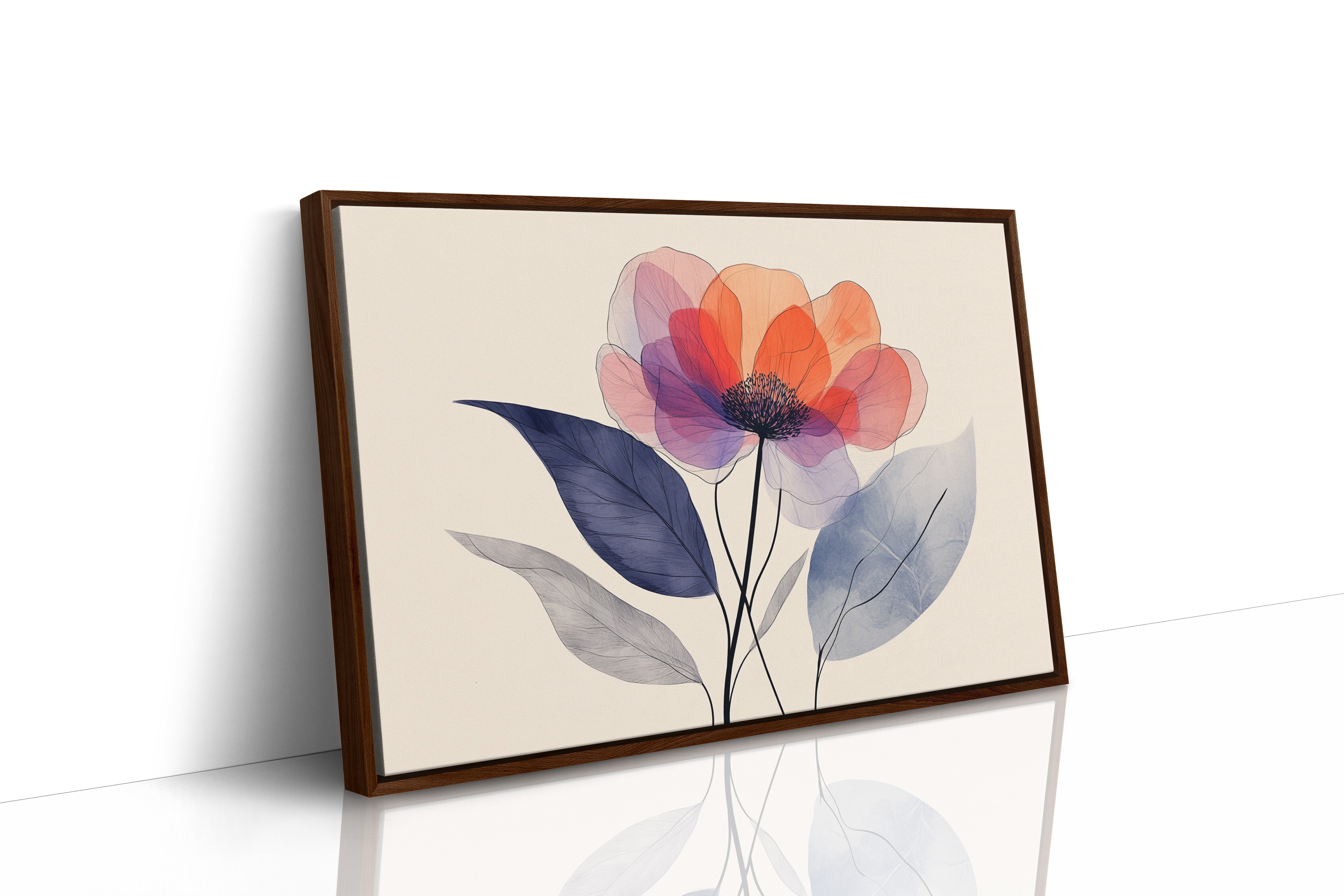 A delicate dance of transparency and color unfolds as gossamer petals layer into a mesmerizing bloom. The flower's coral and violet hues melt together like watercolors on silk, while navy and silver leaves provide a strong, grounding presence. The composition captures the ethereal nature of botanical X-rays, where each vein and petal becomes a study in light and shadow. This contemporary botanical illustration merges scientific precision with artistic poetry, creating a harmonious balance between structure and fluidity. Perfect for modern spaces seeking a sophisticated yet organic presence, especially in minimalist bedrooms or serene home offices where its gentle energy can inspire creativity and calm.