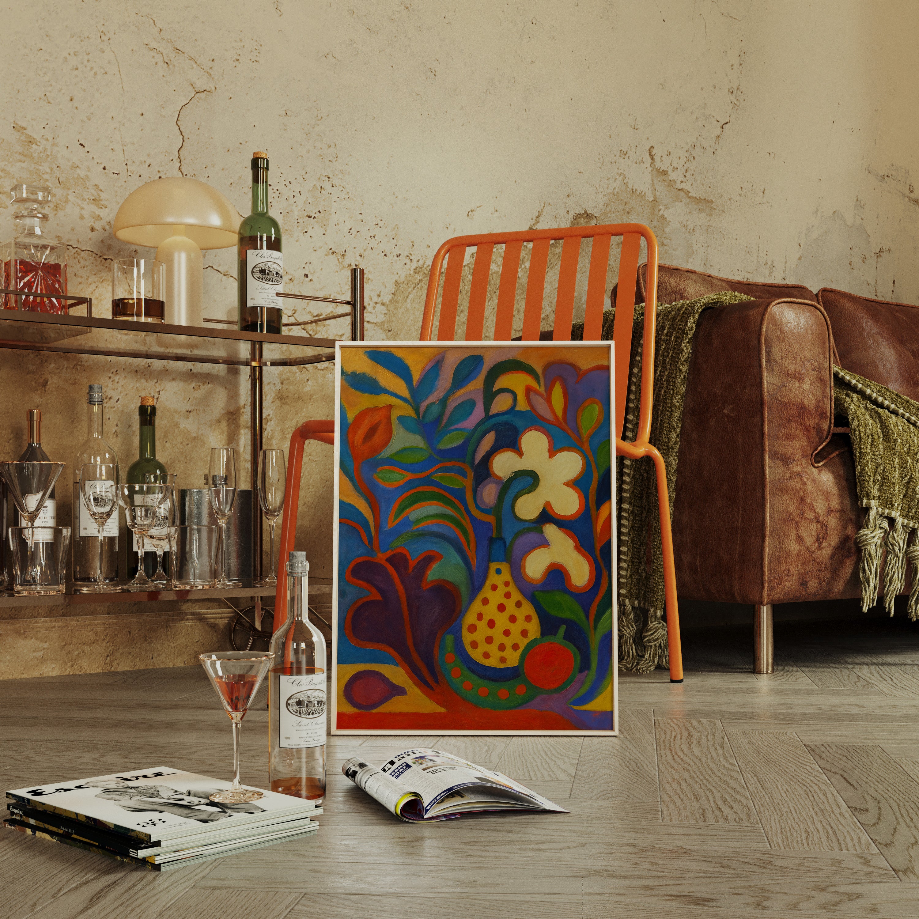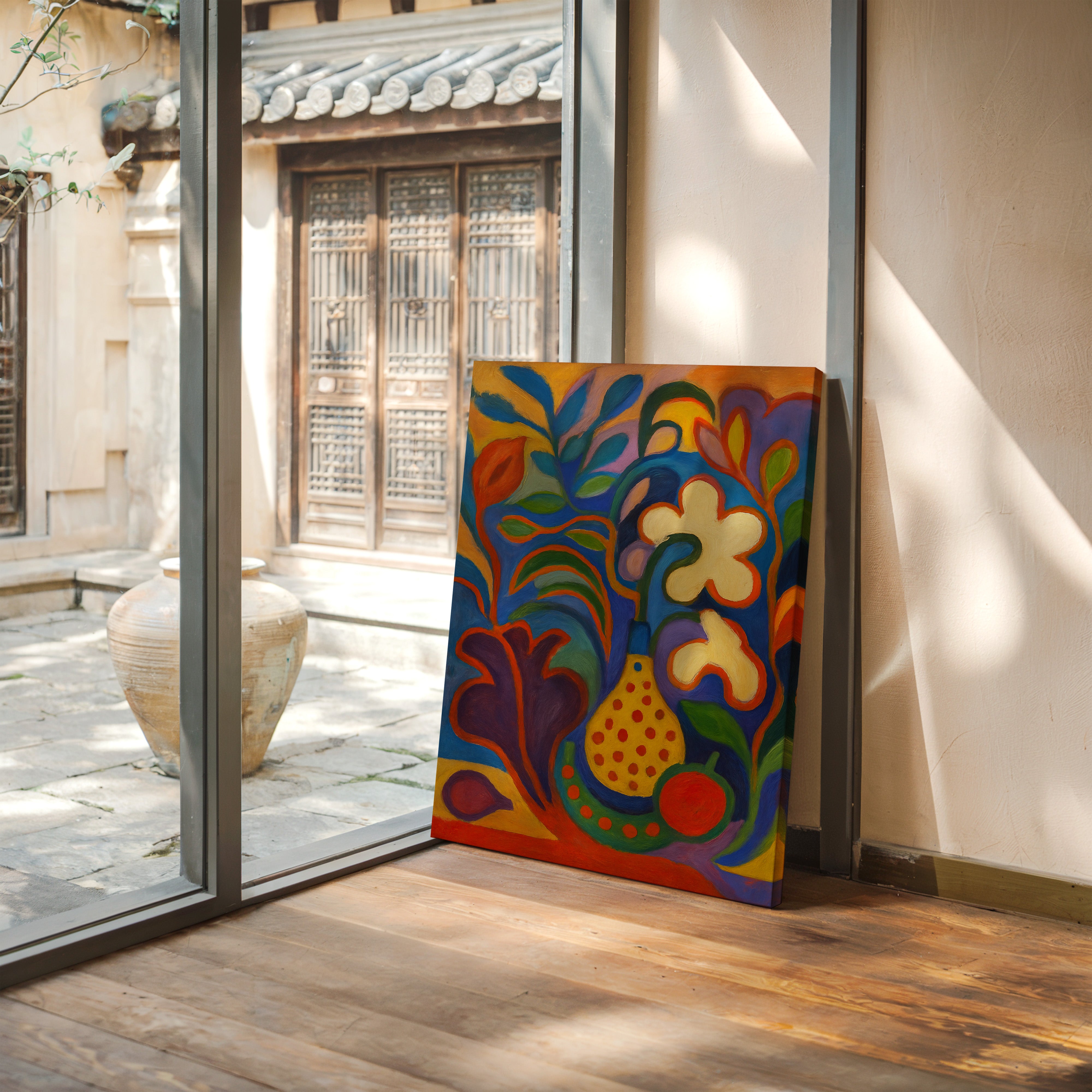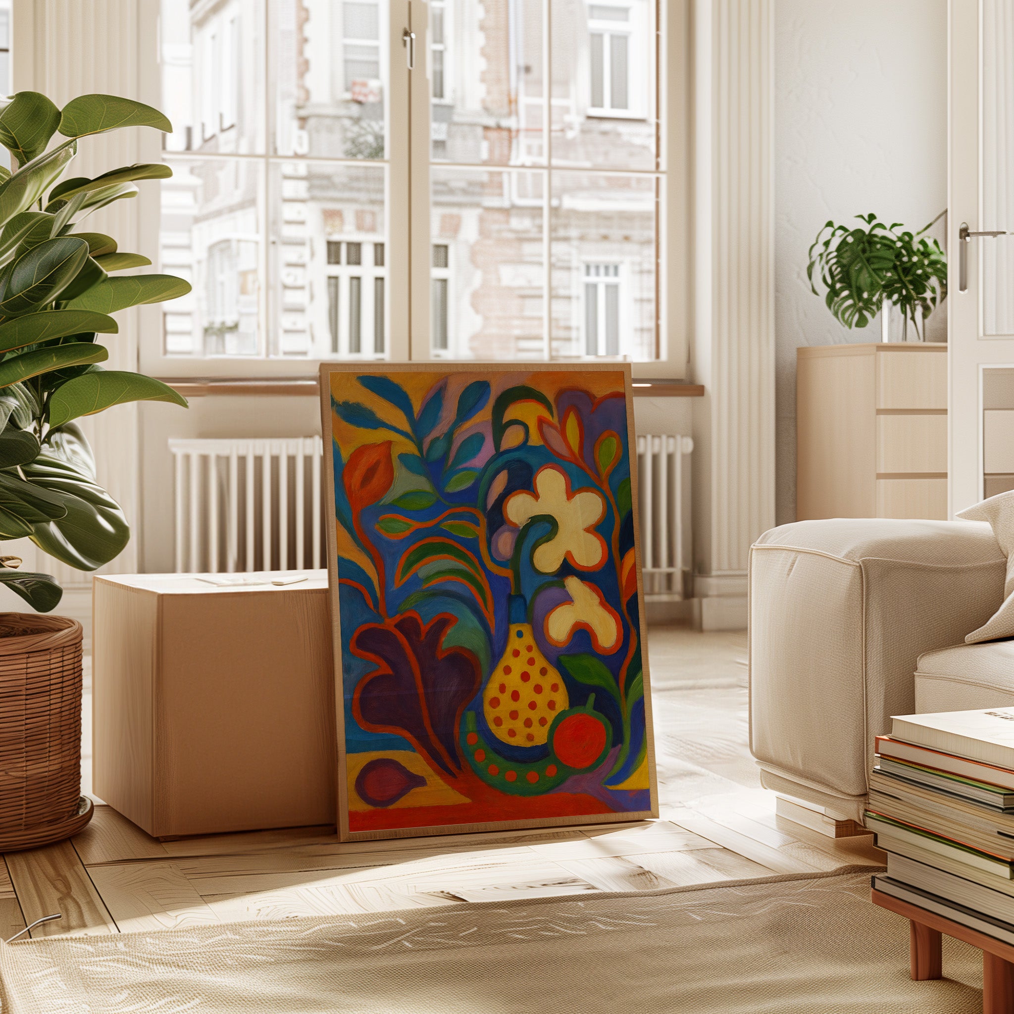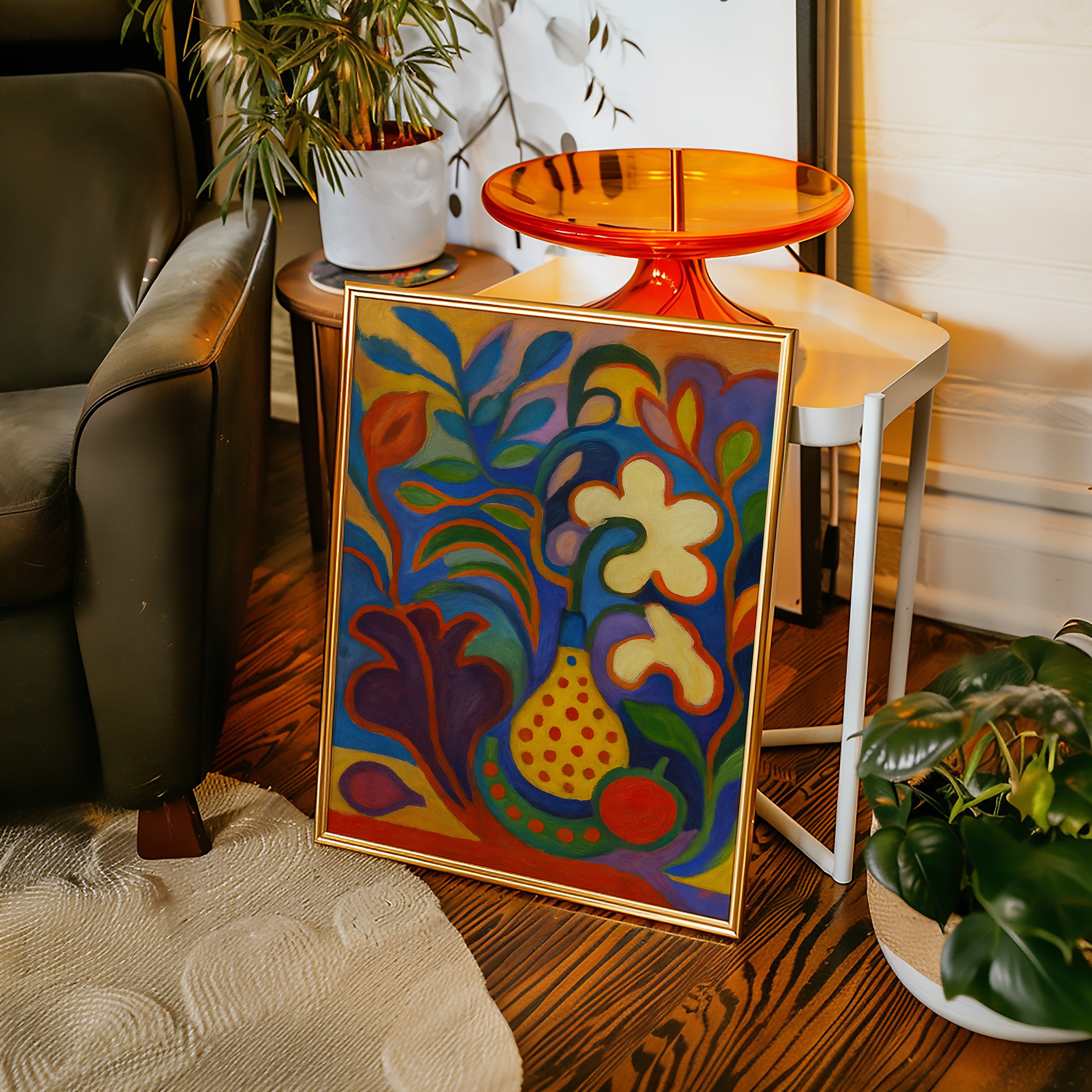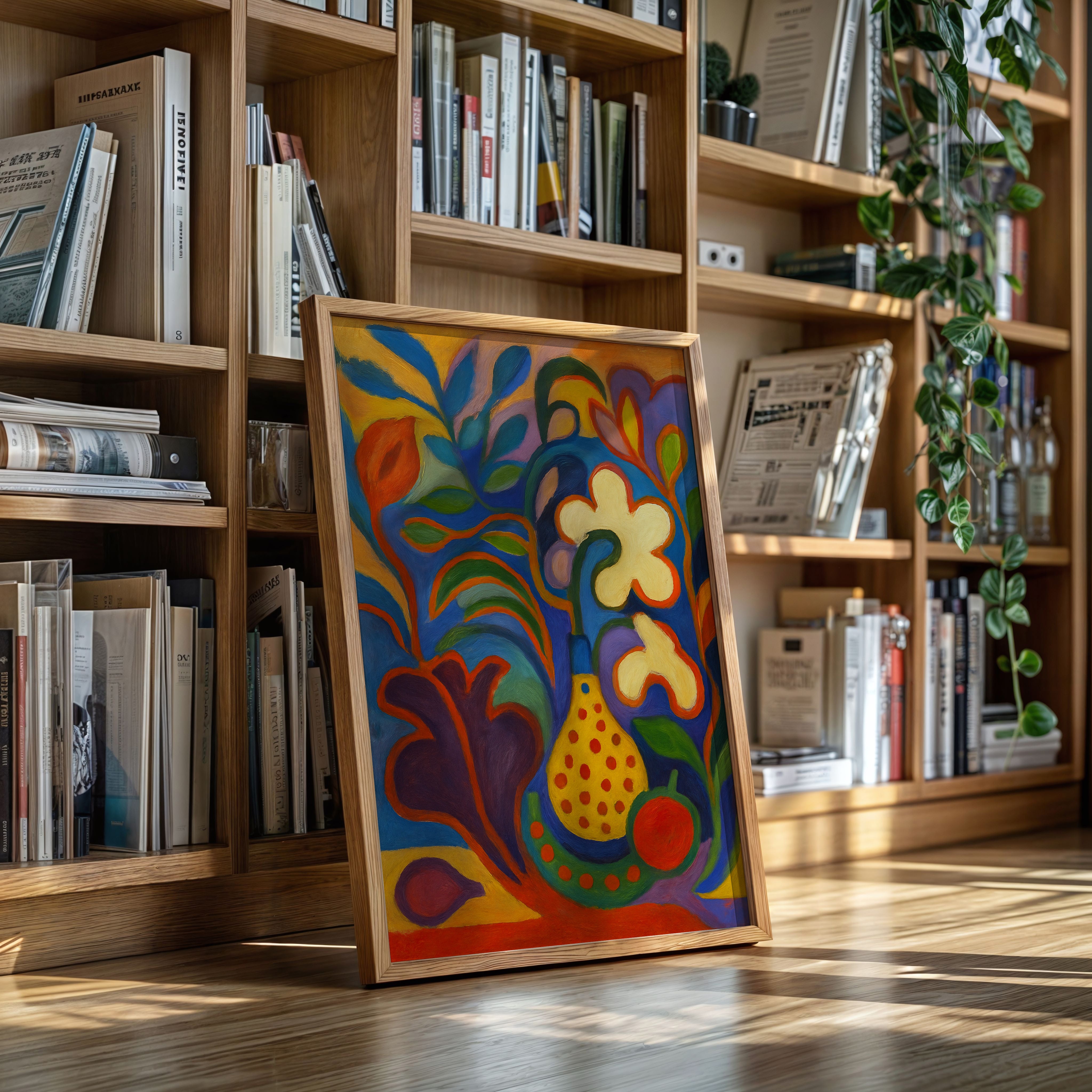 A vibrant celebration of color dances across the canvas, where folk-inspired florals and fruits create a joyful symphony against a deep blue backdrop. Bold shapes intertwine in a playful composition, with a spotted yellow pear and geometric flowers creating a modern take on the traditional still life. The rich palette of cobalt, orange, purple, and emerald green pulses with energy while maintaining a sophisticated balance. This piece brings warmth and whimsy to any contemporary space, perfect for brightening a minimalist bedroom or adding a splash of artistic energy to a dining area.