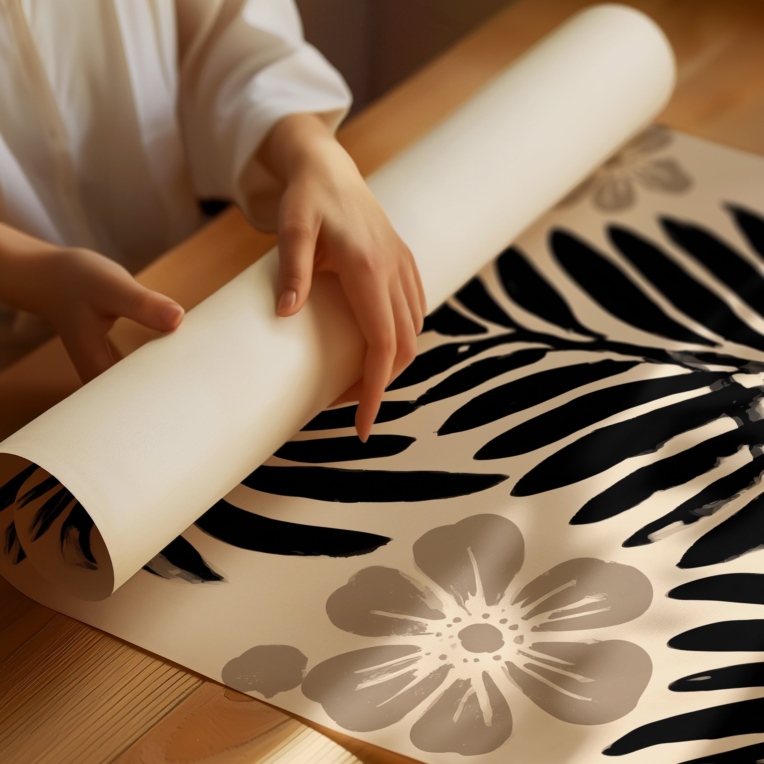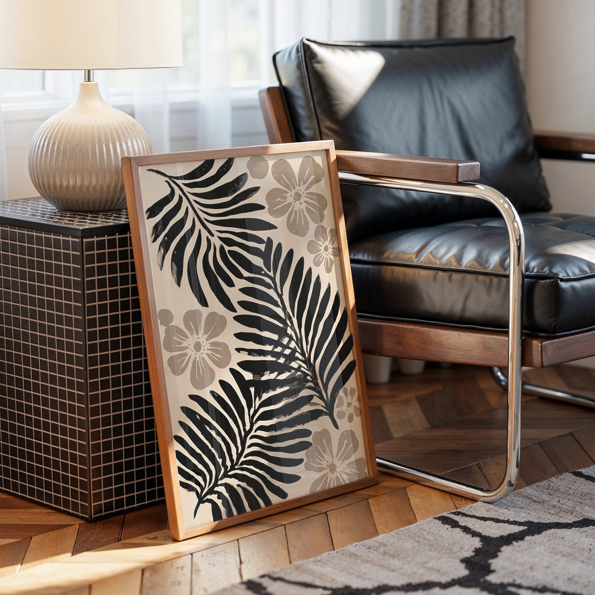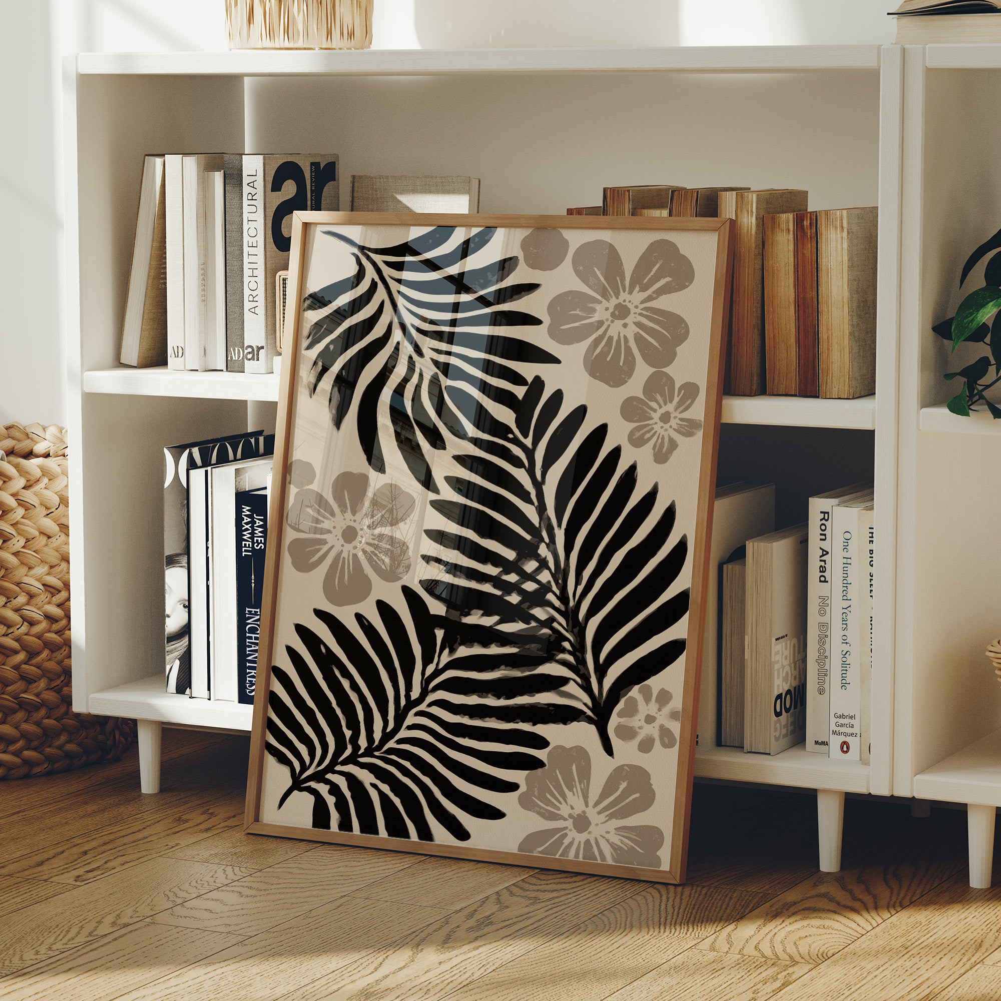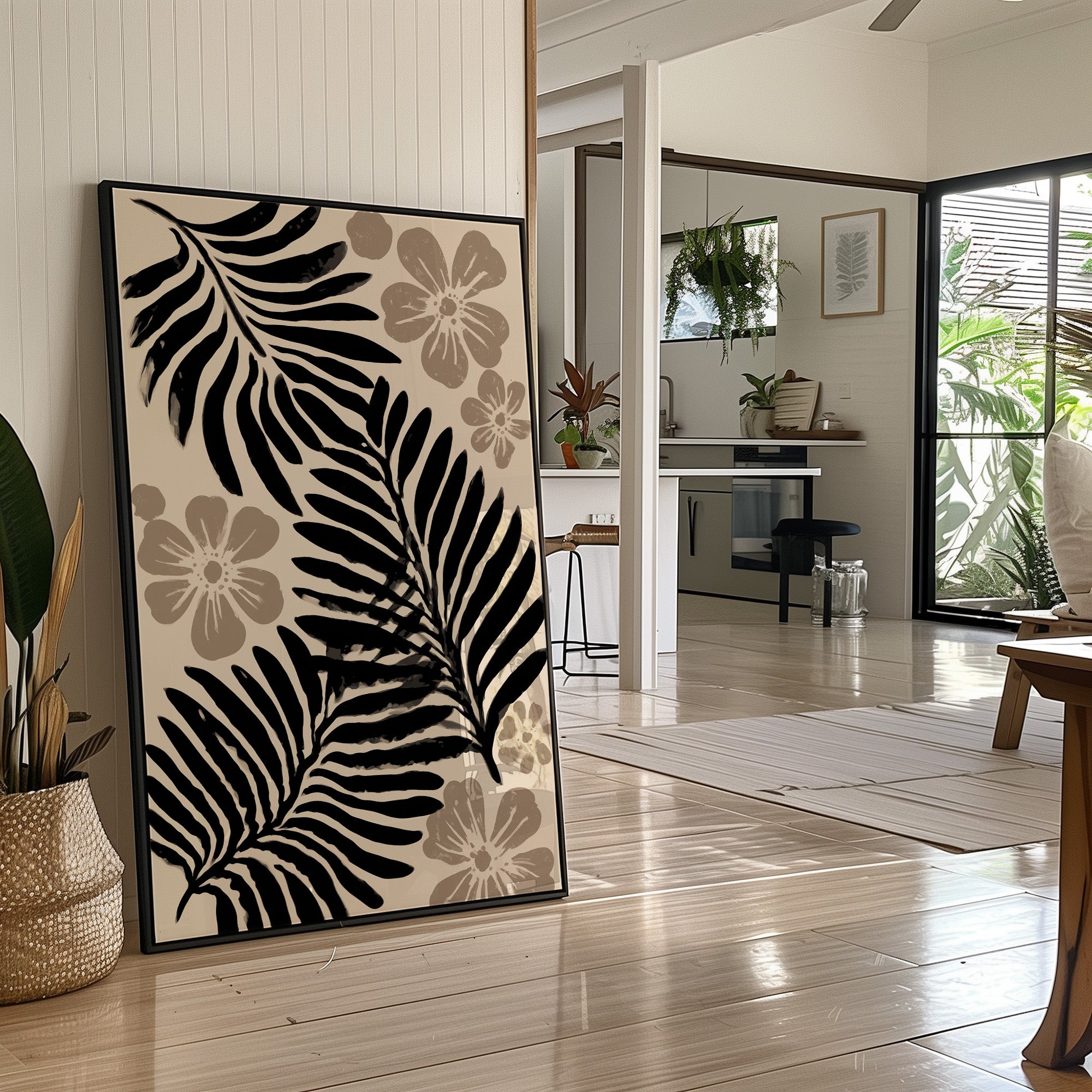 Bold palm fronds cast dramatic shadows against a warm cream backdrop, their black silhouettes dancing with delicate grey blooms. The composition strikes a perfect balance between strength and grace, where structured botanical forms meet soft floral elements in a mesmerizing monochromatic display. This contemporary interpretation of tropical motifs brings sophisticated calm through its refined color palette and clean lines. This piece would elevate a modern bedroom or bring artistic flair to a minimal dining space, its neutral palette complementing both light and dark interior schemes.