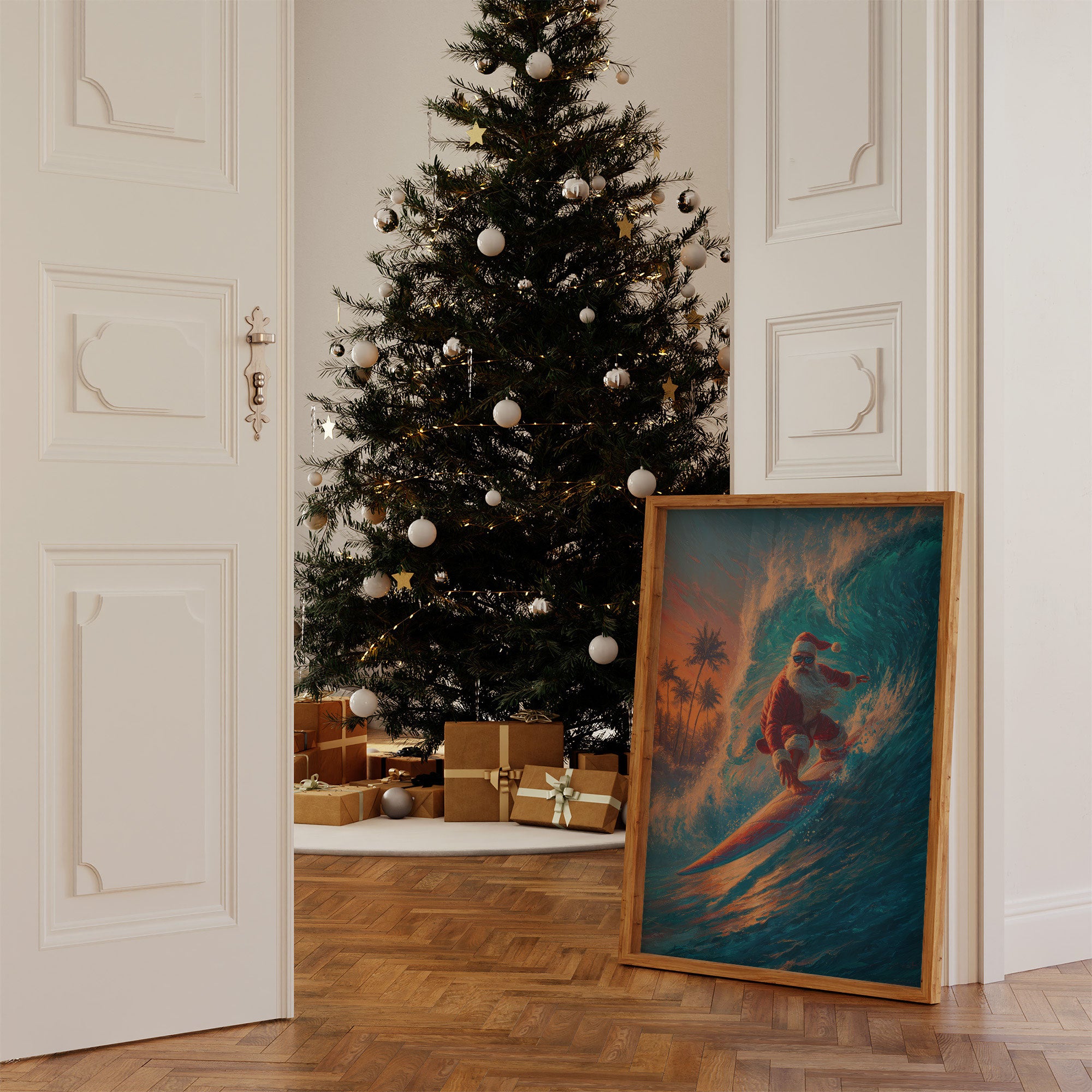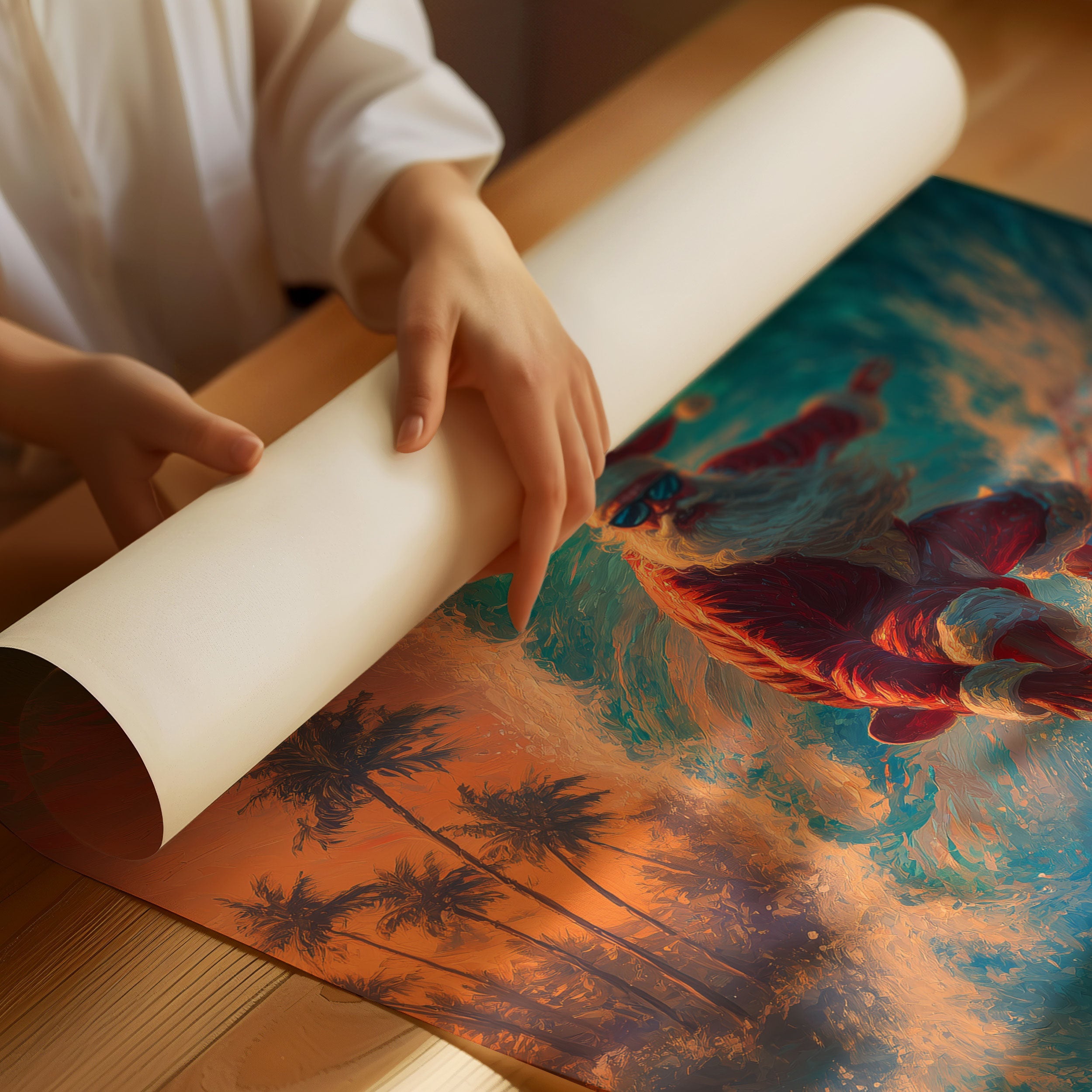 Against a blazing sunset sky, a whimsical scene unfolds as Santa trades his sleigh for a surfboard. Turquoise waves curl dramatically against coral-colored clouds, while palm trees stand sentinel along the horizon. The composition masterfully blends traditional holiday imagery with tropical adventure, creating an unexpected narrative that brings warmth to winter celebrations. This playful piece finds its perfect home in a modern beach house living room or as a surprising holiday accent in a surf-inspired space.