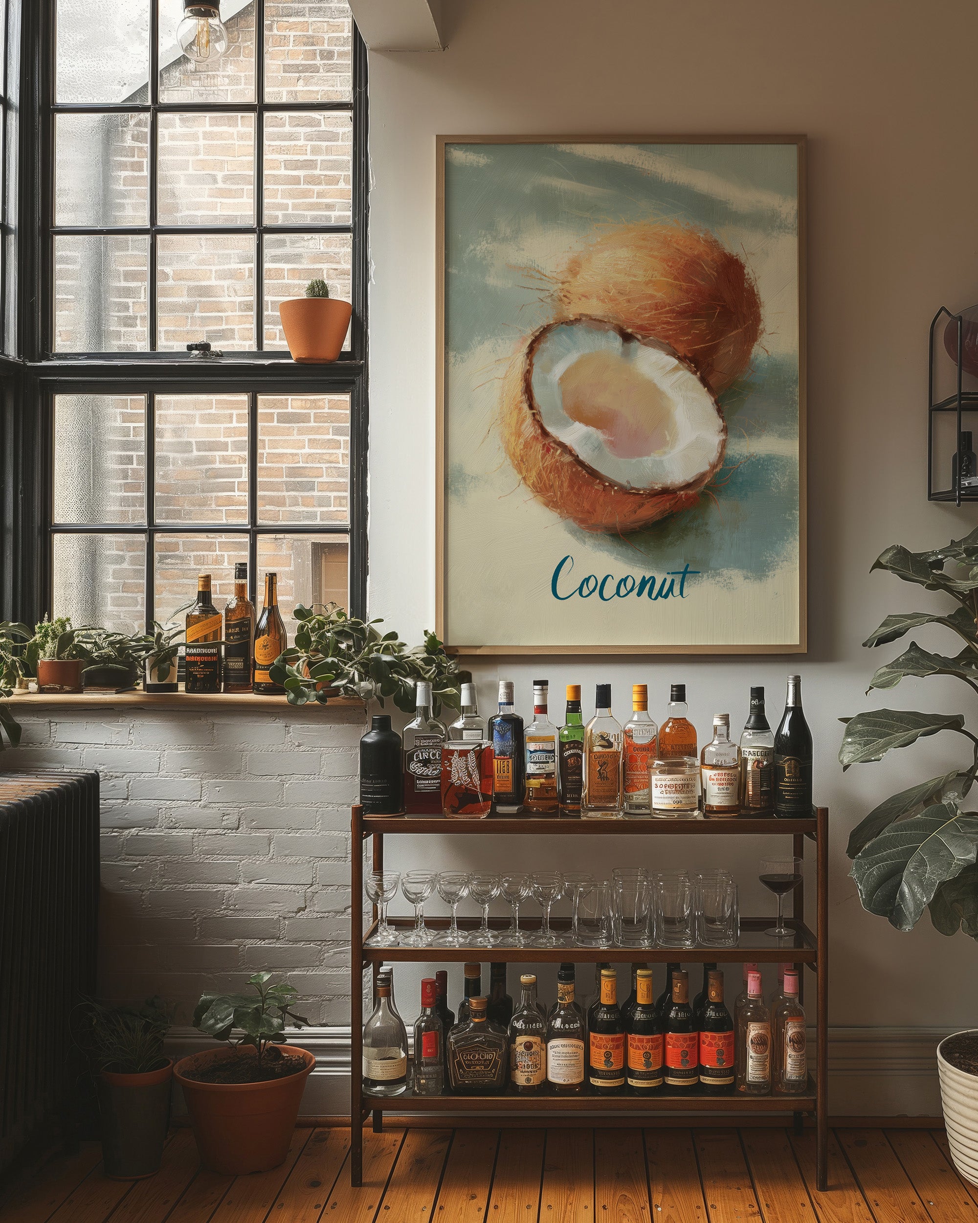 Rich, warm browns of the coconut's fibrous shell contrasting with the creamy white flesh inside, all set against a soft teal background that evokes tropical waters. The simple word "Coconut" appears in a flowing teal script at the bottom of the canvas.