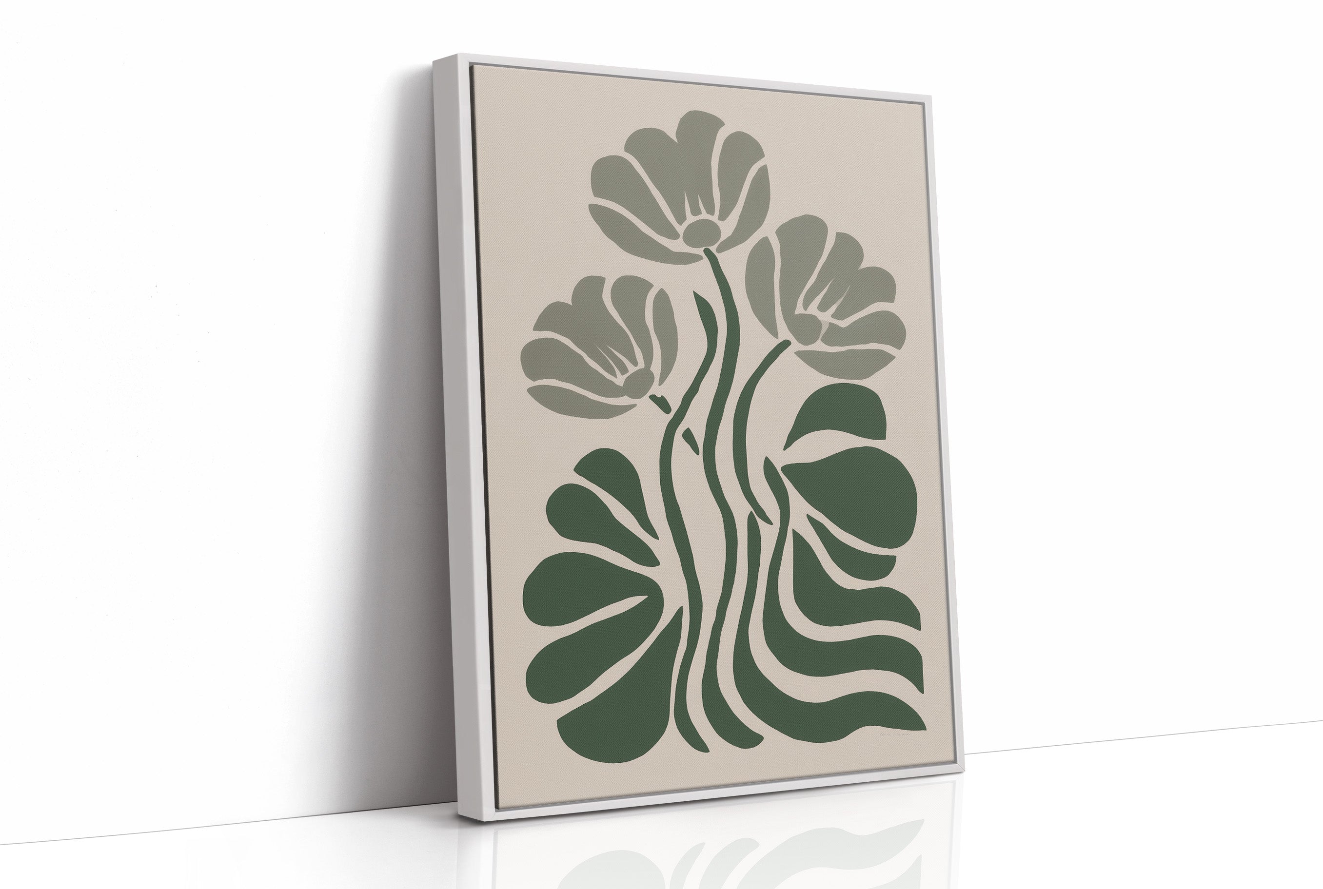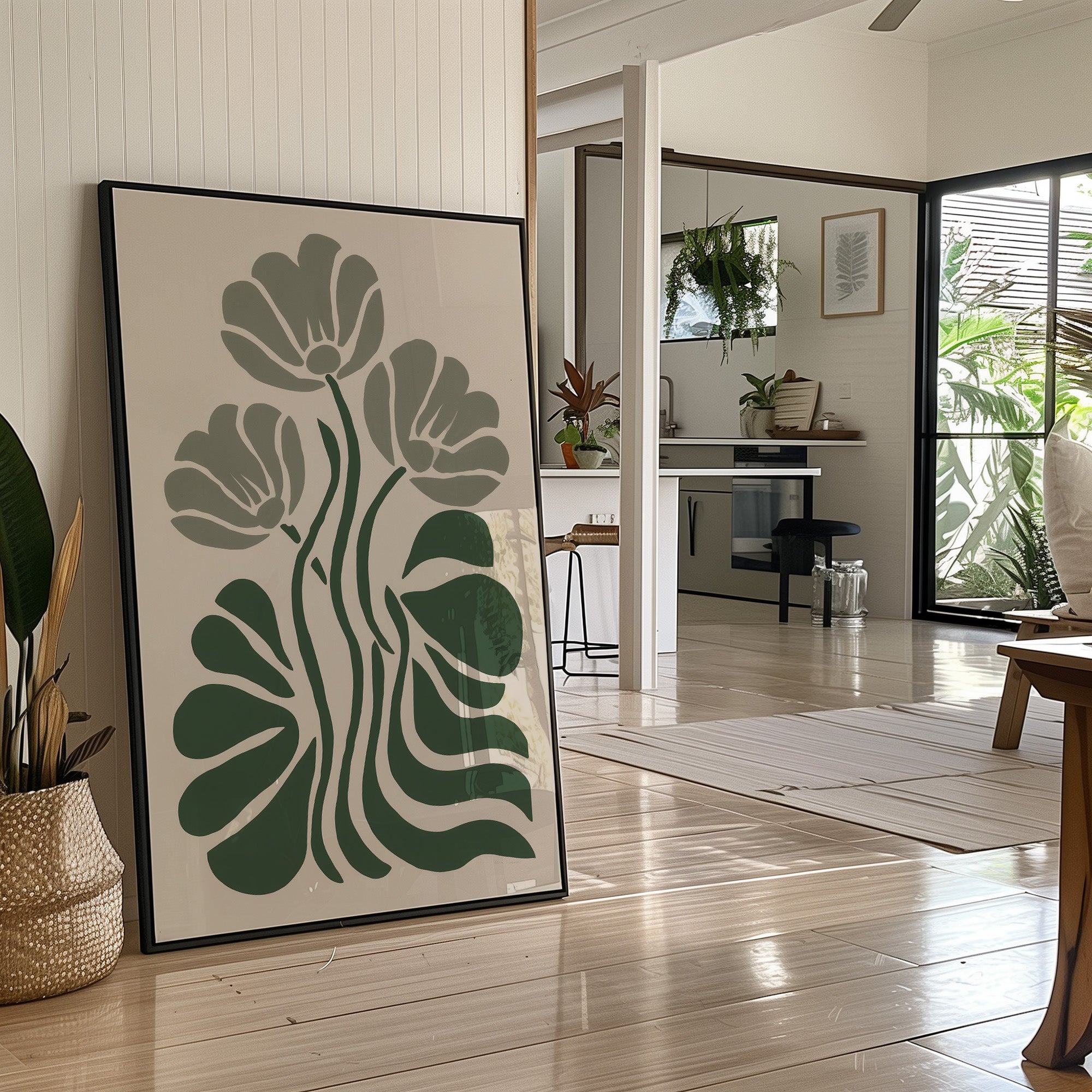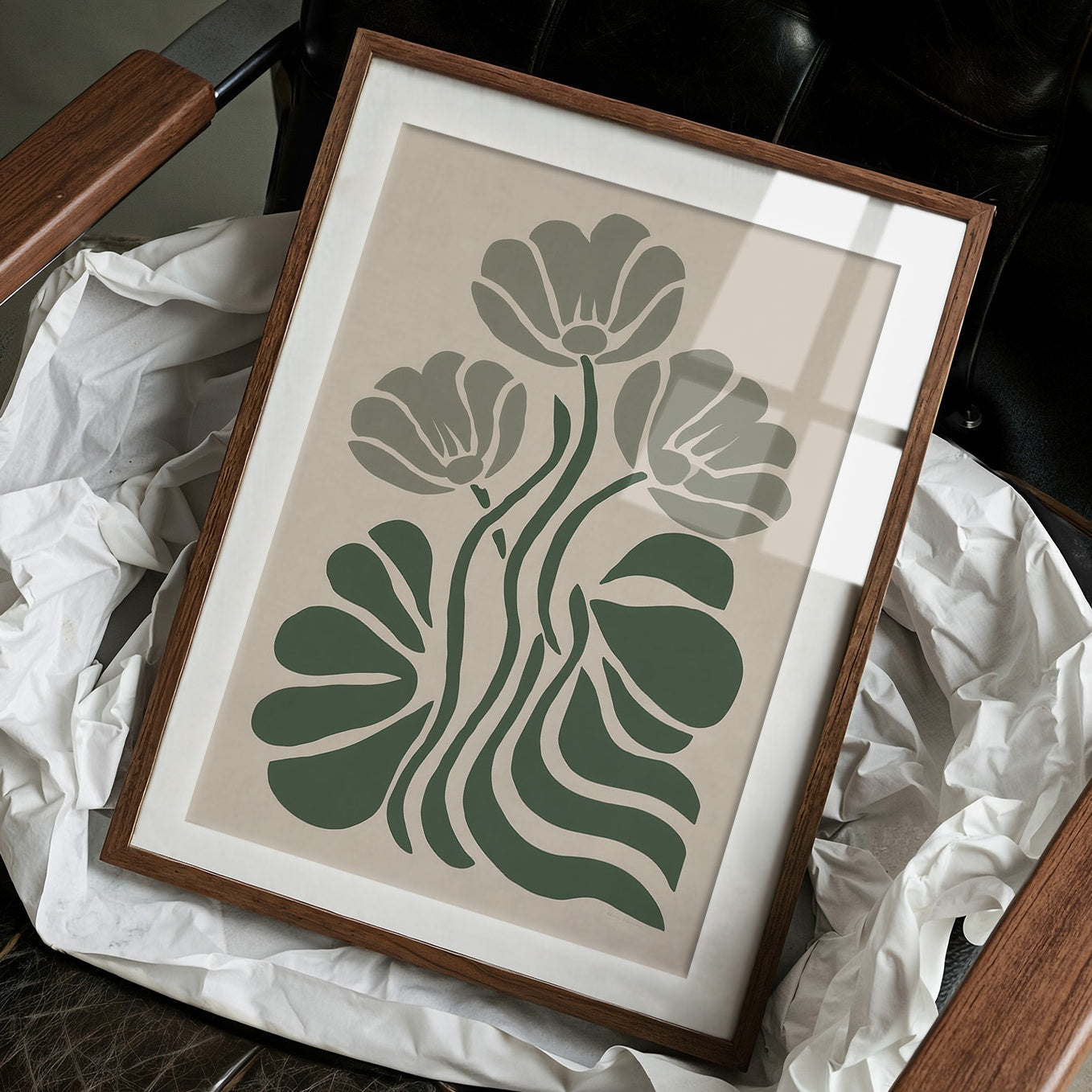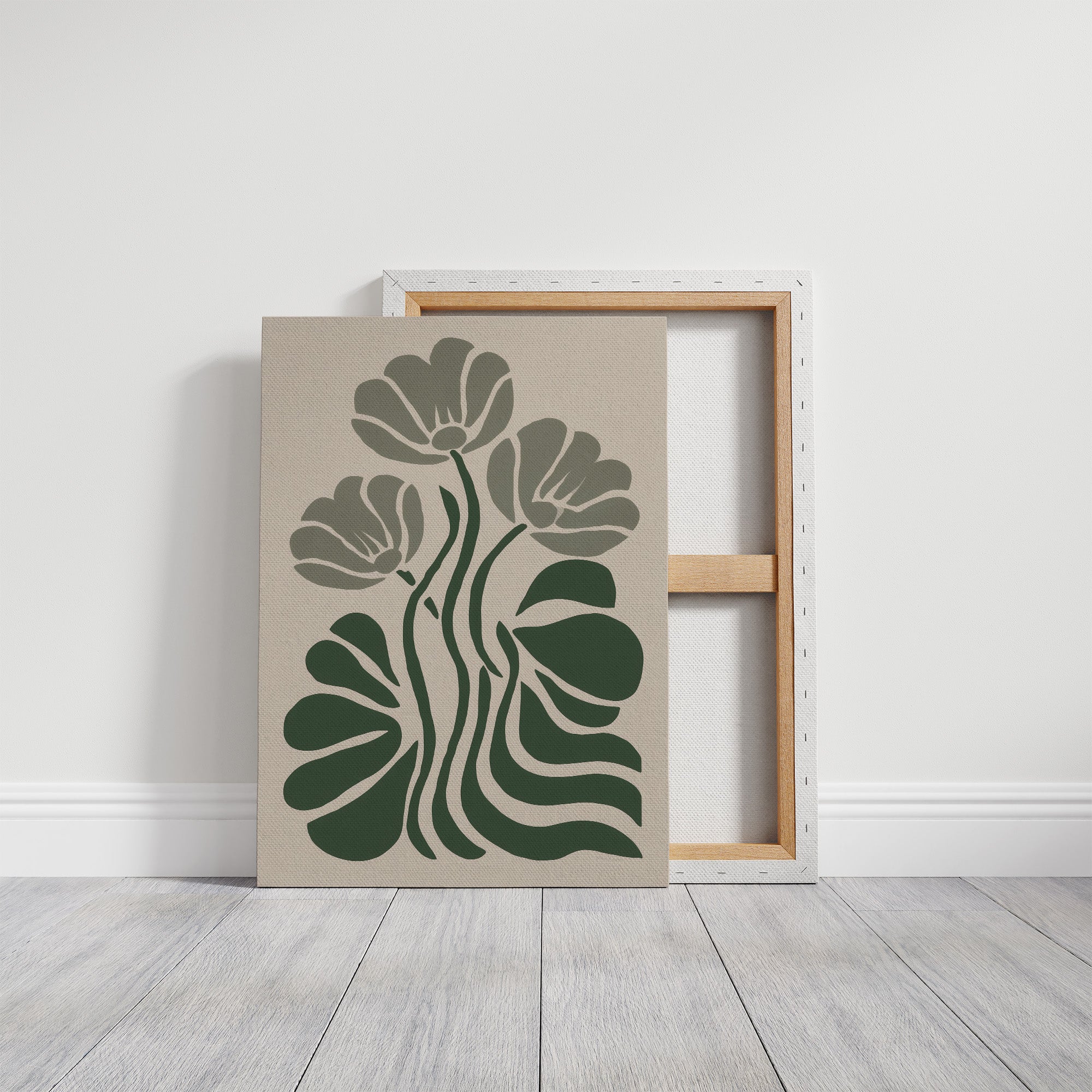 Three elegant tulip blooms emerge in a graceful upward sweep, their petals rendered in soft sage against a peaceful cream background. The minimalist composition creates a mesmerizing balance between negative space and organic form, where curved stems support blooms that appear to sway in an invisible breeze. This contemporary botanical illustration captures the essence of modern simplicity while celebrating nature's inherent geometry. Perfect for spaces that embrace clean lines and organic shapes, this piece would bring sophisticated serenity to a minimal dining room or add artistic harmony to a modern home office.