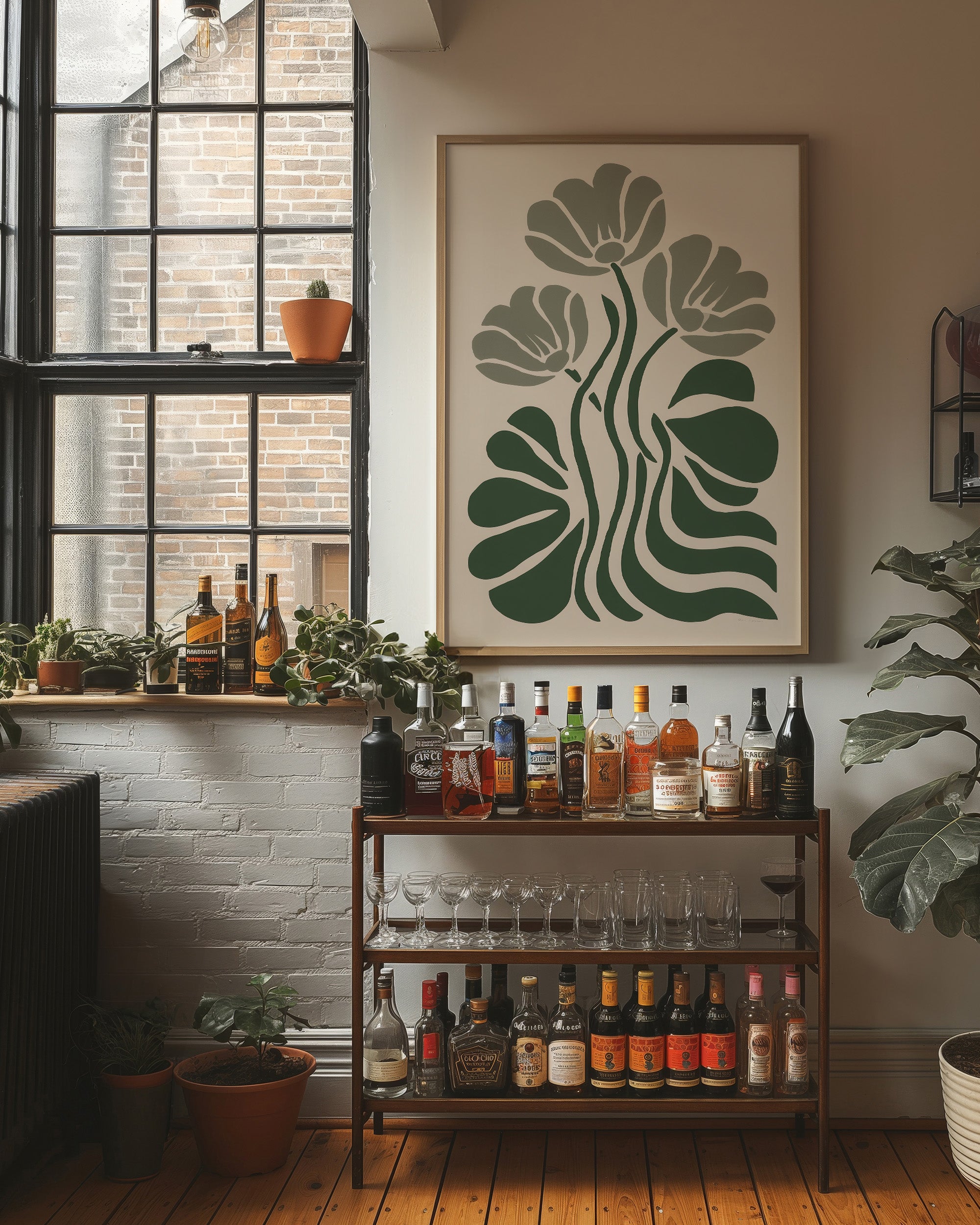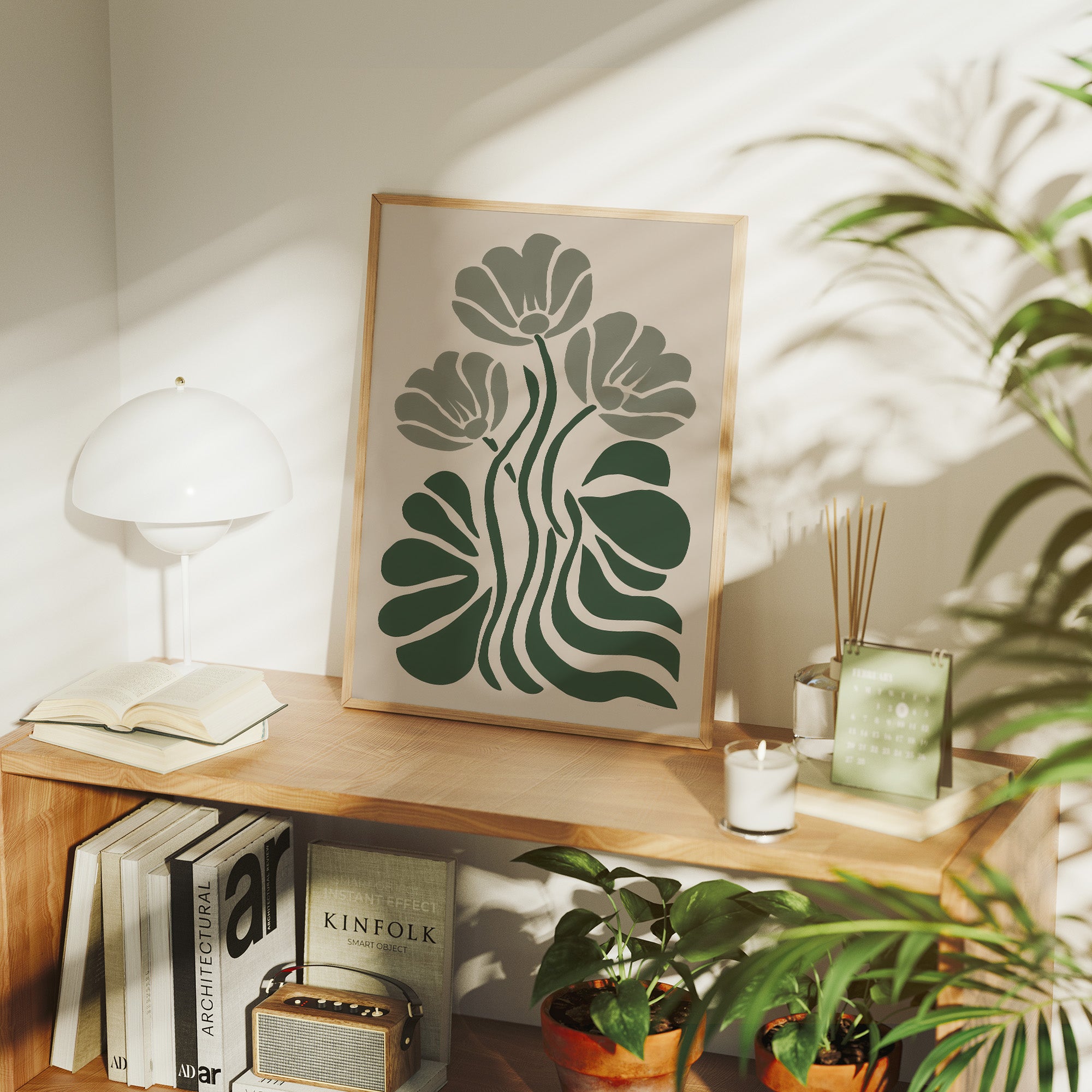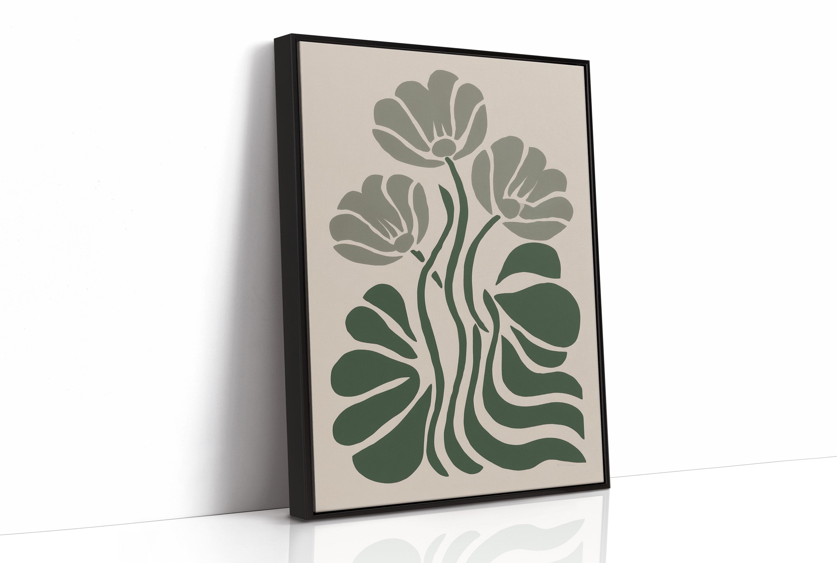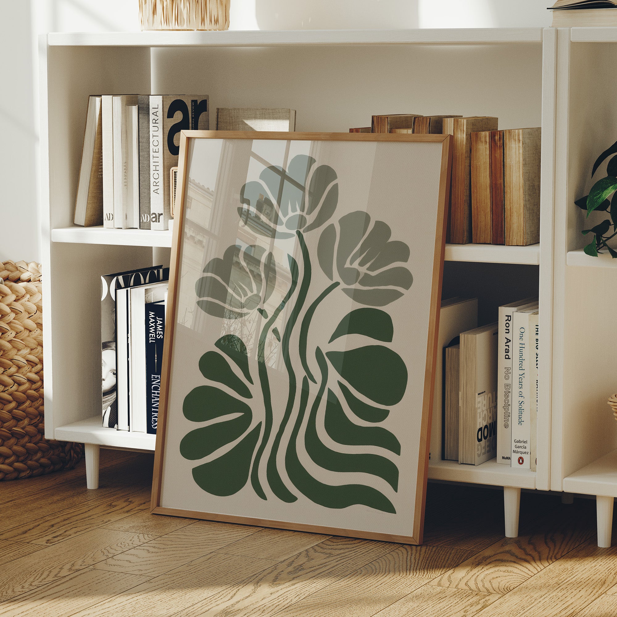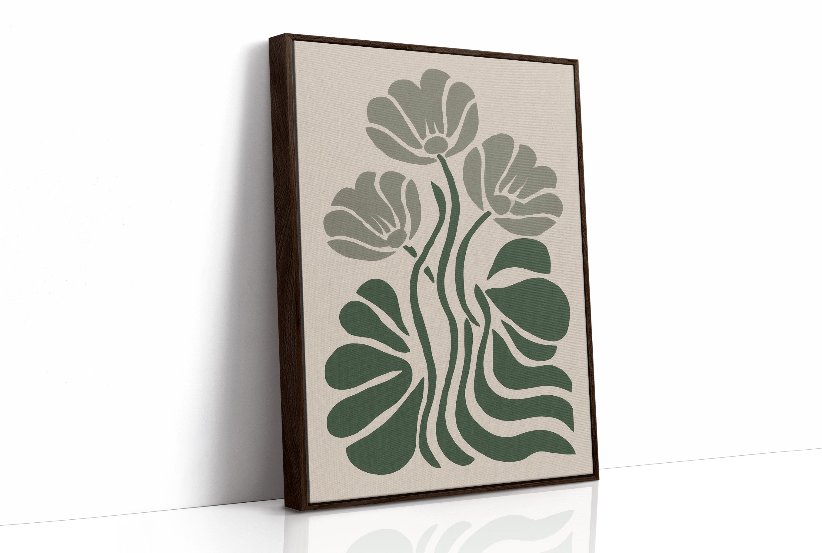 Three elegant tulip blooms emerge in a graceful upward sweep, their petals rendered in soft sage against a peaceful cream background. The minimalist composition creates a mesmerizing balance between negative space and organic form, where curved stems support blooms that appear to sway in an invisible breeze. This contemporary botanical illustration captures the essence of modern simplicity while celebrating nature's inherent geometry. Perfect for spaces that embrace clean lines and organic shapes, this piece would bring sophisticated serenity to a minimal dining room or add artistic harmony to a modern home office.