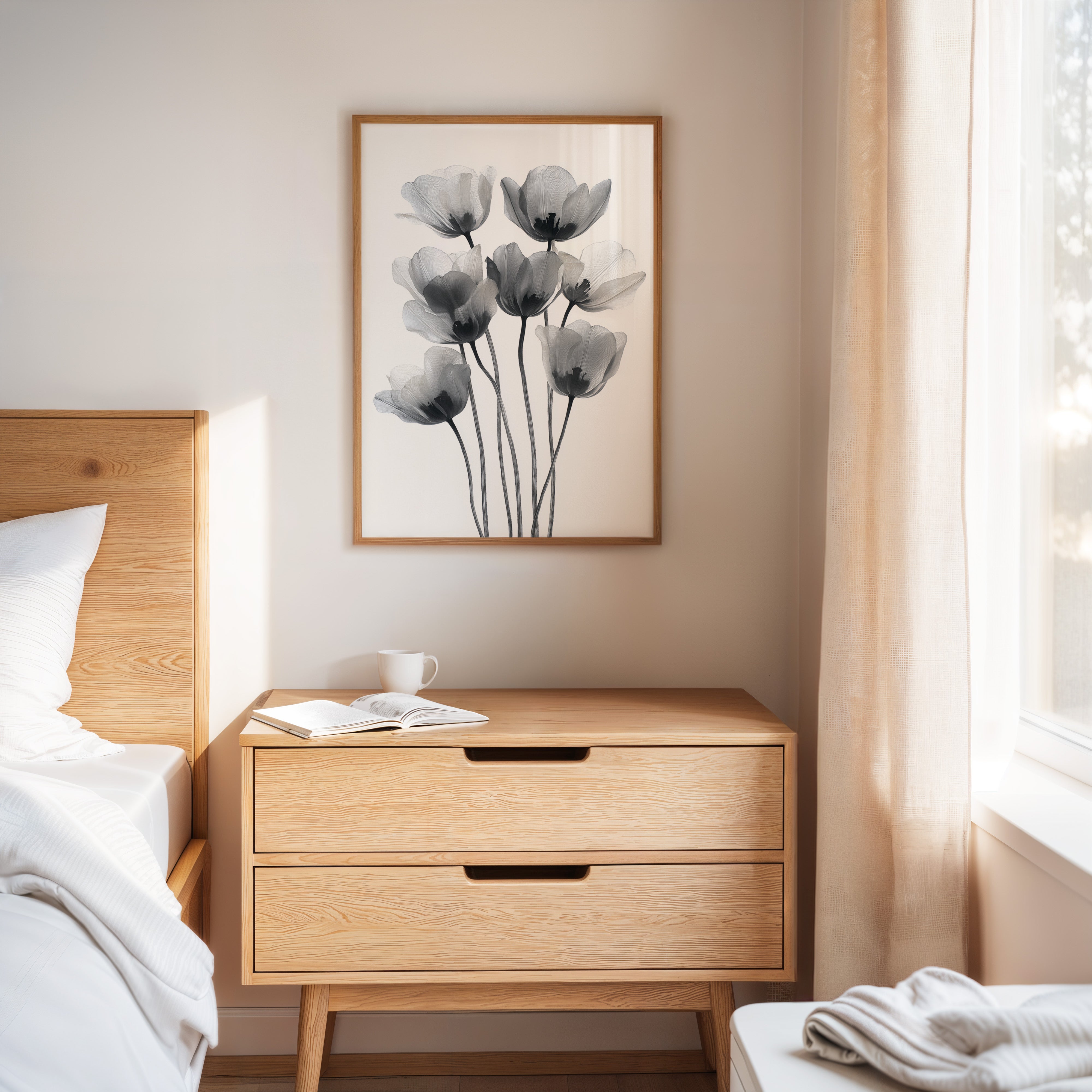 Delicate petals catch the morning light, transforming simple flowers into ethereal dancers frozen in time. These translucent tulips reveal their inner architecture through gentle gradients of gray and white, their stems reaching gracefully upward like nature's own calligraphy. The monochromatic palette highlights every vein and fold, creating an intimate portrait of botanical elegance that speaks to both strength and fragility. Perfect for modern spaces seeking sophisticated tranquility, this piece brings a touch of timeless grace to minimal interiors.