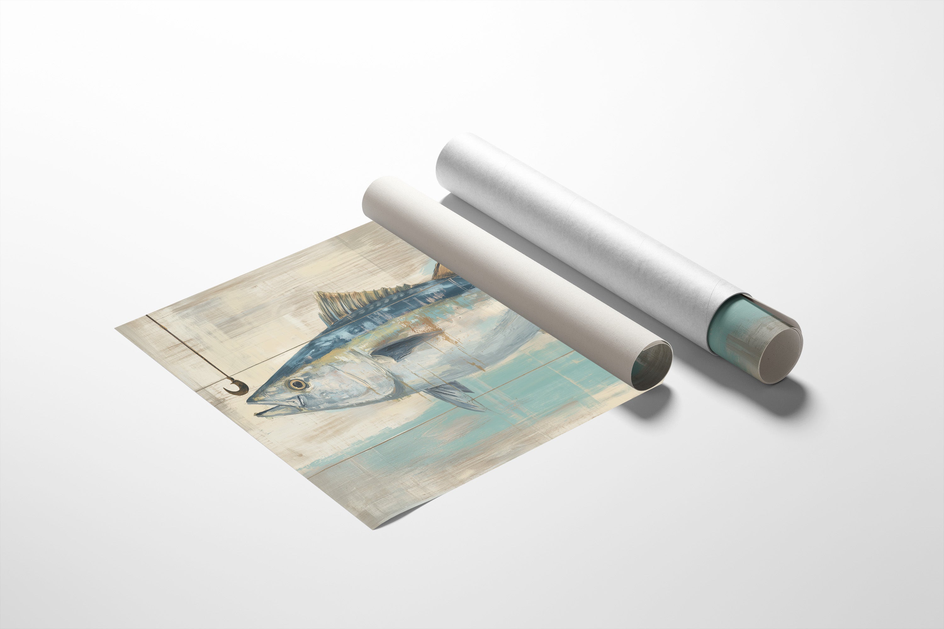 Cool blues and weathered textures capture the powerful grace of a tuna suspended in its aquatic element. The brushstrokes create a sense of movement, as if the fish might dart forward at any moment, while the distressed background evokes the timeless relationship between coastal communities and the sea. This contemporary marine portrait balances artistic expression with natural detail, celebrating the beauty of oceanic life. This statement piece brings serene coastal energy to dining rooms, beach houses, or any space where you wish to invite the calming presence of water and maritime heritage.