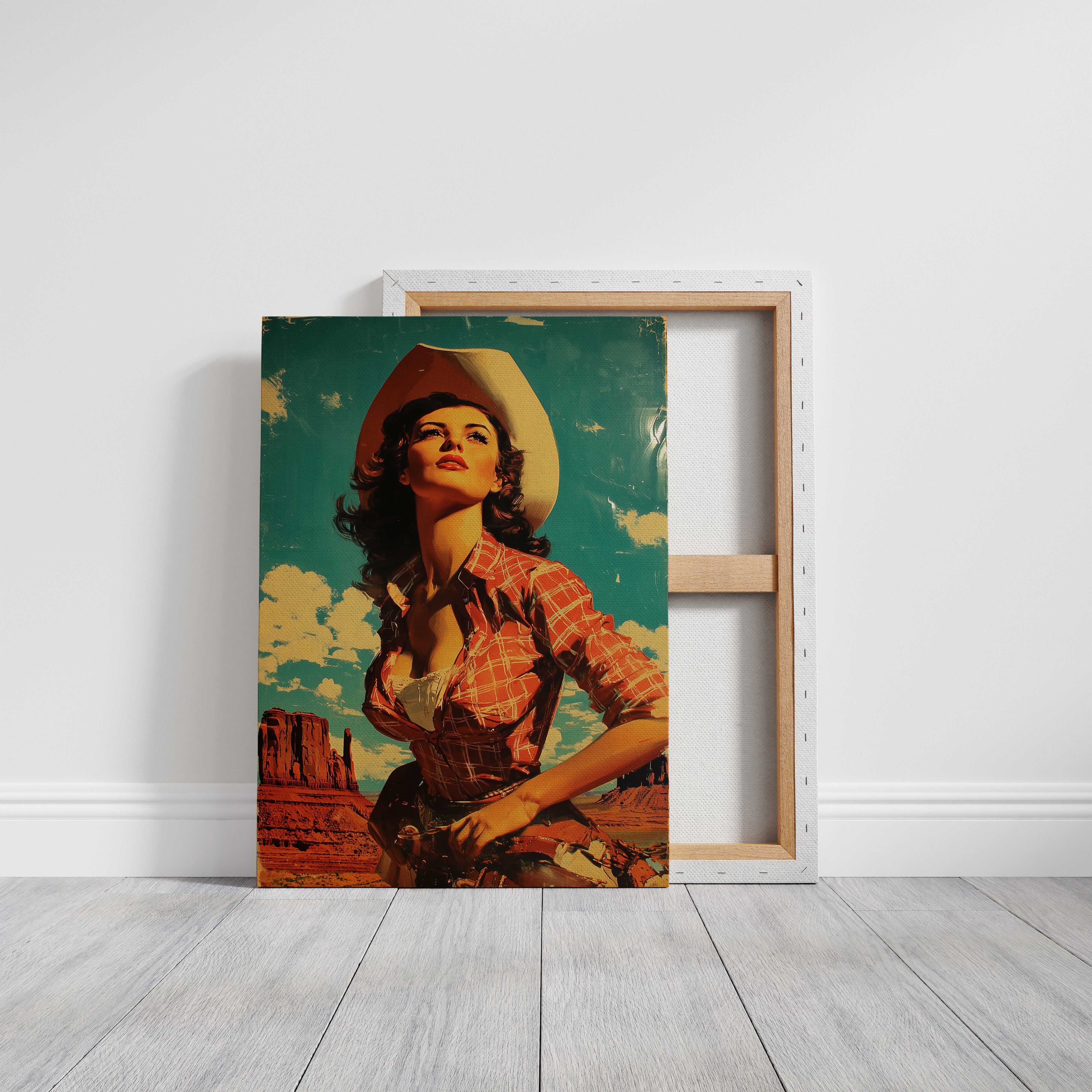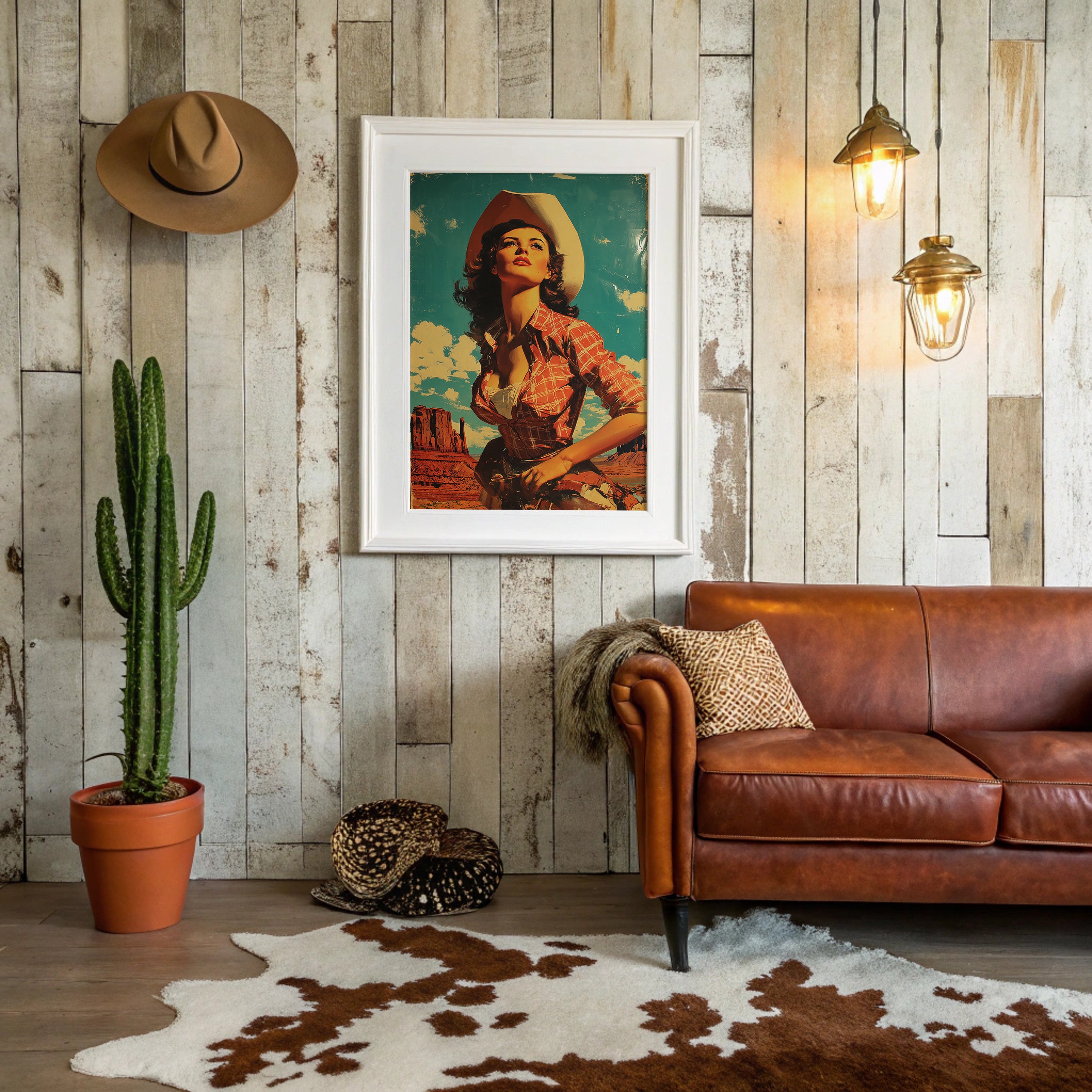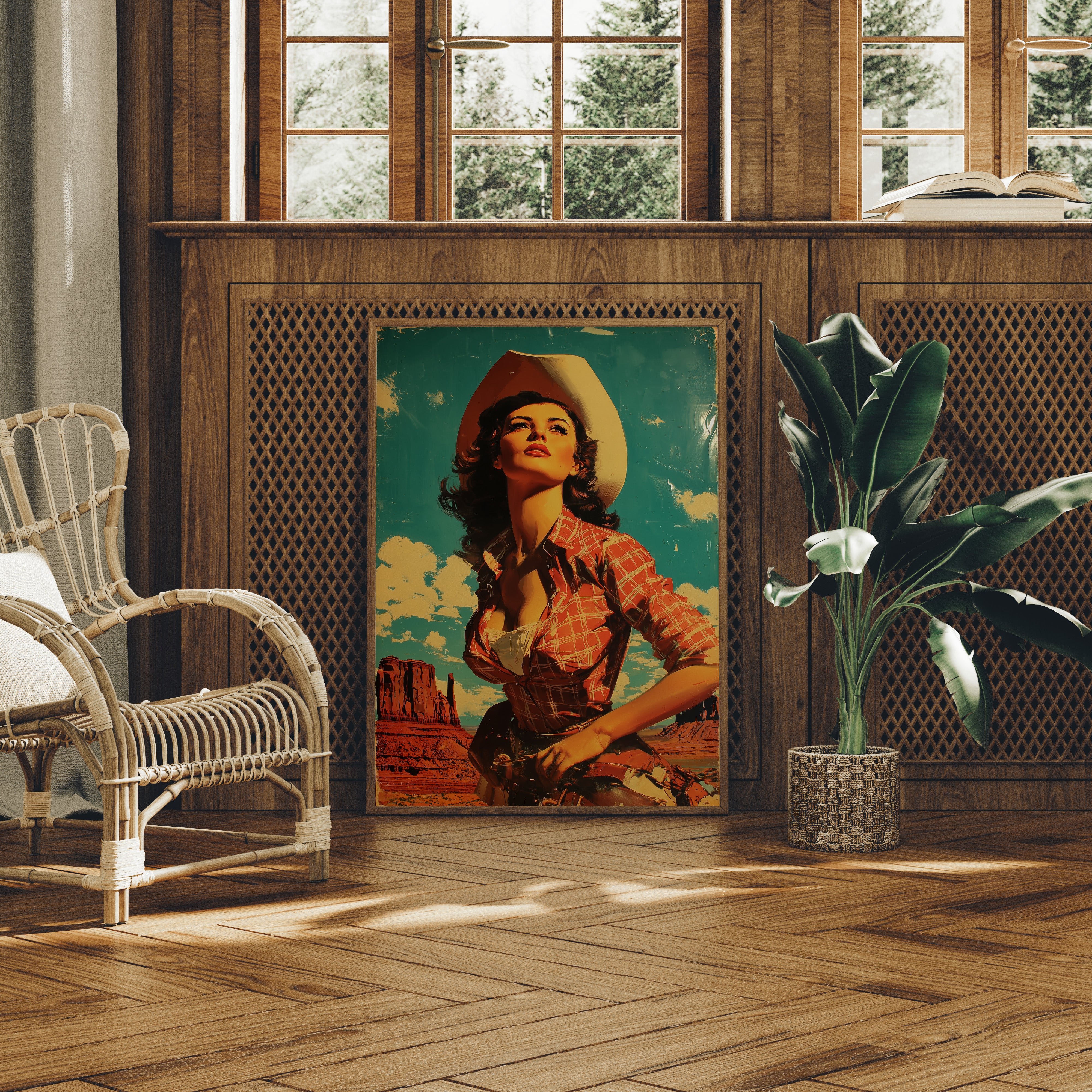 Sunlight catches on the brim of a white cowboy hat, casting golden shadows across determined eyes fixed on distant horizons. This contemporary western piece captures the bold spirit of vintage Americana with a modern twist. Rich turquoise skies frame a portrait of fierce independence, while warm desert tones and weathered textures tell stories of wild frontiers and untamed landscapes. The composition masterfully balances nostalgia with fresh energy, creating a powerful statement of western heritage reimagined. Perfect for adding character to a modern ranch house, rustic office space, or any room seeking to capture that independent western spirit. The image invites viewers to connect with an enduring legacy of adventure and determination.