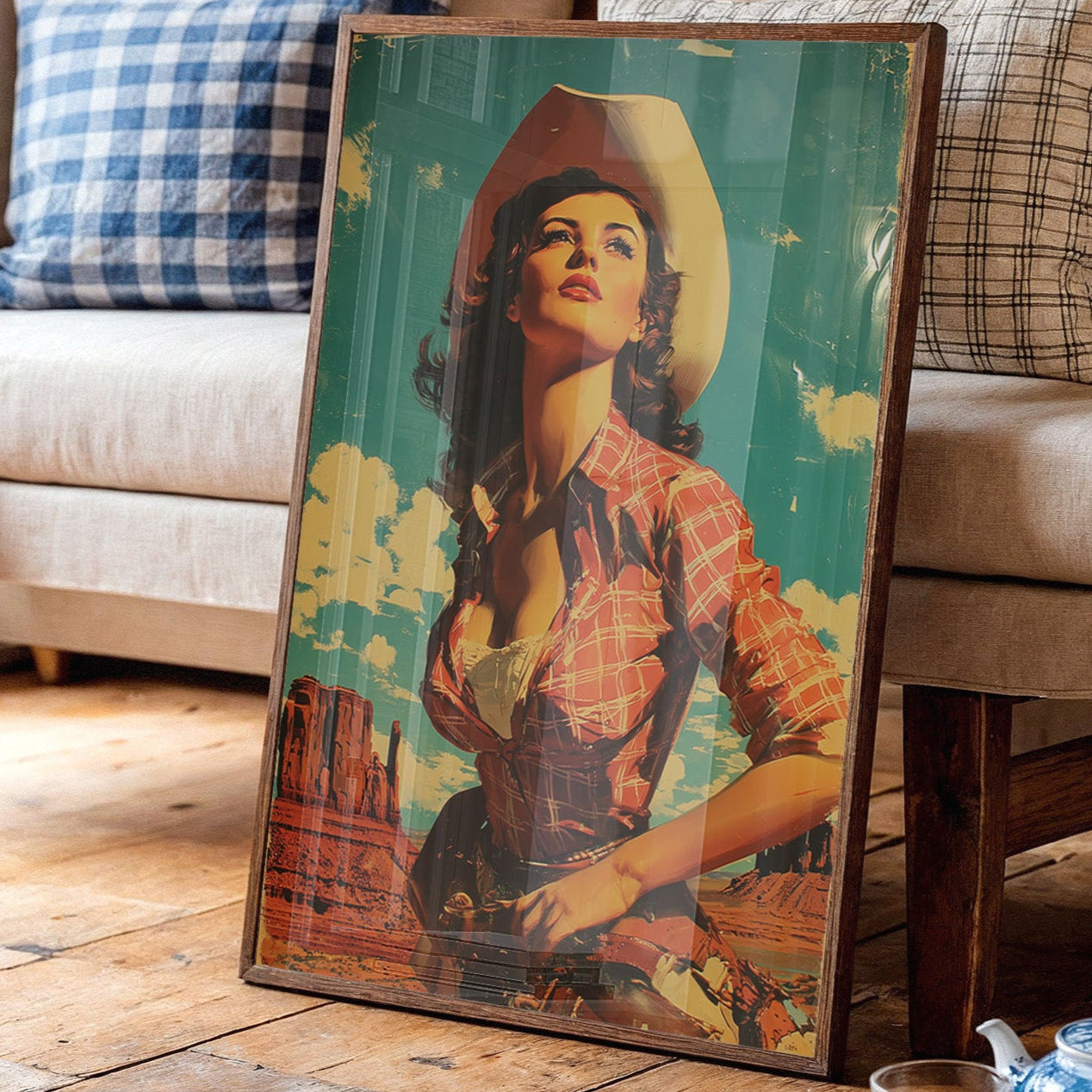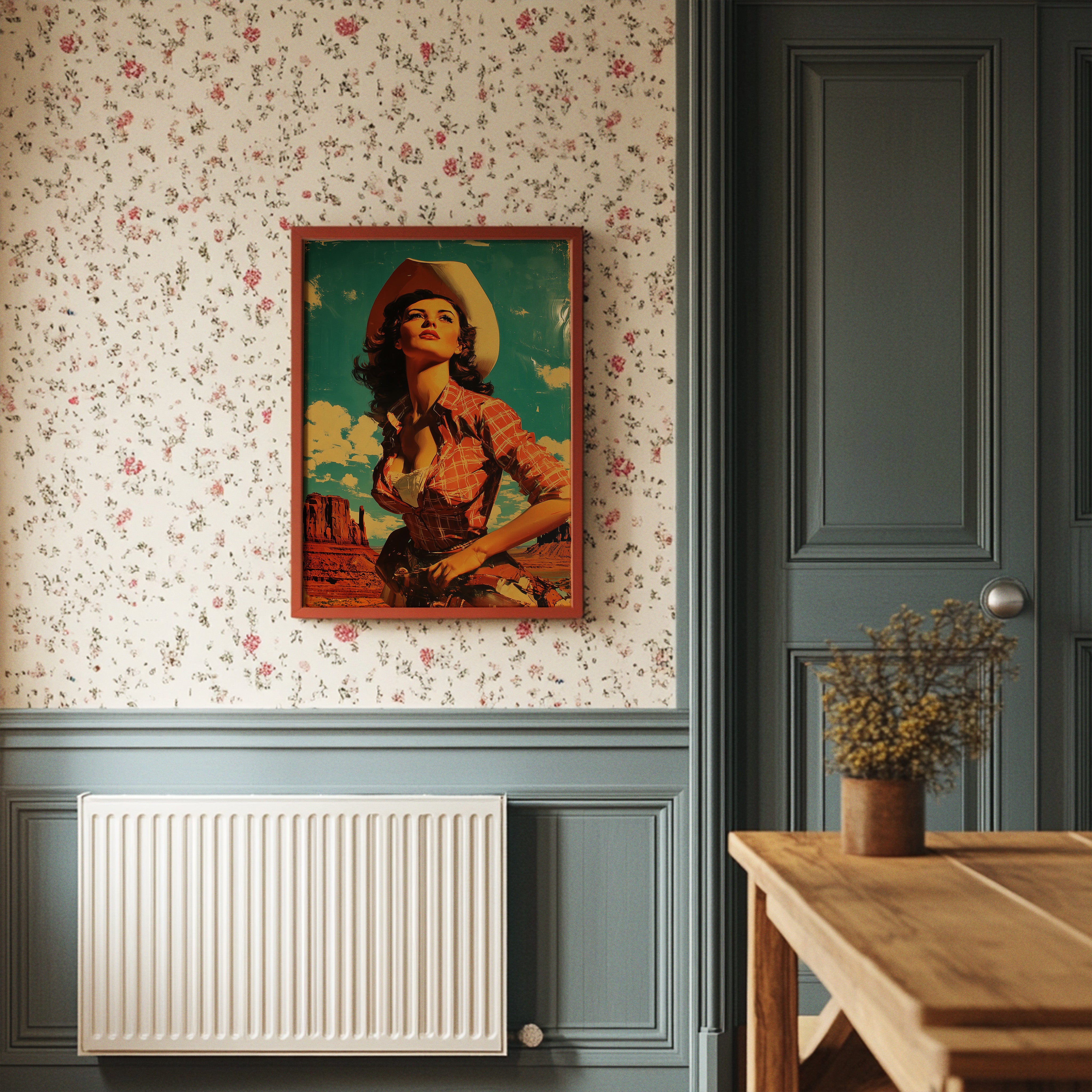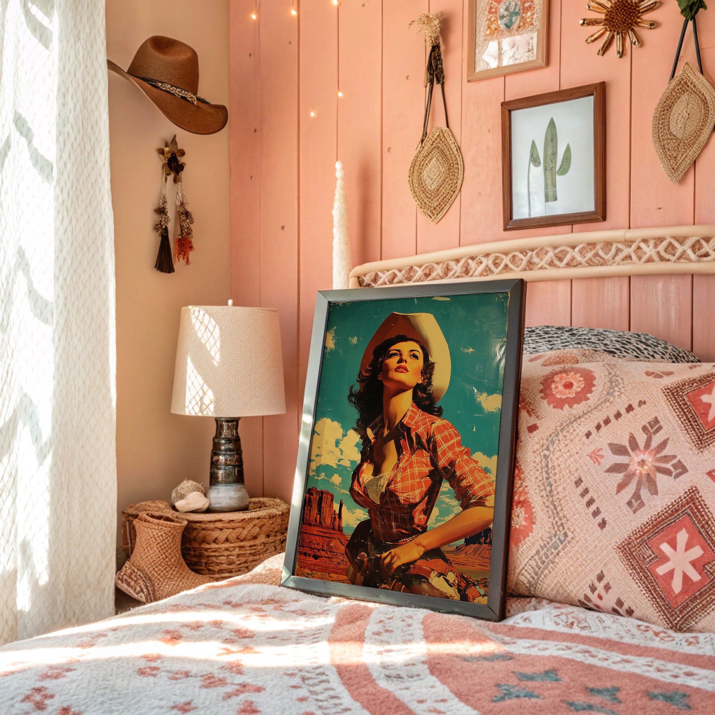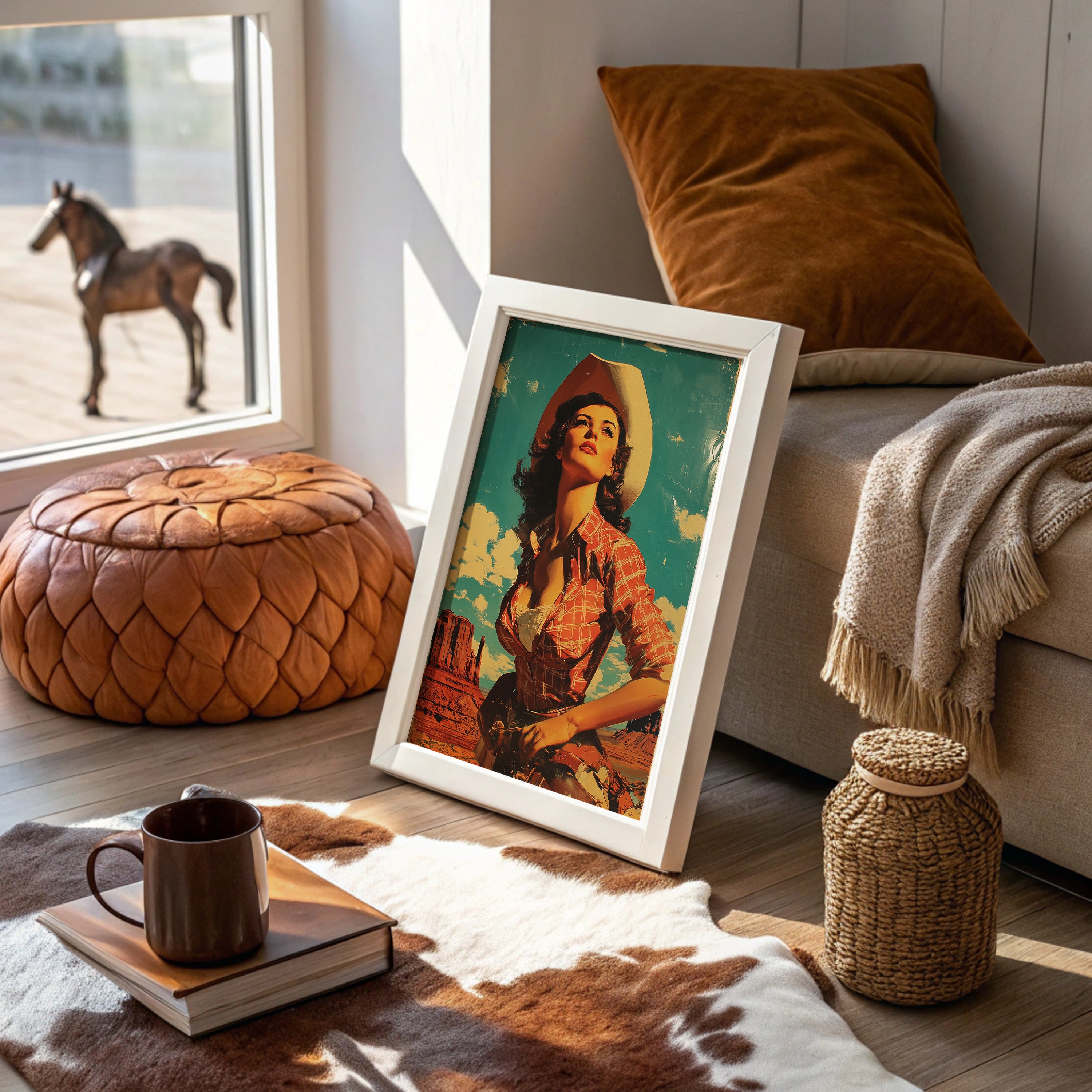 Sunlight catches on the brim of a white cowboy hat, casting golden shadows across determined eyes fixed on distant horizons. This contemporary western piece captures the bold spirit of vintage Americana with a modern twist. Rich turquoise skies frame a portrait of fierce independence, while warm desert tones and weathered textures tell stories of wild frontiers and untamed landscapes. The composition masterfully balances nostalgia with fresh energy, creating a powerful statement of western heritage reimagined. Perfect for adding character to a modern ranch house, rustic office space, or any room seeking to capture that independent western spirit. The image invites viewers to connect with an enduring legacy of adventure and determination.