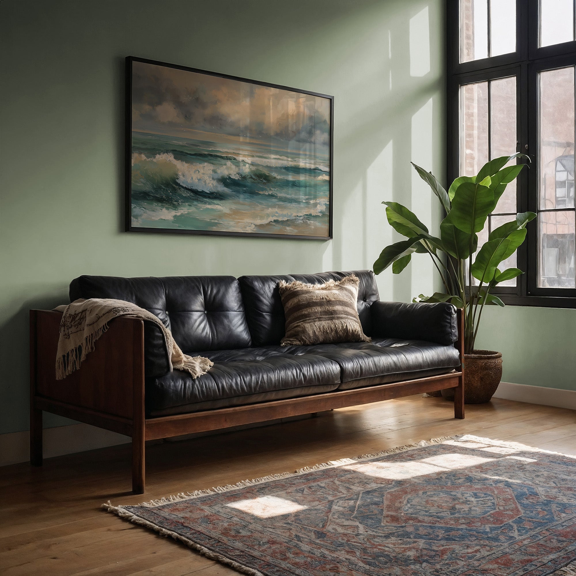 Your artwork should take up 60-75% of wall space above furniture. For standard sofas, choose 24"x36" or larger. When in doubt, go slightly bigger.