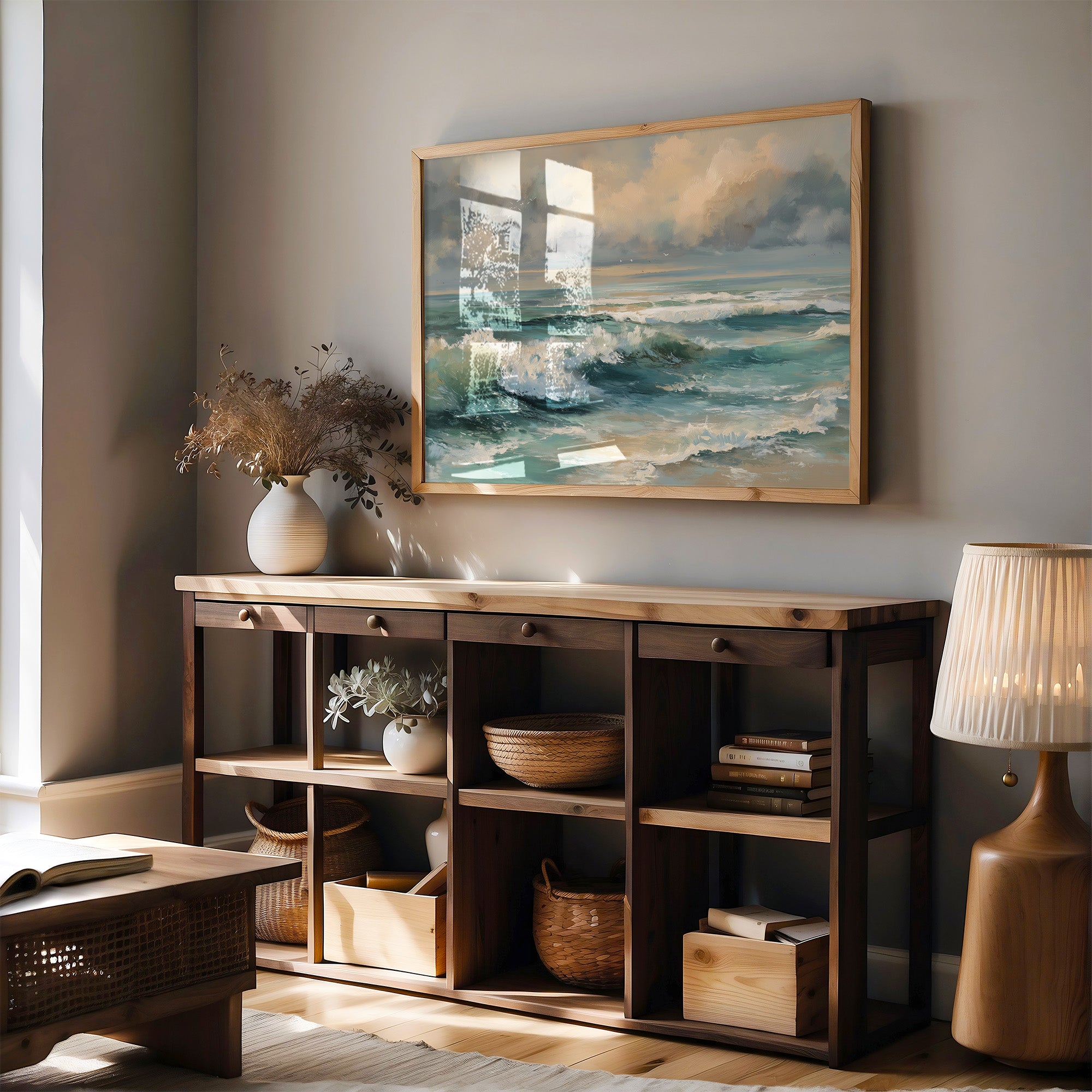 The rhythm of crashing waves carries the day's last light across a restless sea. Teal waters surge and foam against a backdrop of billowing clouds painted in soft golds and stormy blues. The artist has captured that magical moment when sunlight pierces through gathering storm clouds, illuminating the water's surface with ribbons of warm amber that contrast beautifully with the cool, jade-tinted swells. This coastal scene brings tranquility to living rooms and bedrooms alike, offering a window to the ocean's eternal dance.