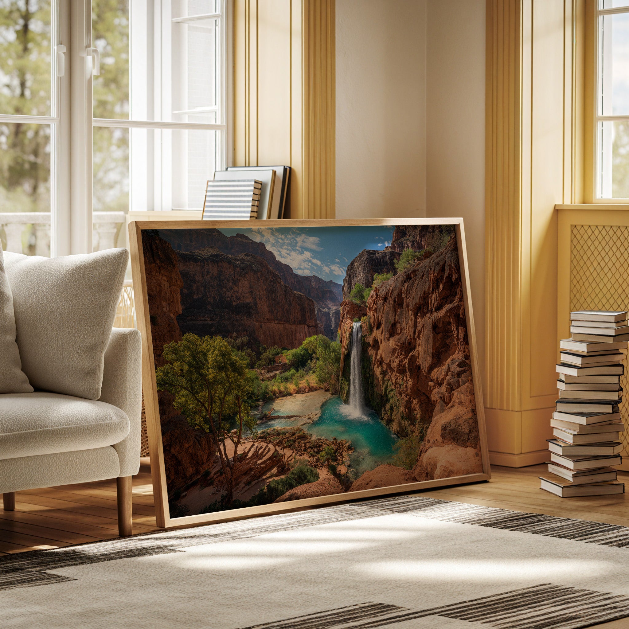 A hidden oasis reveals itself, where crystalline waters tumble from red rock heights into a luminous turquoise pool below. The dramatic canyon walls frame this desert miracle, their ancient layers telling stories of time itself. Sunlight plays across the russet cliffs while verdant trees add splashes of life against the arid landscape, creating a perfect harmony of harsh and gentle elements. This captivating scene offers a moment of pure natural wonder, where water meets wilderness in a spectacular display of Earth's artistry.