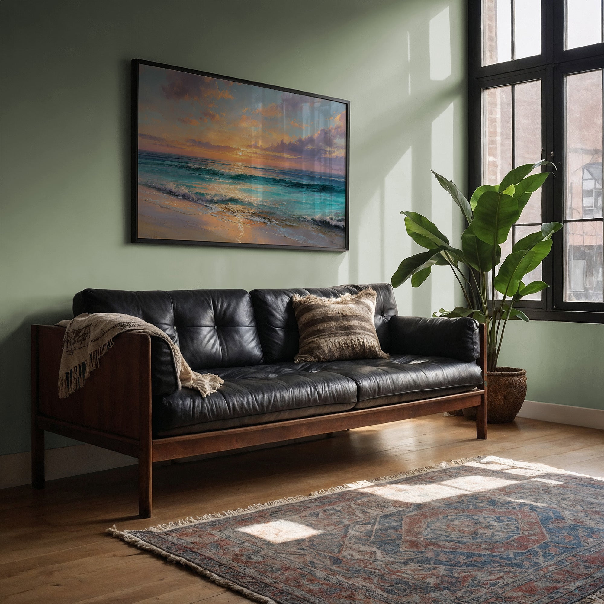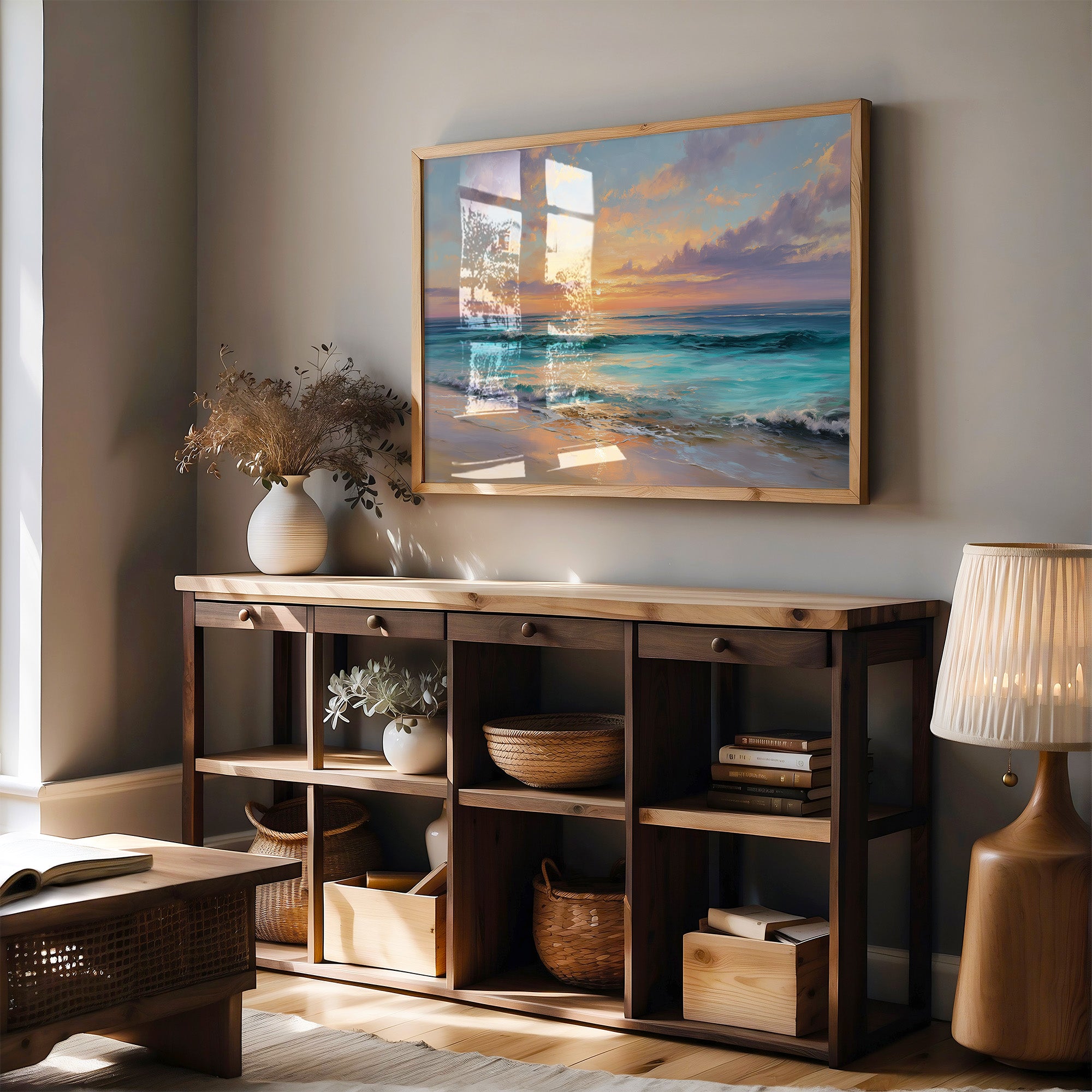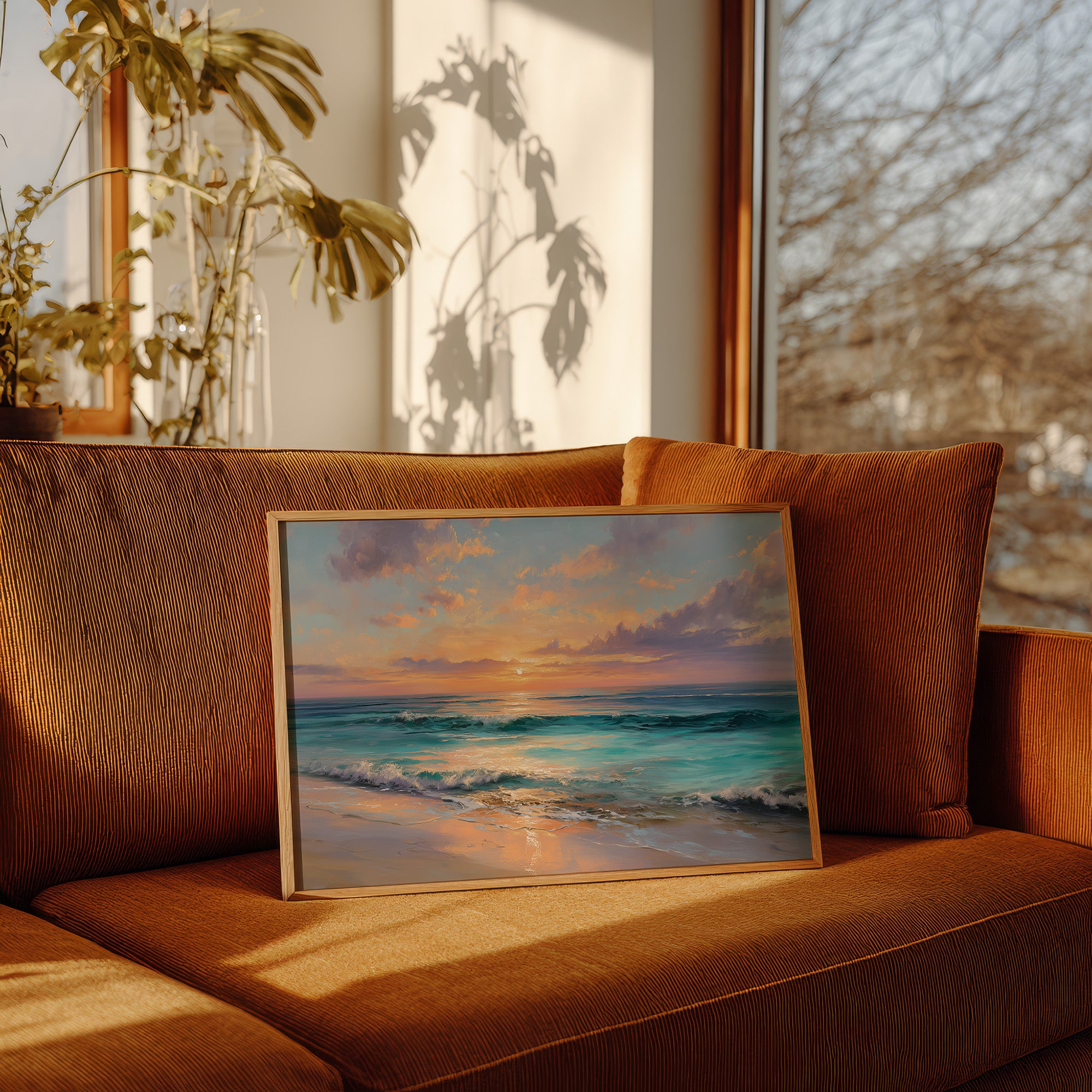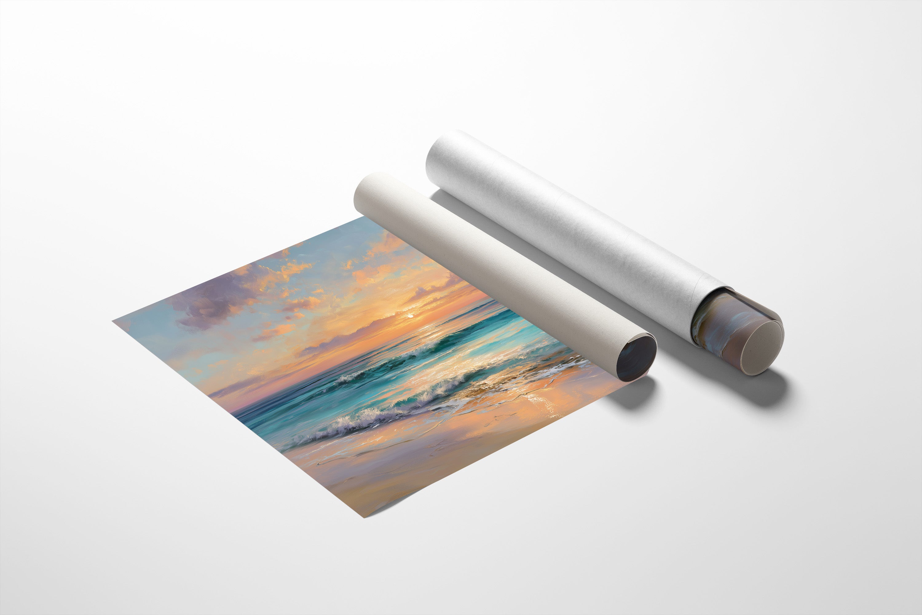 Light dances across the water's edge, capturing that fleeting moment when day surrenders to evening in a blaze of gold and violet. Gentle waves roll onto the shore in mesmerizing shades of turquoise and teal, their white foam edges catching the last rays of sunlight. The horizon melts into a dreamy palette where lavender clouds drift through an amber sky, creating a perfect balance between the tranquil sea and the radiant heavens above. This serene coastal vista brings the rejuvenating essence of oceanside sunsets into your everyday sanctuary.