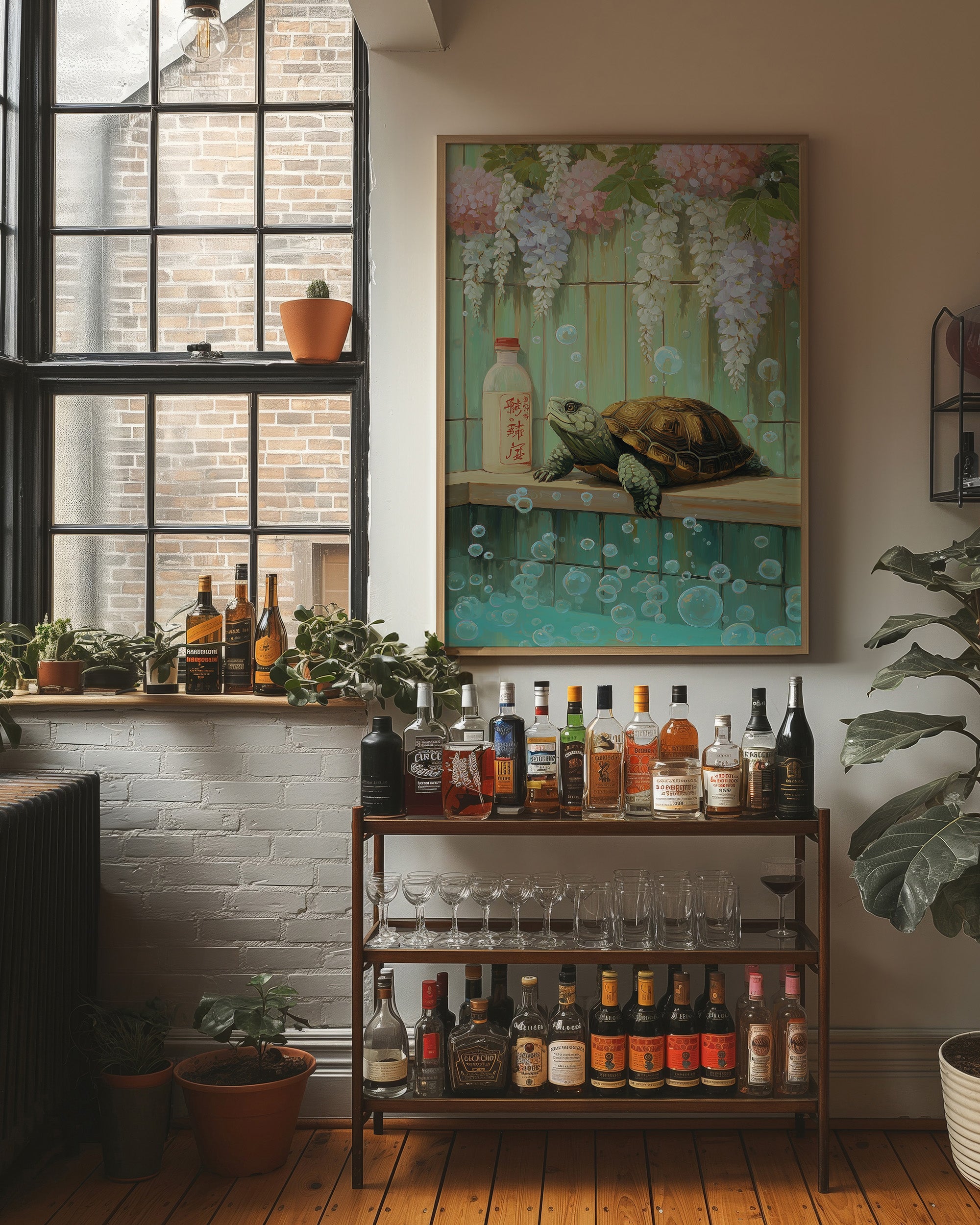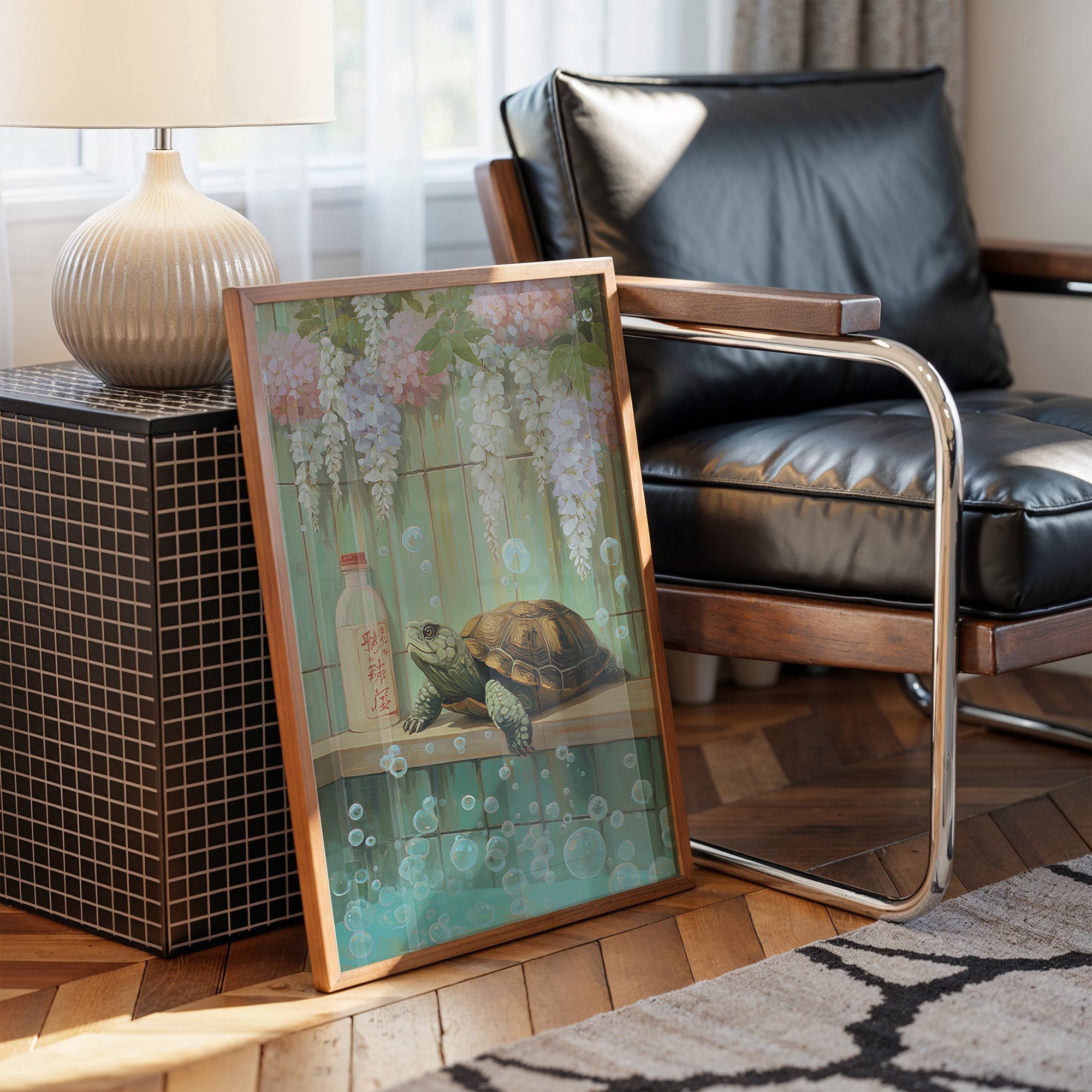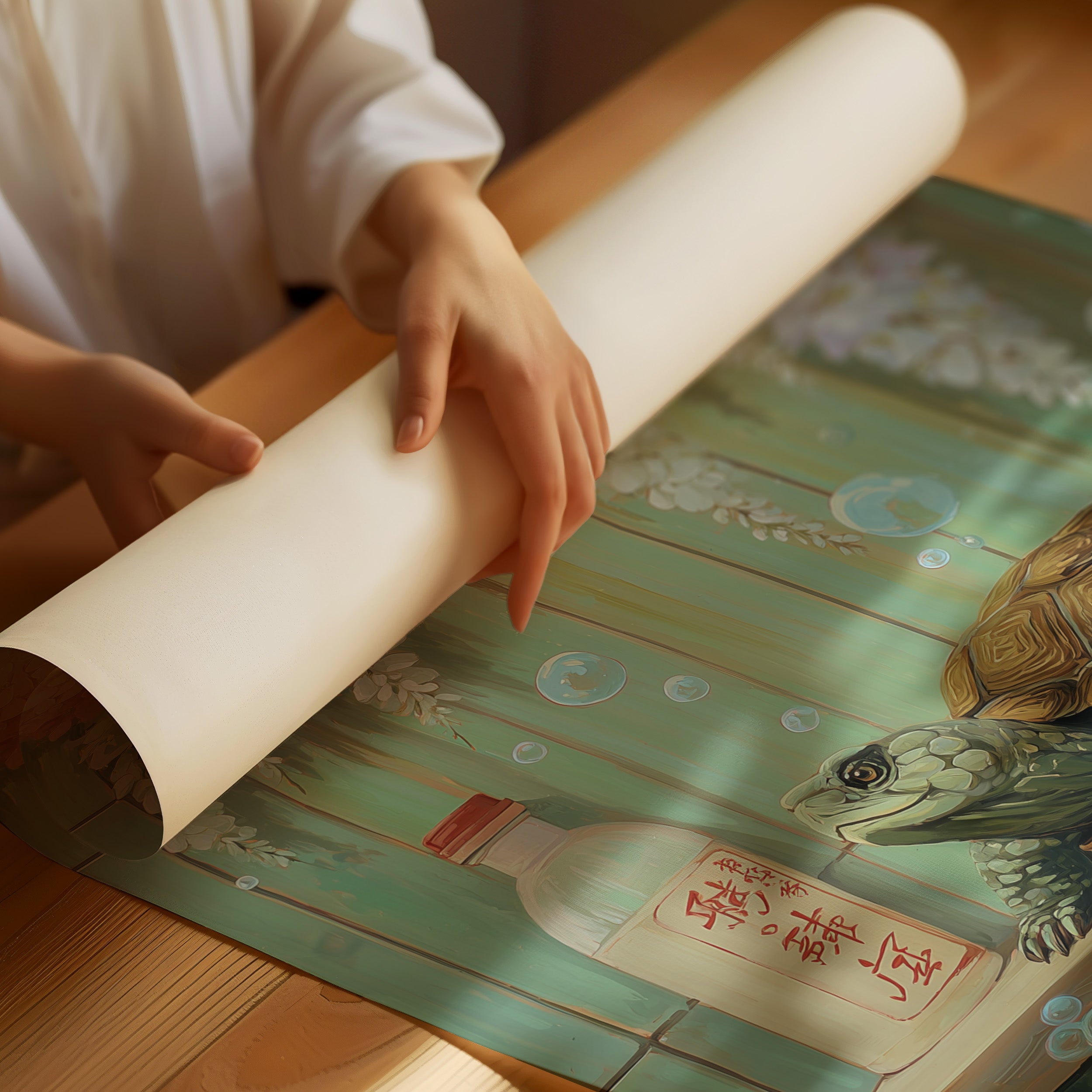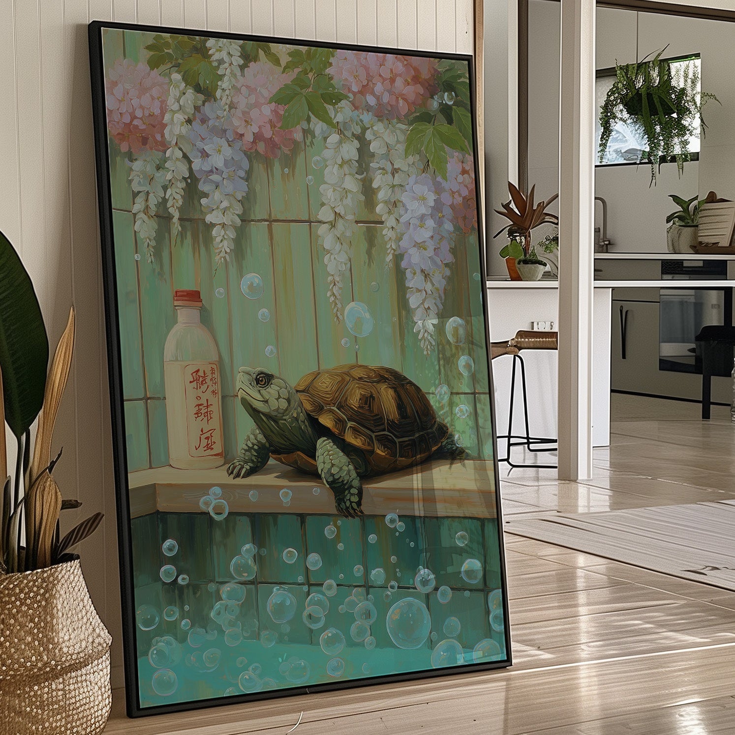 Floating bubbles dance around a contemplative turtle, creating a dreamlike scene beneath cascading wisteria blossoms. The gentle mix of mint green bamboo and delicate pink and white flowers frames this whimsical moment, while a mysterious red bottle adds an intriguing Eastern element. The artwork captures a perfect balance between tranquility and playfulness, blending traditional Asian aesthetics with contemporary fantasy. This piece would bring a sense of serenity and wonder to a reading nook, meditation space, or any room seeking a touch of magical realism. Its gentle color palette and enchanting subject matter make it an ideal focal point for creating a peaceful sanctuary within the home.