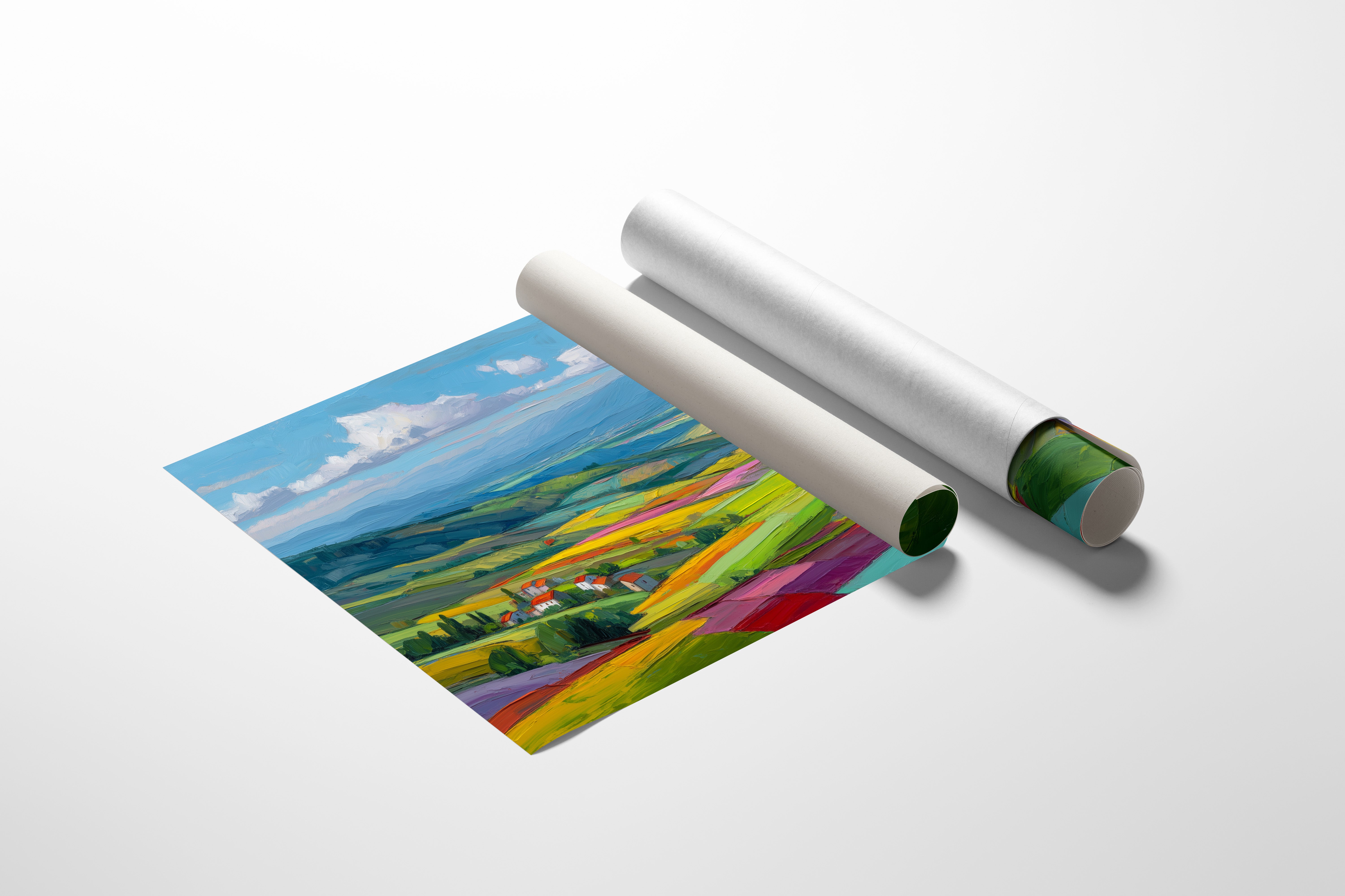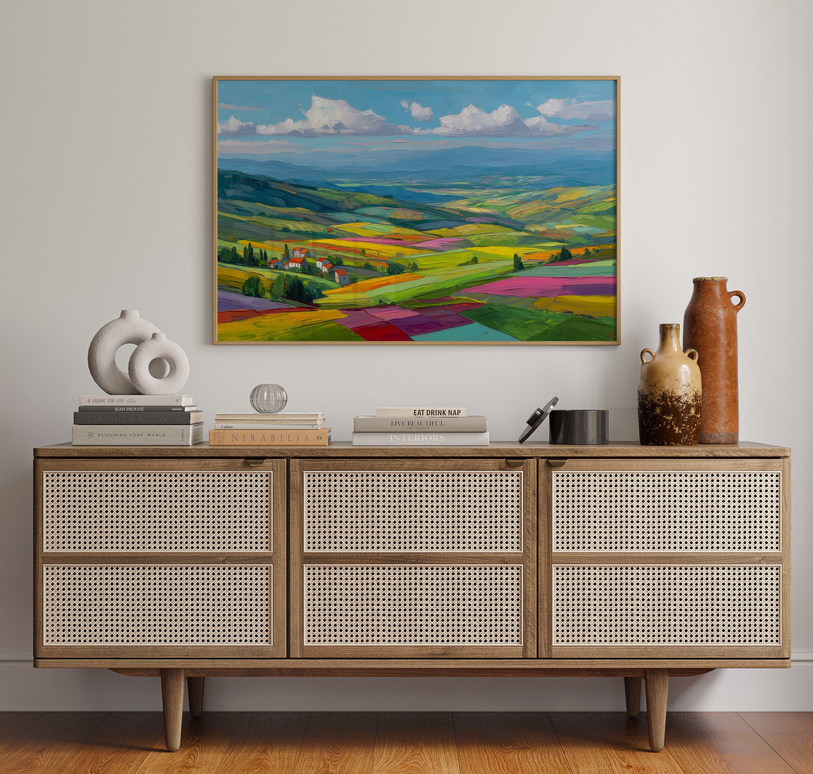 A patchwork of vibrant fields stretches across rolling hills, each patch painted in nature's most vivid palette. The landscape unfolds like a colorful quilt, with emerald greens, golden yellows, and unexpected splashes of purple and red creating a mesmerizing pattern. White clouds drift lazily across an azure sky, while a small cluster of rustic buildings nestles into the verdant countryside, telling stories of generations who have tended these iconic fields. This piece brings Mediterranean warmth and joy to any space, perfect for brightening a dining room or creating an uplifting focal point in a living area.