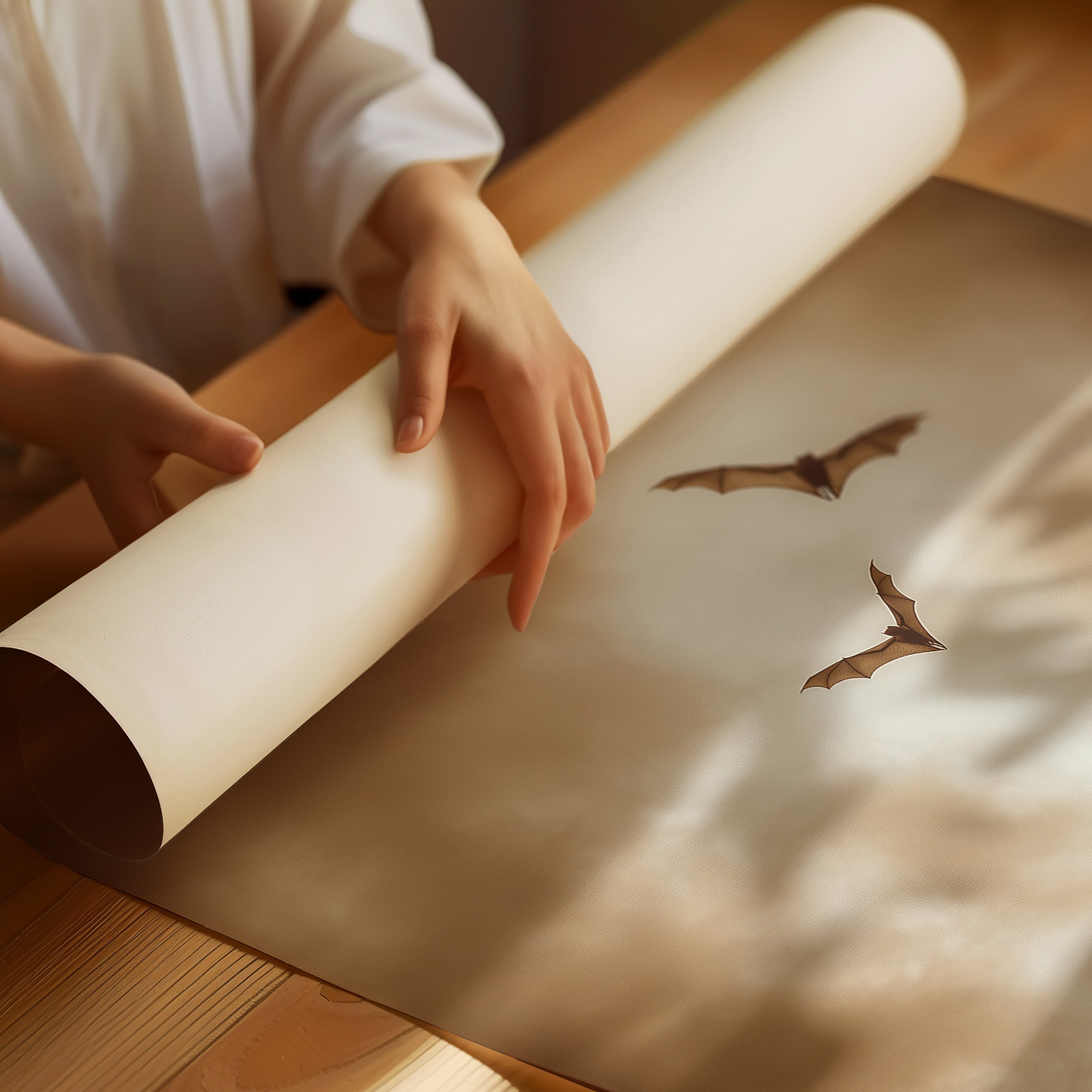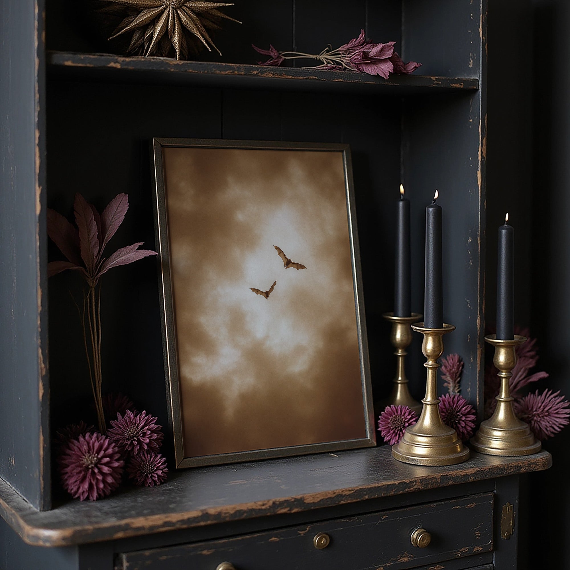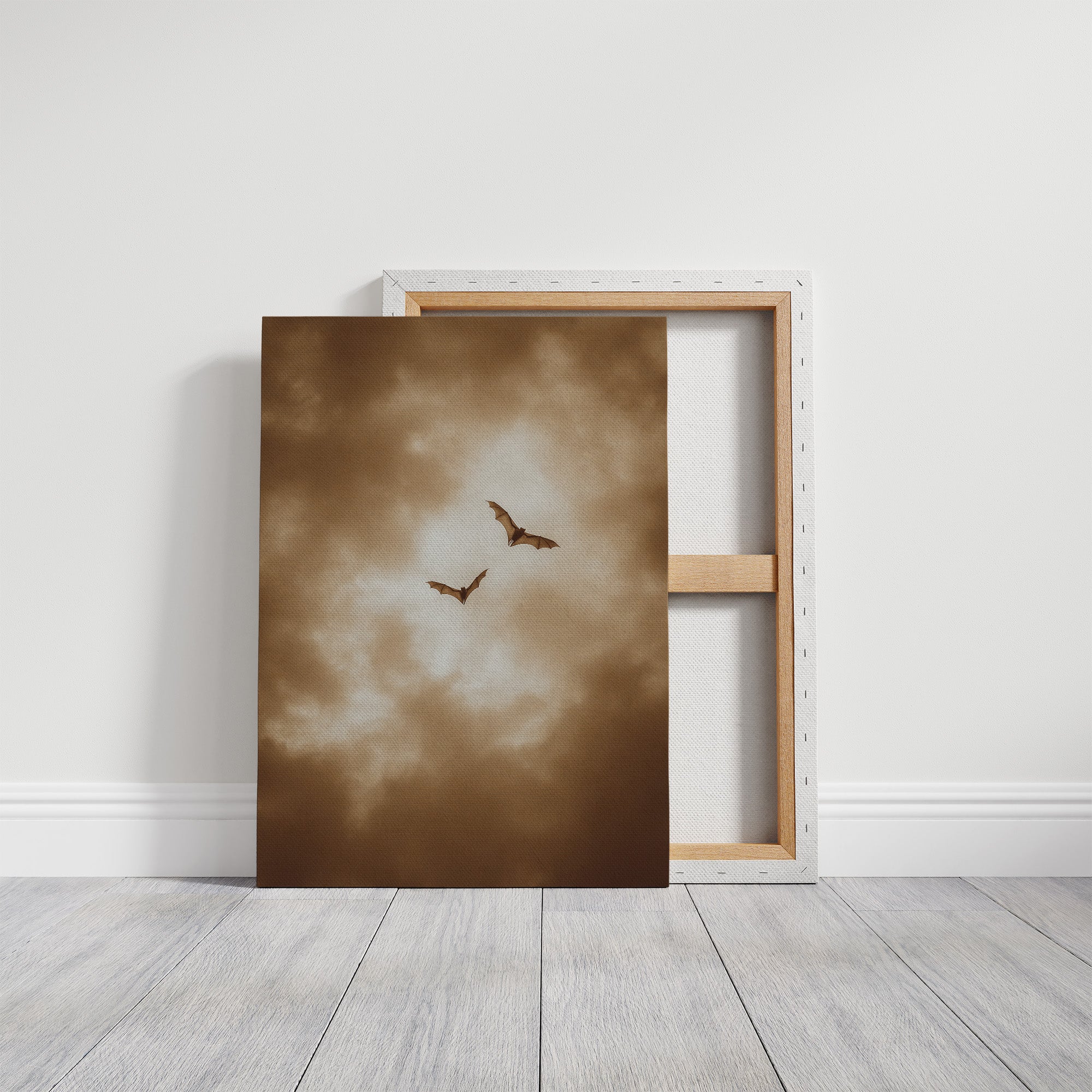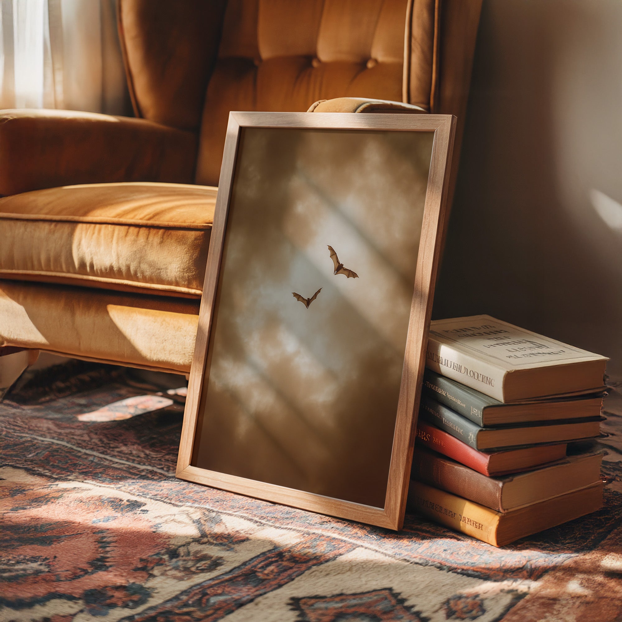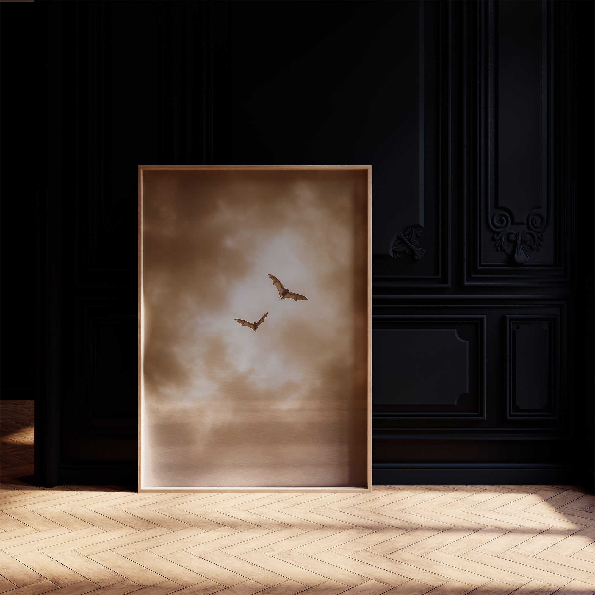Two silhouetted bats glide through a misty, amber-hued sky, their wings outstretched in silent flight. The atmospheric sepia tones create a dreamlike quality, where clouded heavens meet an indistinct horizon in soft gradients of bronze and cream. This haunting scene stands boldly against the dramatic black paneled wall, creating a striking contrast between darkness and the illuminated natural world.