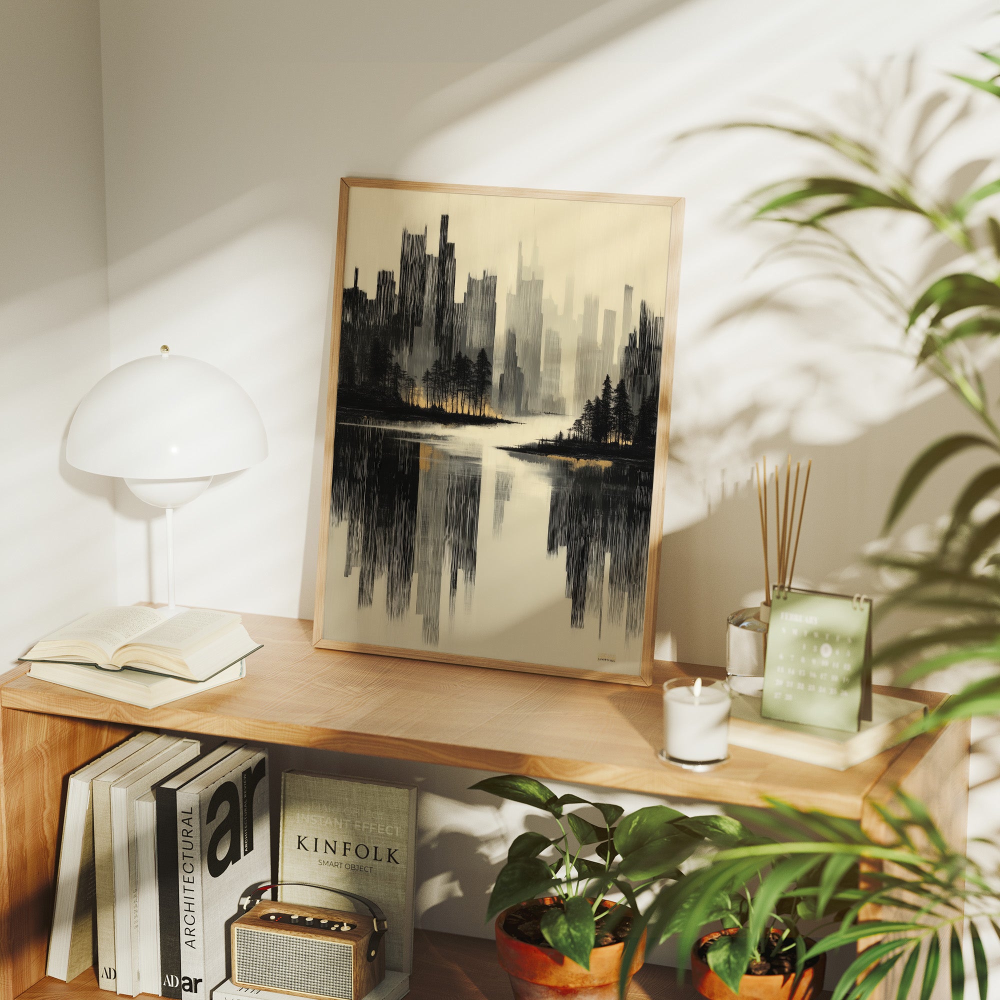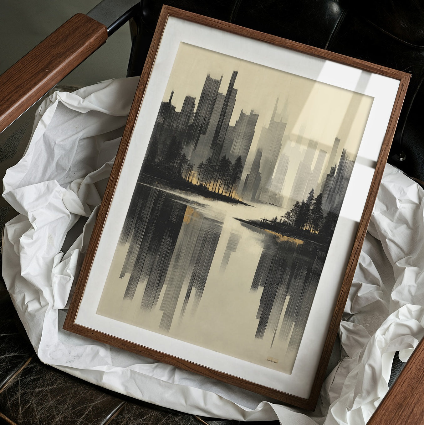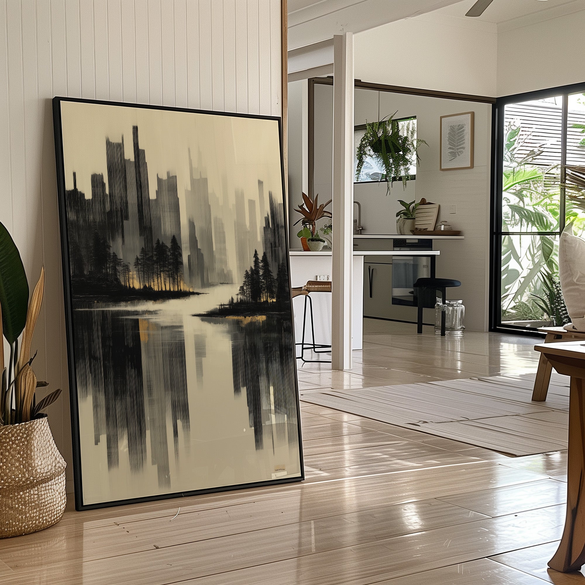 A moody cityscape emerges through layers of charcoal and cream, where skyscrapers dissolve into misty reflections on still waters. Dark pines stand sentinel along the shore, their silhouettes creating a natural boundary between urban geometry and peaceful wilderness. The piece captures that ethereal moment when day fades to dusk, reflected perfectly in the mirror-like surface of the lake. This contemporary piece would make a striking focal point in a modern living room or add sophisticated drama to a minimalist dining space.