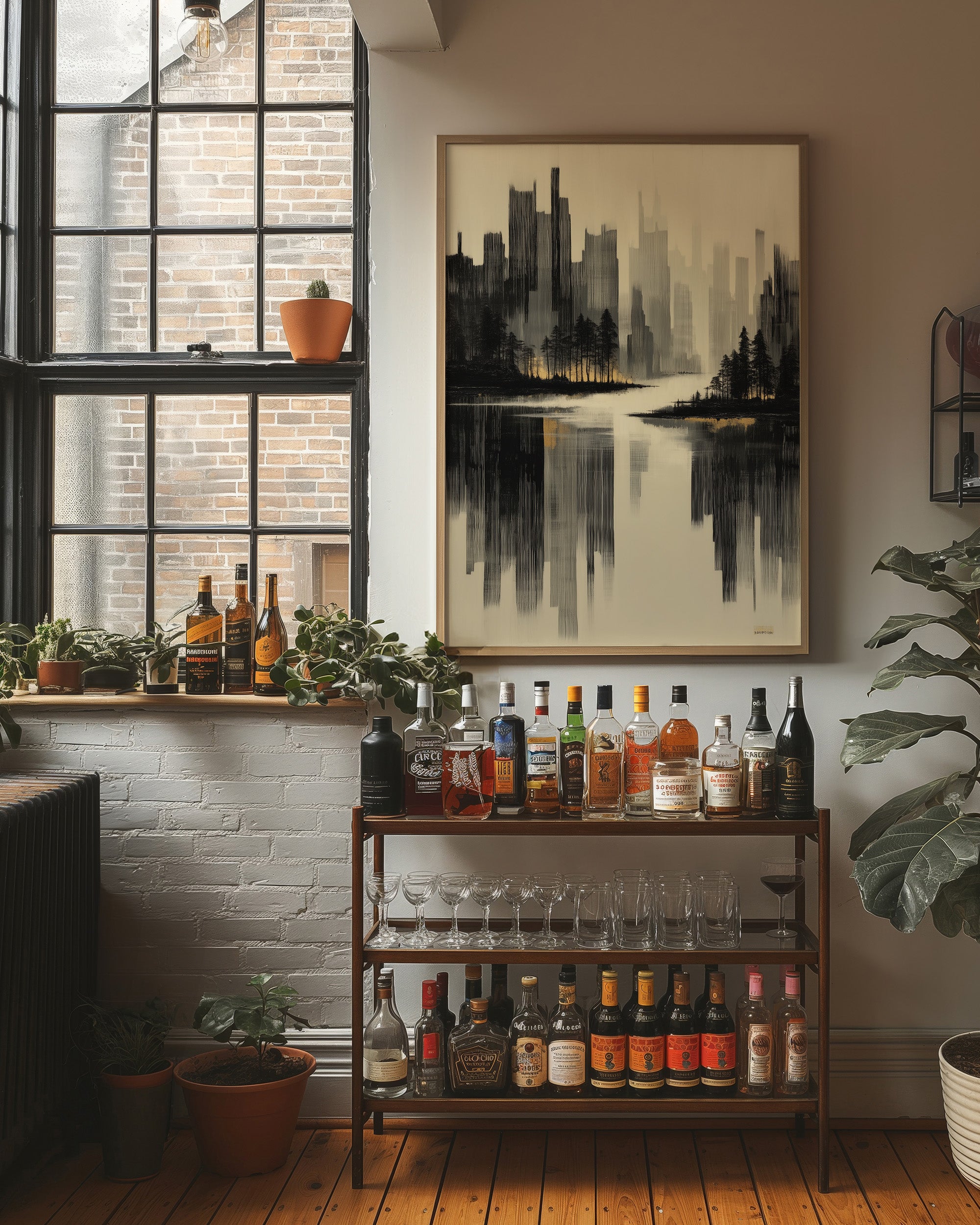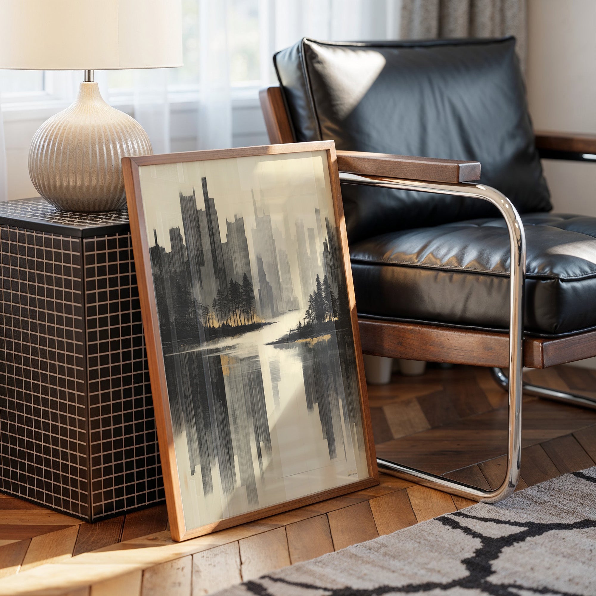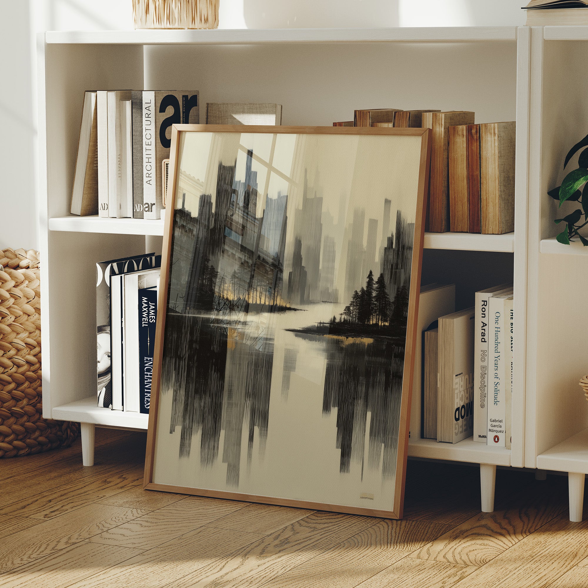 A moody cityscape emerges through layers of charcoal and cream, where skyscrapers dissolve into misty reflections on still waters. Dark pines stand sentinel along the shore, their silhouettes creating a natural boundary between urban geometry and peaceful wilderness. The piece captures that ethereal moment when day fades to dusk, reflected perfectly in the mirror-like surface of the lake. This contemporary piece would make a striking focal point in a modern living room or add sophisticated drama to a minimalist dining space.