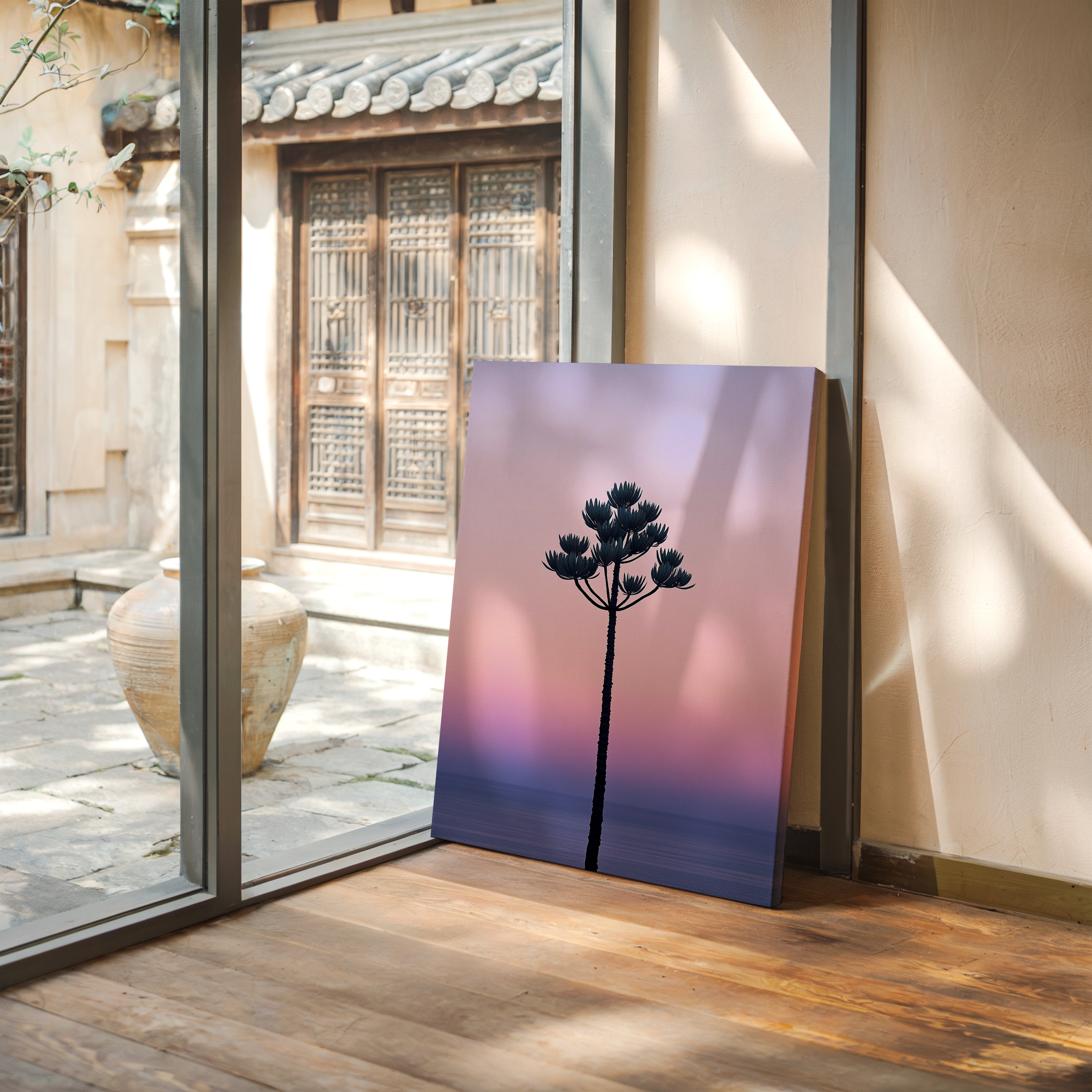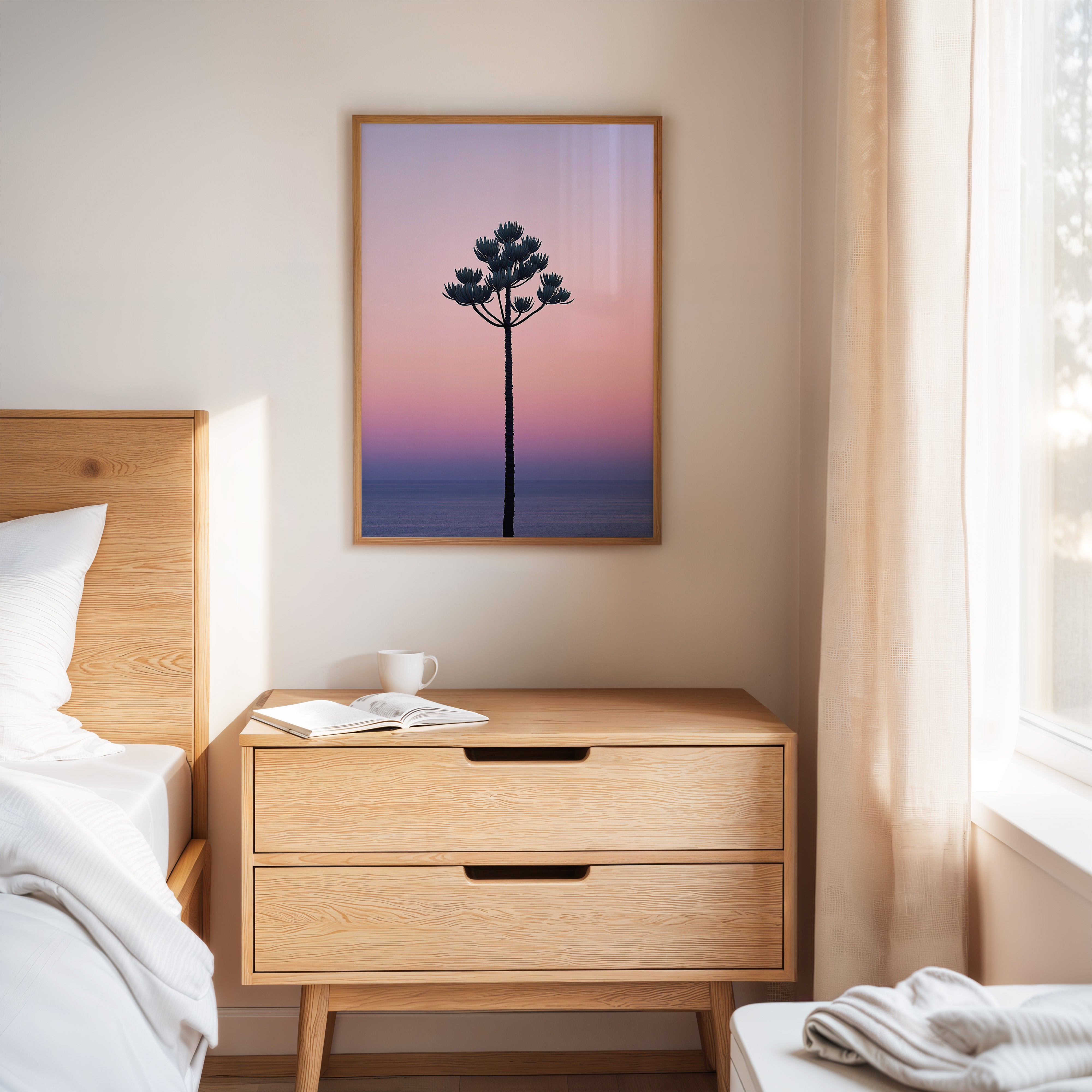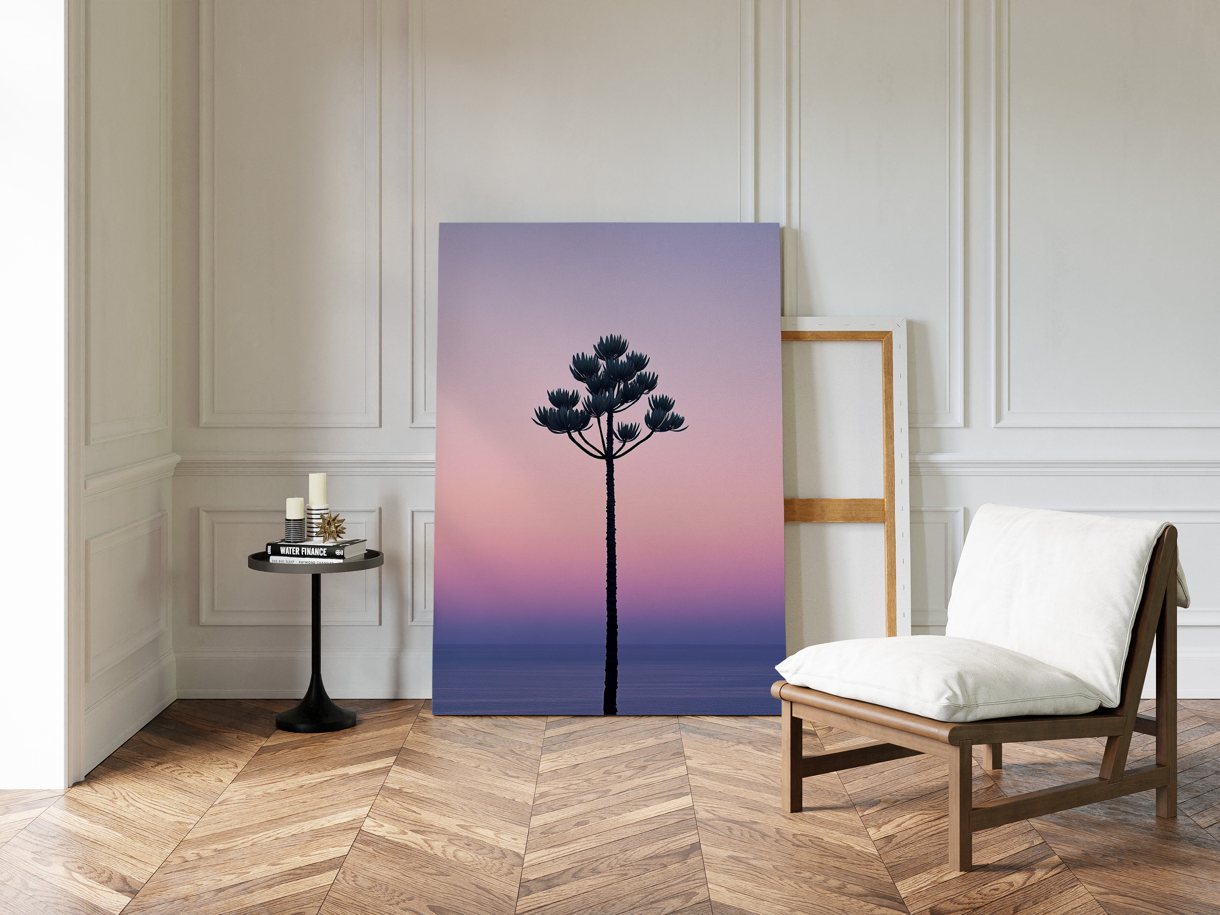 A solitary palm tree stands sentinel against a dreamy twilight sky, its silhouette creating a striking contrast against gradient hues. The sky transitions from deep blue at the horizon through layers of violet and pink, creating a cotton candy dreamscape. The palm's distinctive crown spreads like a bouquet of dark fans, each frond perfectly defined against the ethereal backdrop. This piece captures a moment of perfect stillness, where nature's geometry meets the soft palette of dusk. Perfect for modern spaces seeking to create a sense of serenity and escape, particularly in meditation rooms or minimal bedrooms where its calming presence can serve as a focal point.
