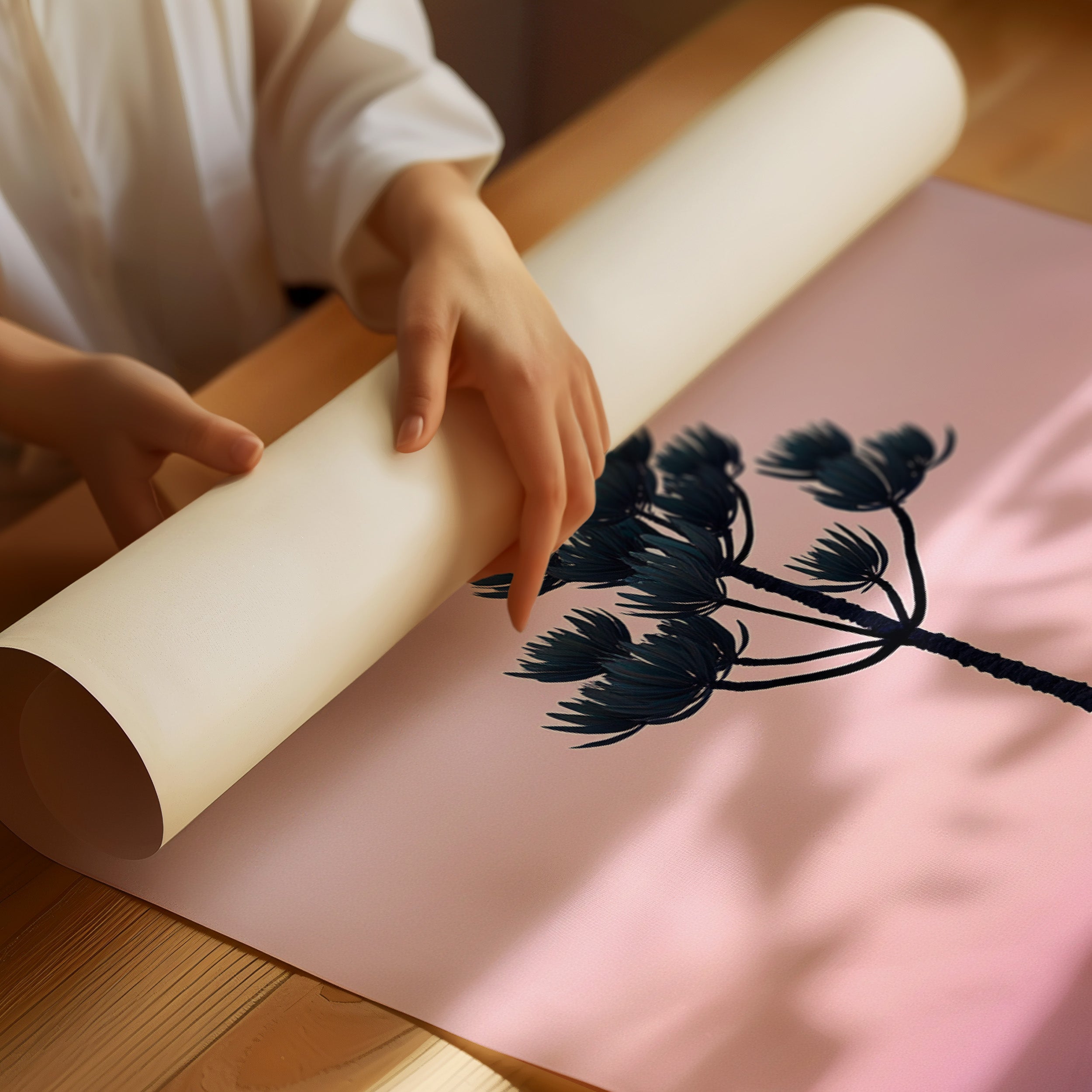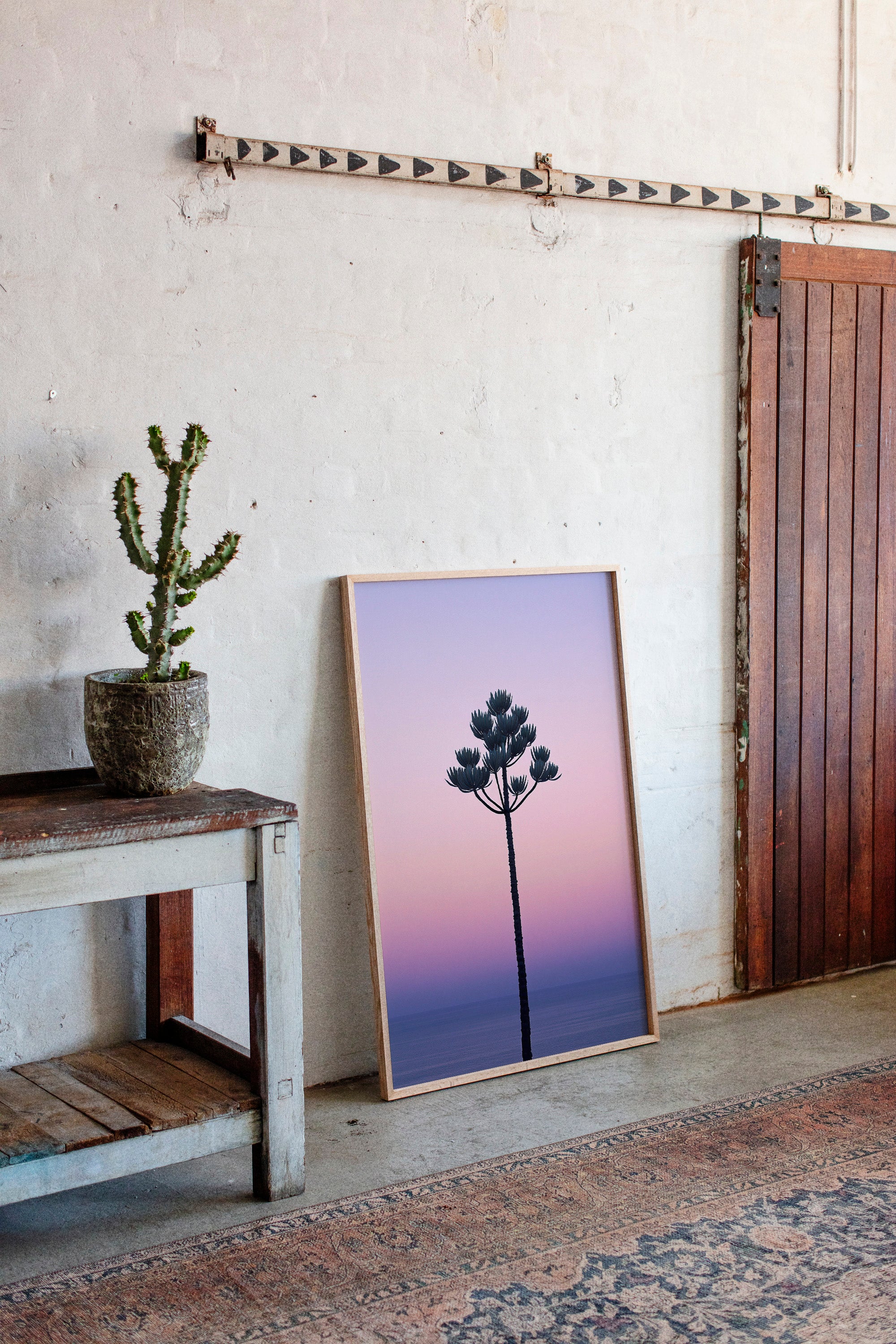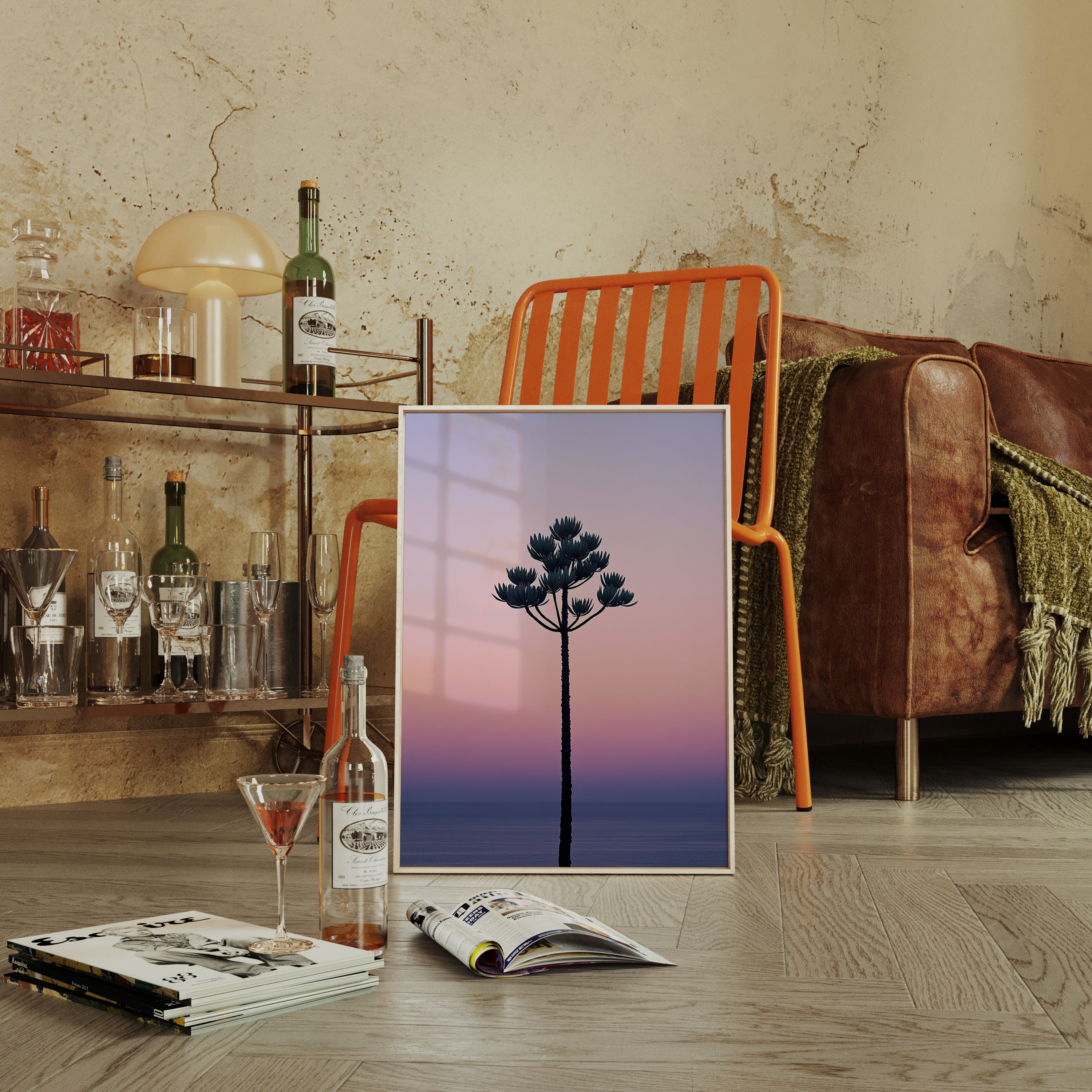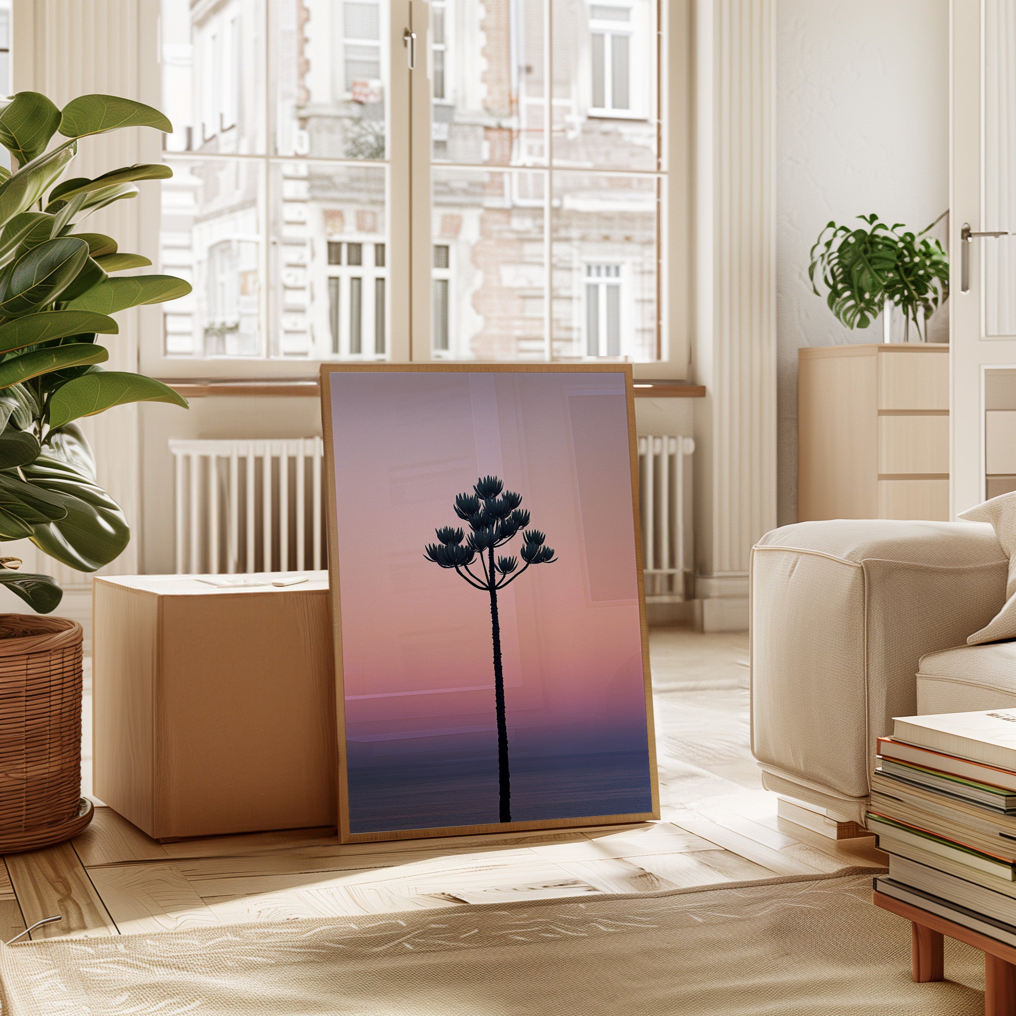 A solitary palm tree stands sentinel against a dreamy twilight sky, its silhouette creating a striking contrast against gradient hues. The sky transitions from deep blue at the horizon through layers of violet and pink, creating a cotton candy dreamscape. The palm's distinctive crown spreads like a bouquet of dark fans, each frond perfectly defined against the ethereal backdrop. This piece captures a moment of perfect stillness, where nature's geometry meets the soft palette of dusk. Perfect for modern spaces seeking to create a sense of serenity and escape, particularly in meditation rooms or minimal bedrooms where its calming presence can serve as a focal point.