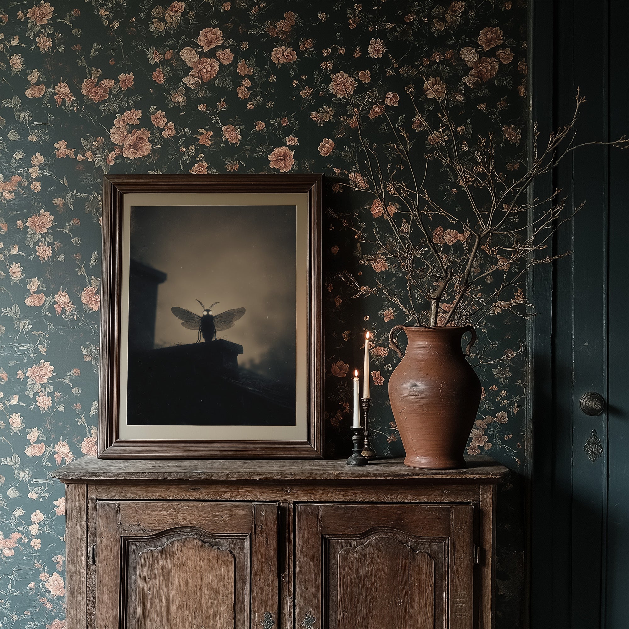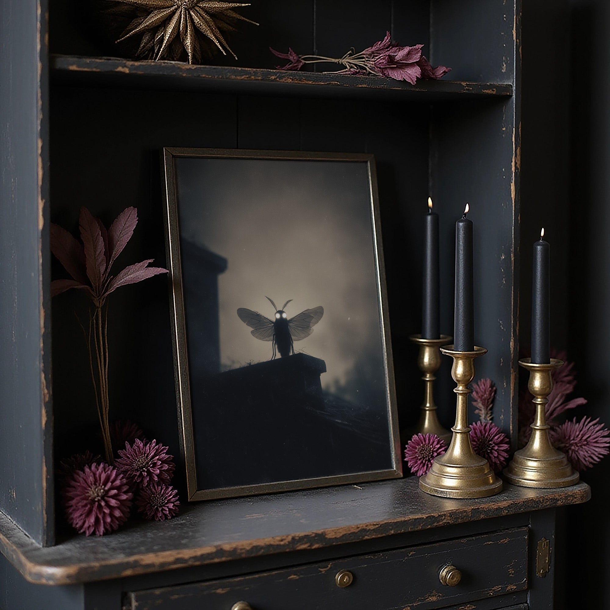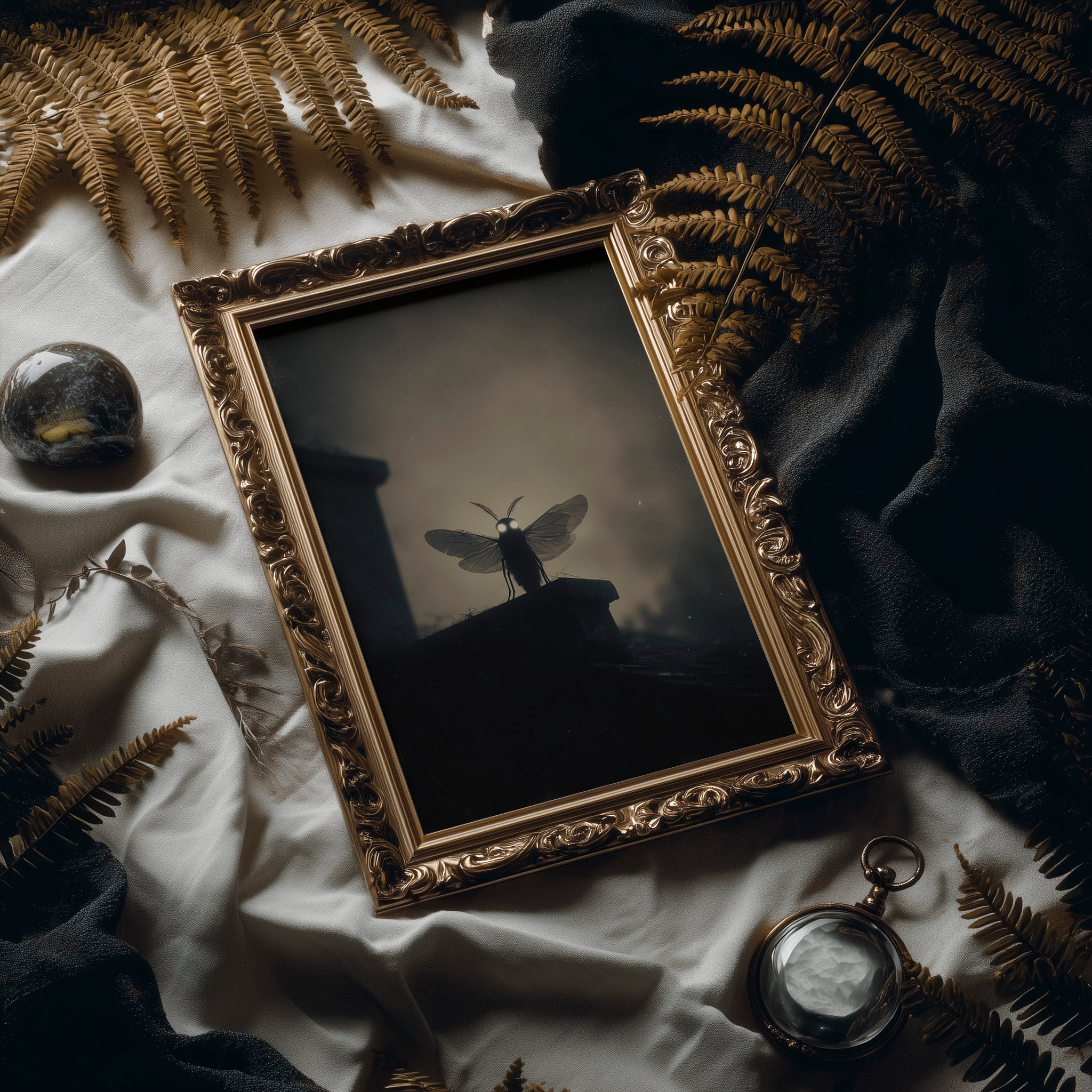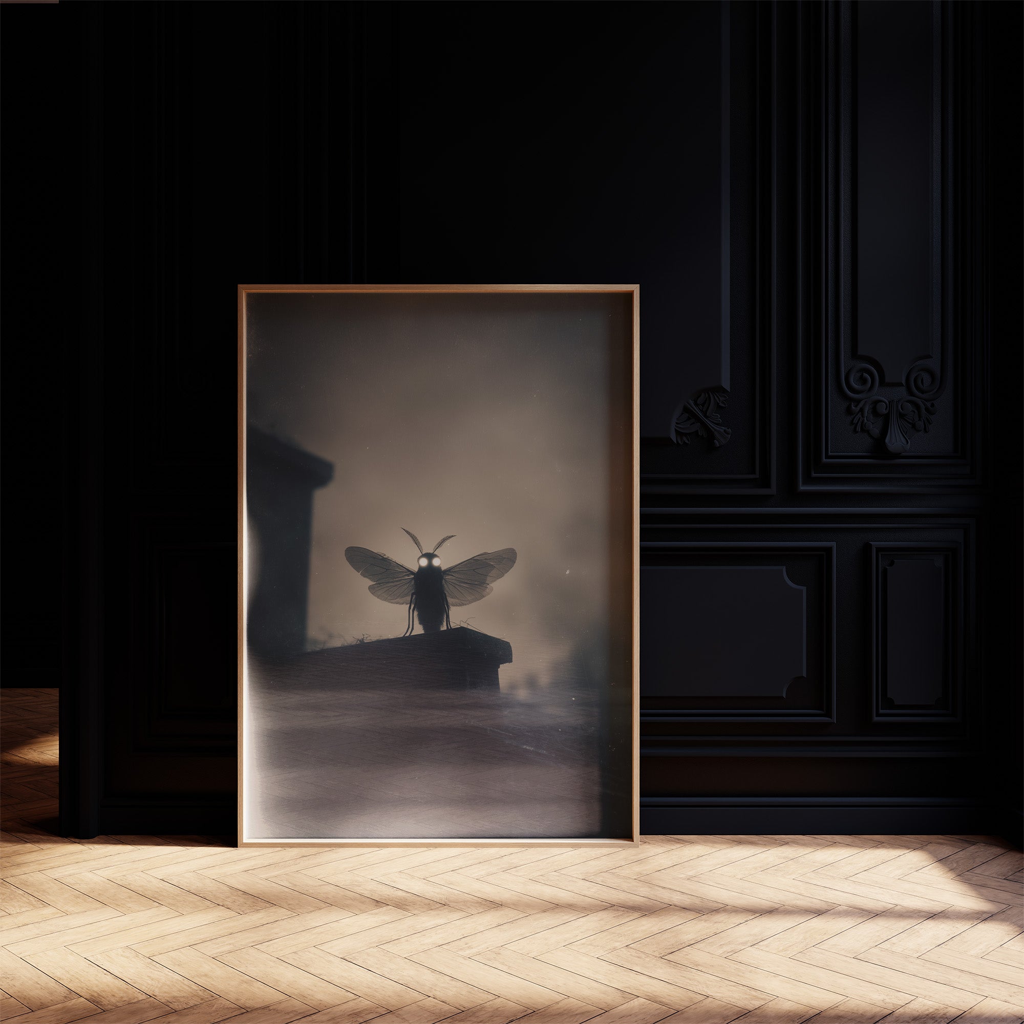A solitary moth stands illuminated against the hazy backdrop, its delicate wings and glowing eyes creating an otherworldly silhouette. The monochromatic palette bathes the scene in mysterious shadows and soft light, transforming this small creature into something mythical and profound. The composition balances darkness and revelation, inviting viewers into a dreamlike moment where the ordinary becomes extraordinary.